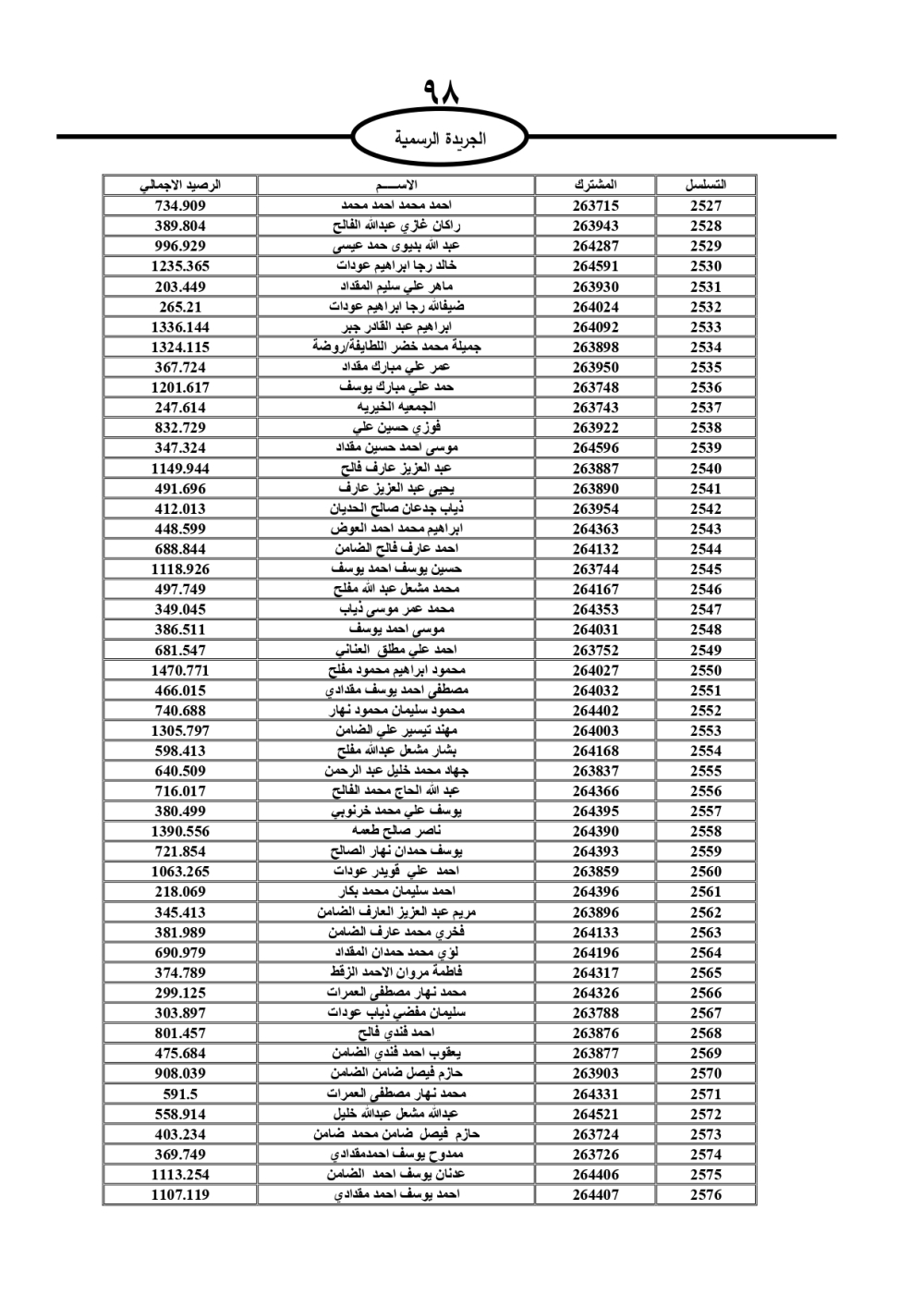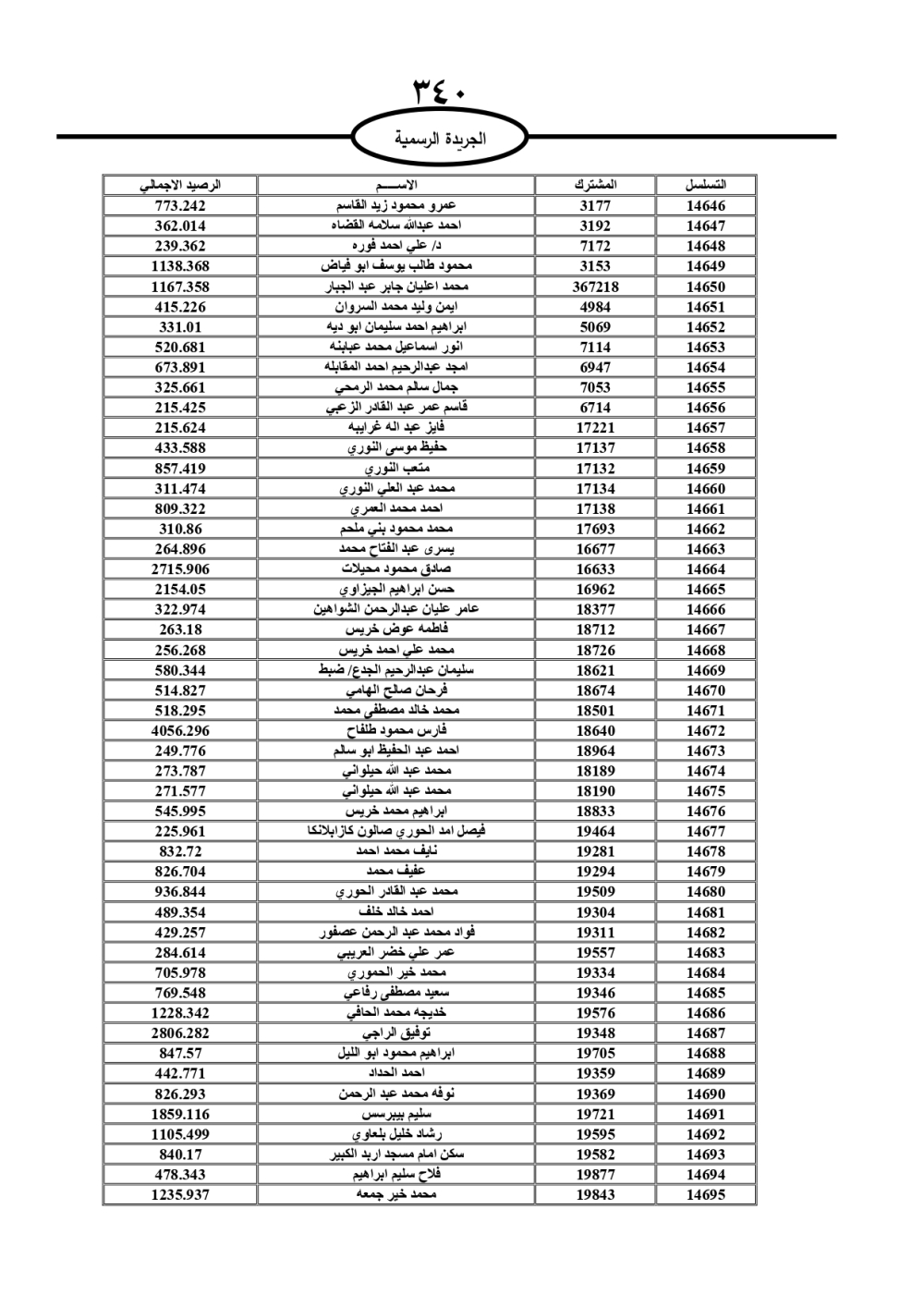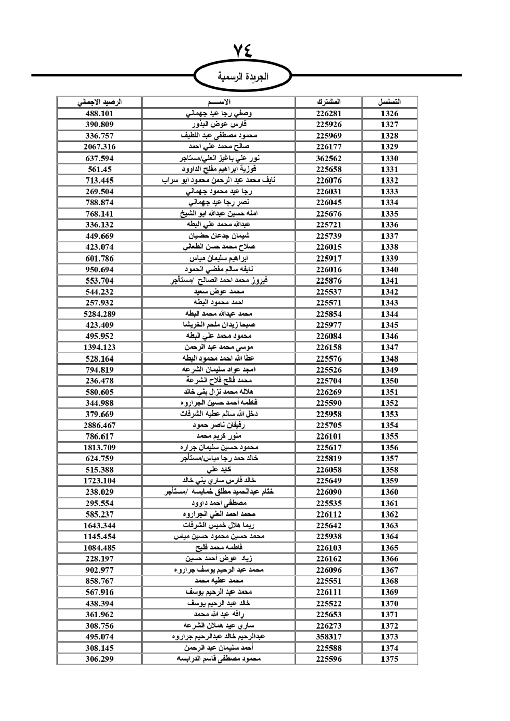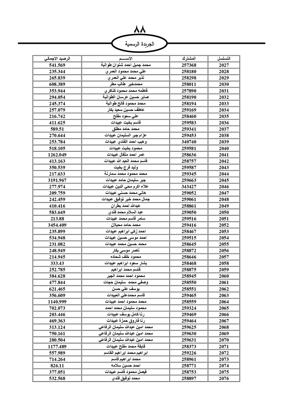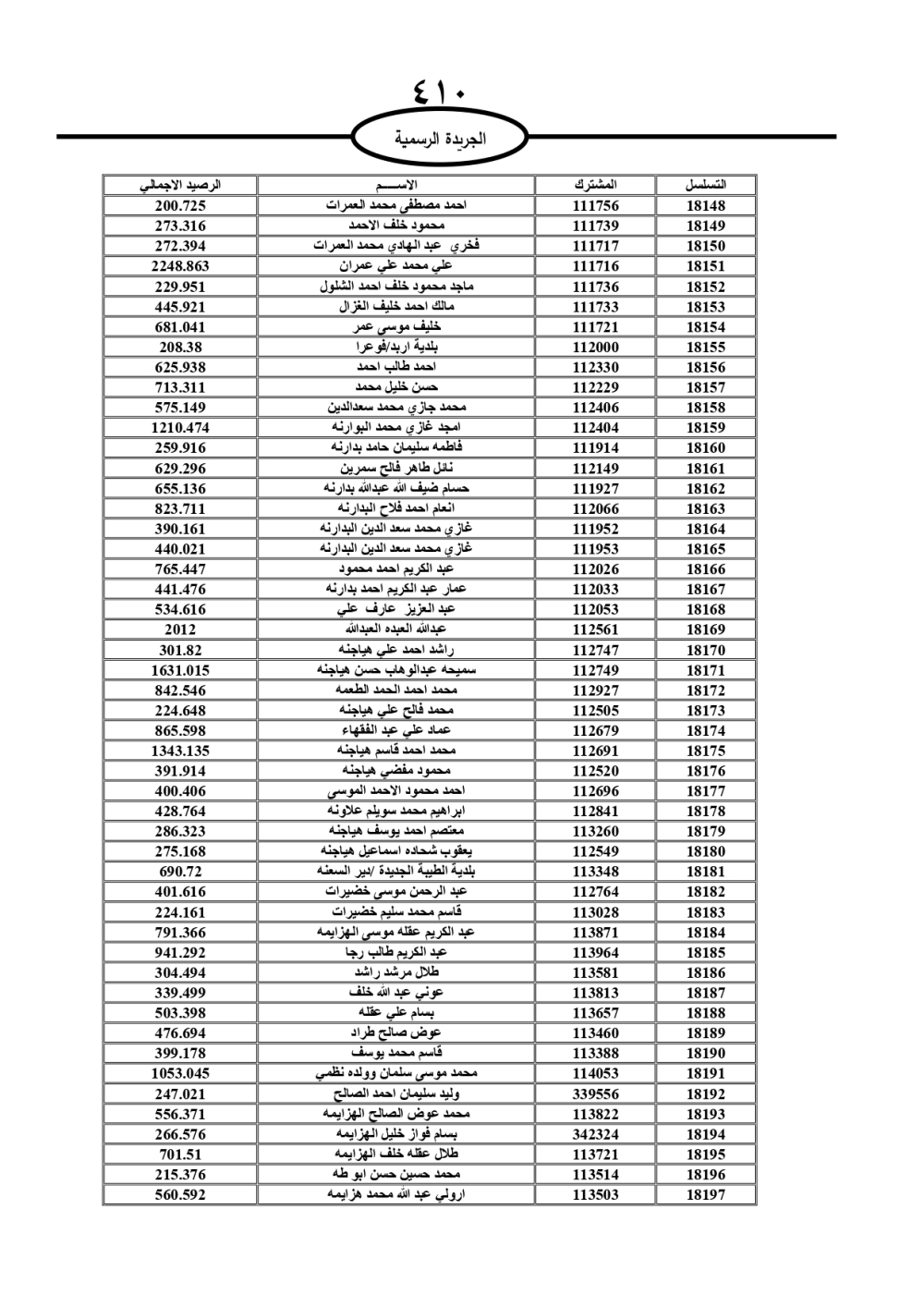 دعت سلطة المياه وبلدية الزرقاء، عشرات آلاف الأردنيين الواردة أسماؤهم بالكشوفات المرفقة، إلى ضرورة مراجعتها لتسوية أوضاعهم المالية كونه ترتب عليهم ذمم مالية، وذلك لتجنب الحجز على الأموال المنقولة وغير المنقولة بعد انقضاء 60 يوما من تاريخ النشر، علما أنه تم نشر هذه الأسماء في الجريدة الرسمية بتاريخ 16/2/2025.