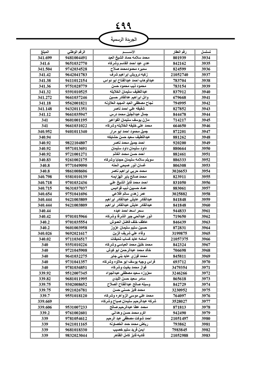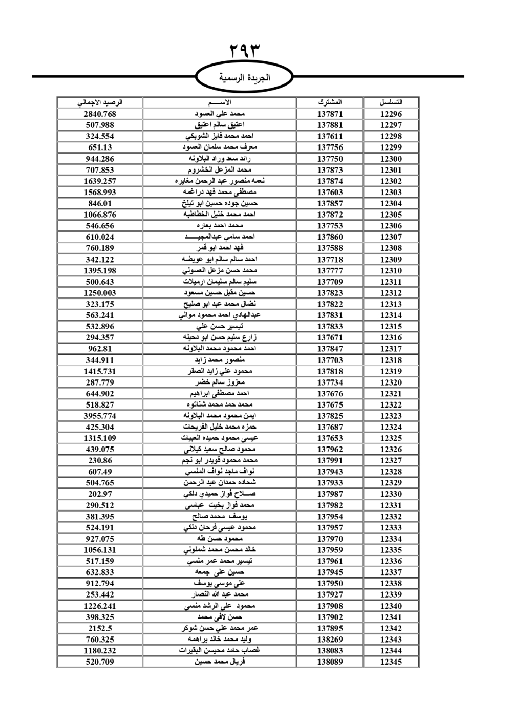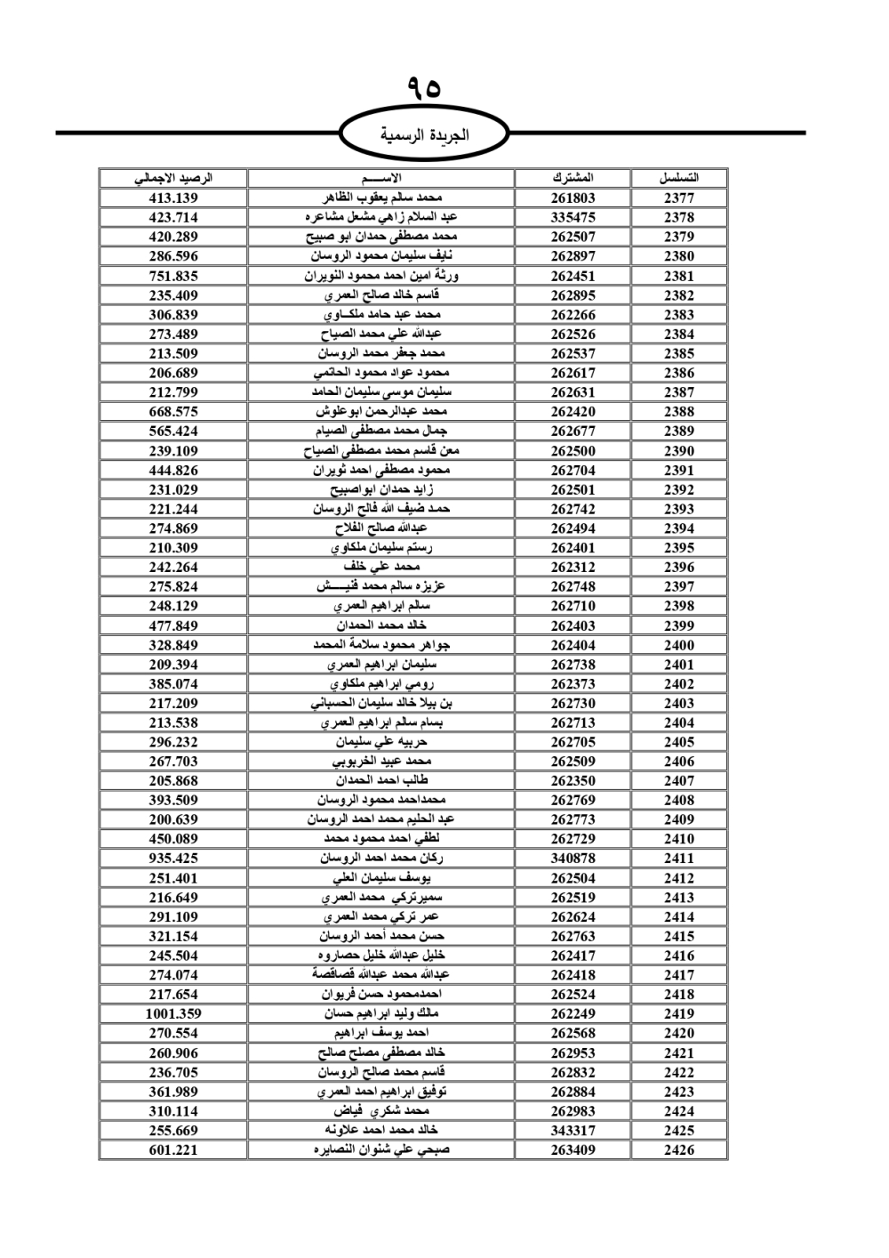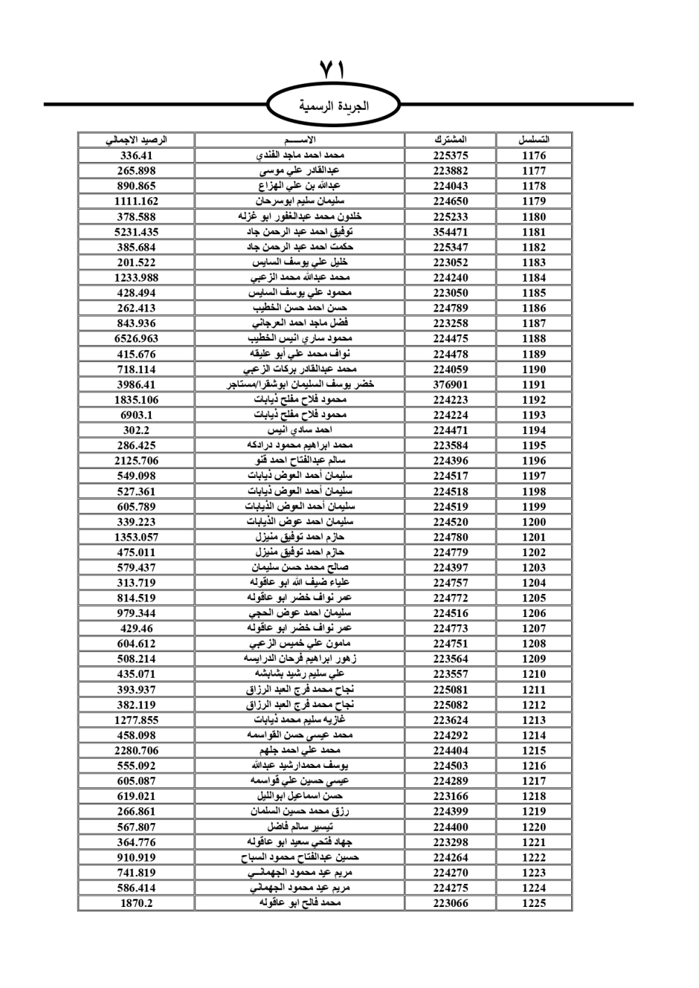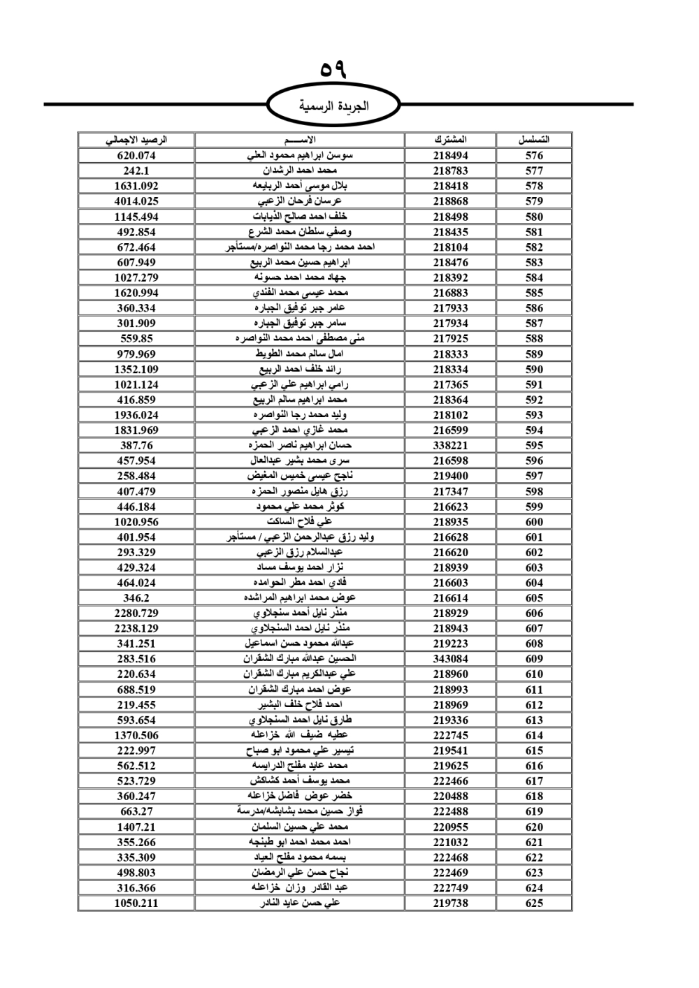 دعت سلطة المياه وبلدية الزرقاء، عشرات آلاف الأردنيين الواردة أسماؤهم بالكشوفات المرفقة، إلى ضرورة مراجعتها لتسوية أوضاعهم المالية كونه ترتب عليهم ذمم مالية، وذلك لتجنب الحجز على الأموال المنقولة وغير المنقولة بعد انقضاء 60 يوما من تاريخ النشر، علما أنه تم نشر هذه الأسماء في الجريدة الرسمية بتاريخ 16/2/2025.