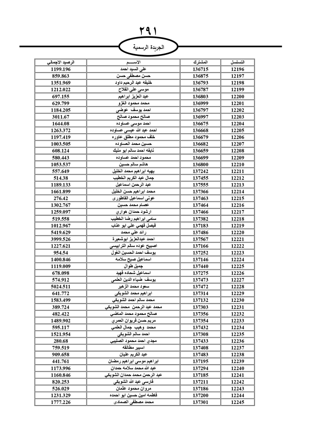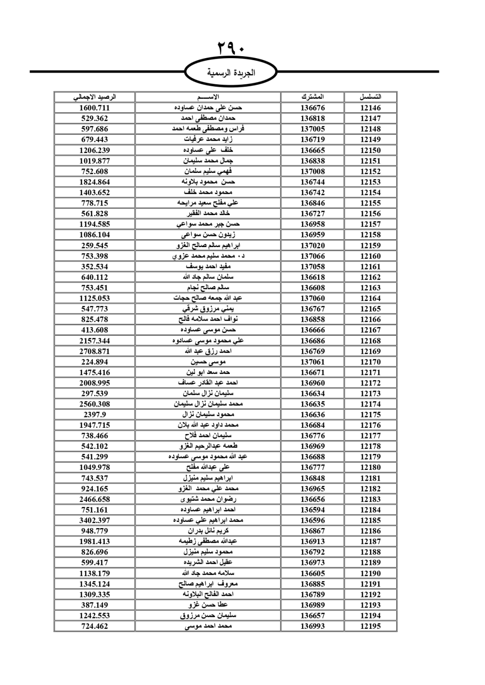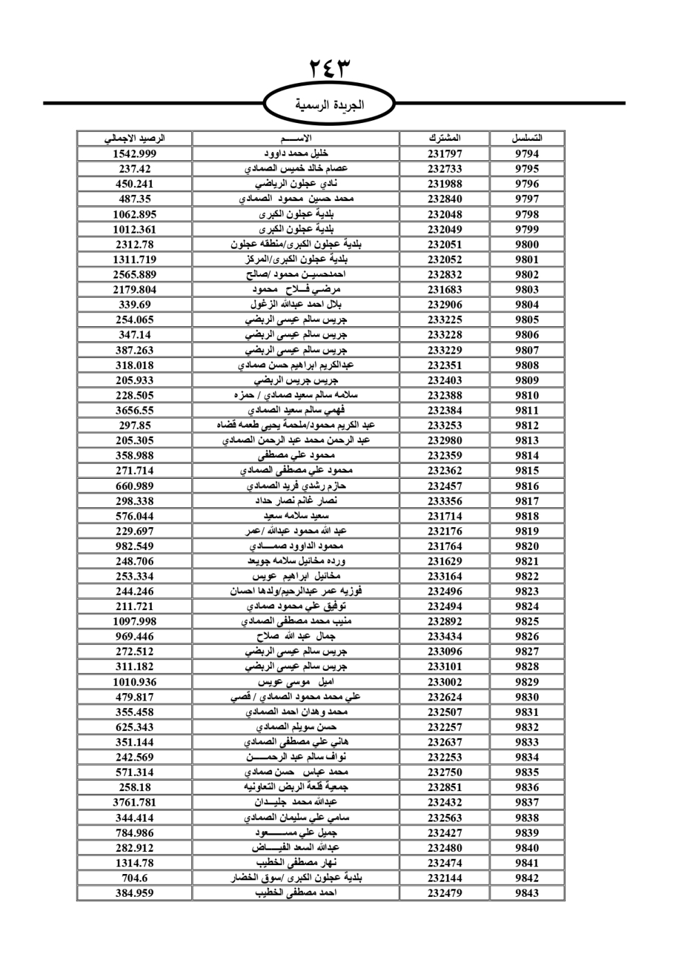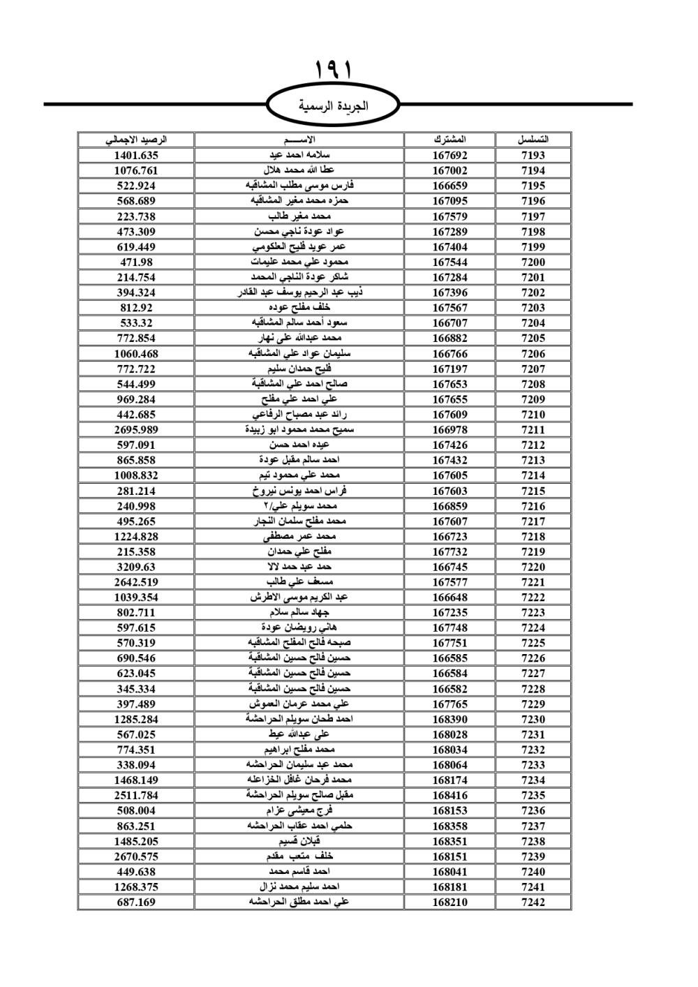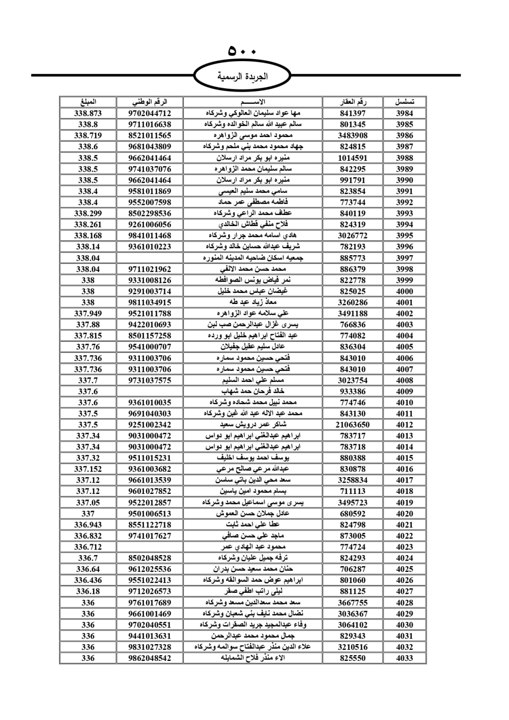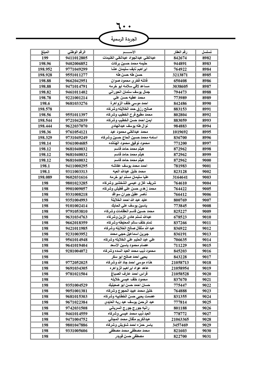 دعت سلطة المياه وبلدية الزرقاء، عشرات آلاف الأردنيين الواردة أسماؤهم بالكشوفات المرفقة، إلى ضرورة مراجعتها لتسوية أوضاعهم المالية كونه ترتب عليهم ذمم مالية، وذلك لتجنب الحجز على الأموال المنقولة وغير المنقولة بعد انقضاء 60 يوما من تاريخ النشر، علما أنه تم نشر هذه الأسماء في الجريدة الرسمية بتاريخ 16/2/2025.