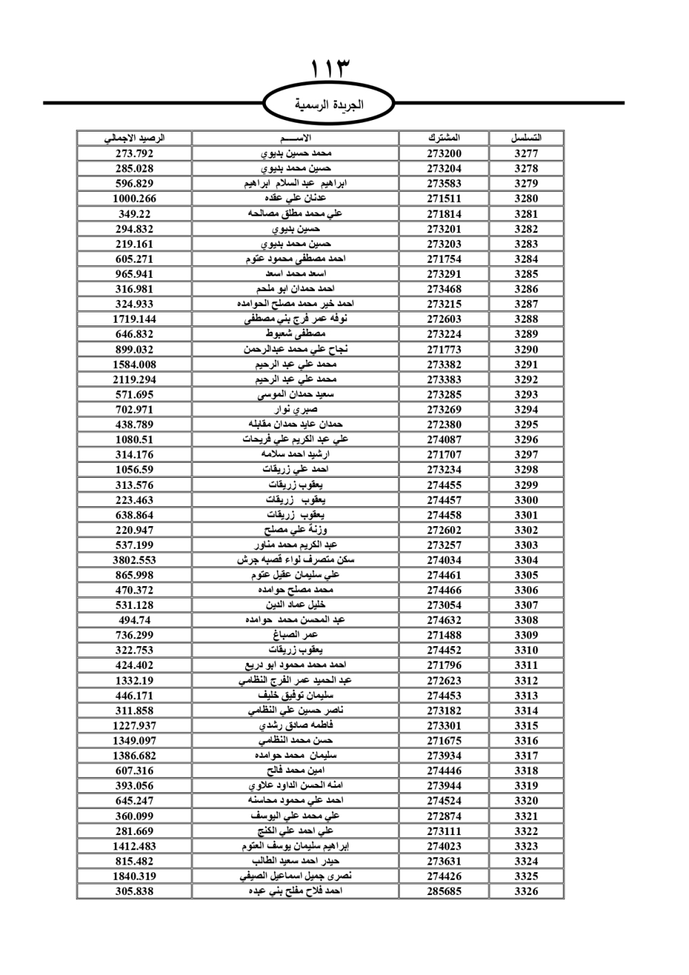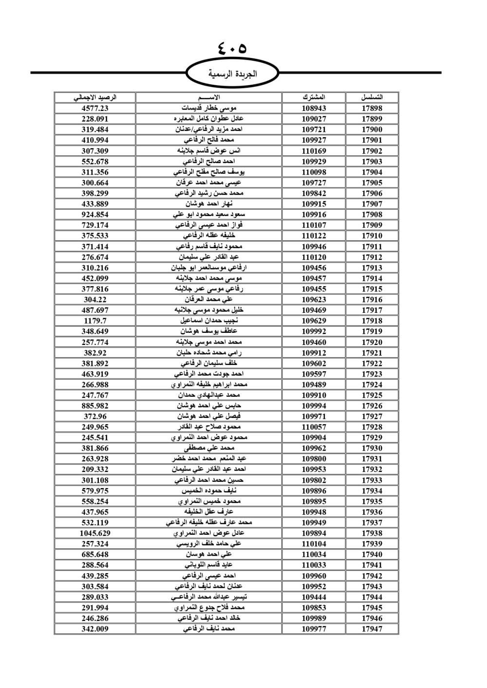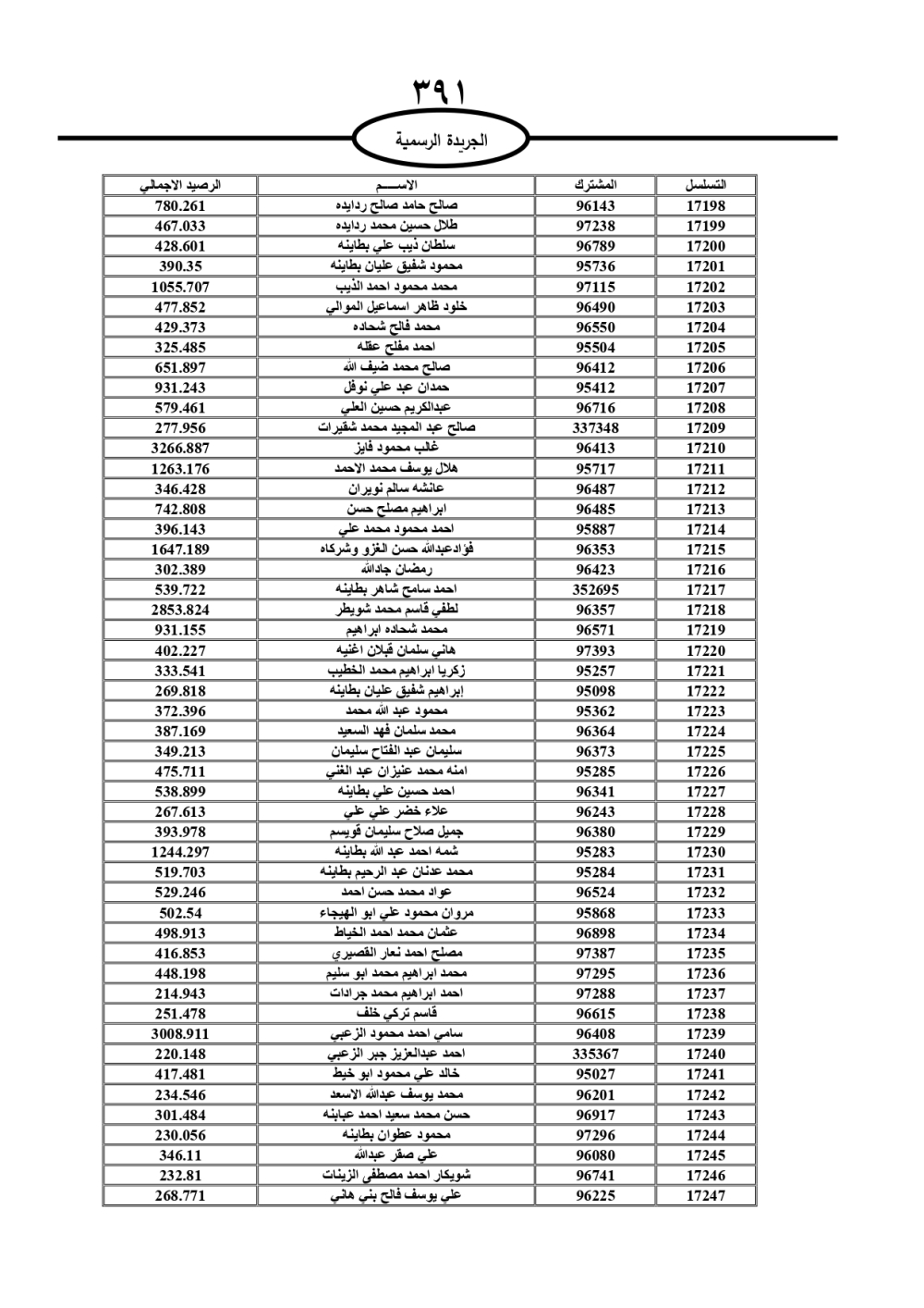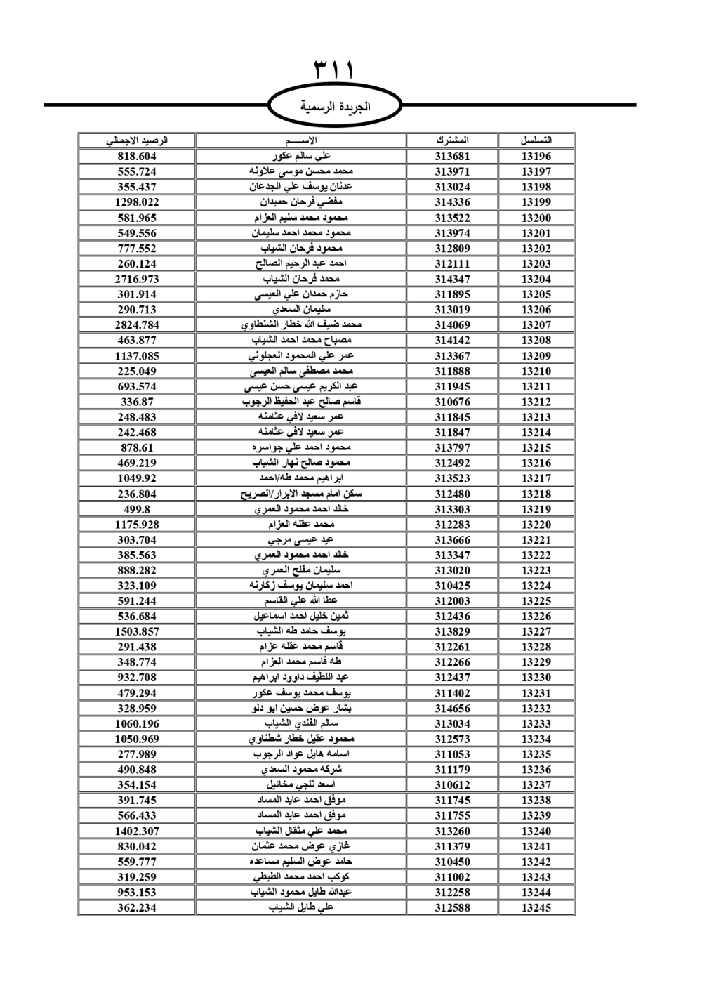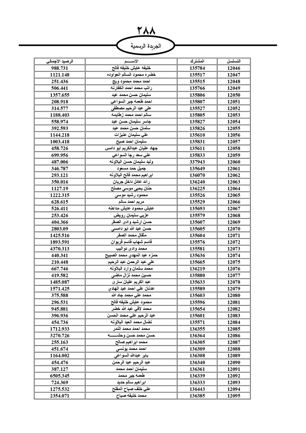 دعت سلطة المياه وبلدية الزرقاء، عشرات آلاف الأردنيين الواردة أسماؤهم بالكشوفات المرفقة، إلى ضرورة مراجعتها لتسوية أوضاعهم المالية كونه ترتب عليهم ذمم مالية، وذلك لتجنب الحجز على الأموال المنقولة وغير المنقولة بعد انقضاء 60 يوما من تاريخ النشر، علما أنه تم نشر هذه الأسماء في الجريدة الرسمية بتاريخ 16/2/2025.