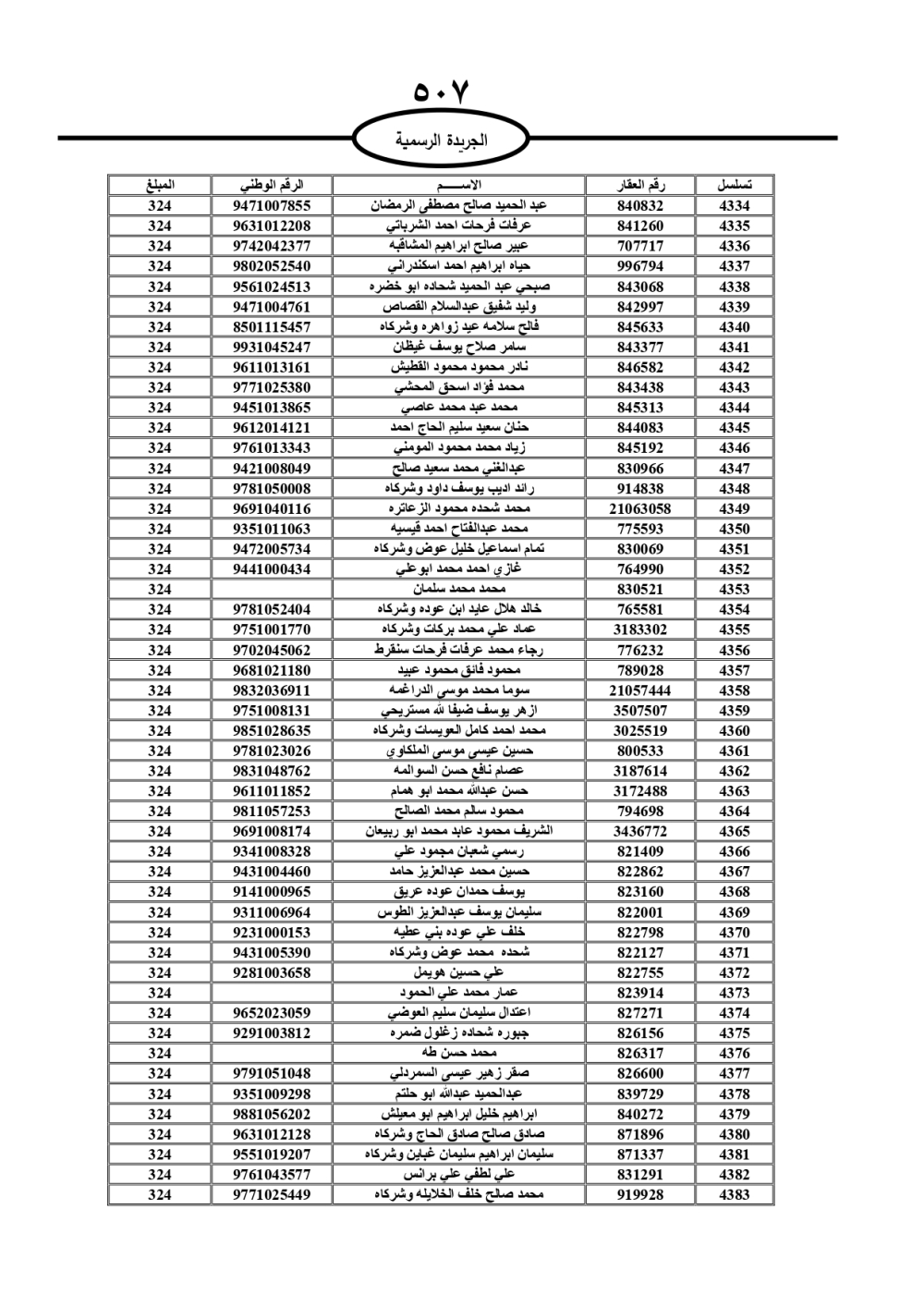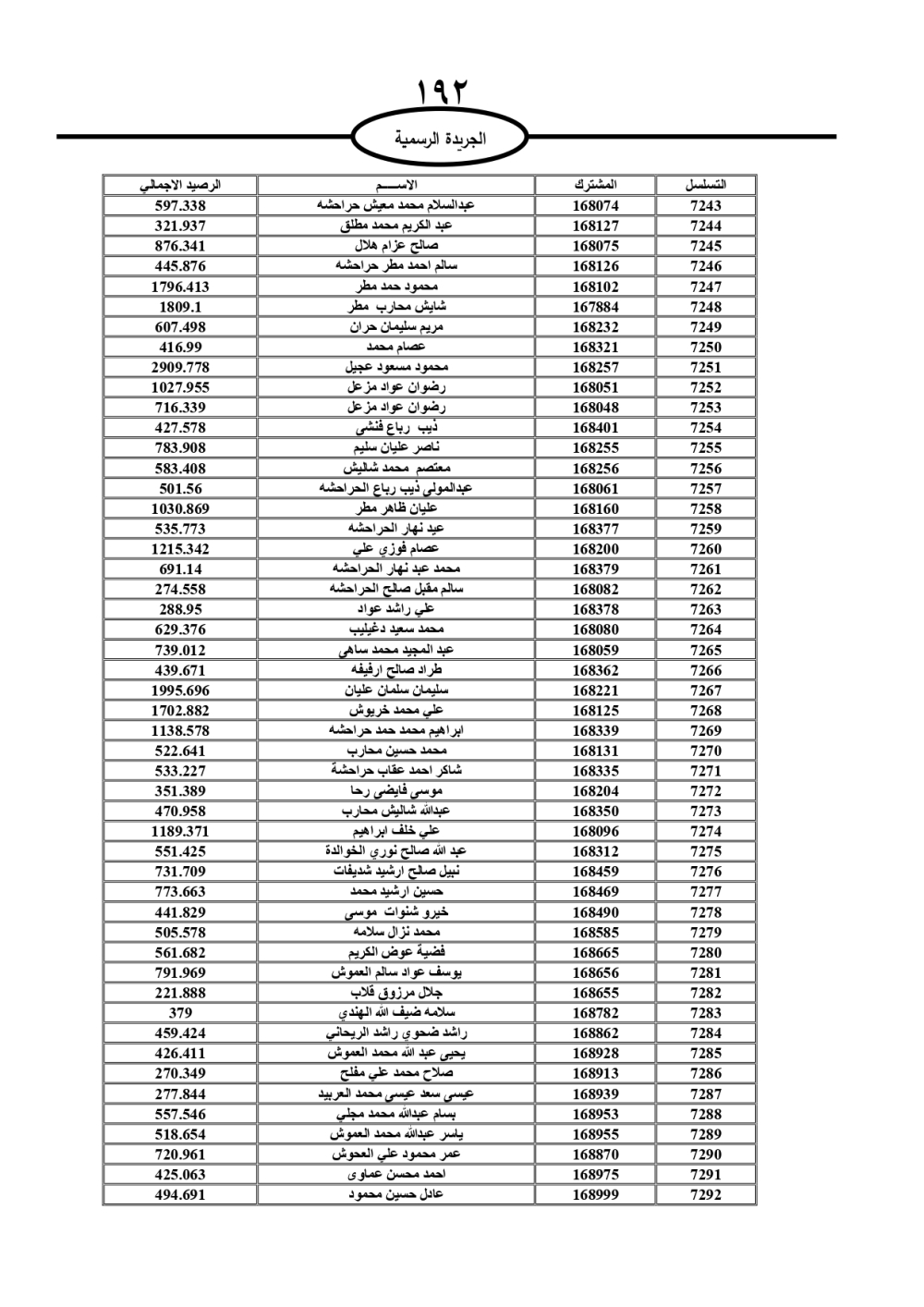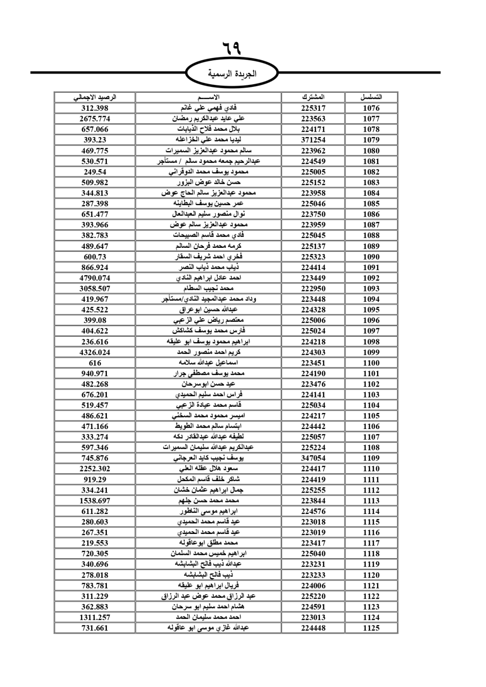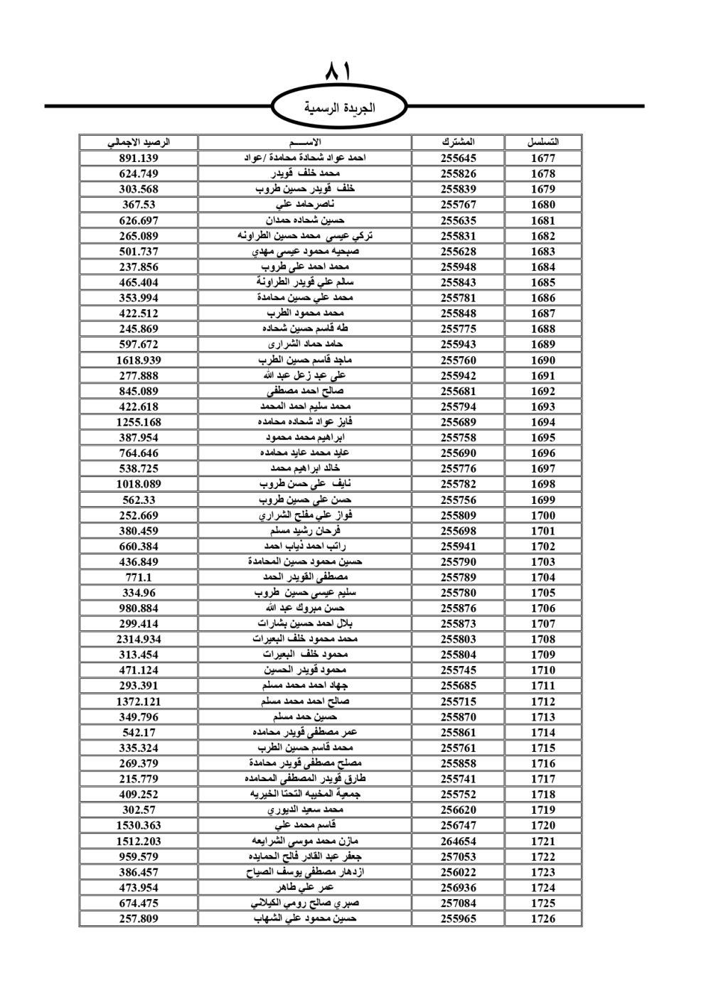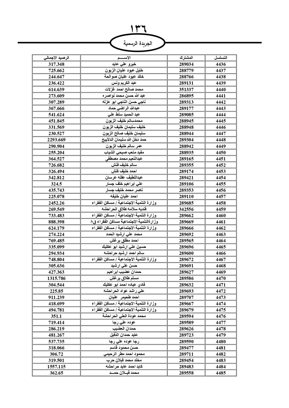 دعت سلطة المياه وبلدية الزرقاء، عشرات آلاف الأردنيين الواردة أسماؤهم بالكشوفات المرفقة، إلى ضرورة مراجعتها لتسوية أوضاعهم المالية كونه ترتب عليهم ذمم مالية، وذلك لتجنب الحجز على الأموال المنقولة وغير المنقولة بعد انقضاء 60 يوما من تاريخ النشر، علما أنه تم نشر هذه الأسماء في الجريدة الرسمية بتاريخ 16/2/2025.