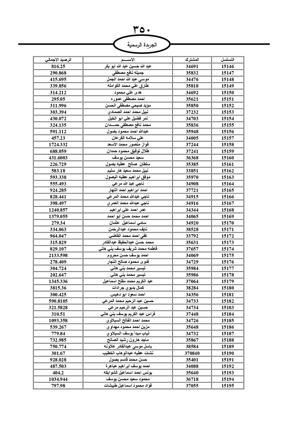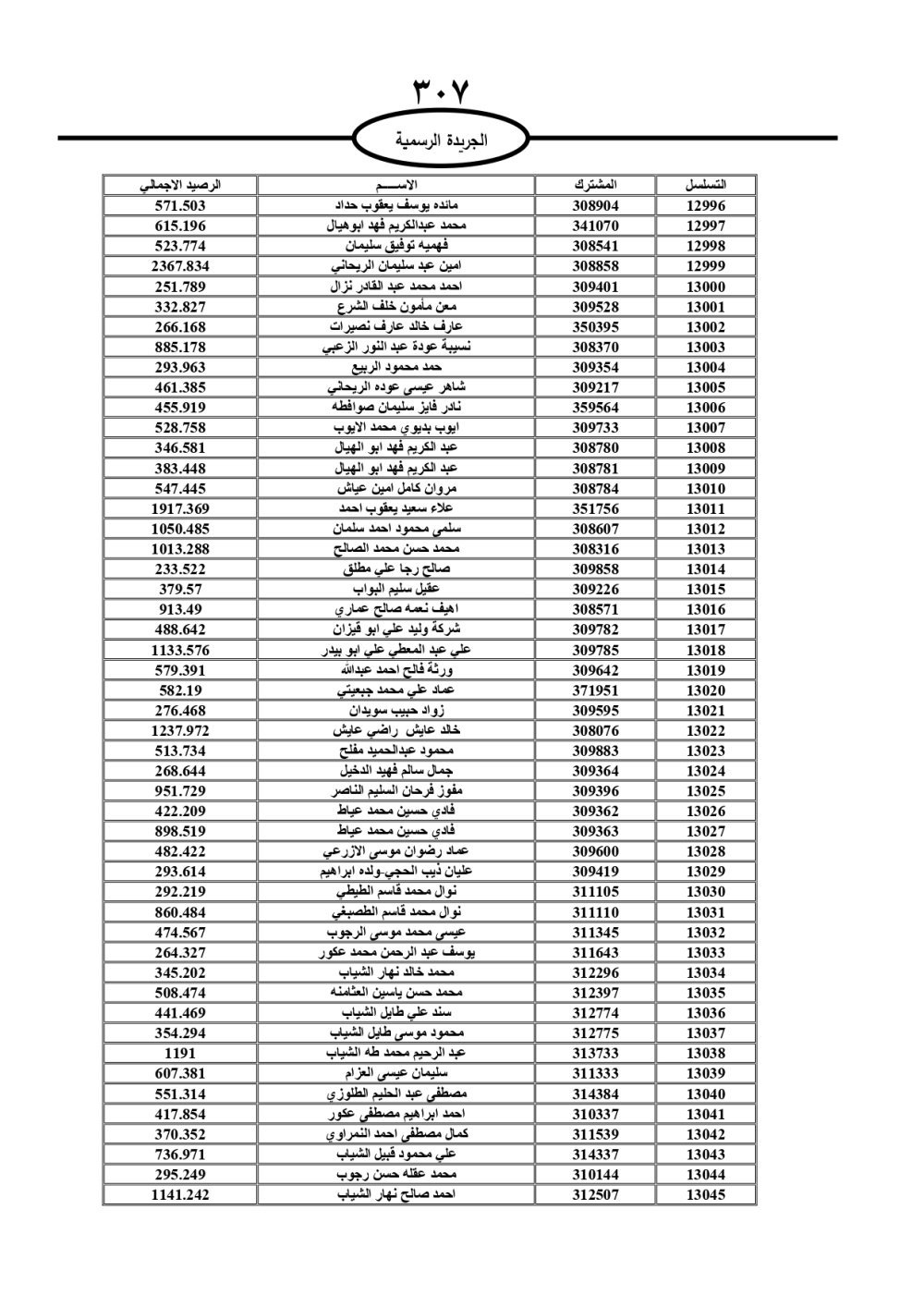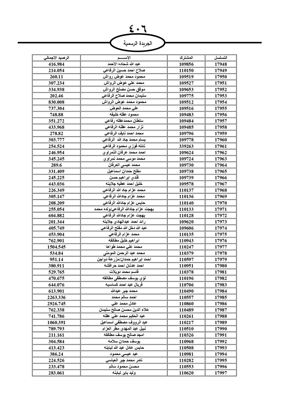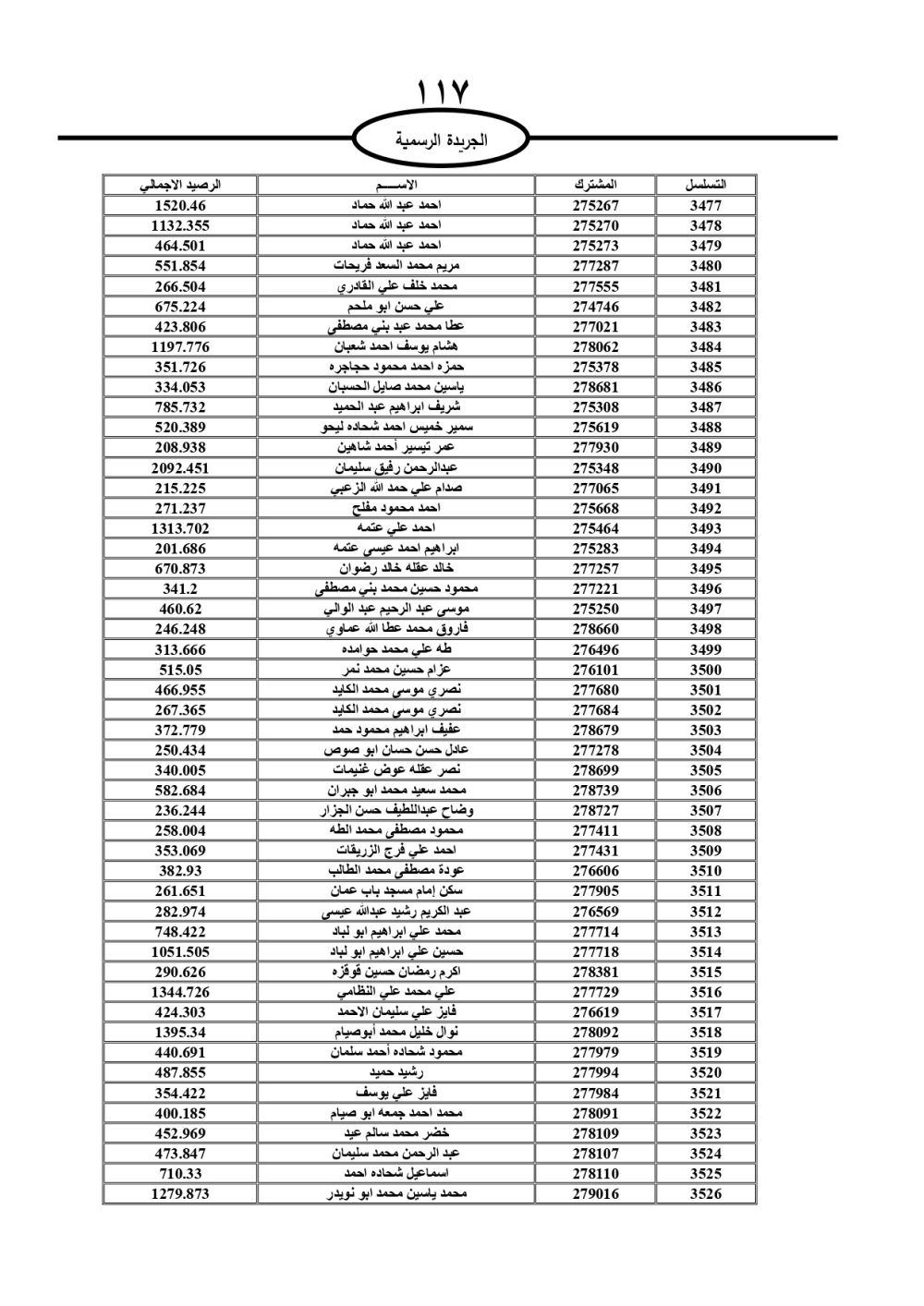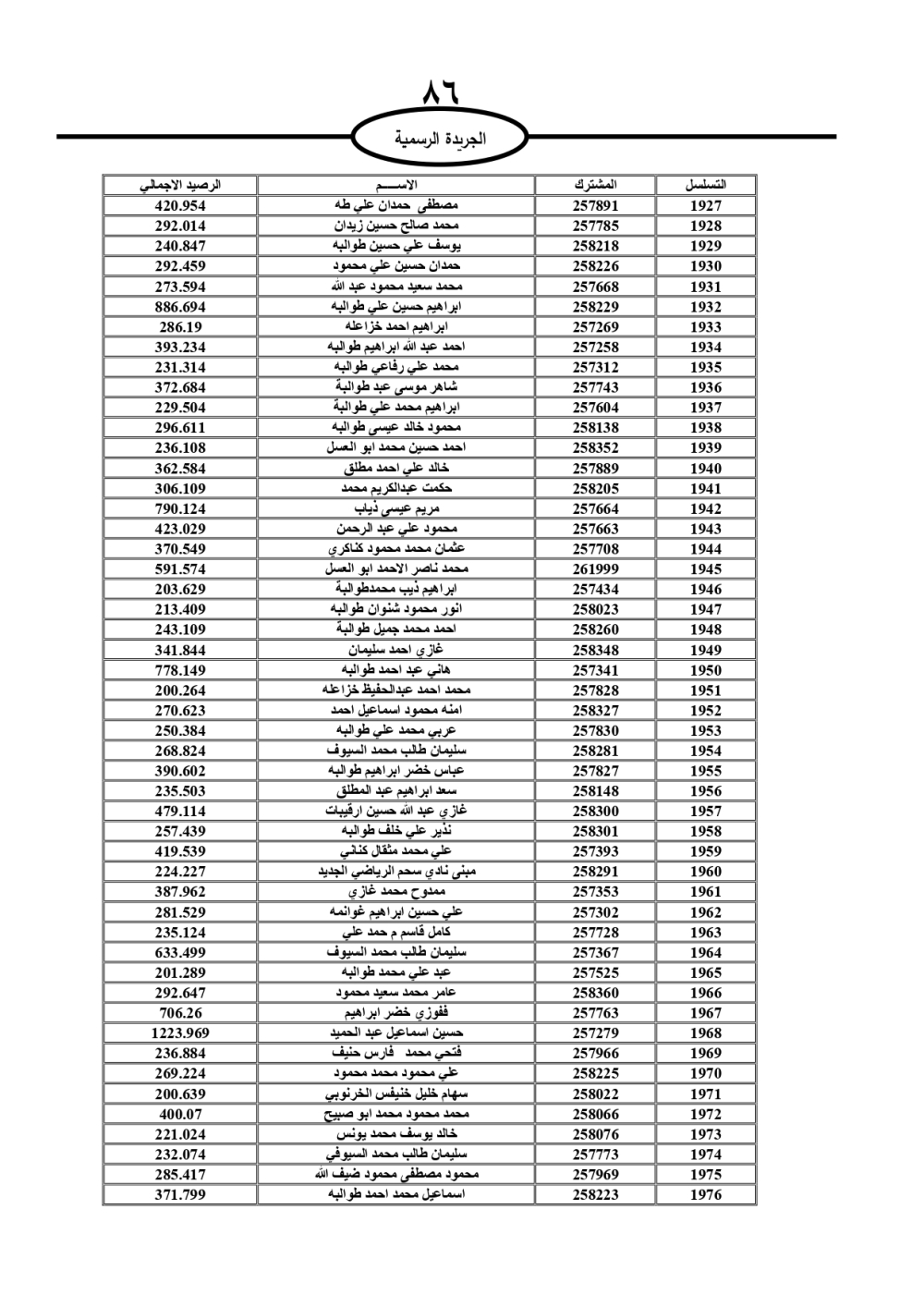 دعت سلطة المياه وبلدية الزرقاء، عشرات آلاف الأردنيين الواردة أسماؤهم بالكشوفات المرفقة، إلى ضرورة مراجعتها لتسوية أوضاعهم المالية كونه ترتب عليهم ذمم مالية، وذلك لتجنب الحجز على الأموال المنقولة وغير المنقولة بعد انقضاء 60 يوما من تاريخ النشر، علما أنه تم نشر هذه الأسماء في الجريدة الرسمية بتاريخ 16/2/2025.