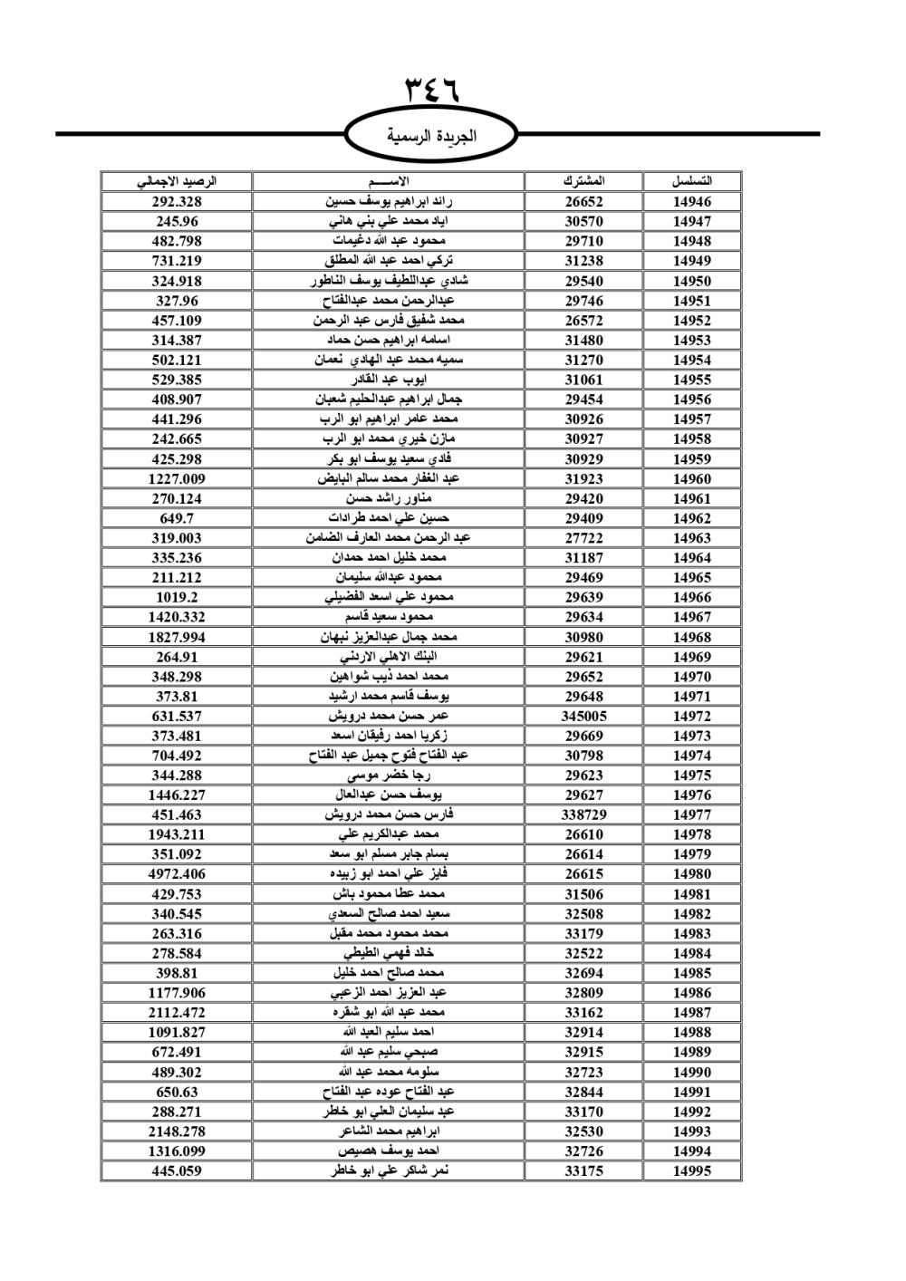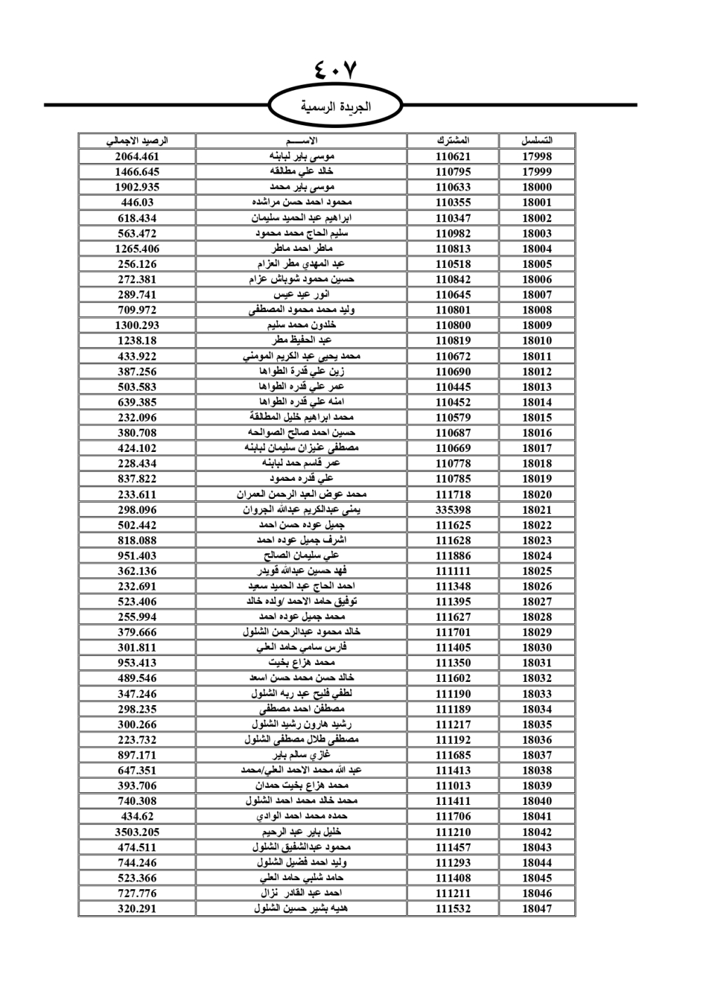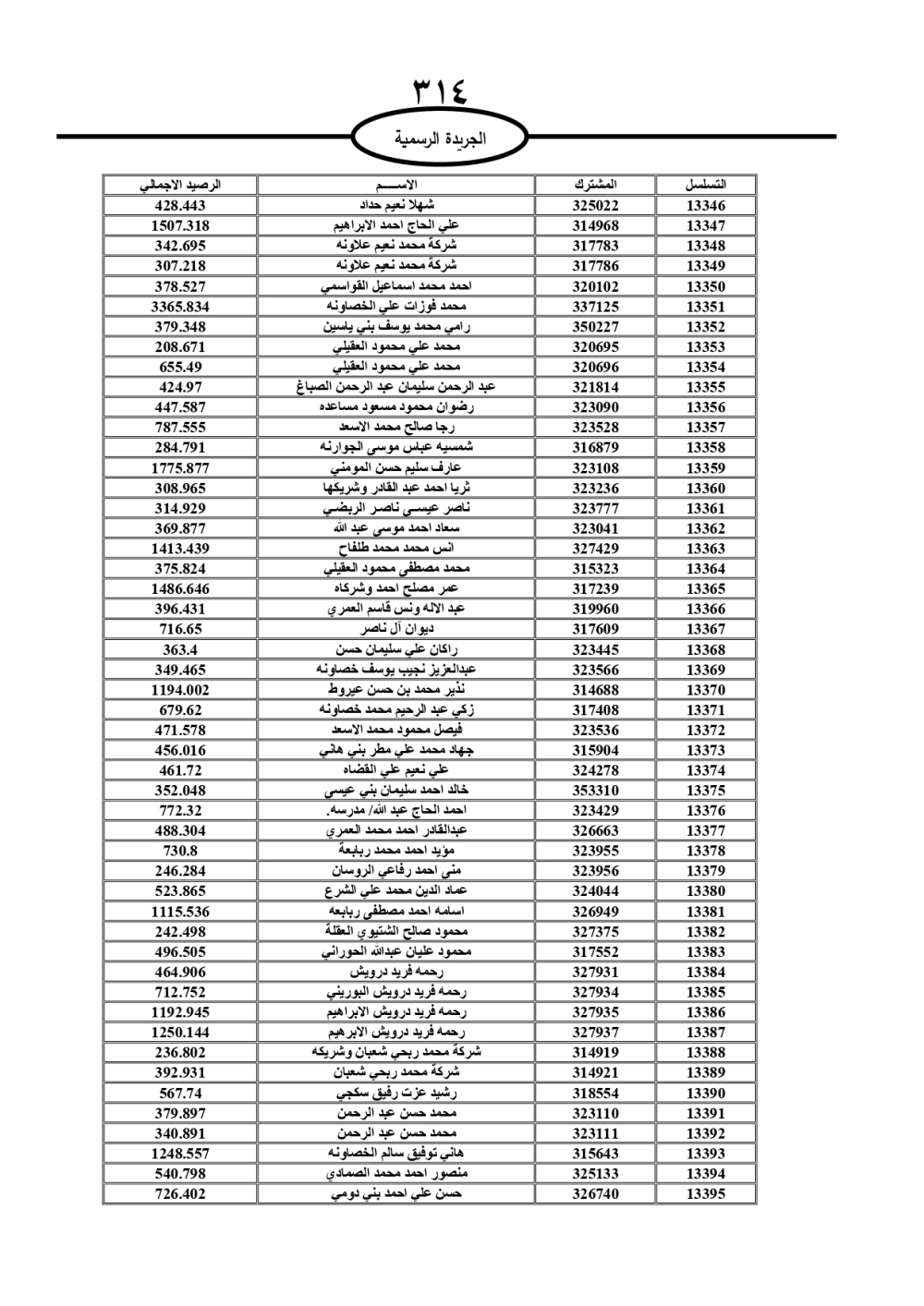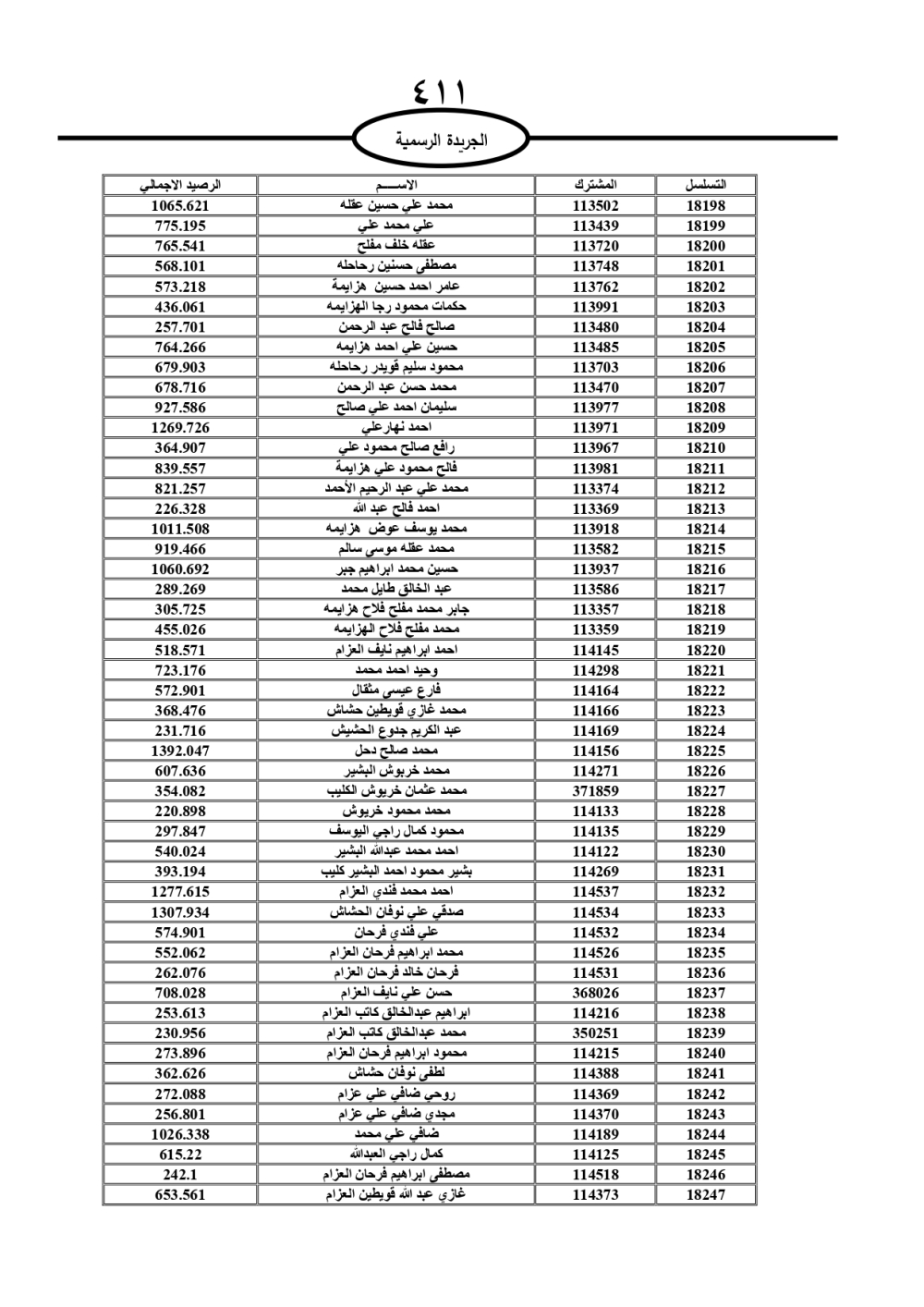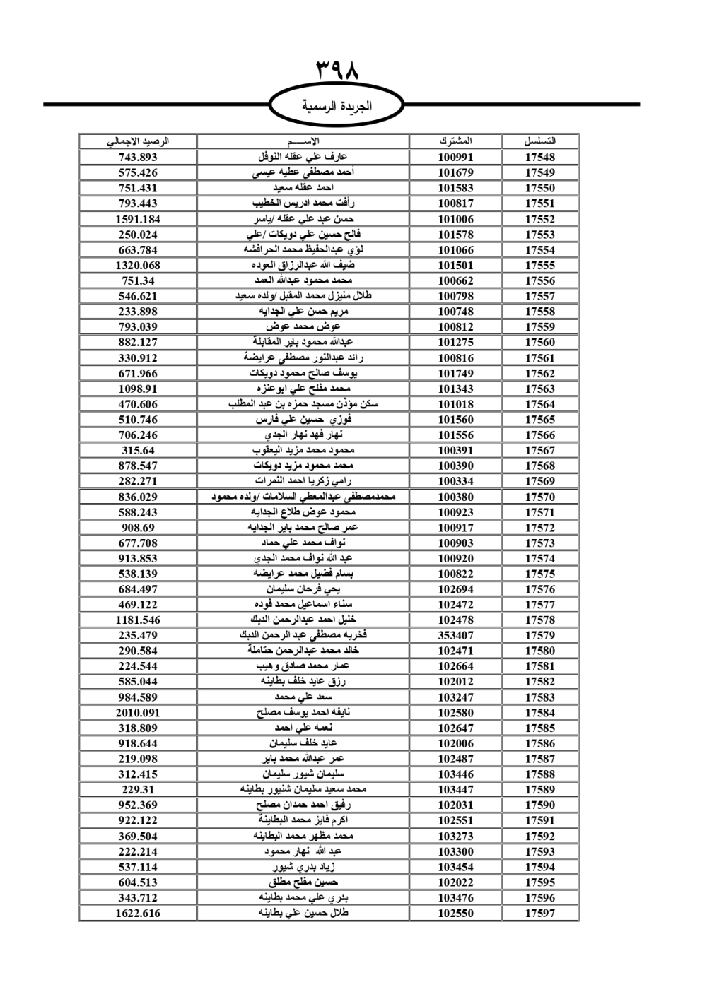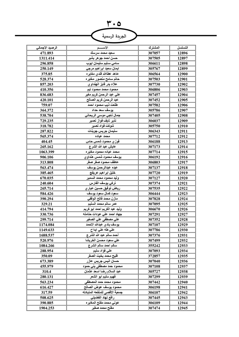دعت سلطة المياه وبلدية الزرقاء، عشرات آلاف الأردنيين الواردة أسماؤهم بالكشوفات المرفقة، إلى ضرورة مراجعتها لتسوية أوضاعهم المالية كونه ترتب عليهم ذمم مالية، وذلك لتجنب الحجز على الأموال المنقولة وغير المنقولة بعد انقضاء 60 يوما من تاريخ النشر، علما أنه تم نشر هذه الأسماء في الجريدة الرسمية بتاريخ 16/2/2025.