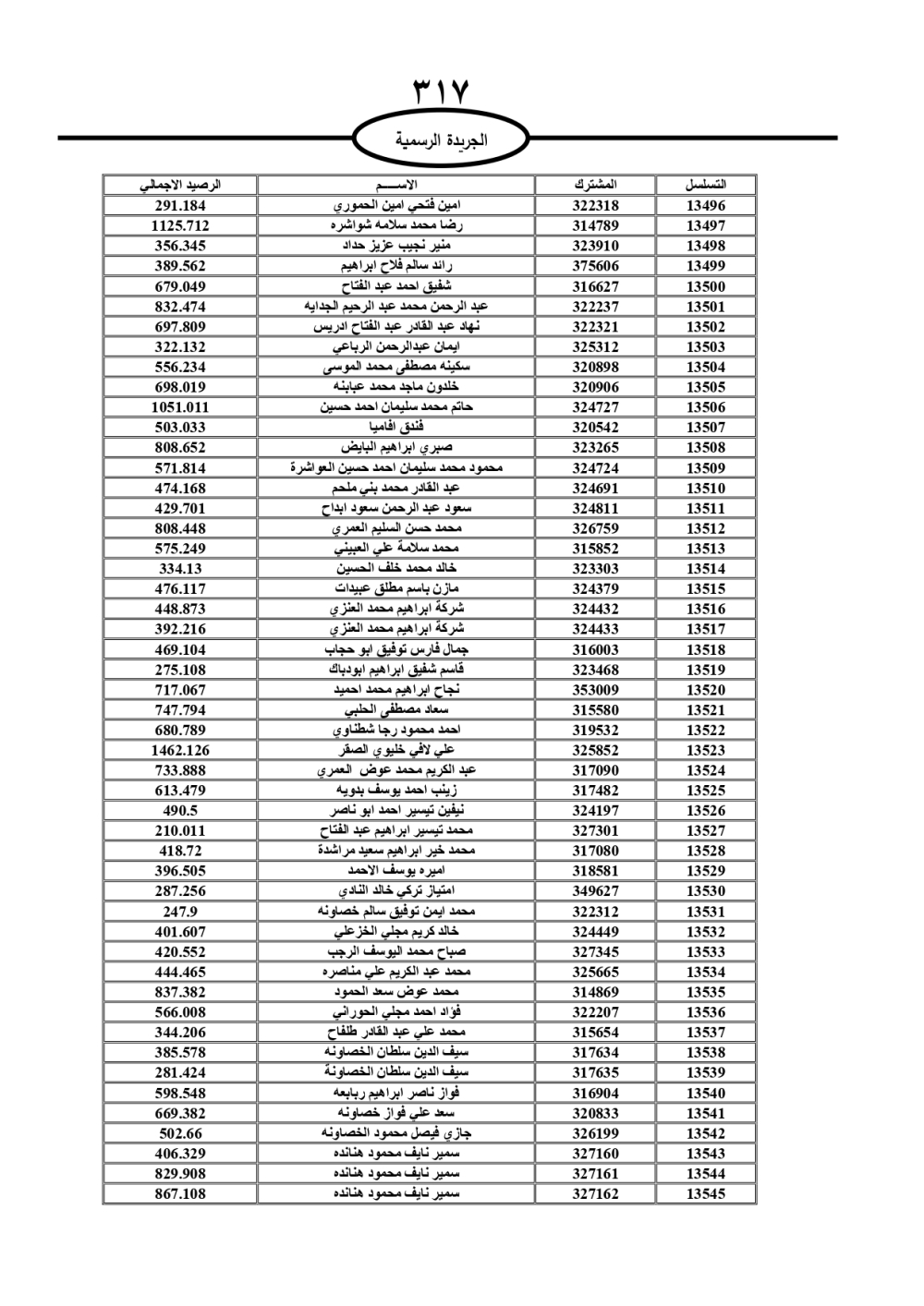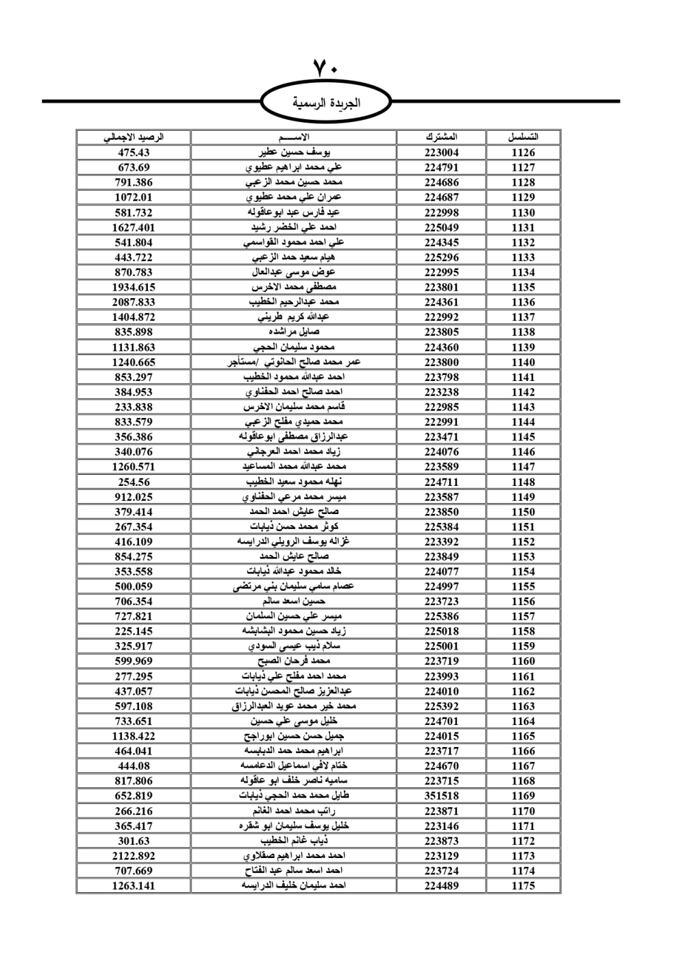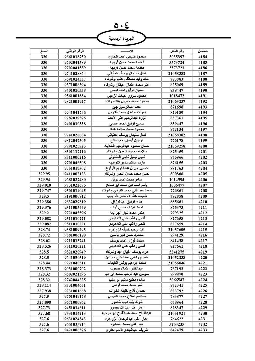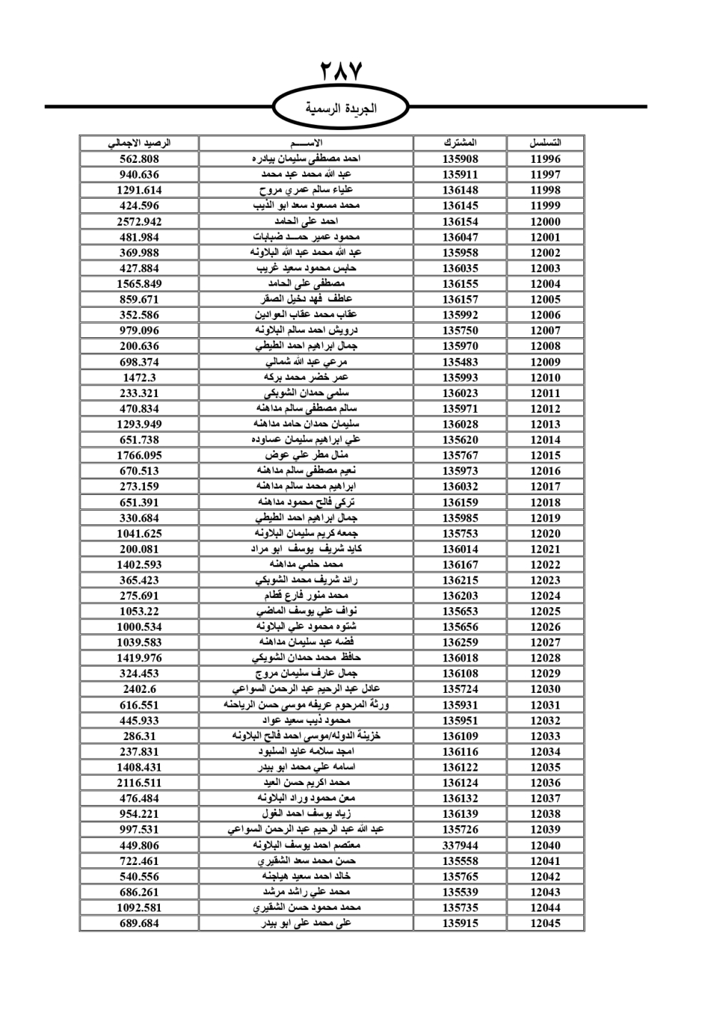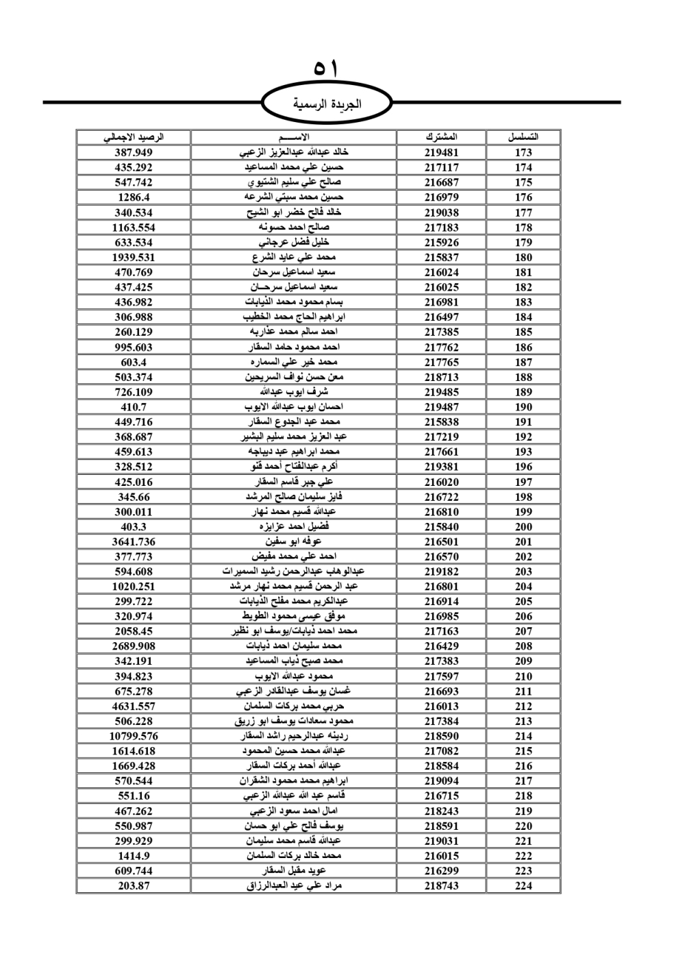 دعت سلطة المياه وبلدية الزرقاء، عشرات آلاف الأردنيين الواردة أسماؤهم بالكشوفات المرفقة، إلى ضرورة مراجعتها لتسوية أوضاعهم المالية كونه ترتب عليهم ذمم مالية، وذلك لتجنب الحجز على الأموال المنقولة وغير المنقولة بعد انقضاء 60 يوما من تاريخ النشر، علما أنه تم نشر هذه الأسماء في الجريدة الرسمية بتاريخ 16/2/2025.