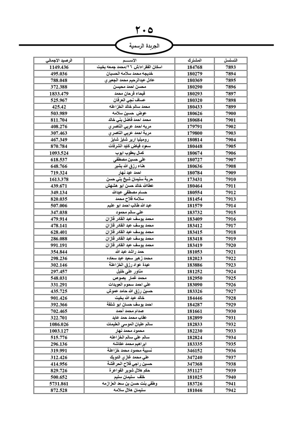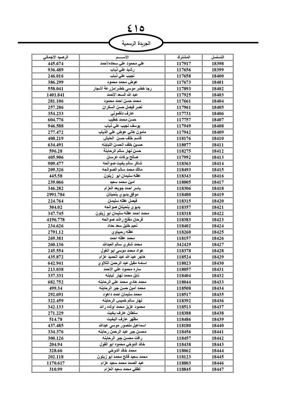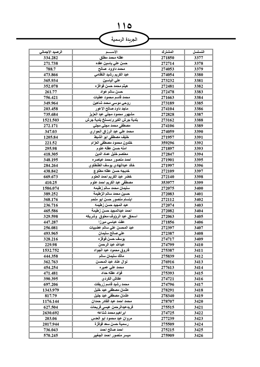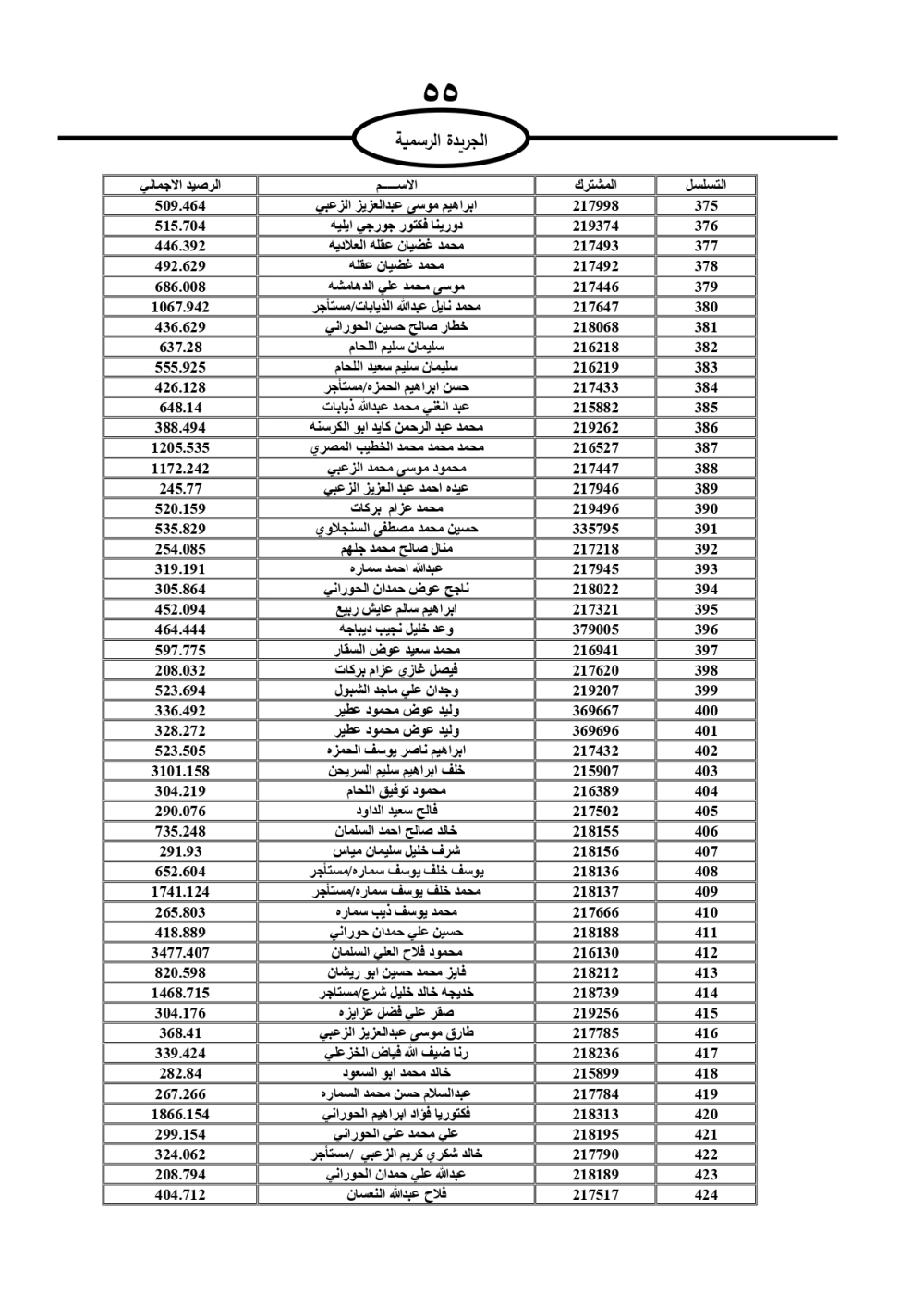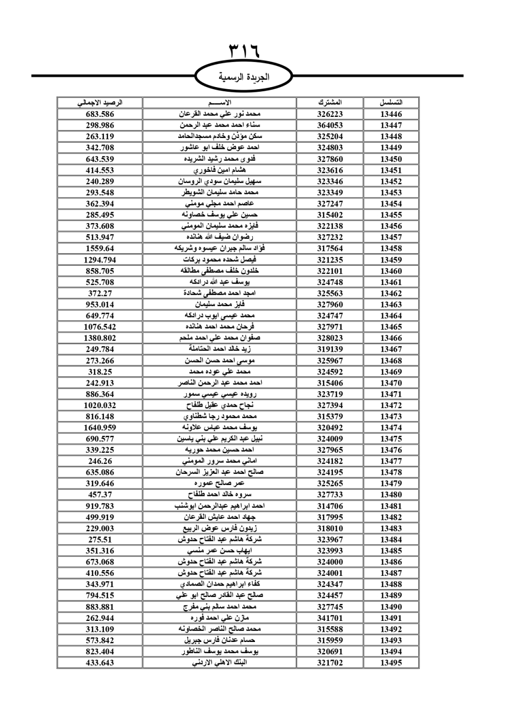 دعت سلطة المياه وبلدية الزرقاء، عشرات آلاف الأردنيين الواردة أسماؤهم بالكشوفات المرفقة، إلى ضرورة مراجعتها لتسوية أوضاعهم المالية كونه ترتب عليهم ذمم مالية، وذلك لتجنب الحجز على الأموال المنقولة وغير المنقولة بعد انقضاء 60 يوما من تاريخ النشر، علما أنه تم نشر هذه الأسماء في الجريدة الرسمية بتاريخ 16/2/2025.
