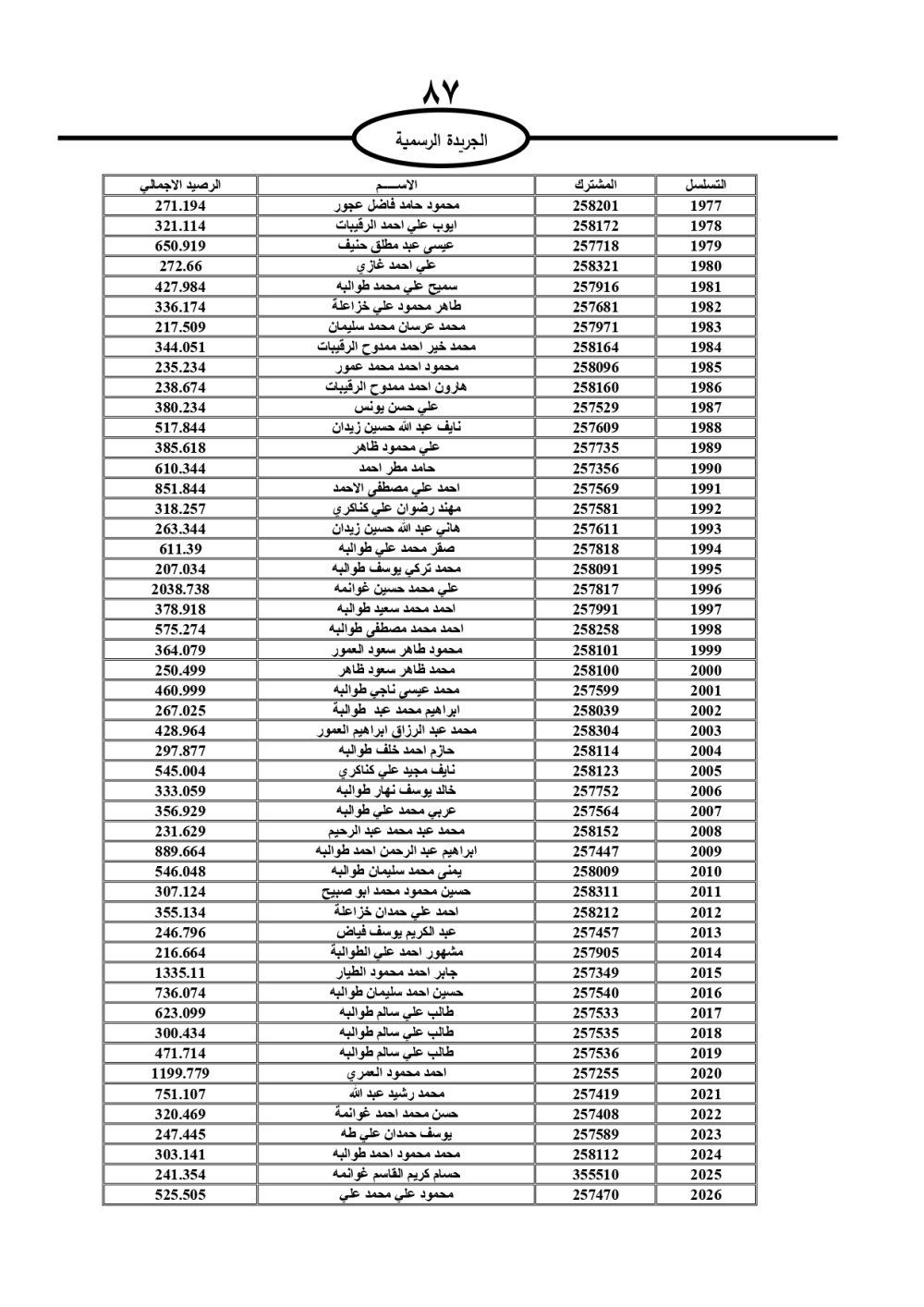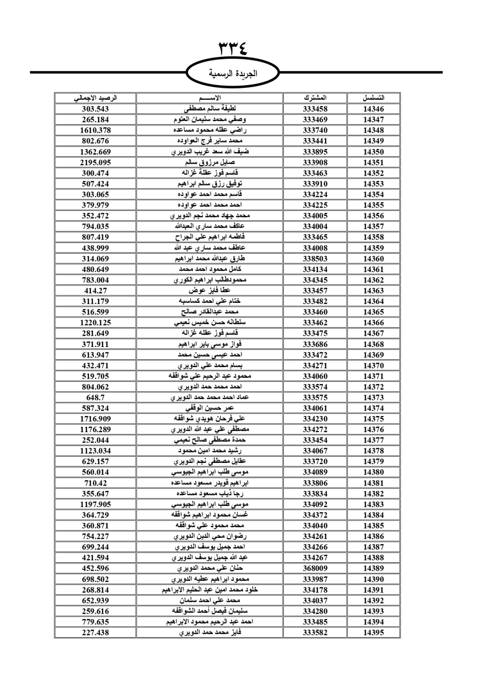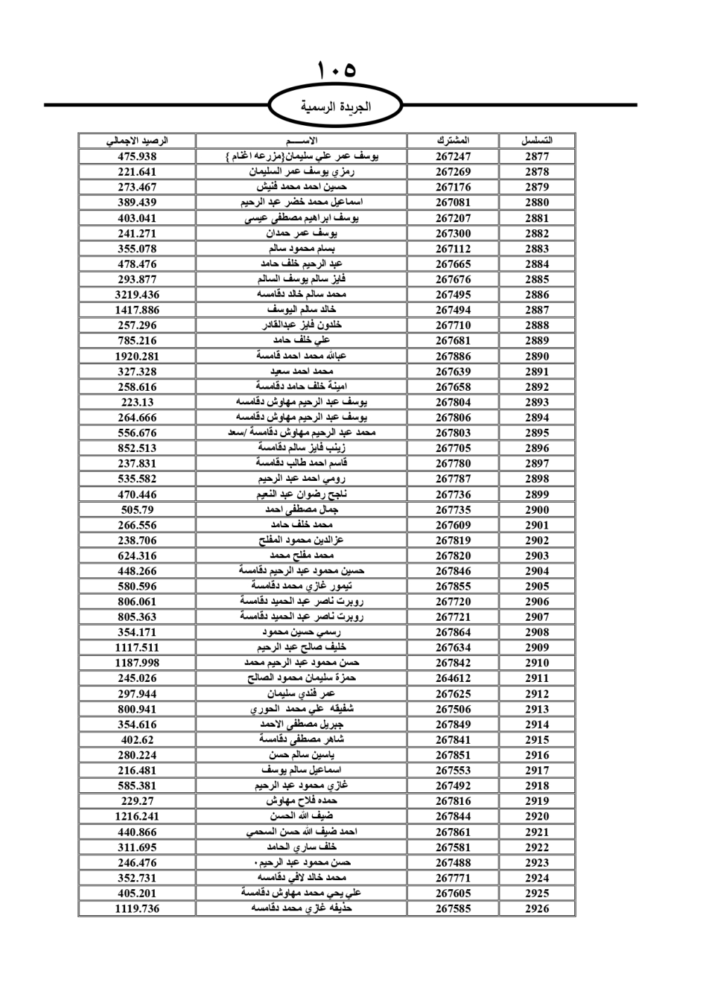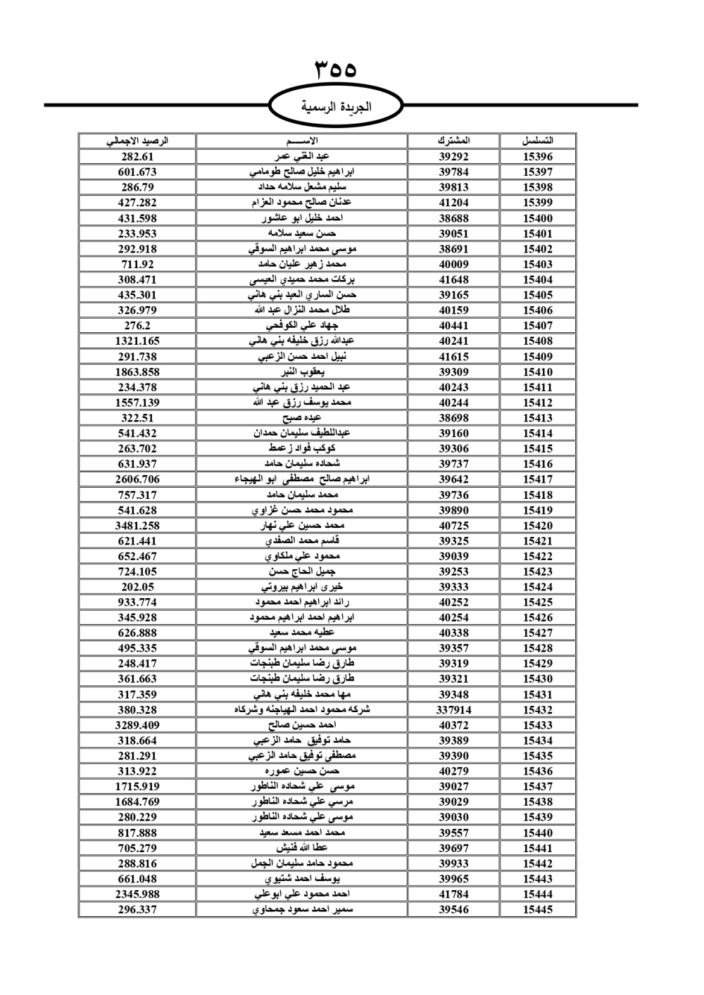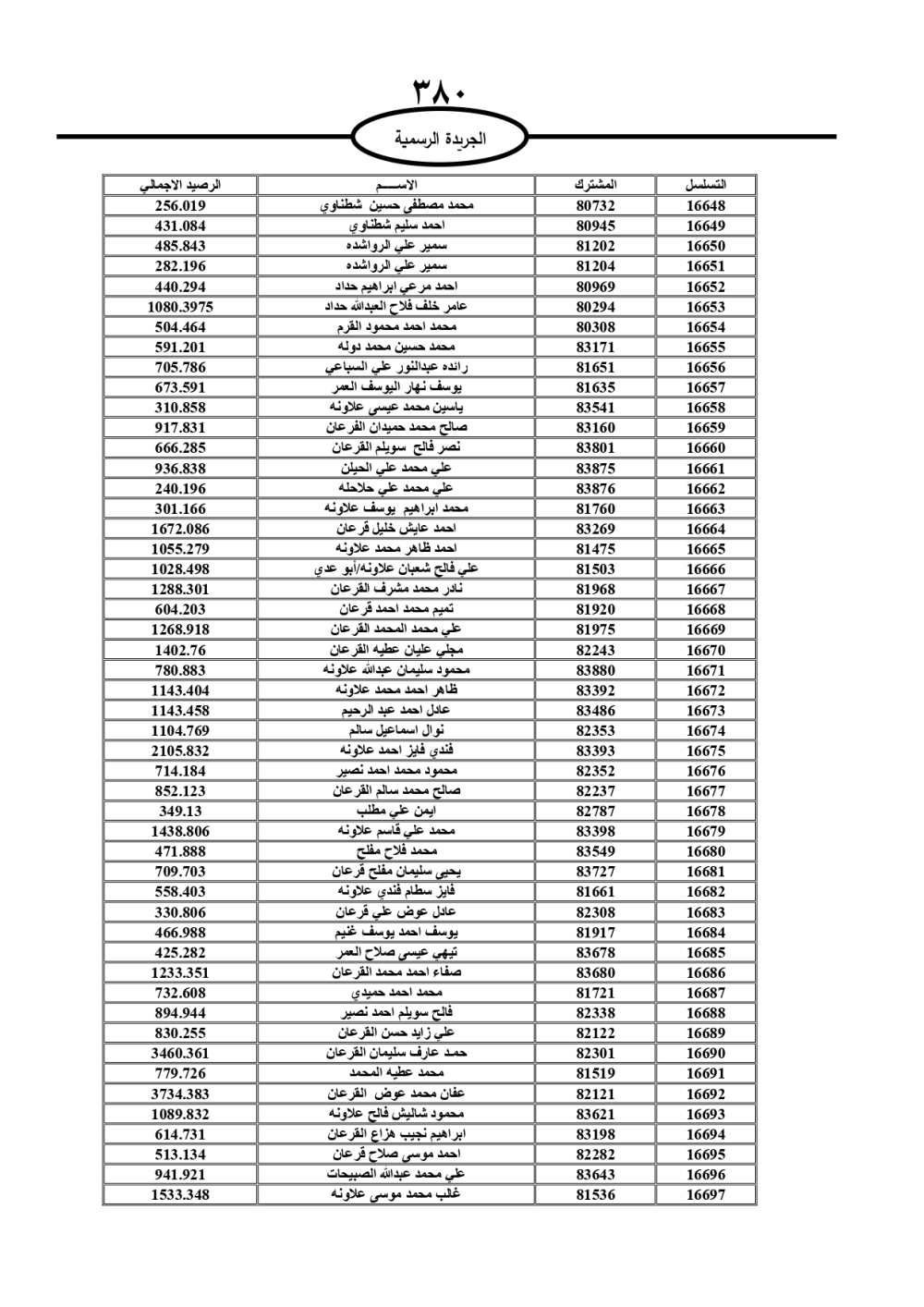 دعت سلطة المياه وبلدية الزرقاء، عشرات آلاف الأردنيين الواردة أسماؤهم بالكشوفات المرفقة، إلى ضرورة مراجعتها لتسوية أوضاعهم المالية كونه ترتب عليهم ذمم مالية، وذلك لتجنب الحجز على الأموال المنقولة وغير المنقولة بعد انقضاء 60 يوما من تاريخ النشر، علما أنه تم نشر هذه الأسماء في الجريدة الرسمية بتاريخ 16/2/2025.