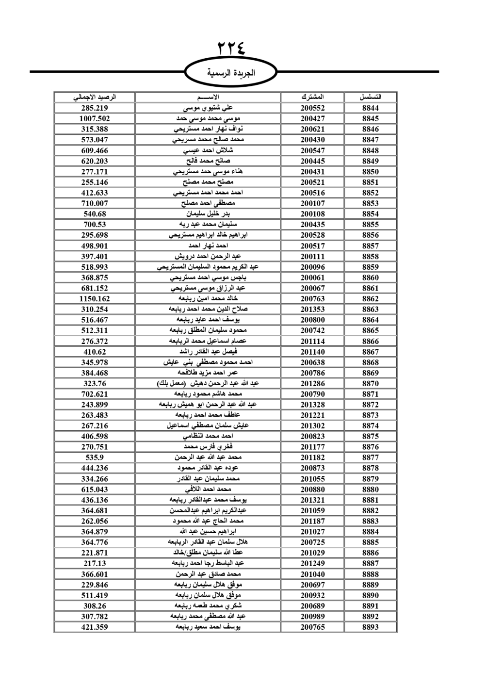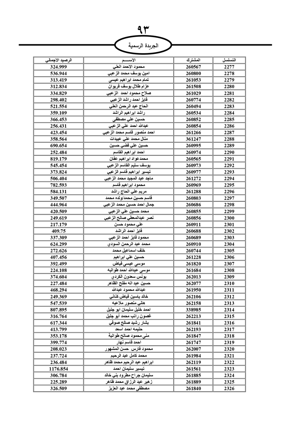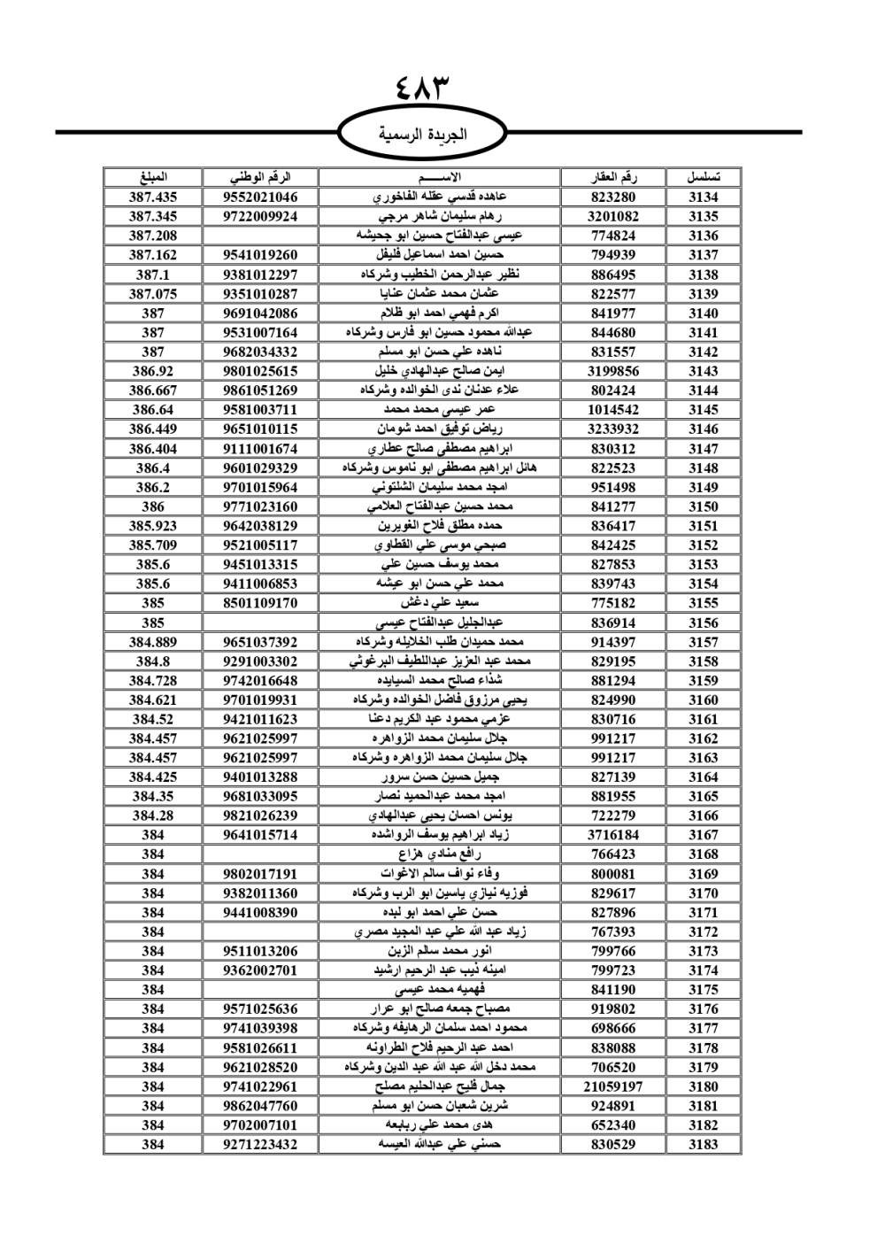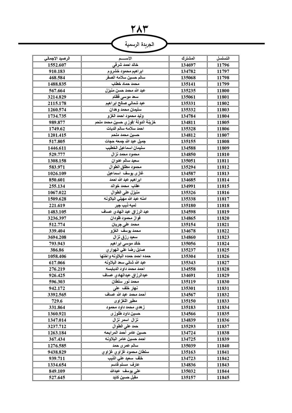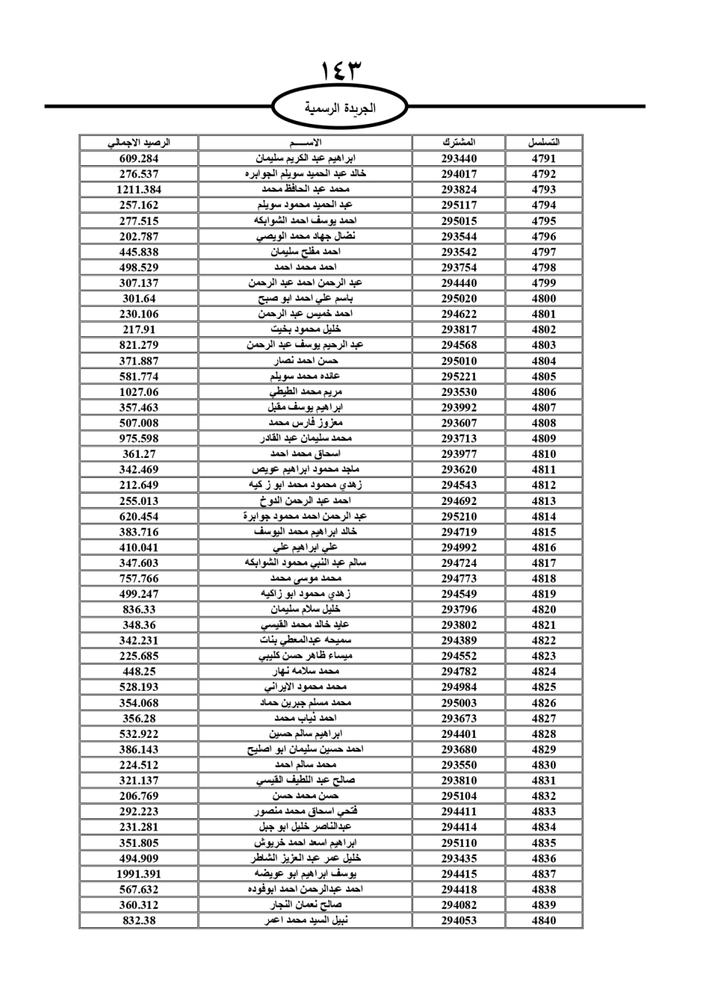 دعت سلطة المياه وبلدية الزرقاء، عشرات آلاف الأردنيين الواردة أسماؤهم بالكشوفات المرفقة، إلى ضرورة مراجعتها لتسوية أوضاعهم المالية كونه ترتب عليهم ذمم مالية، وذلك لتجنب الحجز على الأموال المنقولة وغير المنقولة بعد انقضاء 60 يوما من تاريخ النشر، علما أنه تم نشر هذه الأسماء في الجريدة الرسمية بتاريخ 16/2/2025.