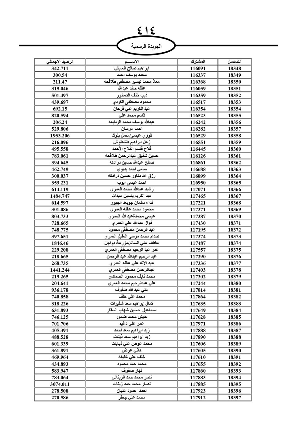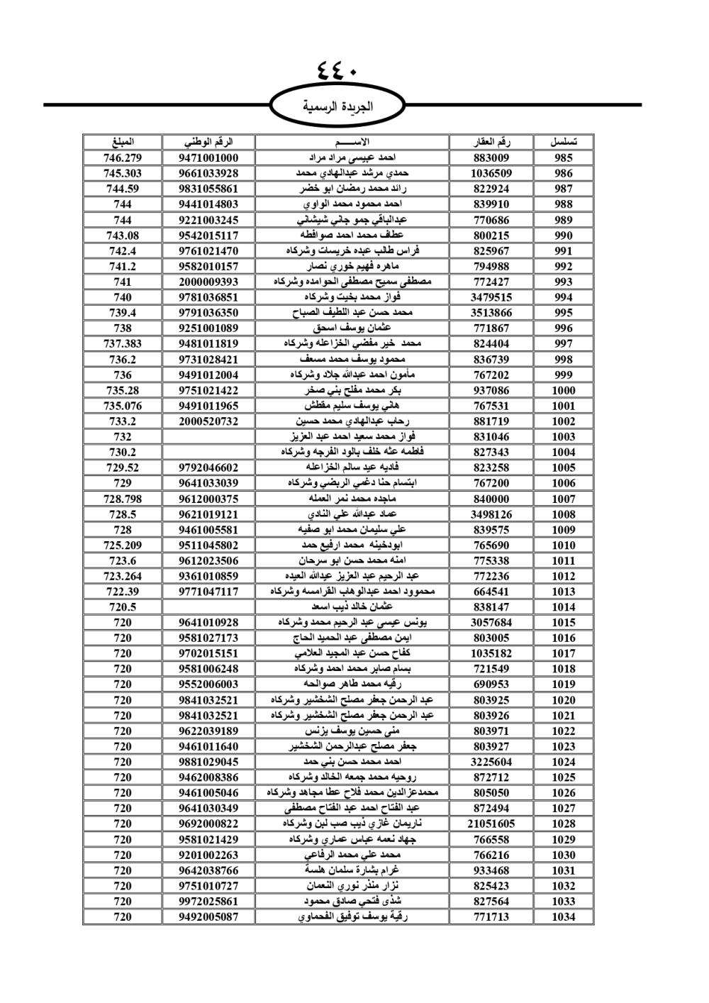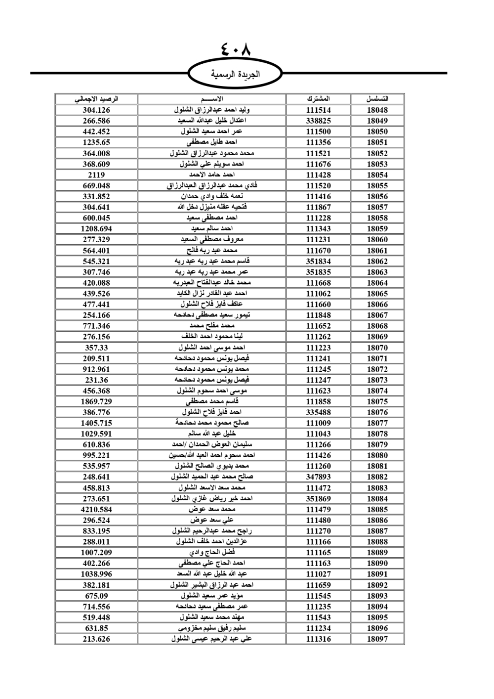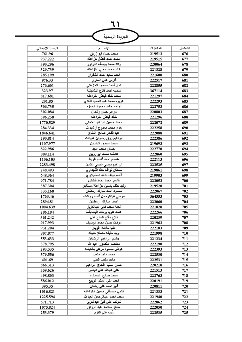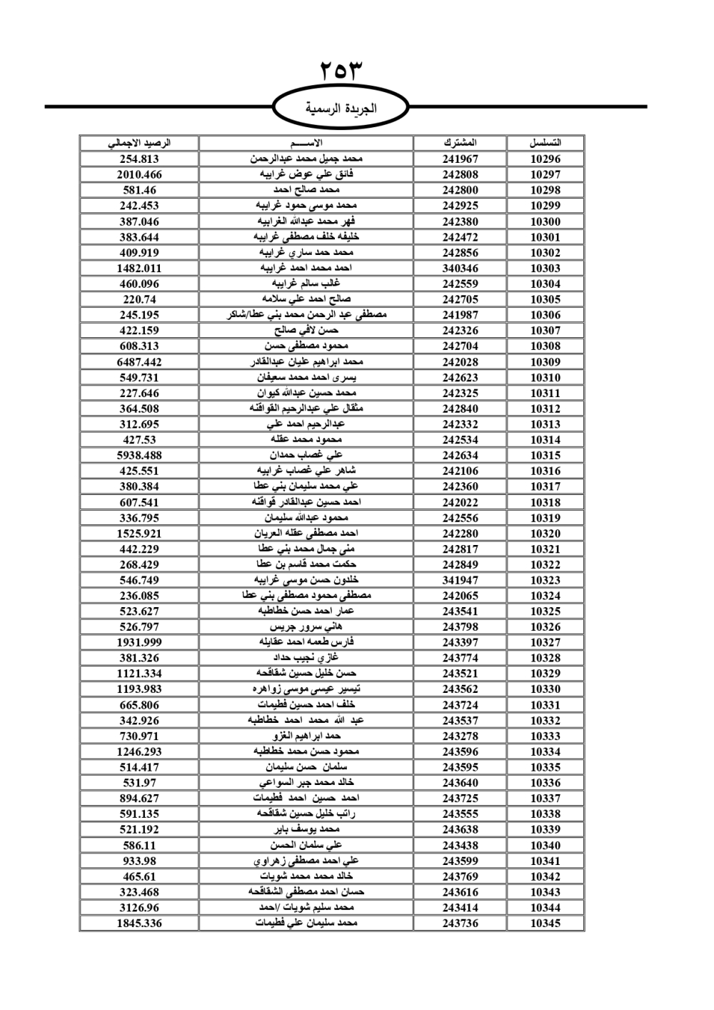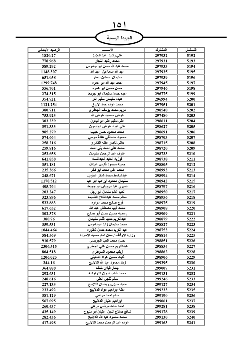 دعت سلطة المياه وبلدية الزرقاء، عشرات آلاف الأردنيين الواردة أسماؤهم بالكشوفات المرفقة، إلى ضرورة مراجعتها لتسوية أوضاعهم المالية كونه ترتب عليهم ذمم مالية، وذلك لتجنب الحجز على الأموال المنقولة وغير المنقولة بعد انقضاء 60 يوما من تاريخ النشر، علما أنه تم نشر هذه الأسماء في الجريدة الرسمية بتاريخ 16/2/2025.