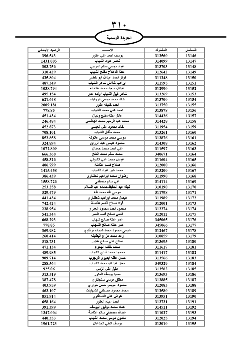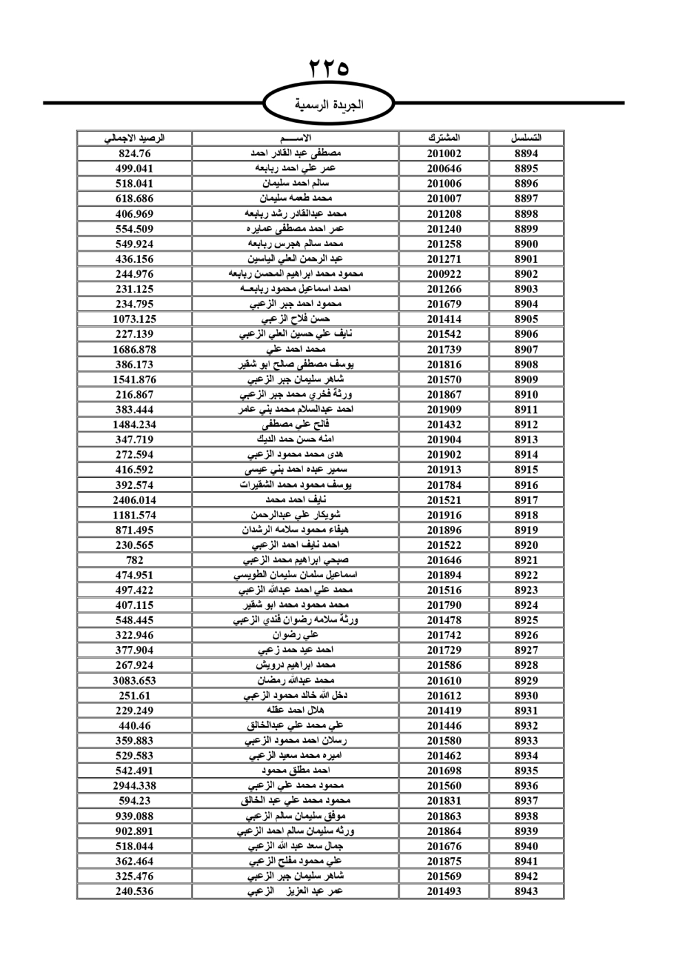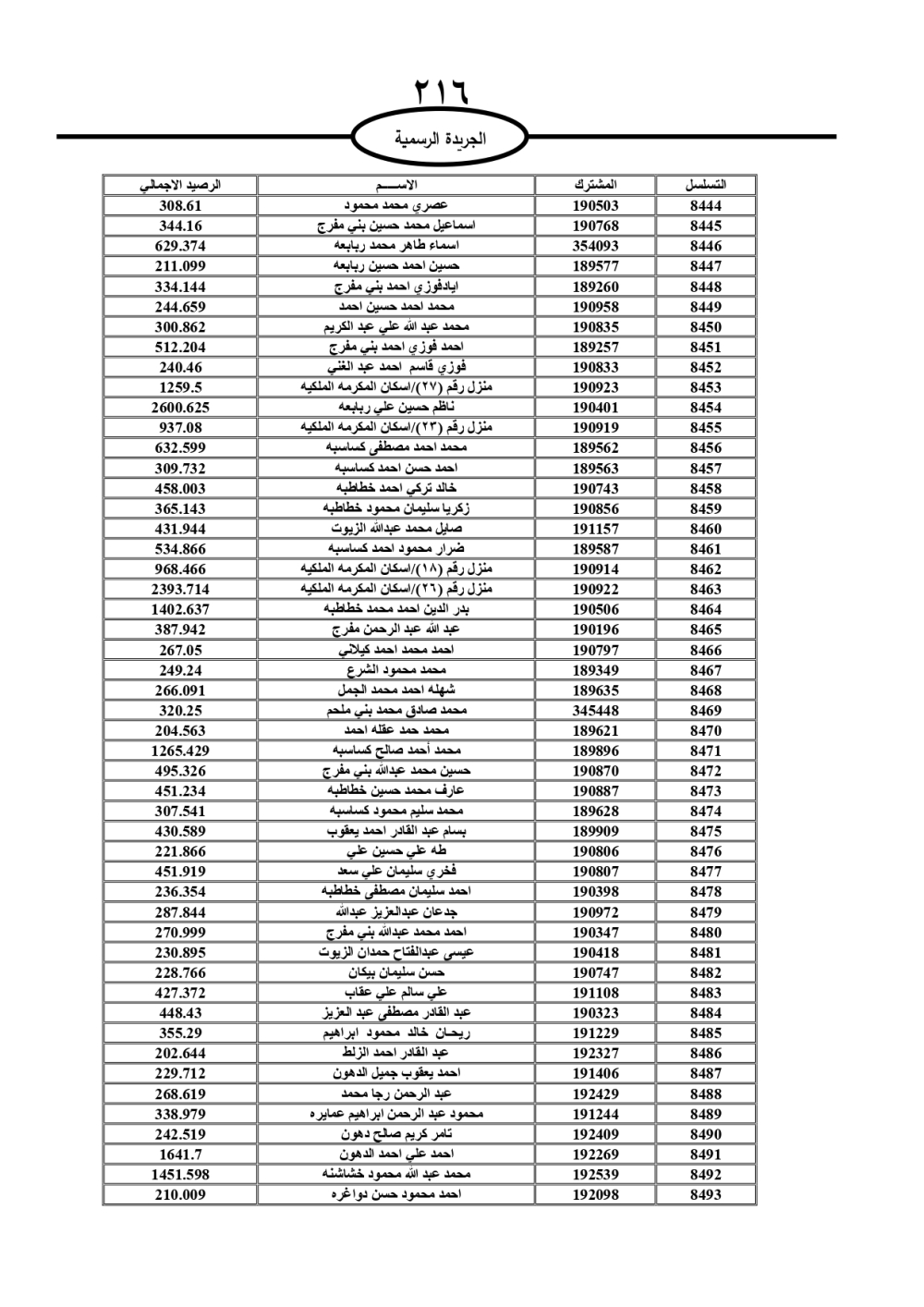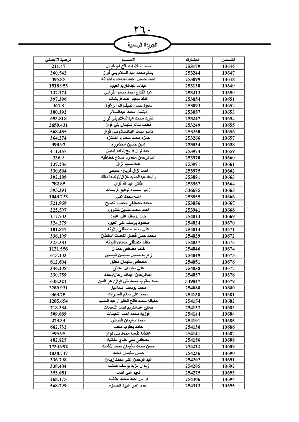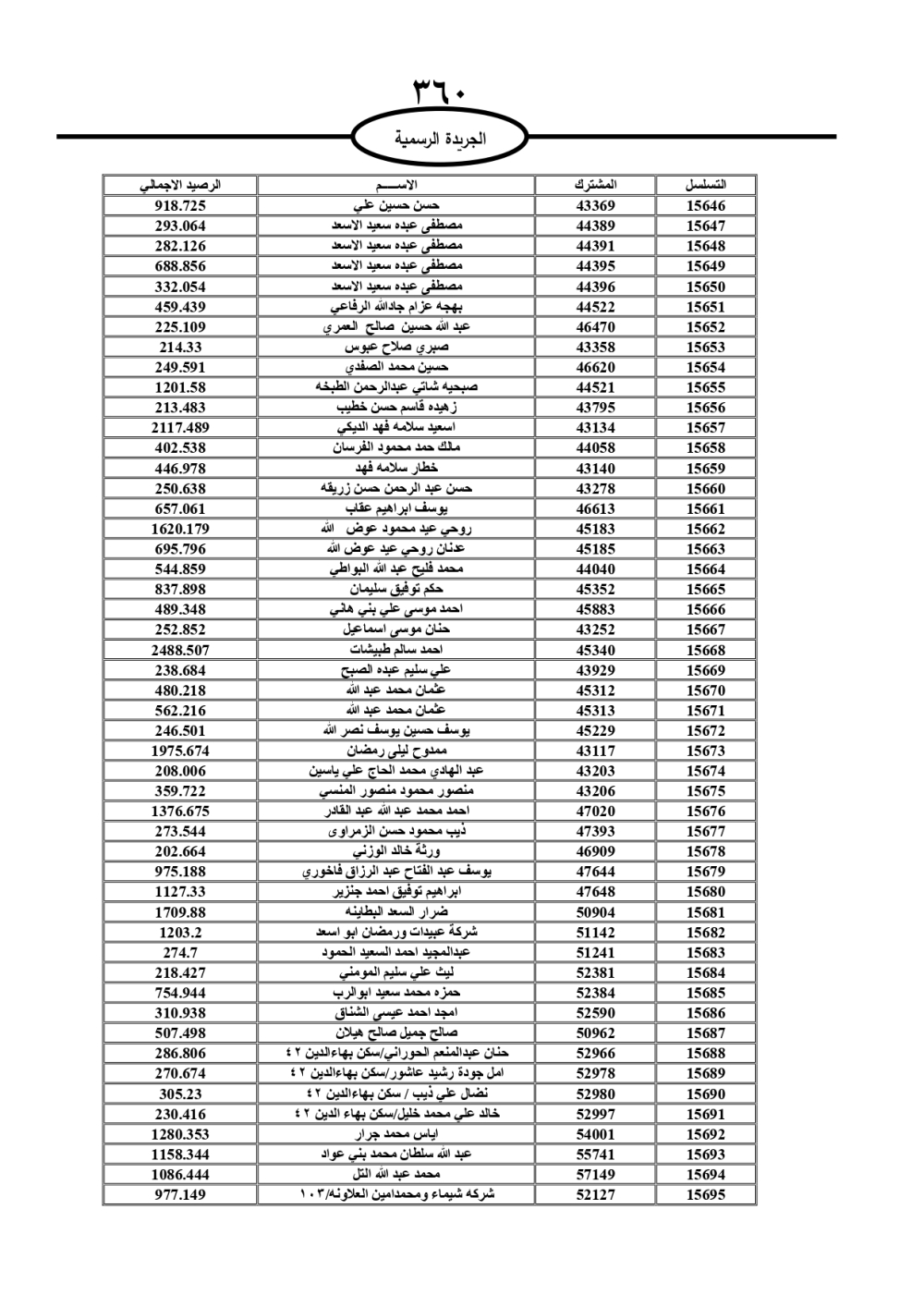 دعت سلطة المياه وبلدية الزرقاء، عشرات آلاف الأردنيين الواردة أسماؤهم بالكشوفات المرفقة، إلى ضرورة مراجعتها لتسوية أوضاعهم المالية كونه ترتب عليهم ذمم مالية، وذلك لتجنب الحجز على الأموال المنقولة وغير المنقولة بعد انقضاء 60 يوما من تاريخ النشر، علما أنه تم نشر هذه الأسماء في الجريدة الرسمية بتاريخ 16/2/2025.