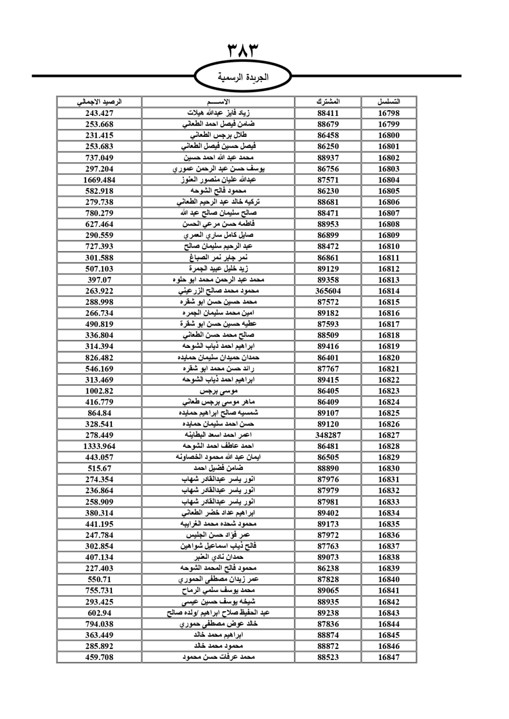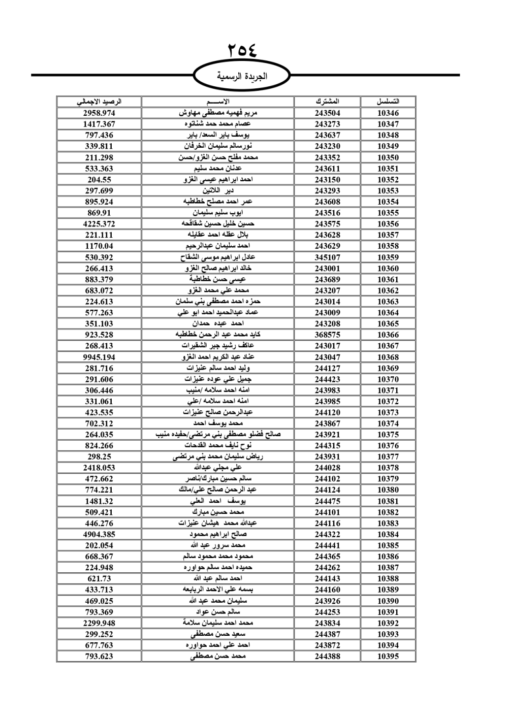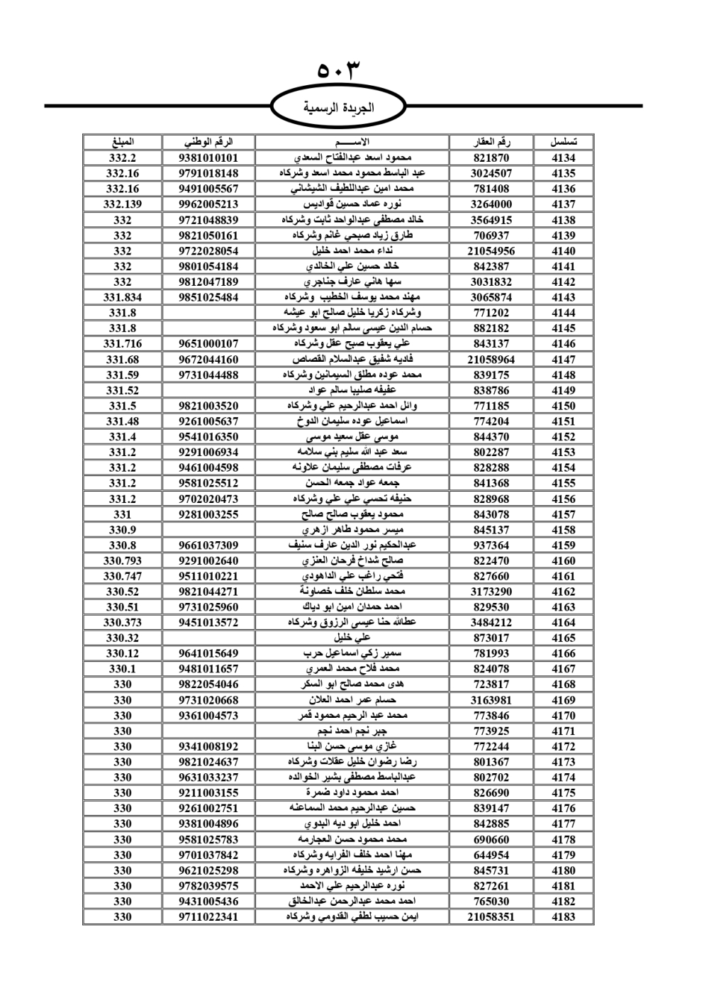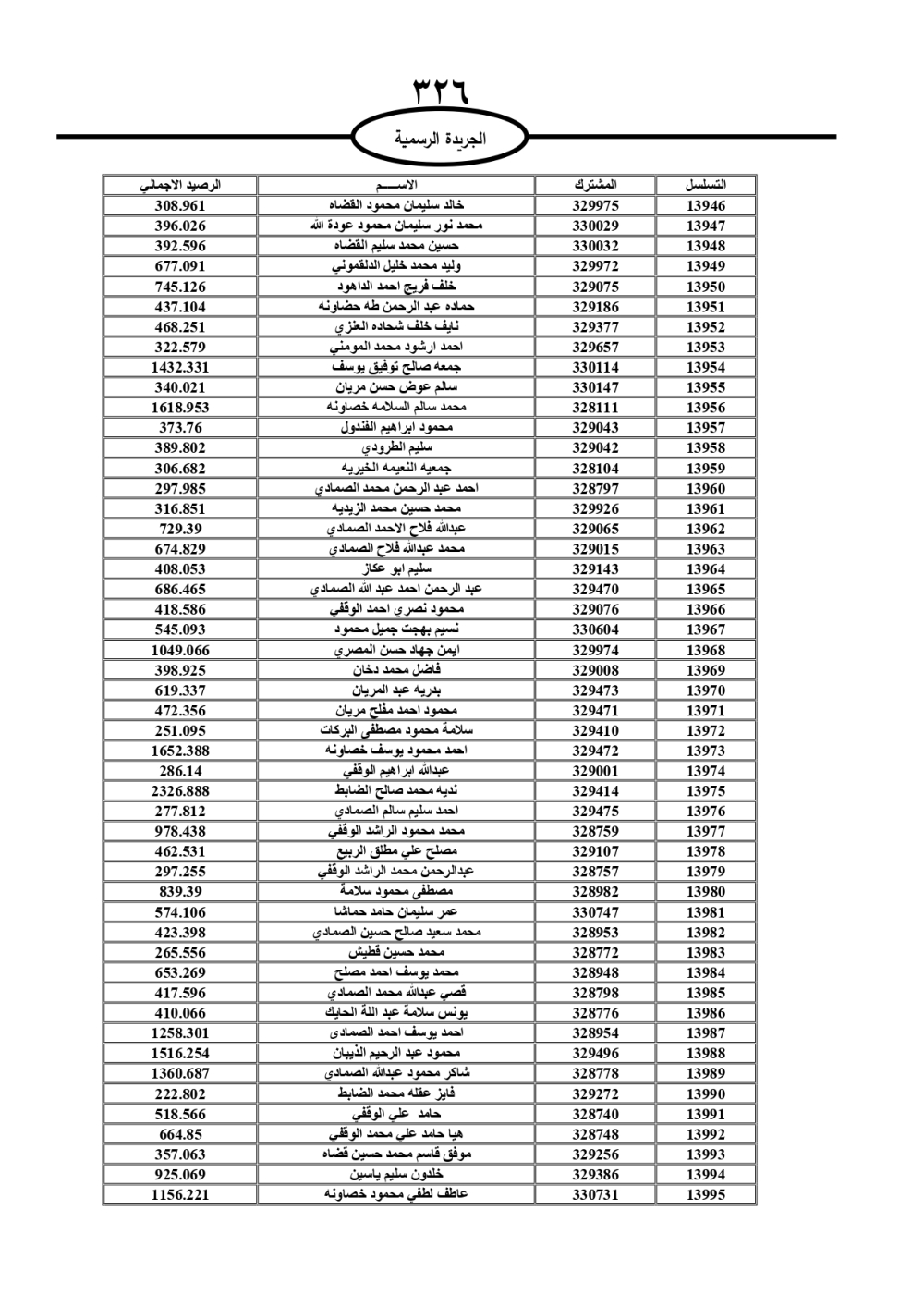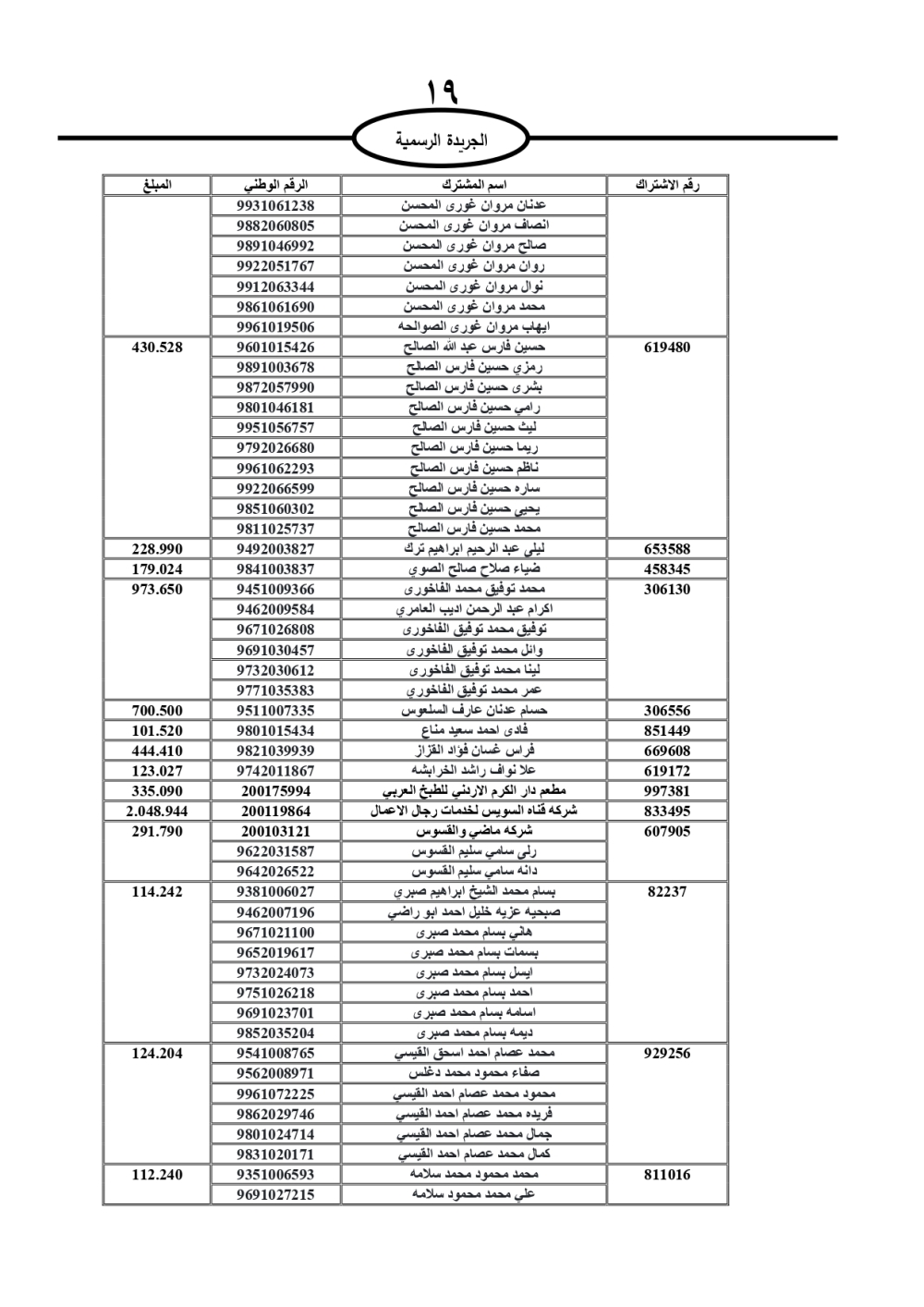 دعت سلطة المياه وبلدية الزرقاء، عشرات آلاف الأردنيين الواردة أسماؤهم بالكشوفات المرفقة، إلى ضرورة مراجعتها لتسوية أوضاعهم المالية كونه ترتب عليهم ذمم مالية، وذلك لتجنب الحجز على الأموال المنقولة وغير المنقولة بعد انقضاء 60 يوما من تاريخ النشر، علما أنه تم نشر هذه الأسماء في الجريدة الرسمية بتاريخ 16/2/2025.