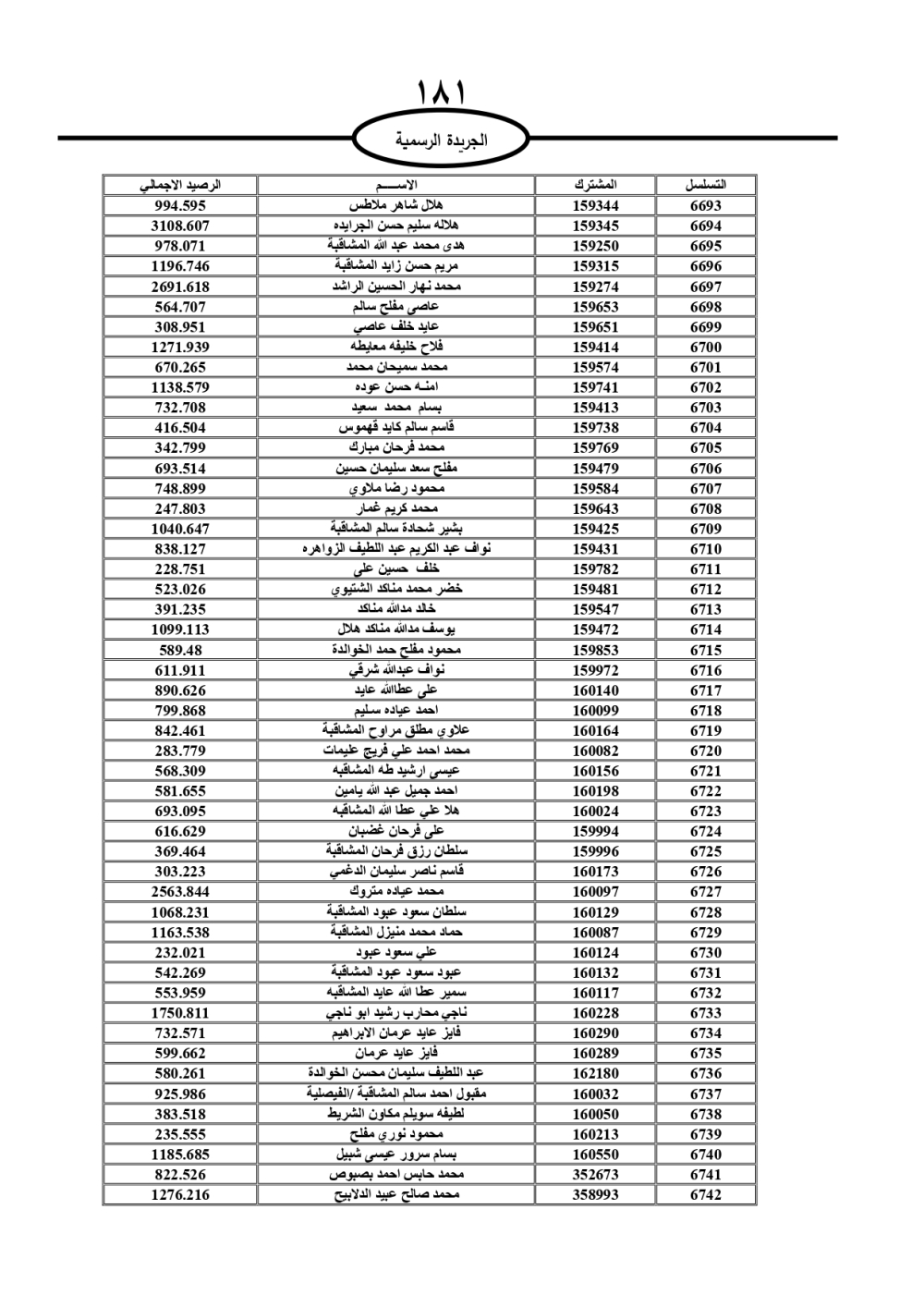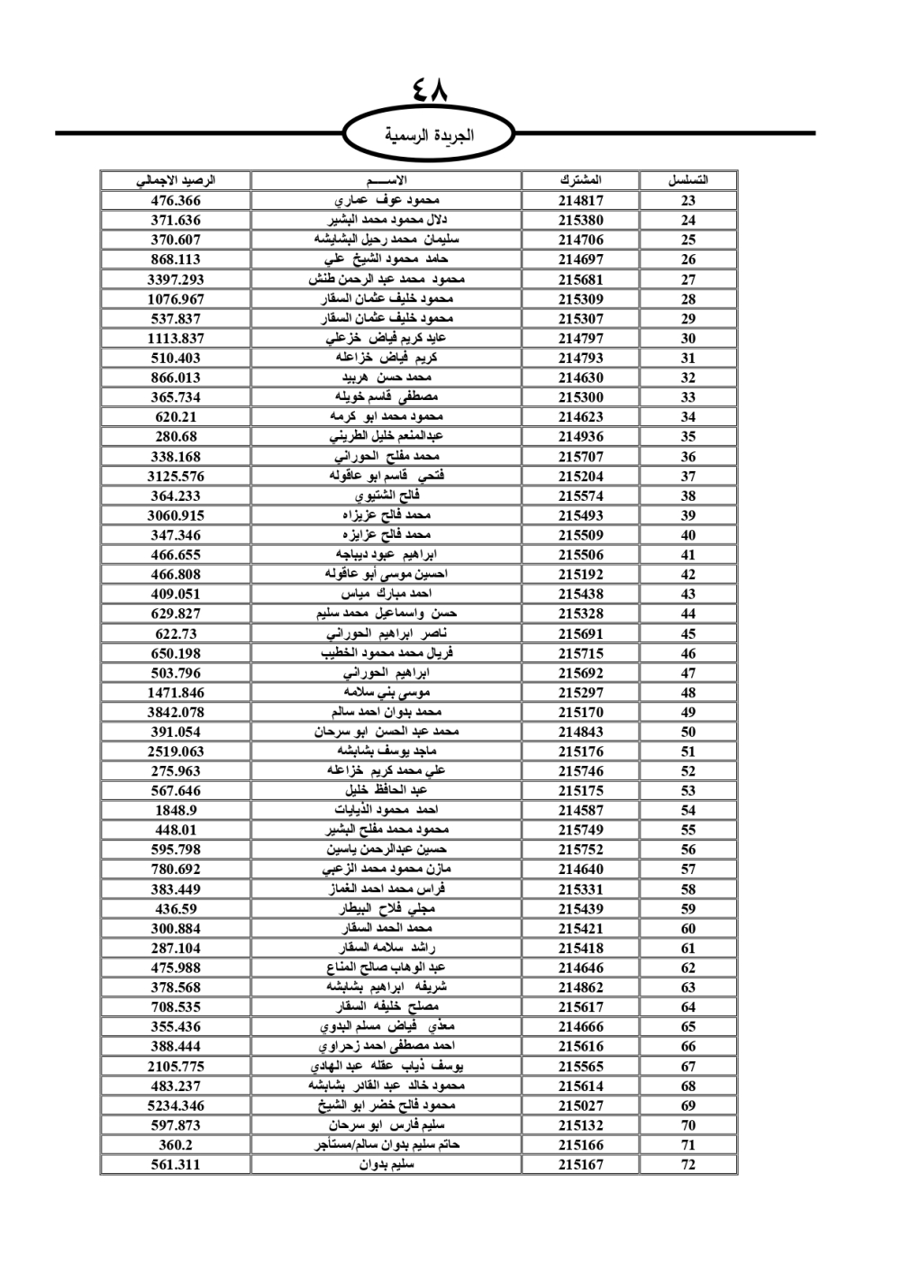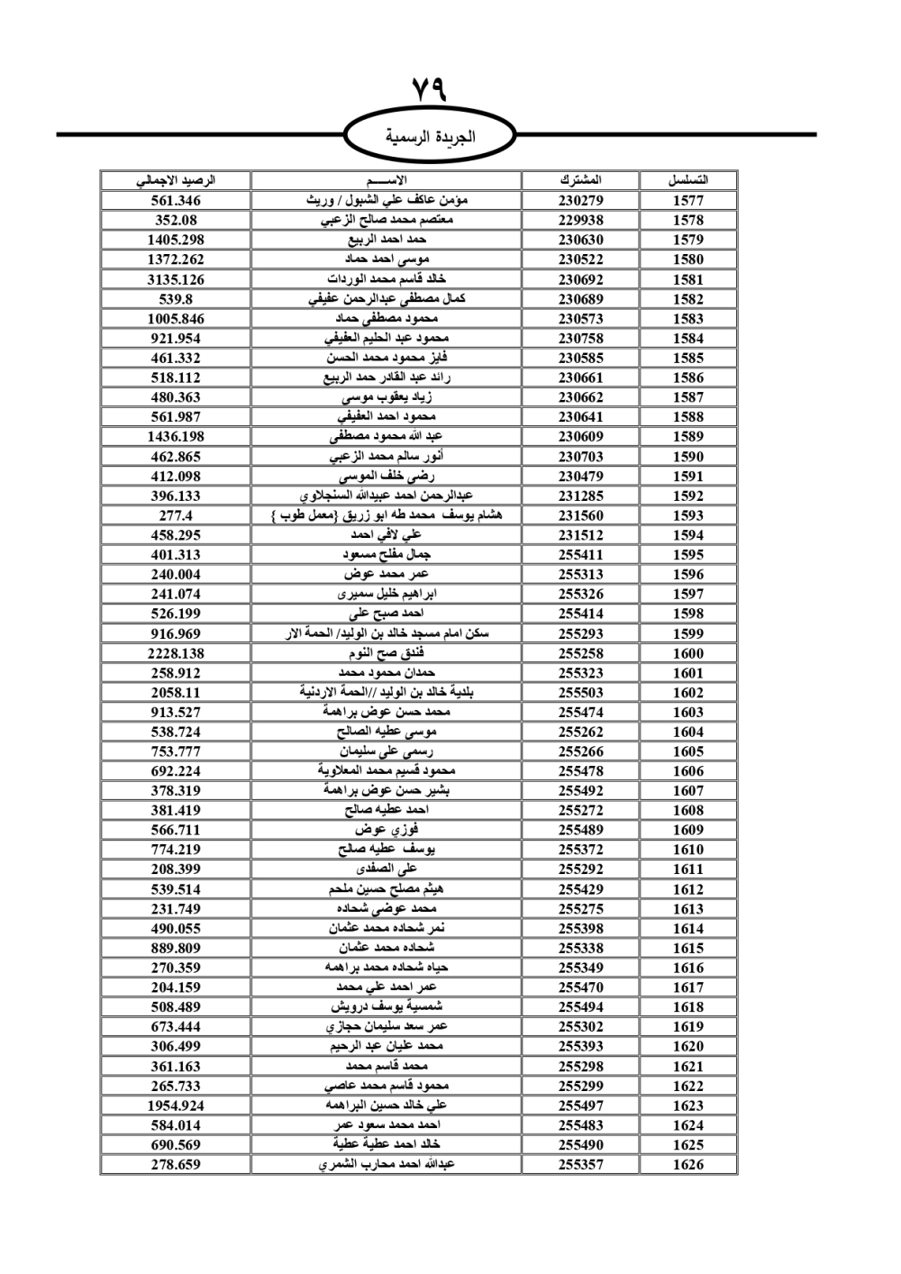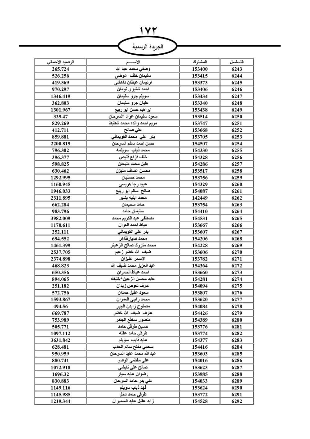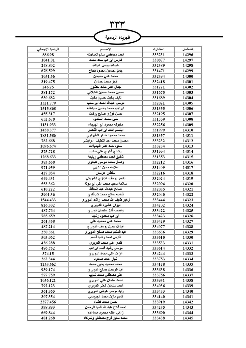 دعت سلطة المياه وبلدية الزرقاء، عشرات آلاف الأردنيين الواردة أسماؤهم بالكشوفات المرفقة، إلى ضرورة مراجعتها لتسوية أوضاعهم المالية كونه ترتب عليهم ذمم مالية، وذلك لتجنب الحجز على الأموال المنقولة وغير المنقولة بعد انقضاء 60 يوما من تاريخ النشر، علما أنه تم نشر هذه الأسماء في الجريدة الرسمية بتاريخ 16/2/2025.