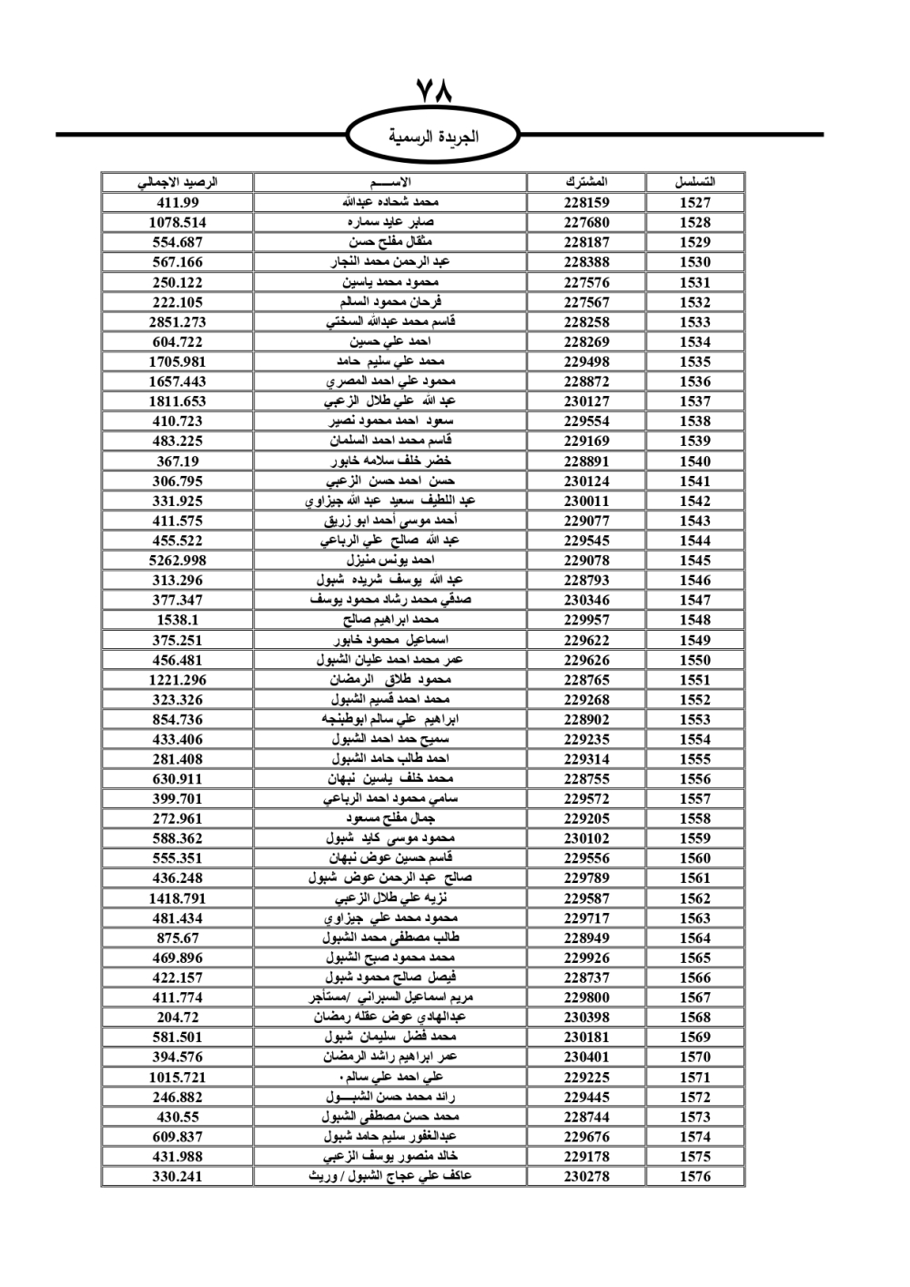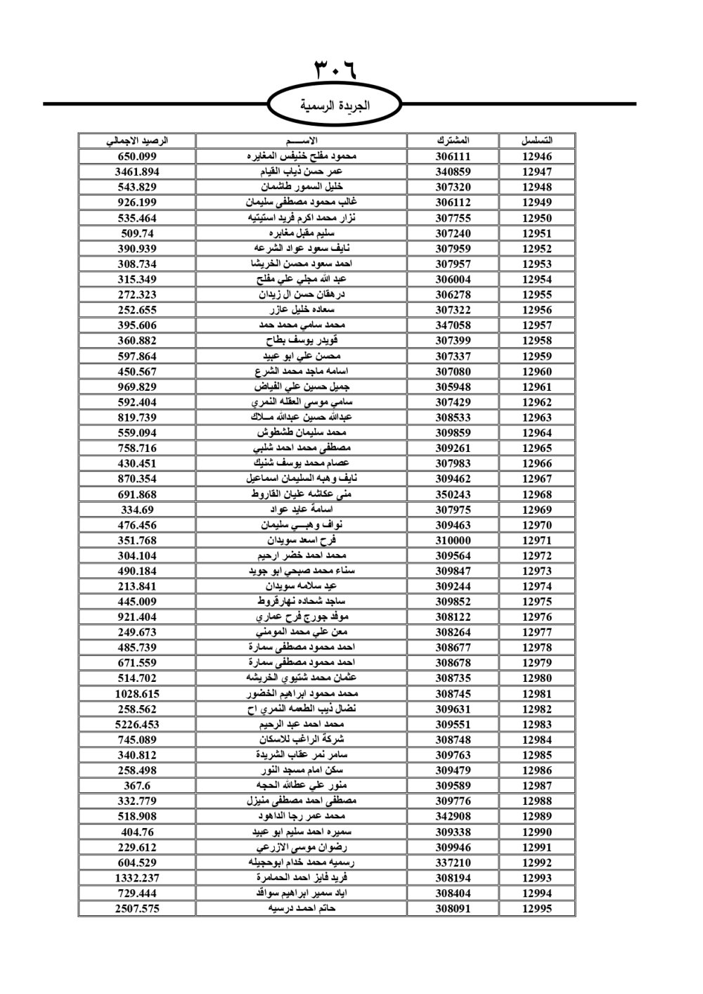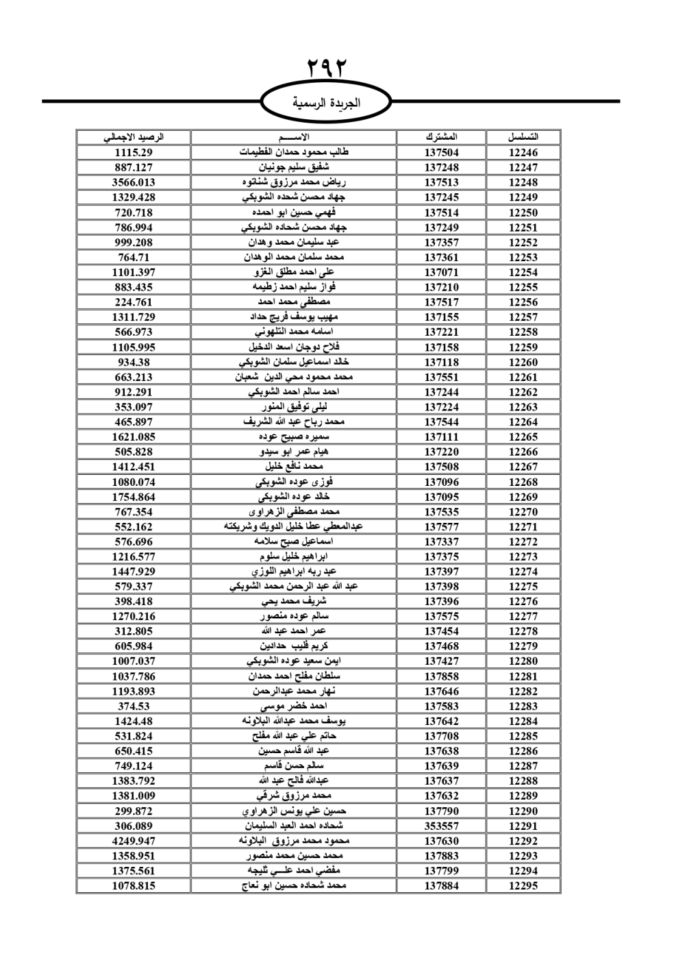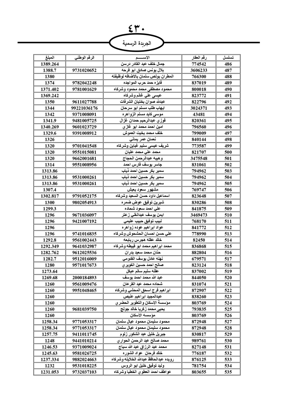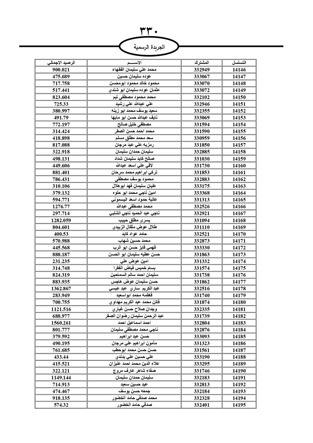 دعت سلطة المياه وبلدية الزرقاء، عشرات آلاف الأردنيين الواردة أسماؤهم بالكشوفات المرفقة، إلى ضرورة مراجعتها لتسوية أوضاعهم المالية كونه ترتب عليهم ذمم مالية، وذلك لتجنب الحجز على الأموال المنقولة وغير المنقولة بعد انقضاء 60 يوما من تاريخ النشر، علما أنه تم نشر هذه الأسماء في الجريدة الرسمية بتاريخ 16/2/2025.
