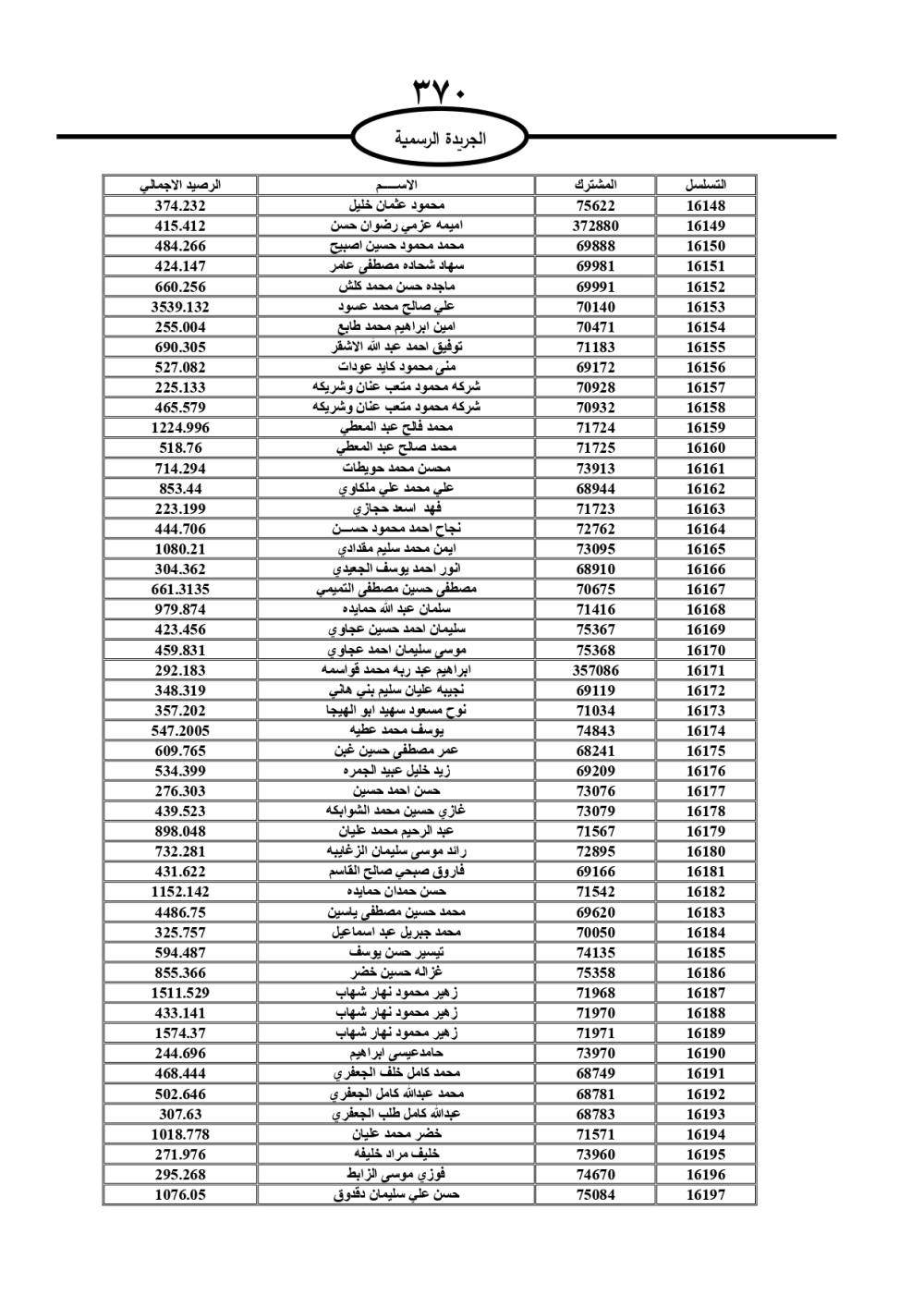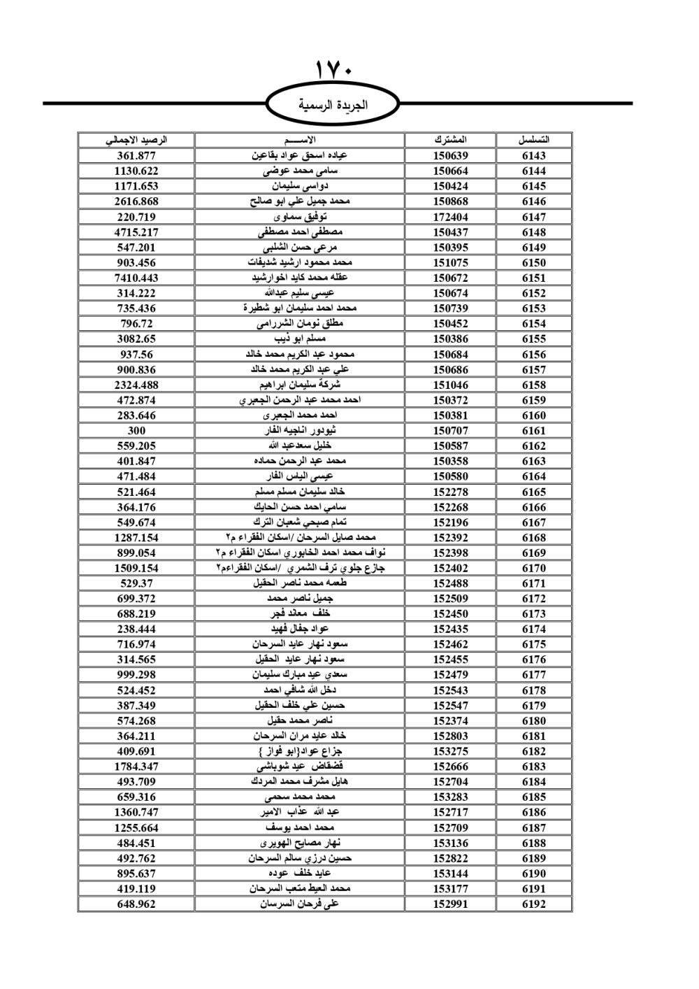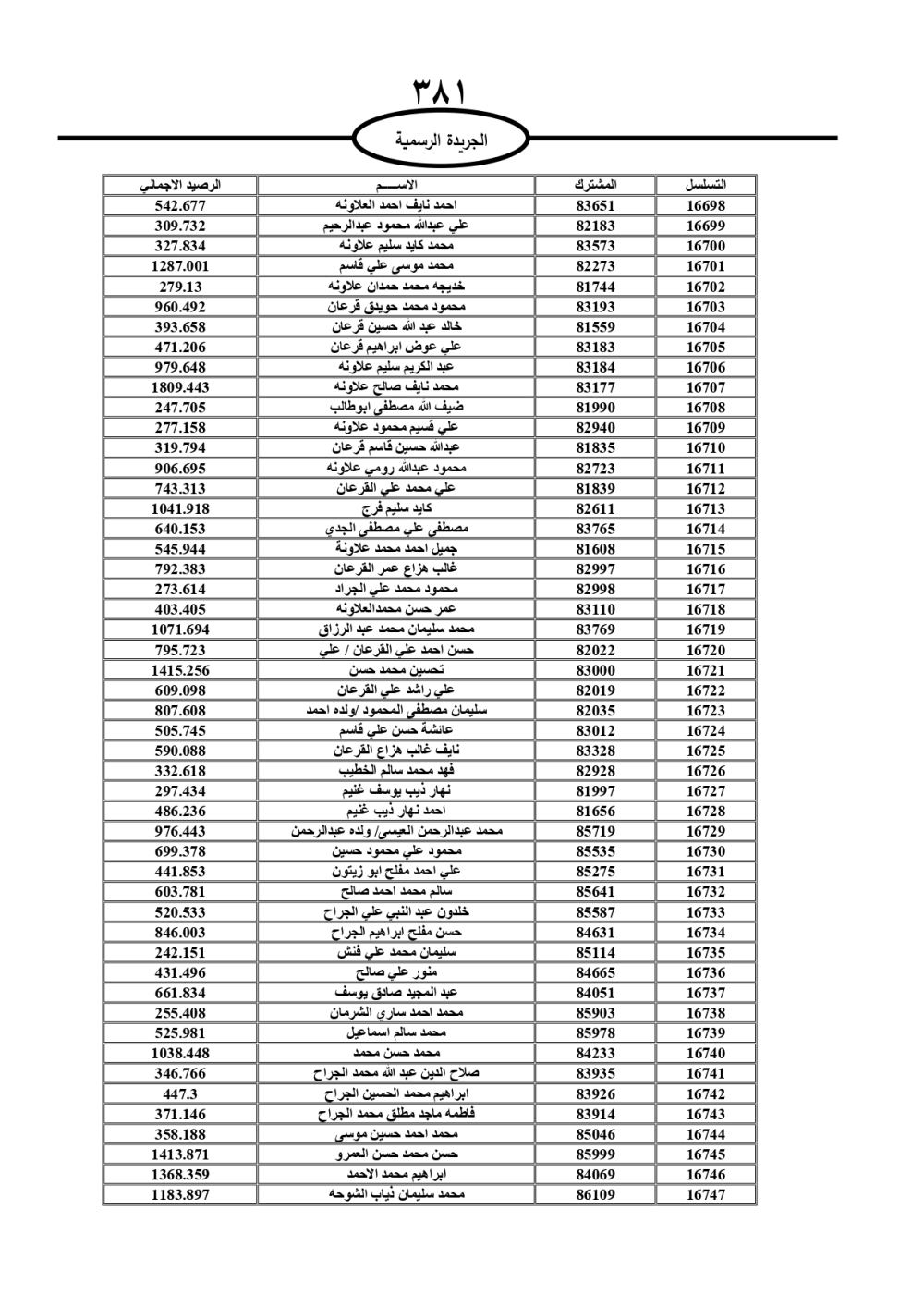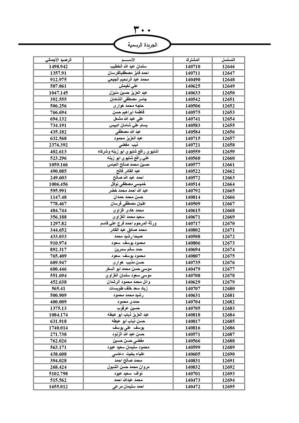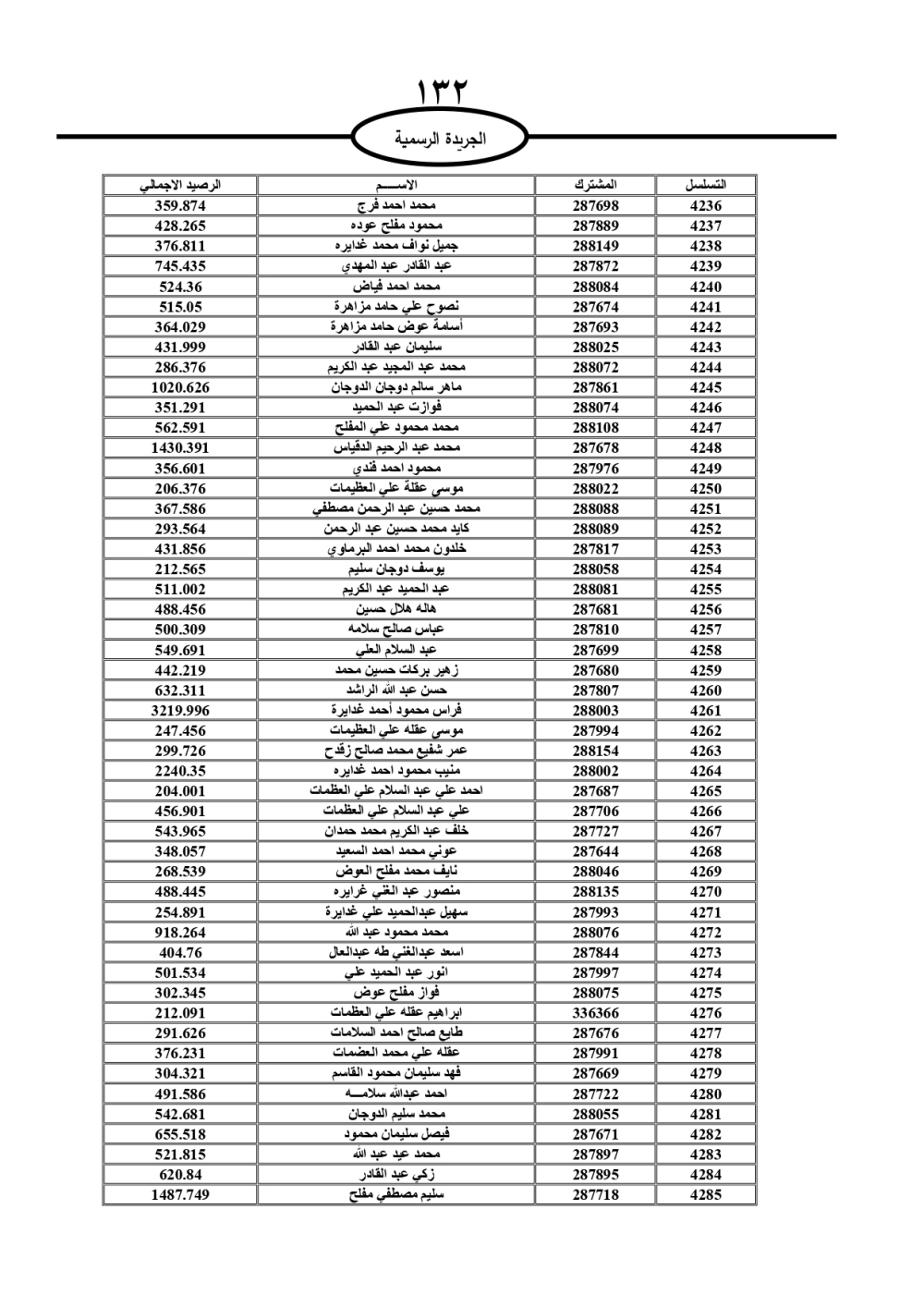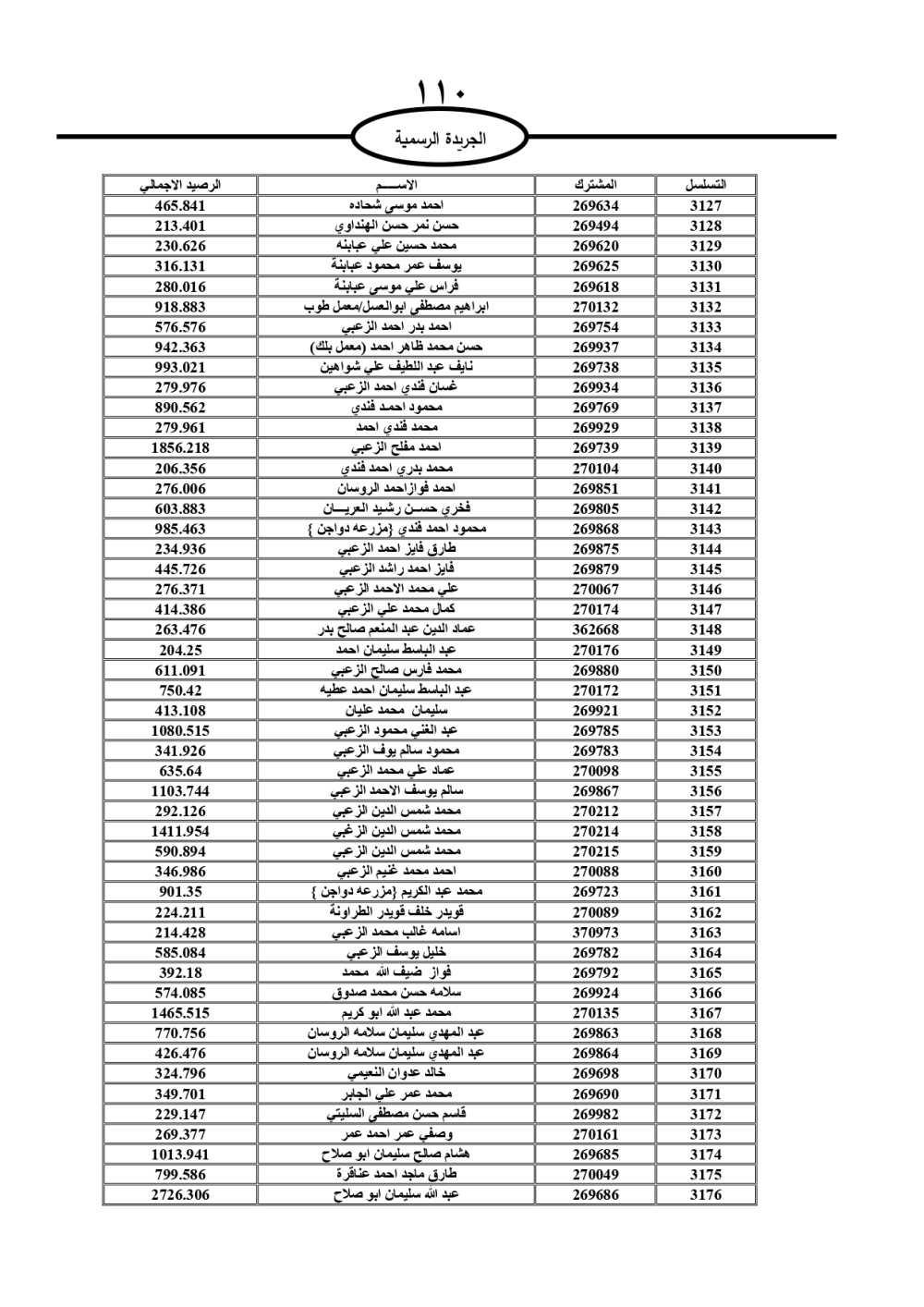 دعت سلطة المياه وبلدية الزرقاء، عشرات آلاف الأردنيين الواردة أسماؤهم بالكشوفات المرفقة، إلى ضرورة مراجعتها لتسوية أوضاعهم المالية كونه ترتب عليهم ذمم مالية، وذلك لتجنب الحجز على الأموال المنقولة وغير المنقولة بعد انقضاء 60 يوما من تاريخ النشر، علما أنه تم نشر هذه الأسماء في الجريدة الرسمية بتاريخ 16/2/2025.