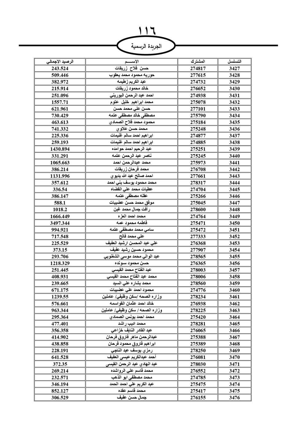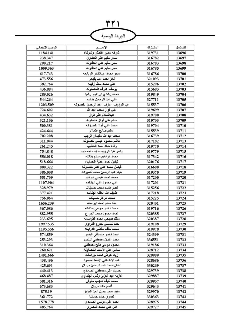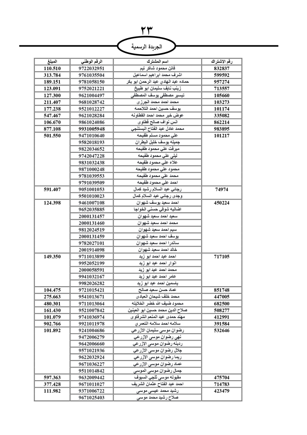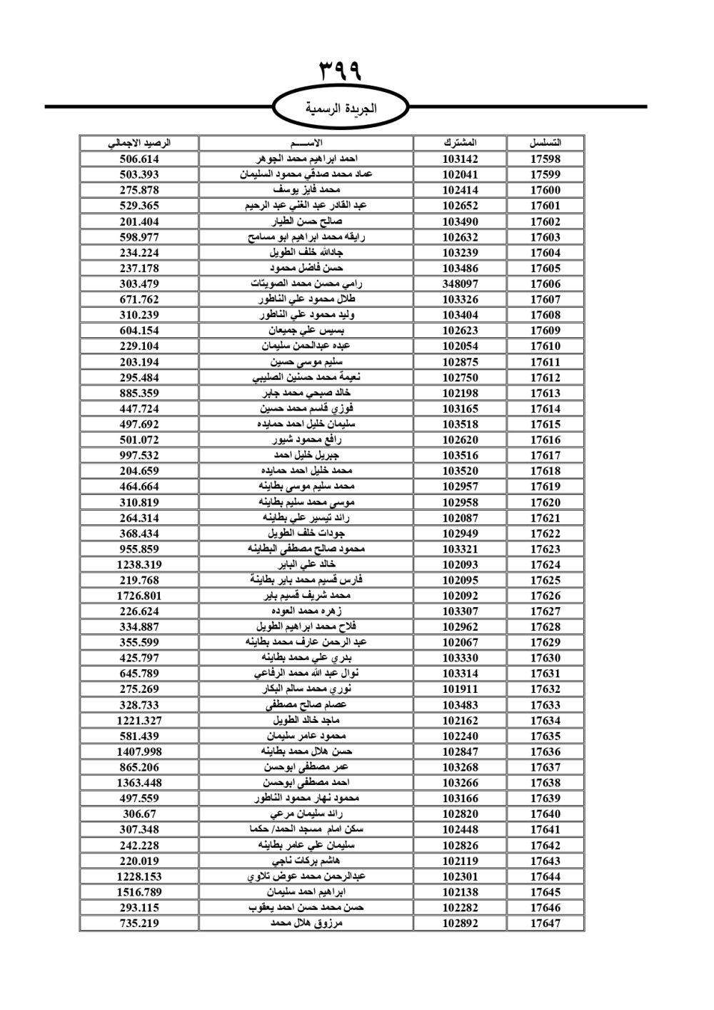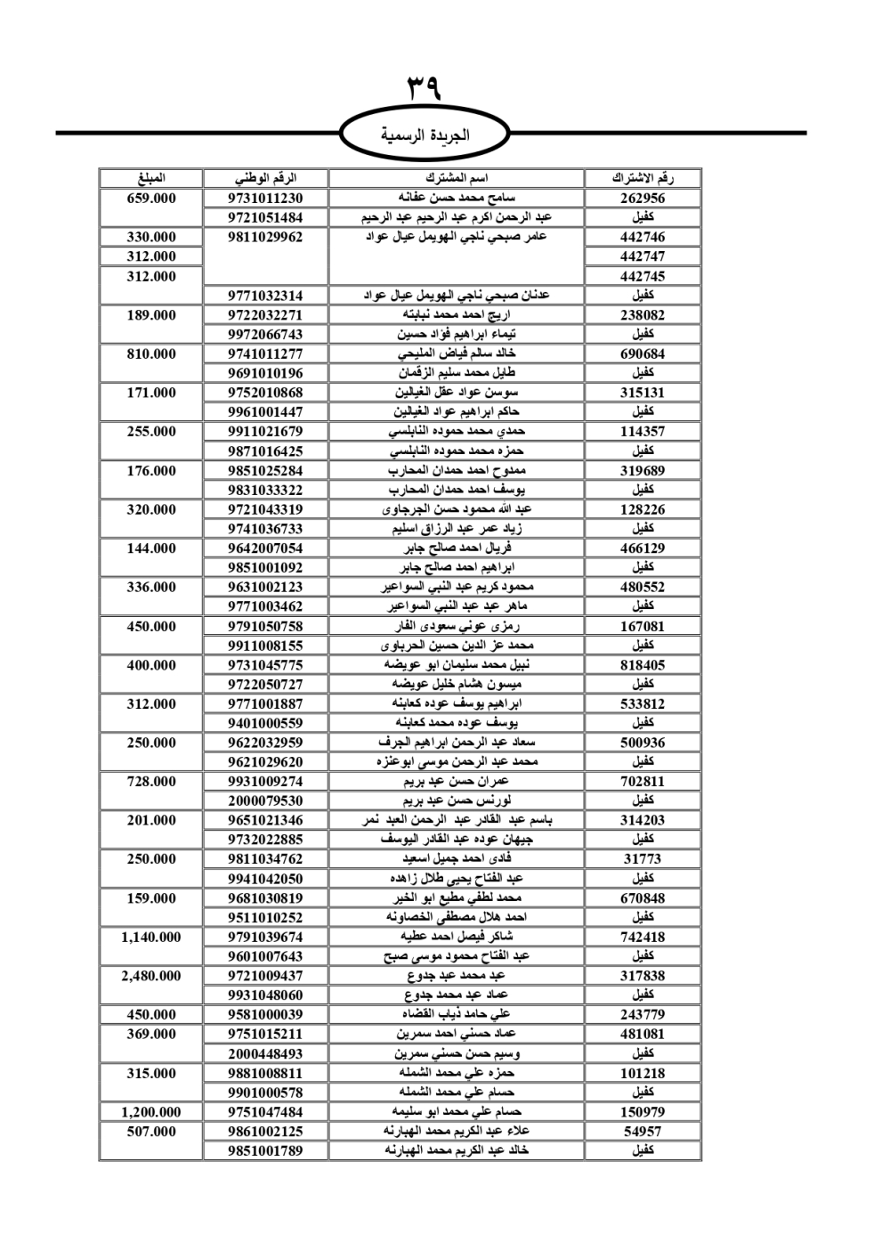 دعت سلطة المياه وبلدية الزرقاء، عشرات آلاف الأردنيين الواردة أسماؤهم بالكشوفات المرفقة، إلى ضرورة مراجعتها لتسوية أوضاعهم المالية كونه ترتب عليهم ذمم مالية، وذلك لتجنب الحجز على الأموال المنقولة وغير المنقولة بعد انقضاء 60 يوما من تاريخ النشر، علما أنه تم نشر هذه الأسماء في الجريدة الرسمية بتاريخ 16/2/2025.