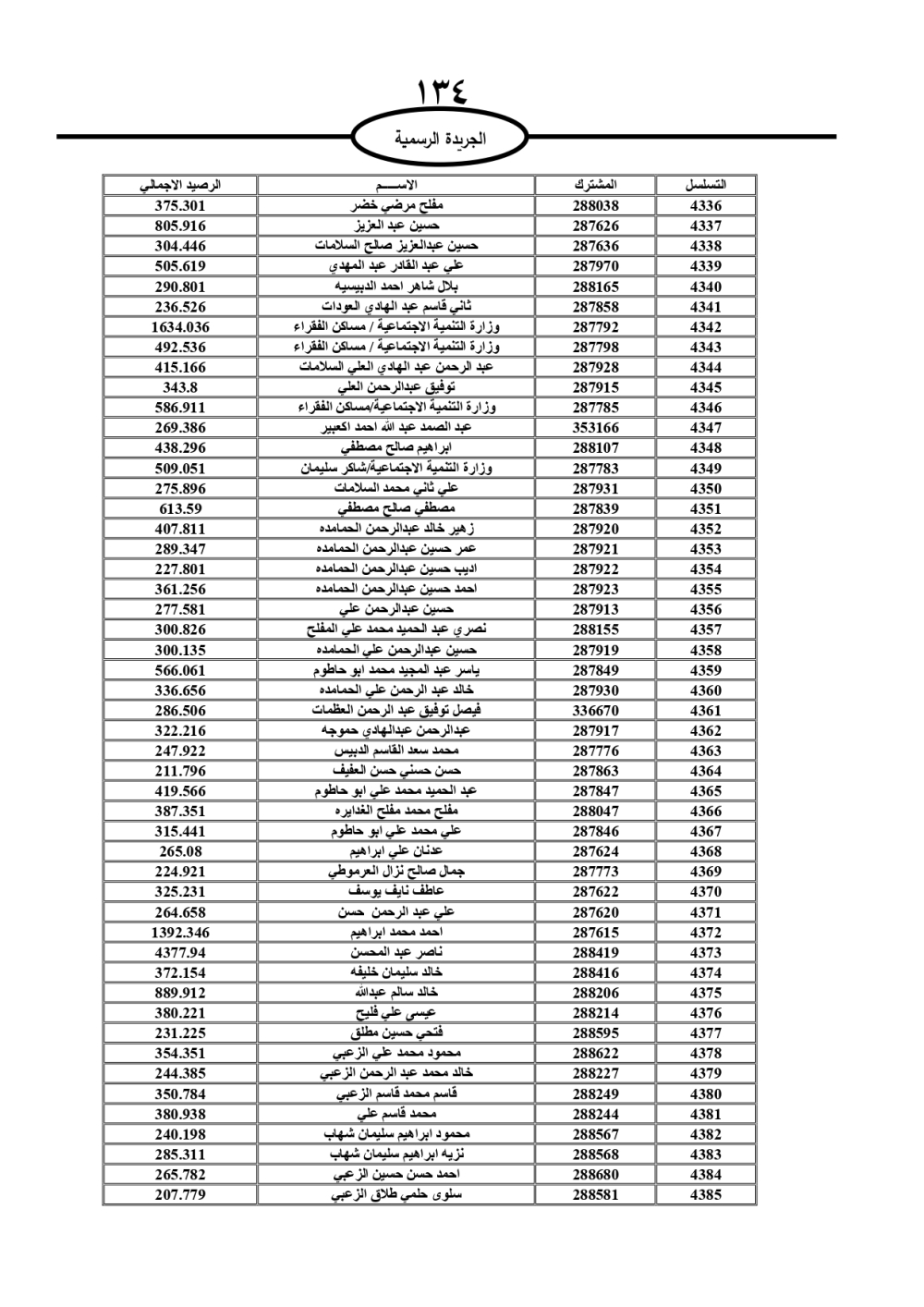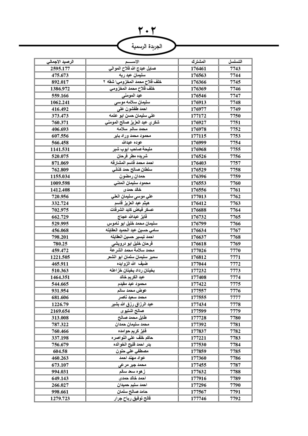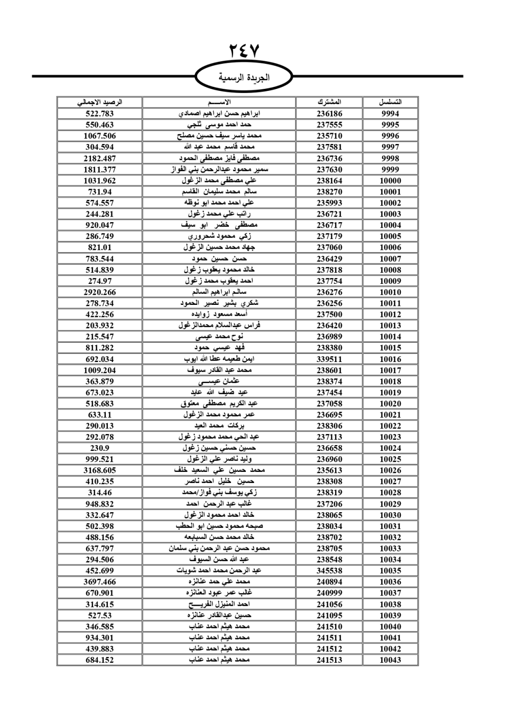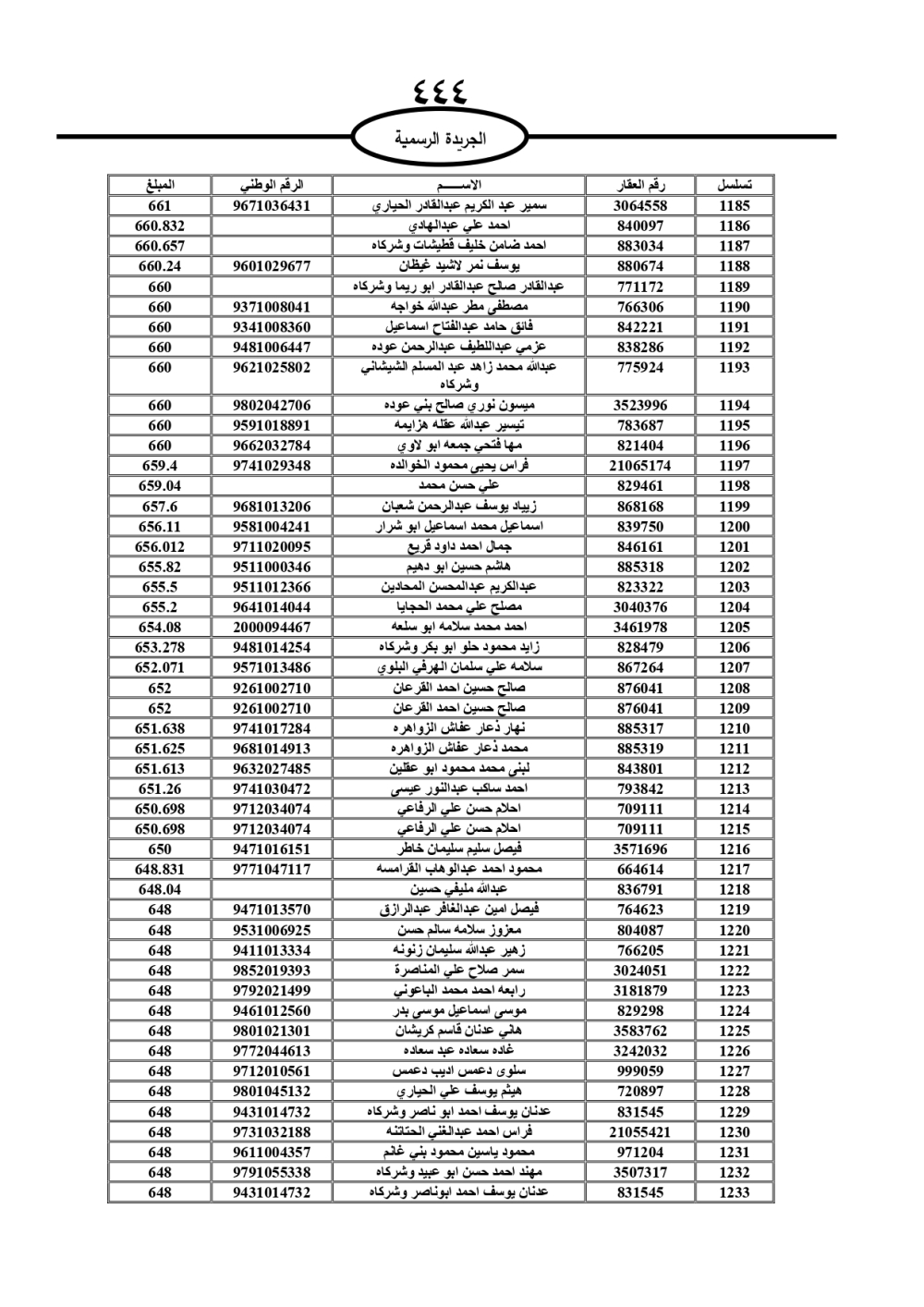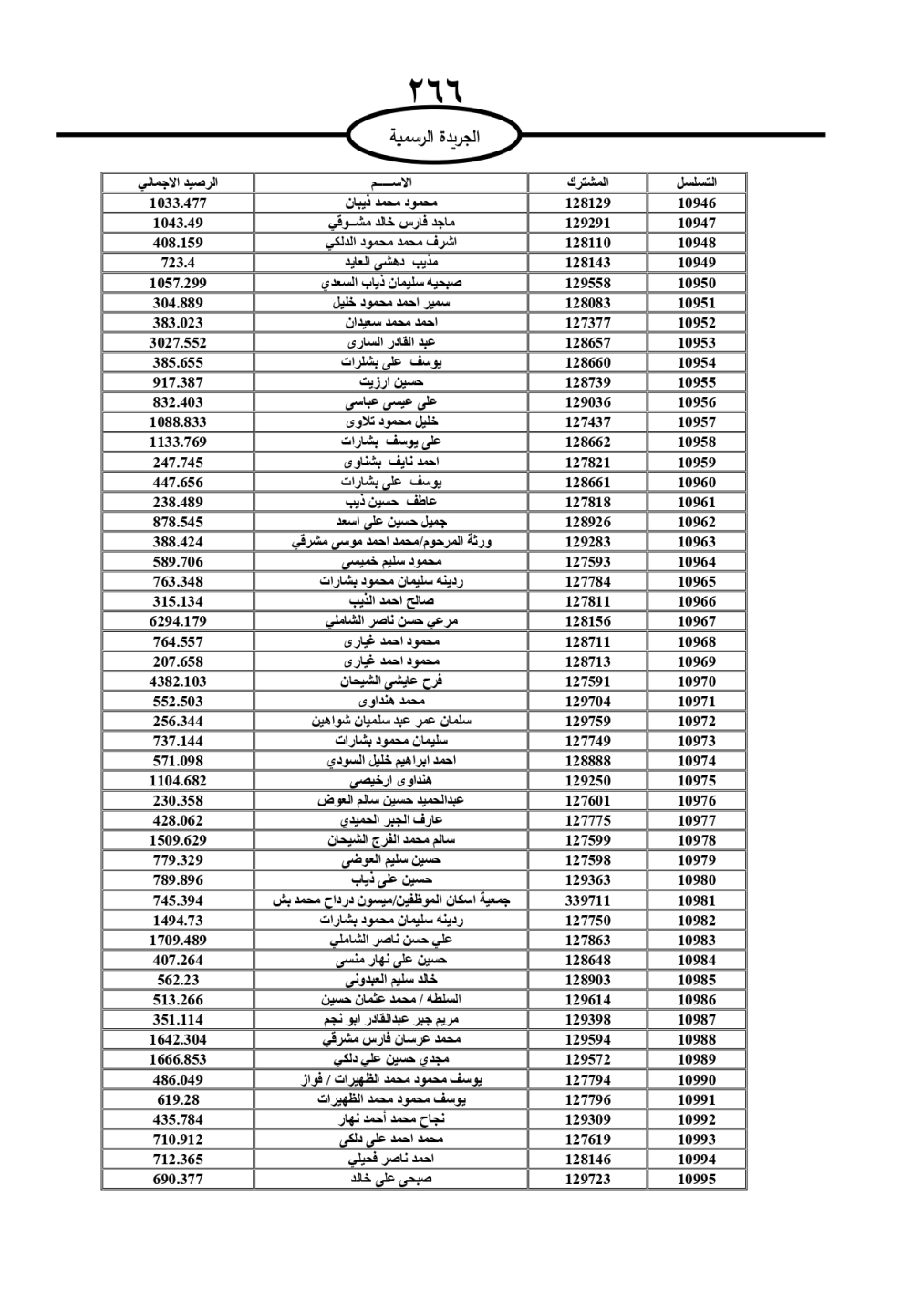 دعت سلطة المياه وبلدية الزرقاء، عشرات آلاف الأردنيين الواردة أسماؤهم بالكشوفات المرفقة، إلى ضرورة مراجعتها لتسوية أوضاعهم المالية كونه ترتب عليهم ذمم مالية، وذلك لتجنب الحجز على الأموال المنقولة وغير المنقولة بعد انقضاء 60 يوما من تاريخ النشر، علما أنه تم نشر هذه الأسماء في الجريدة الرسمية بتاريخ 16/2/2025.