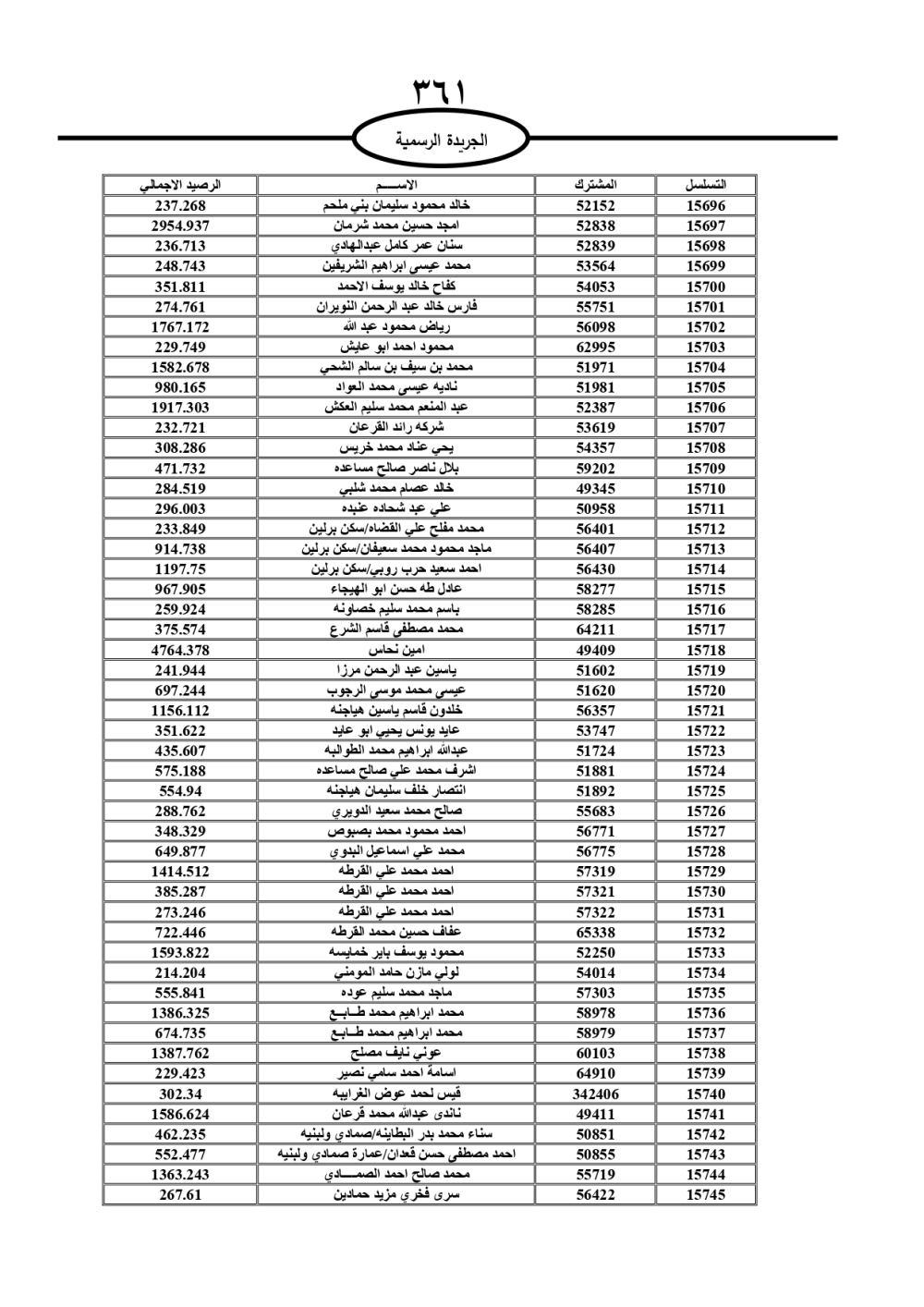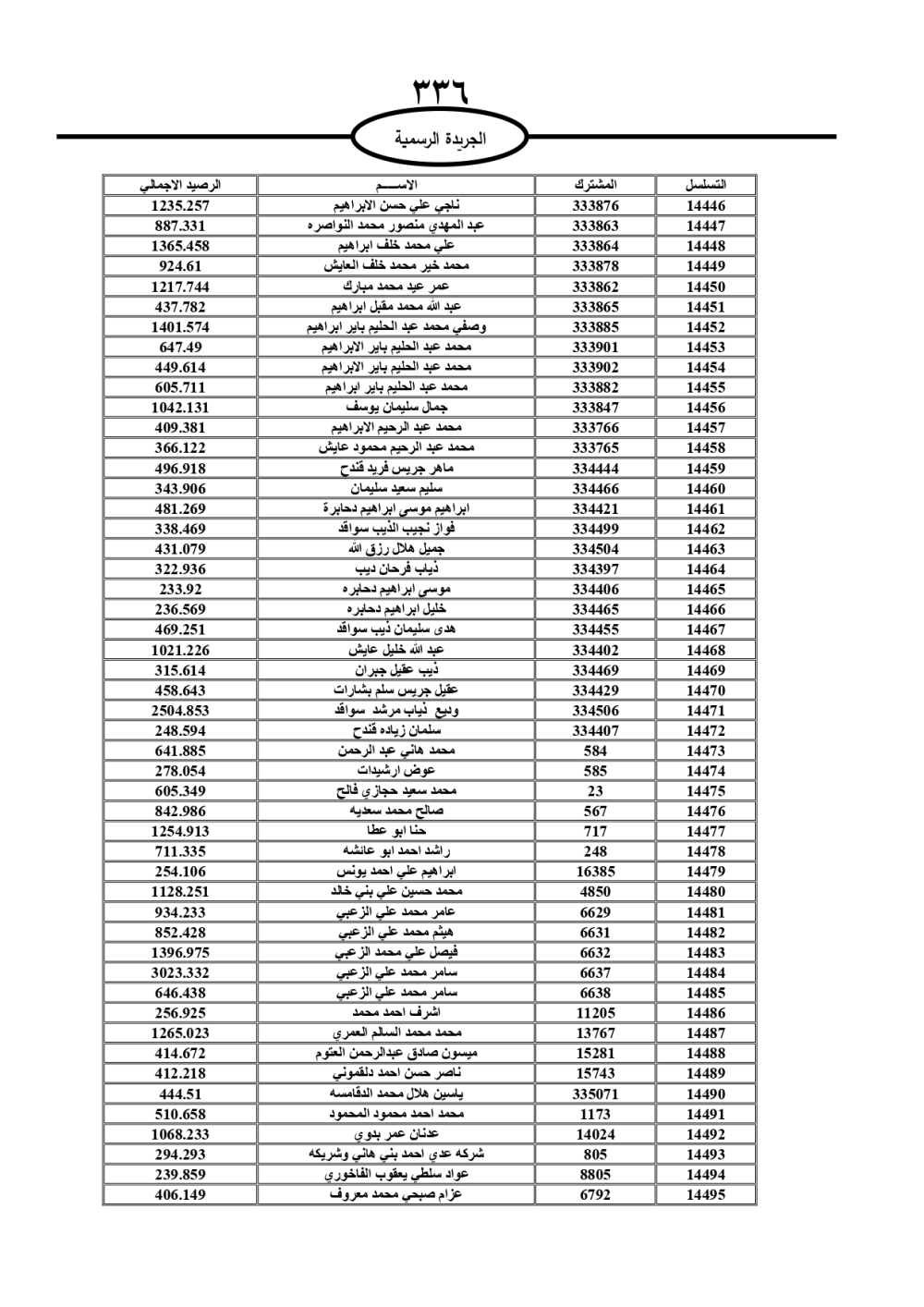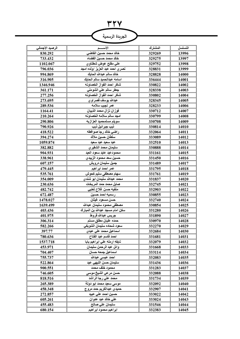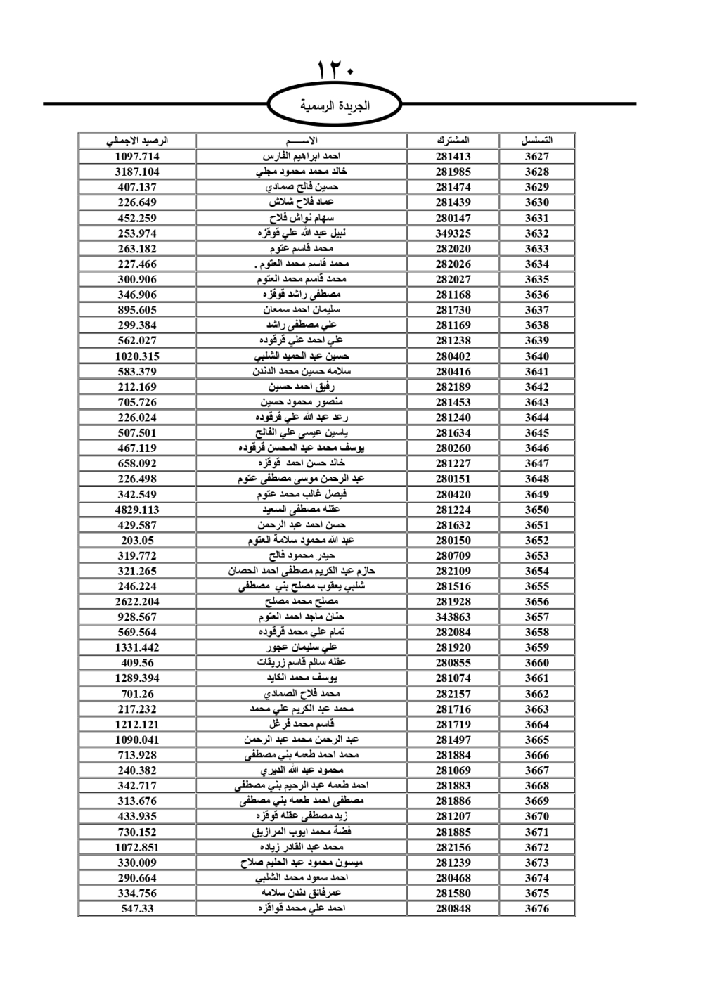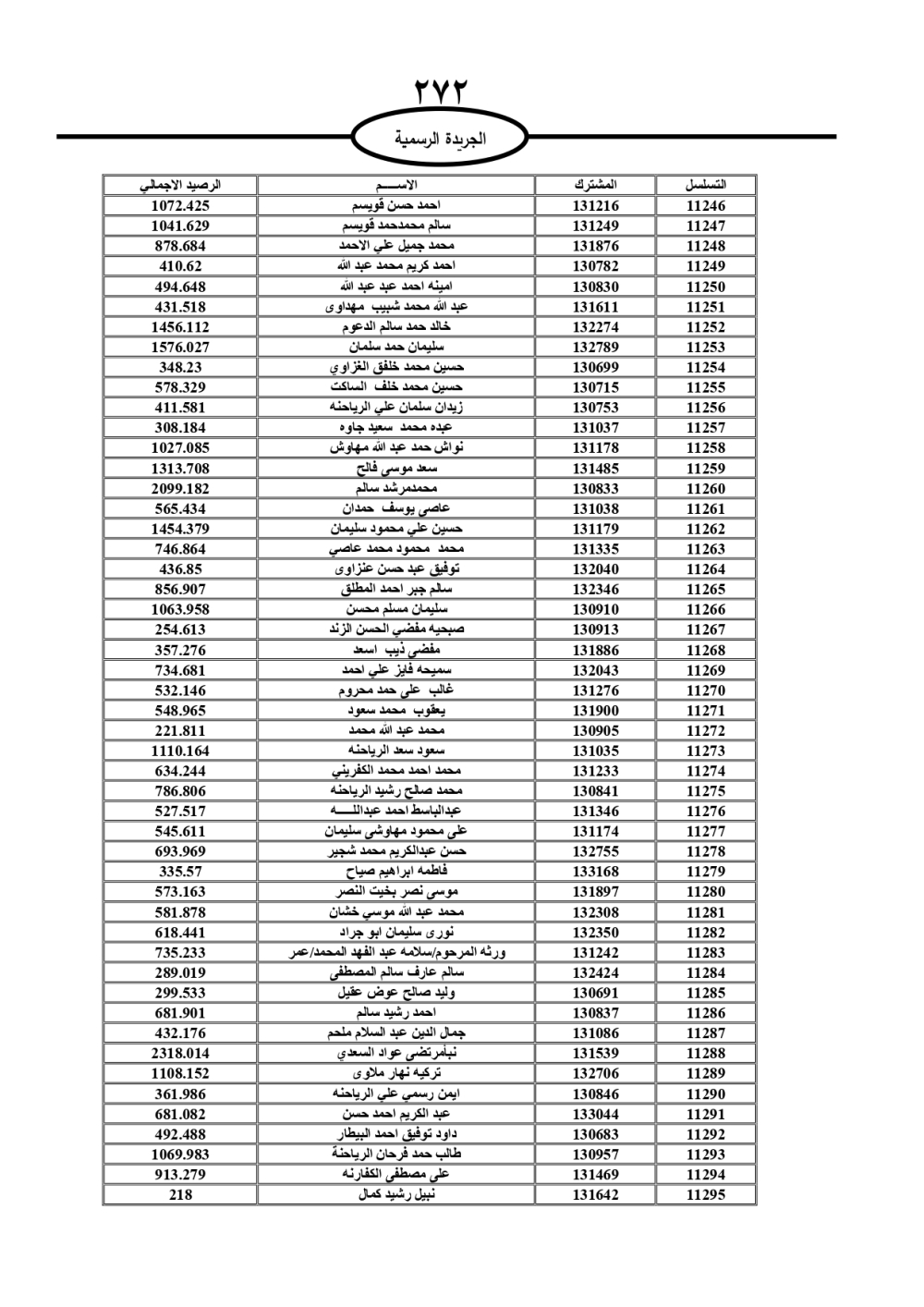 دعت سلطة المياه وبلدية الزرقاء، عشرات آلاف الأردنيين الواردة أسماؤهم بالكشوفات المرفقة، إلى ضرورة مراجعتها لتسوية أوضاعهم المالية كونه ترتب عليهم ذمم مالية، وذلك لتجنب الحجز على الأموال المنقولة وغير المنقولة بعد انقضاء 60 يوما من تاريخ النشر، علما أنه تم نشر هذه الأسماء في الجريدة الرسمية بتاريخ 16/2/2025.