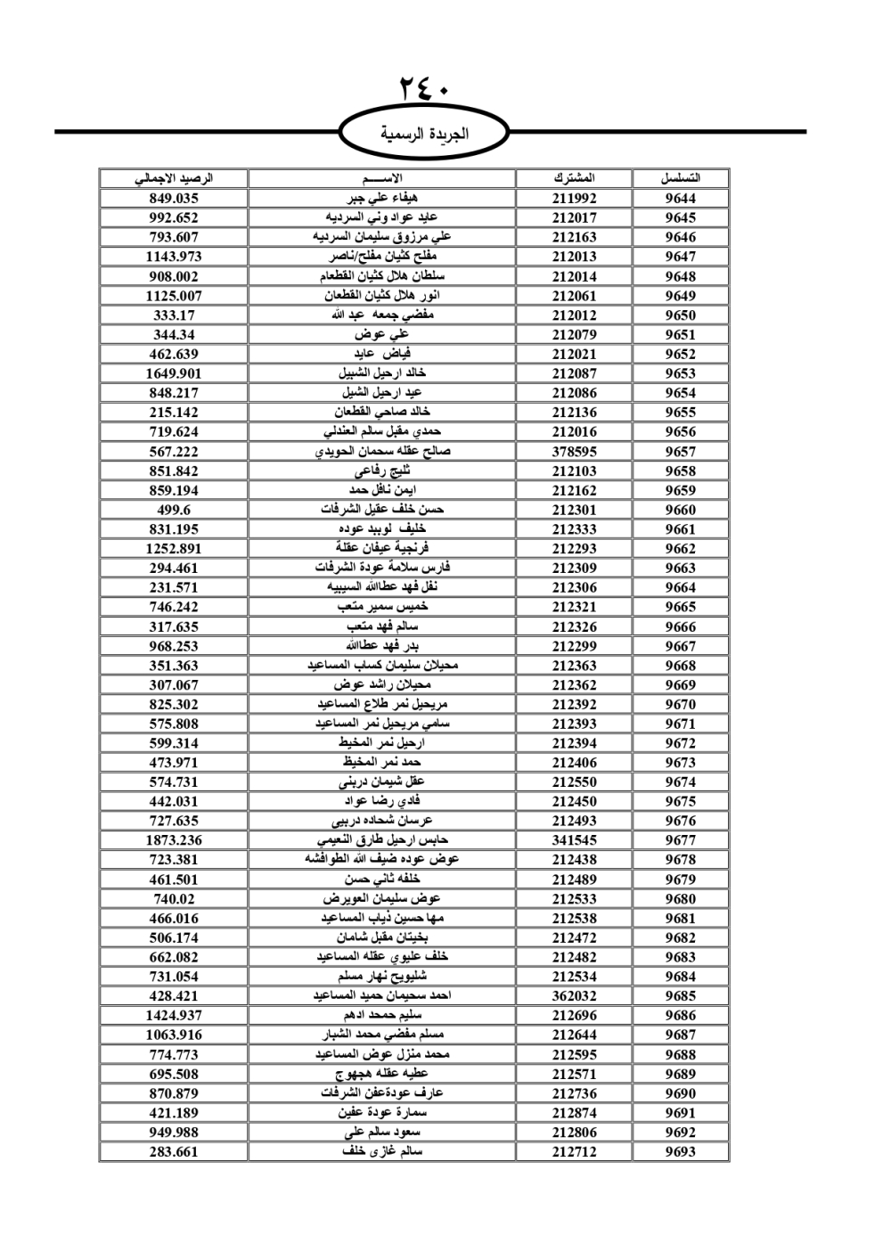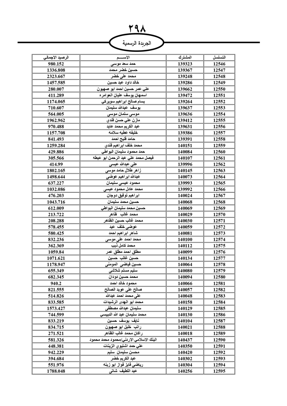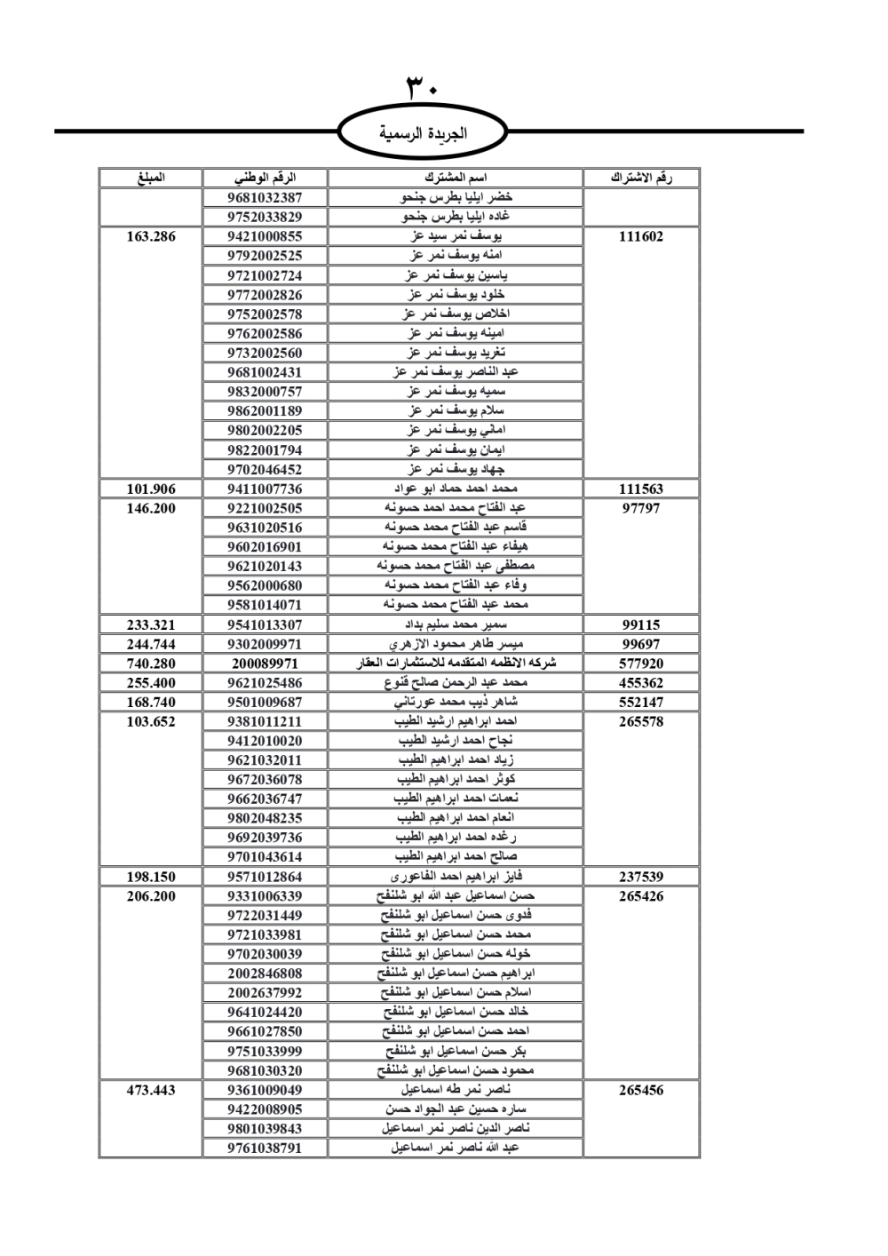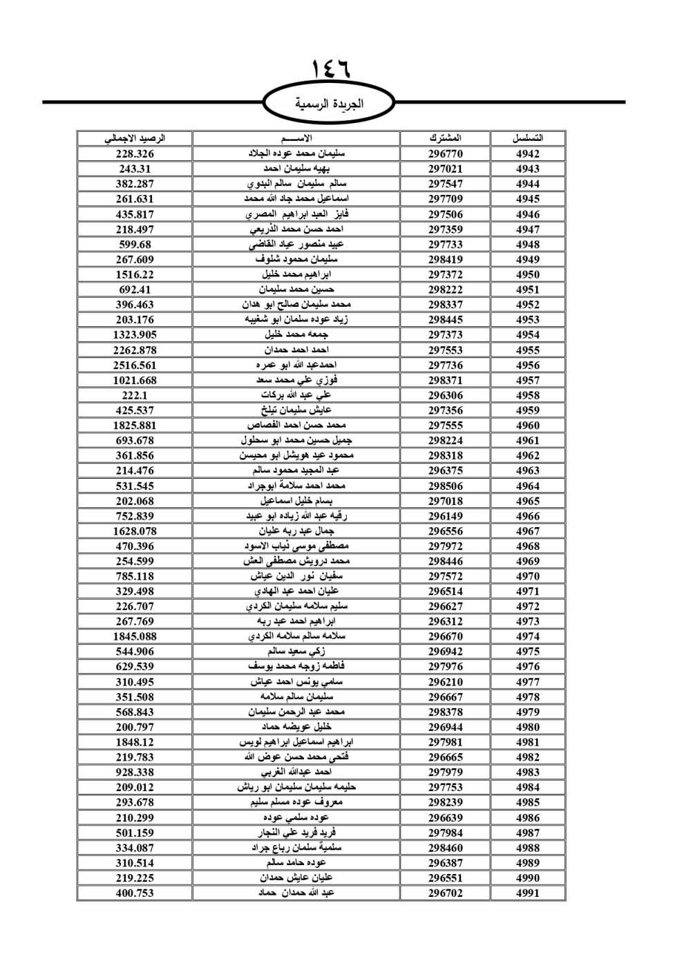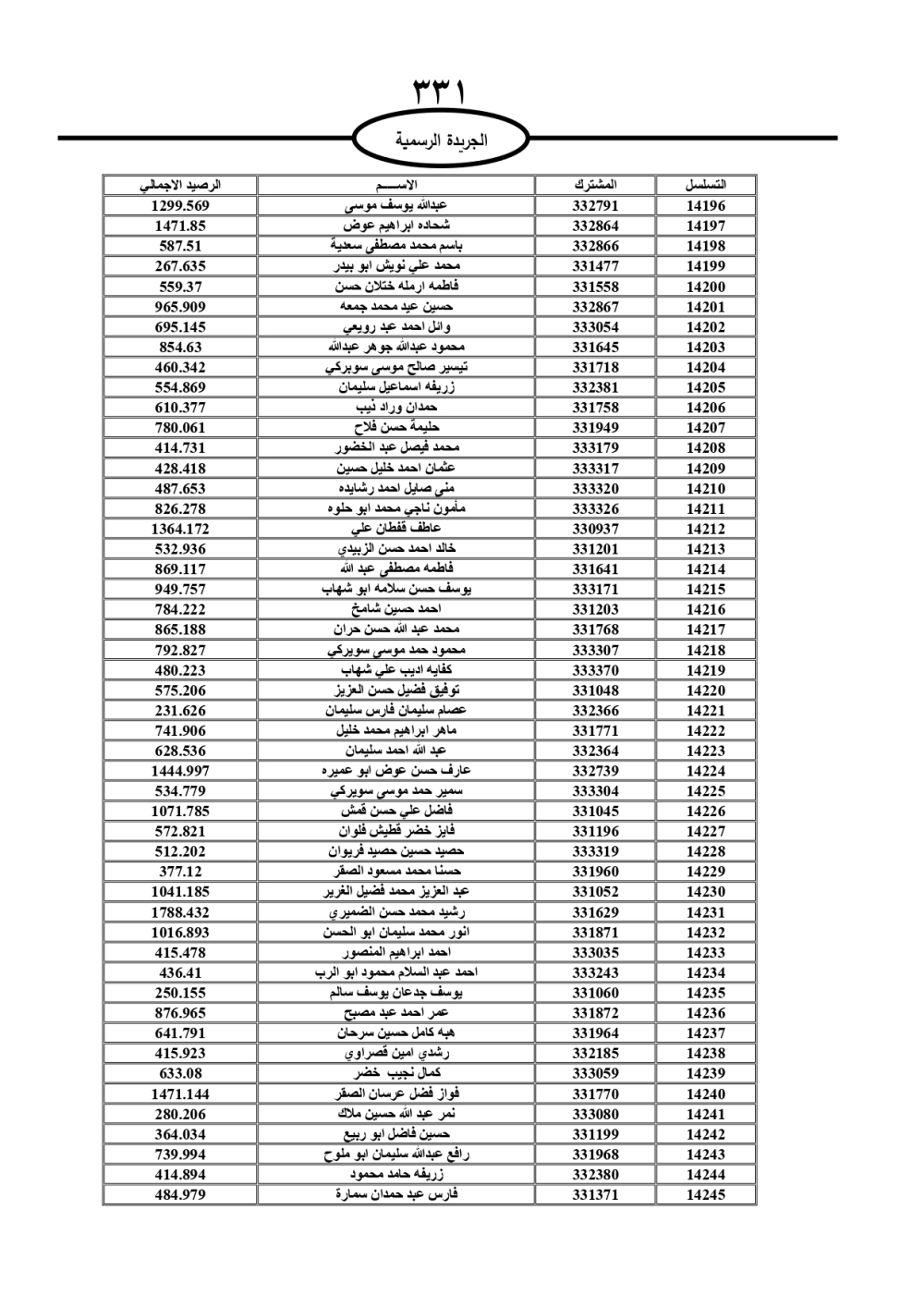 دعت سلطة المياه وبلدية الزرقاء، عشرات آلاف الأردنيين الواردة أسماؤهم بالكشوفات المرفقة، إلى ضرورة مراجعتها لتسوية أوضاعهم المالية كونه ترتب عليهم ذمم مالية، وذلك لتجنب الحجز على الأموال المنقولة وغير المنقولة بعد انقضاء 60 يوما من تاريخ النشر، علما أنه تم نشر هذه الأسماء في الجريدة الرسمية بتاريخ 16/2/2025.