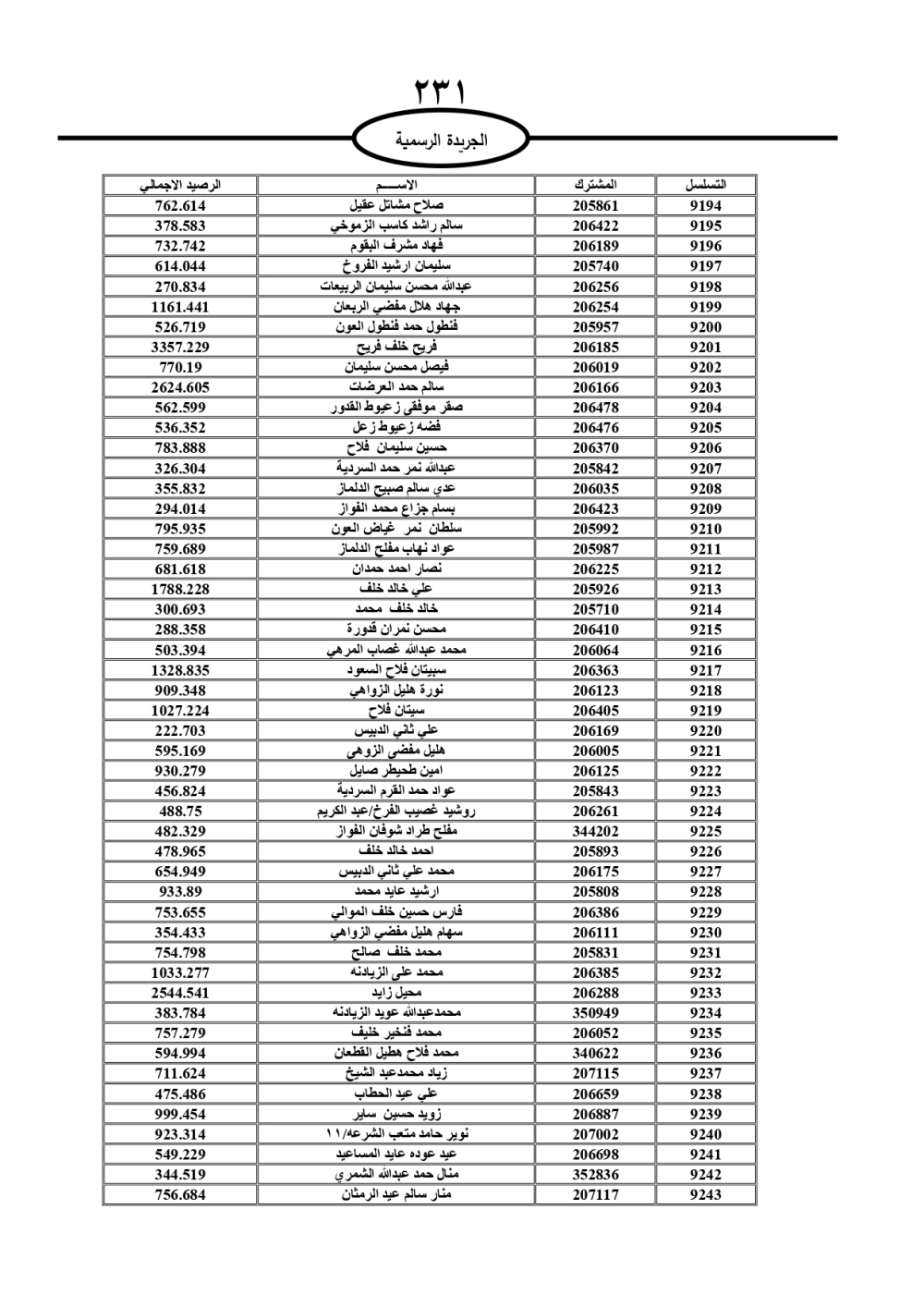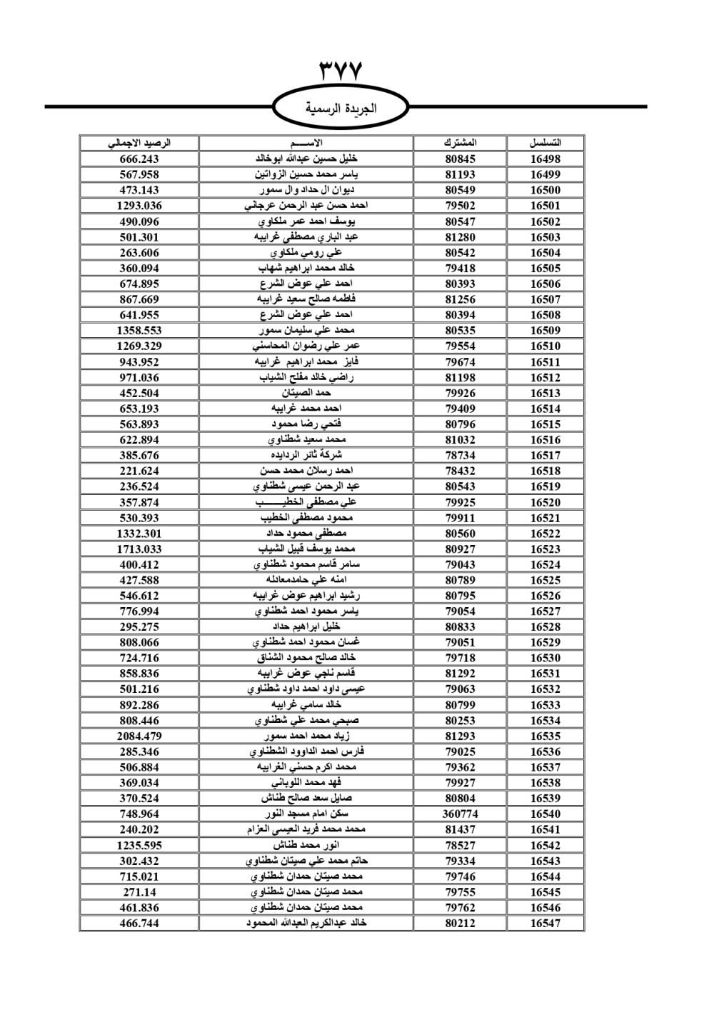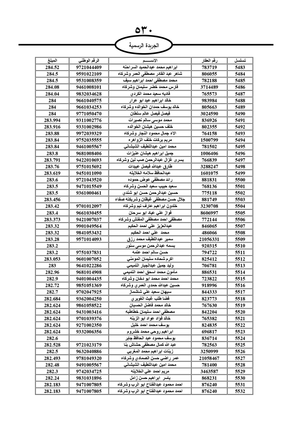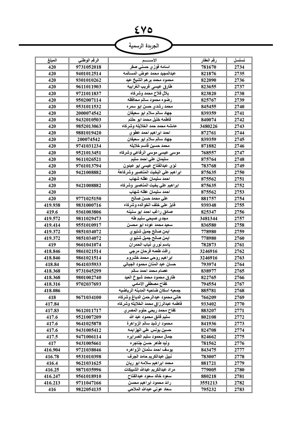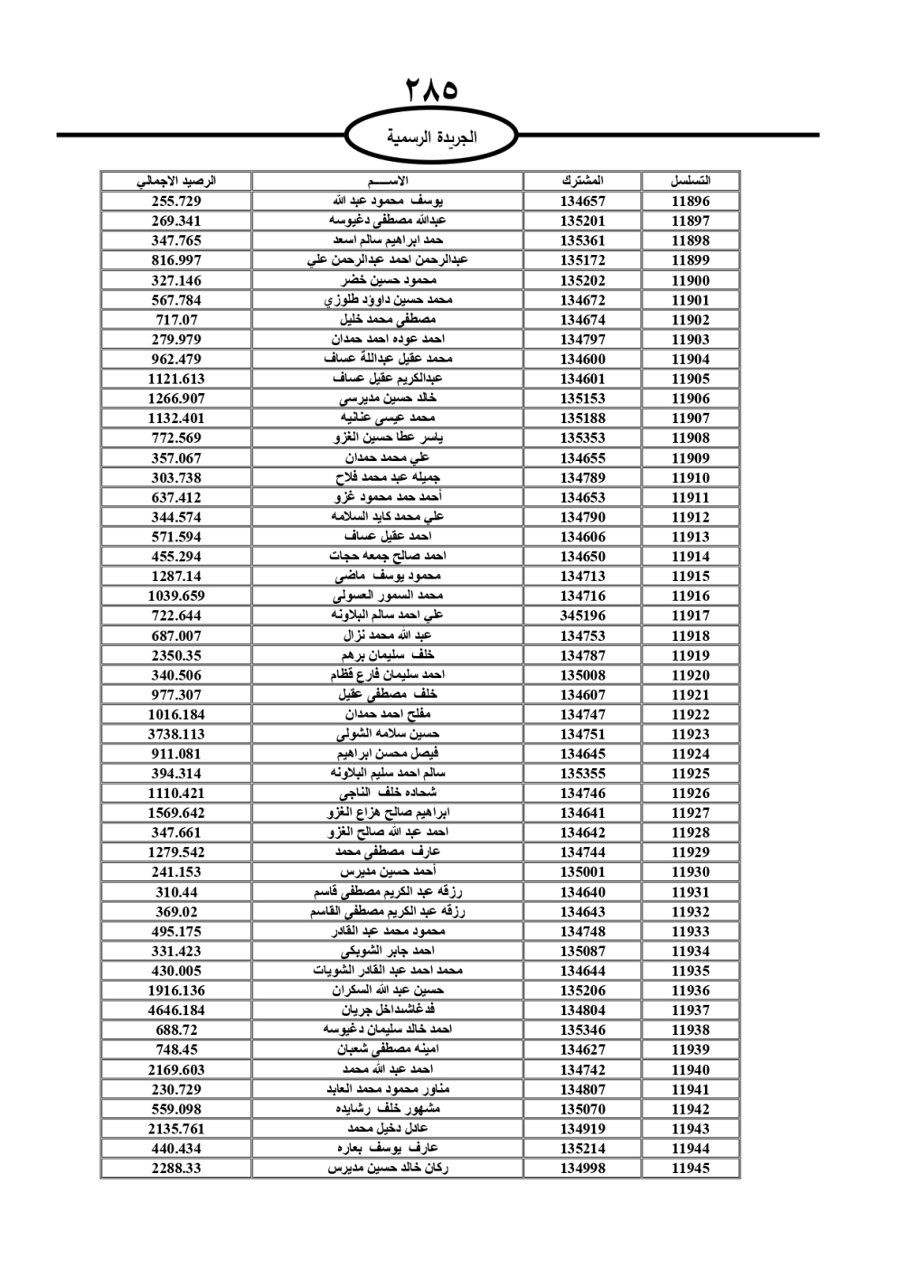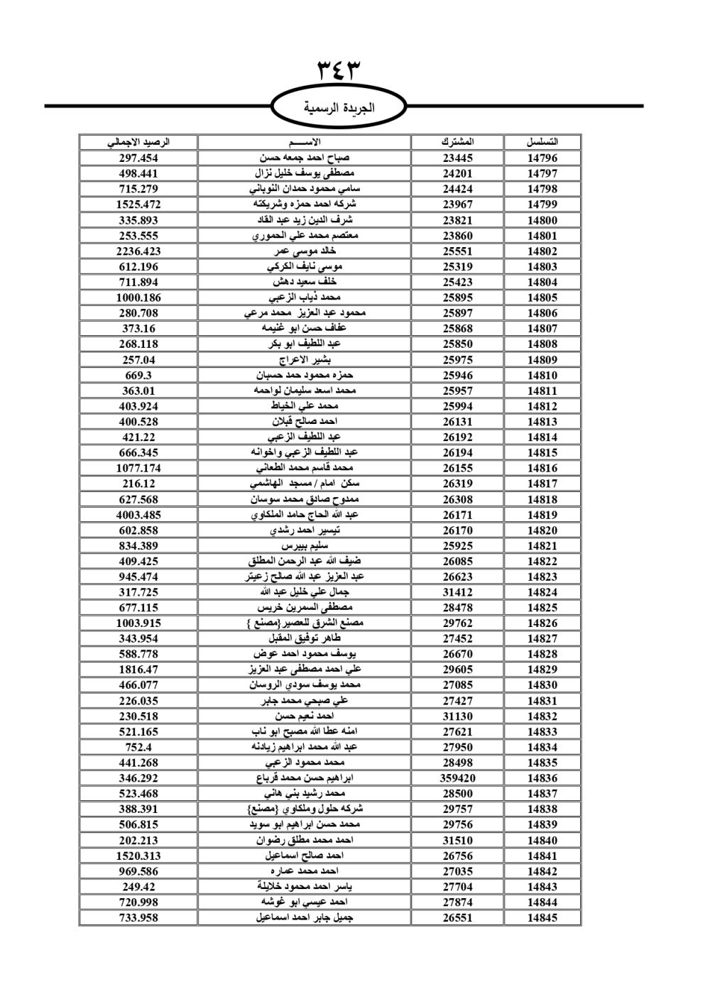 دعت سلطة المياه وبلدية الزرقاء، عشرات آلاف الأردنيين الواردة أسماؤهم بالكشوفات المرفقة، إلى ضرورة مراجعتها لتسوية أوضاعهم المالية كونه ترتب عليهم ذمم مالية، وذلك لتجنب الحجز على الأموال المنقولة وغير المنقولة بعد انقضاء 60 يوما من تاريخ النشر، علما أنه تم نشر هذه الأسماء في الجريدة الرسمية بتاريخ 16/2/2025.