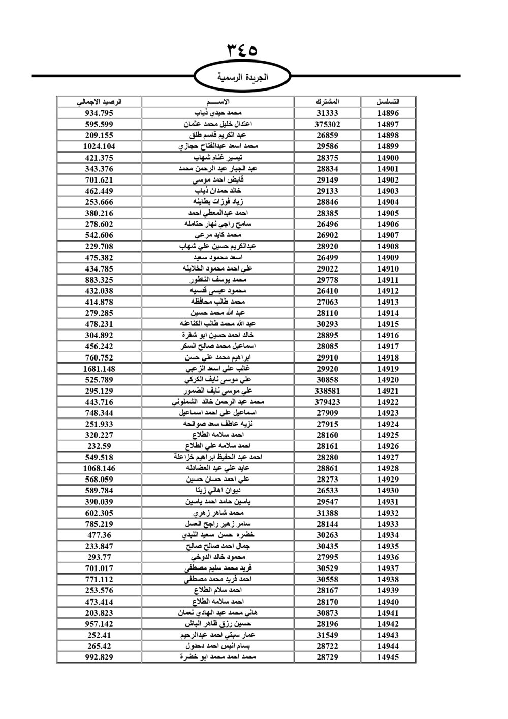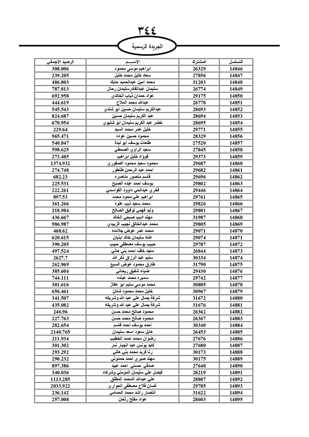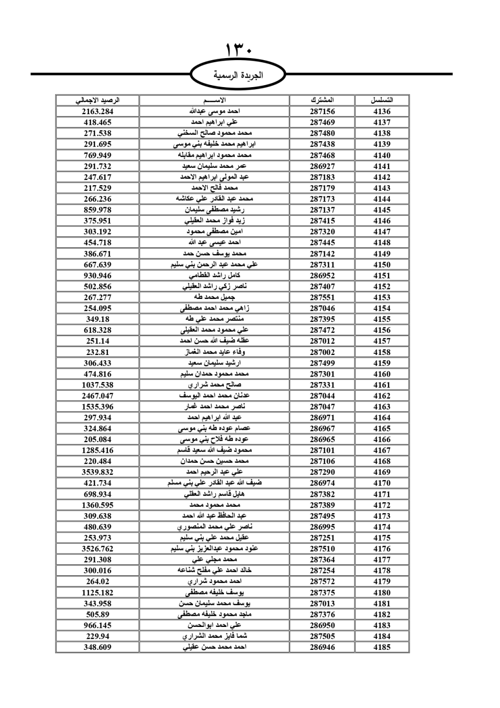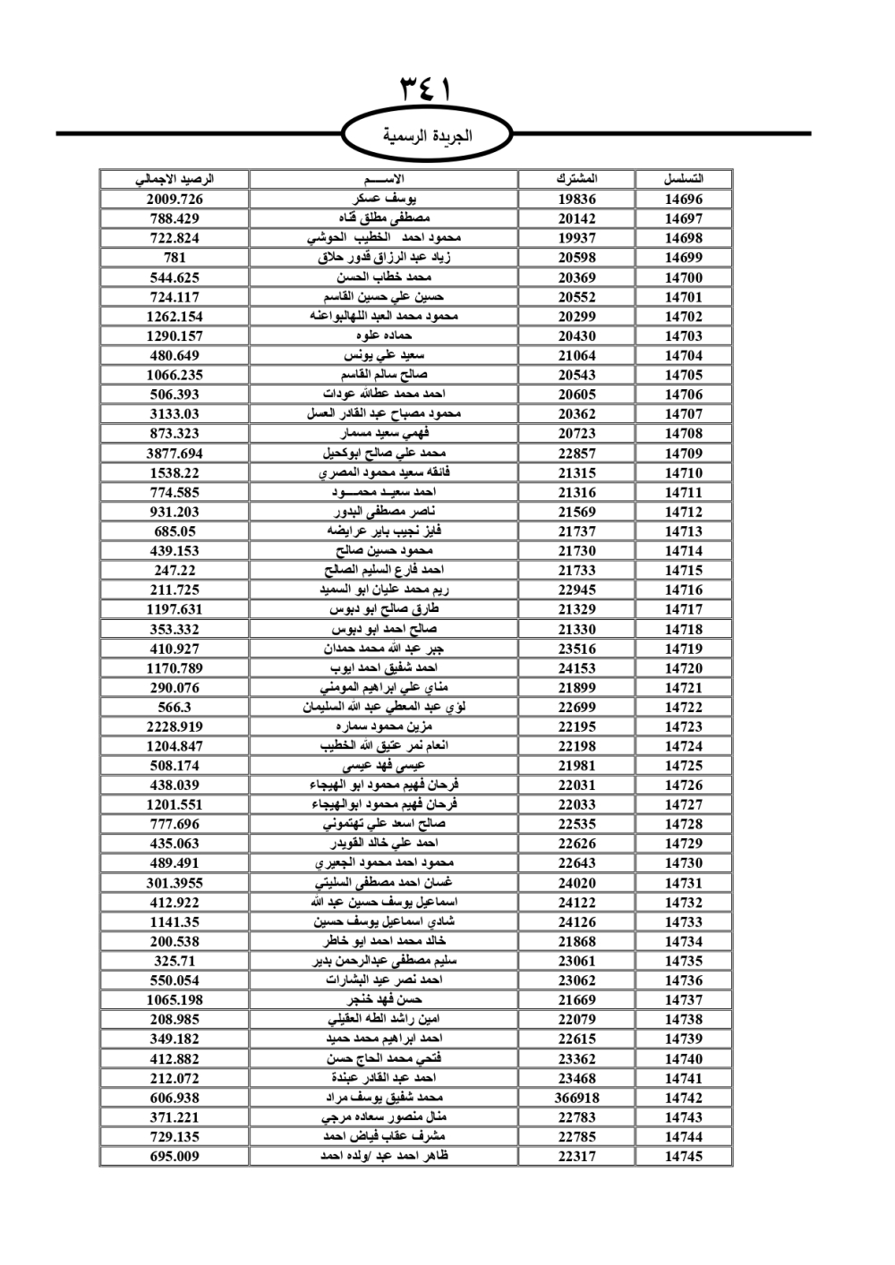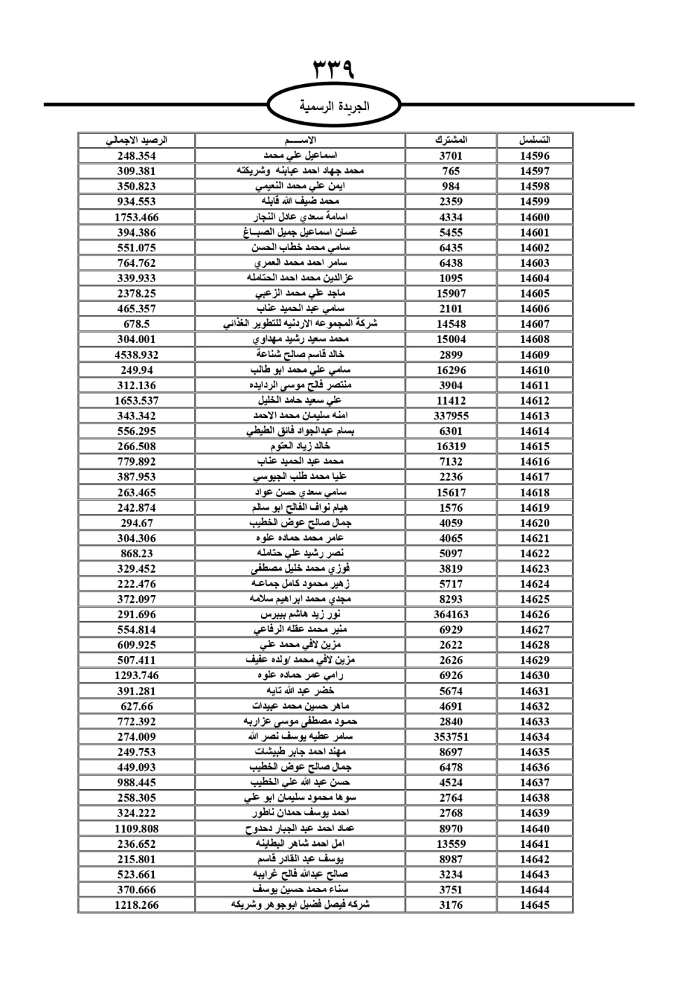 دعت سلطة المياه وبلدية الزرقاء، عشرات آلاف الأردنيين الواردة أسماؤهم بالكشوفات المرفقة، إلى ضرورة مراجعتها لتسوية أوضاعهم المالية كونه ترتب عليهم ذمم مالية، وذلك لتجنب الحجز على الأموال المنقولة وغير المنقولة بعد انقضاء 60 يوما من تاريخ النشر، علما أنه تم نشر هذه الأسماء في الجريدة الرسمية بتاريخ 16/2/2025.