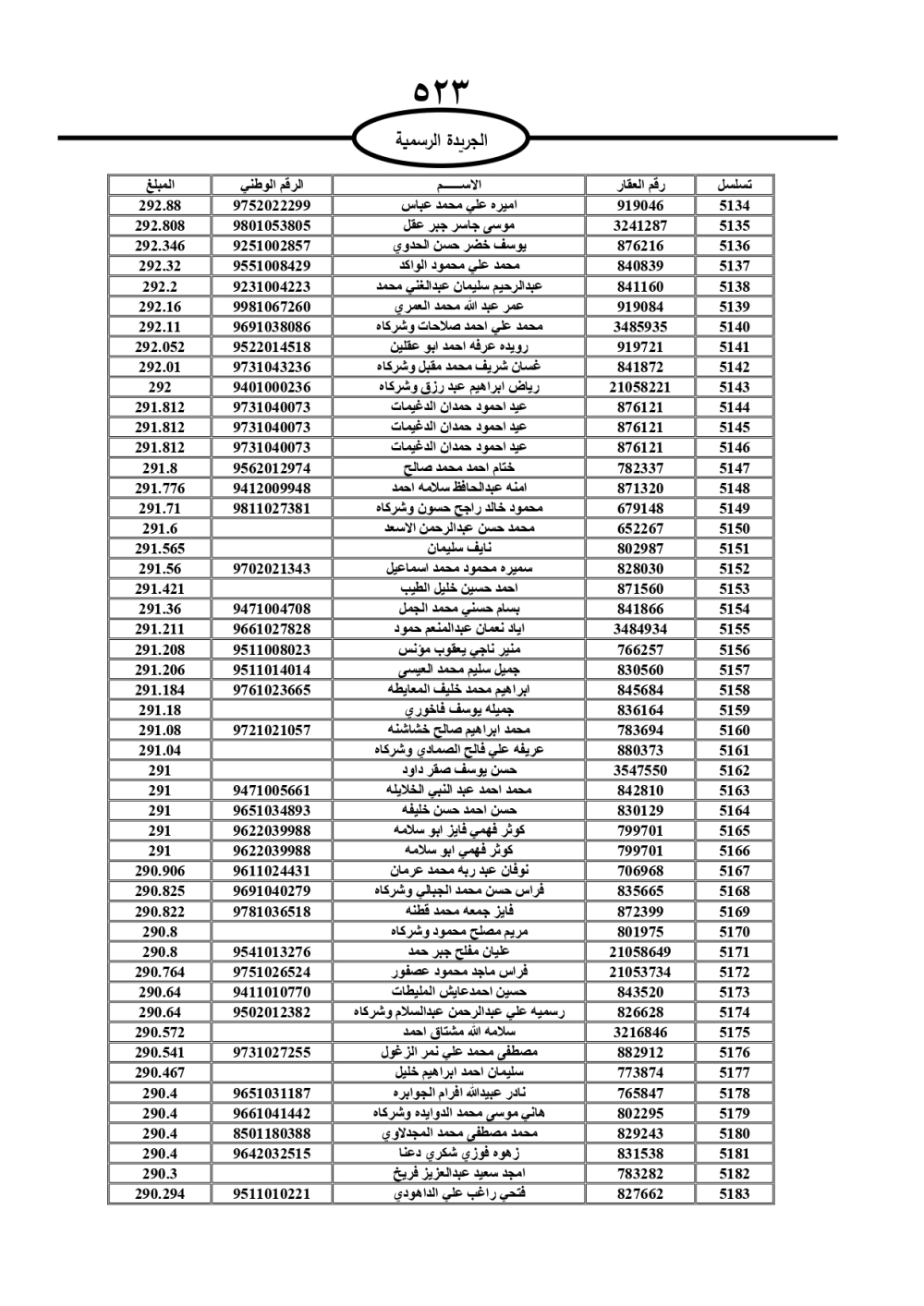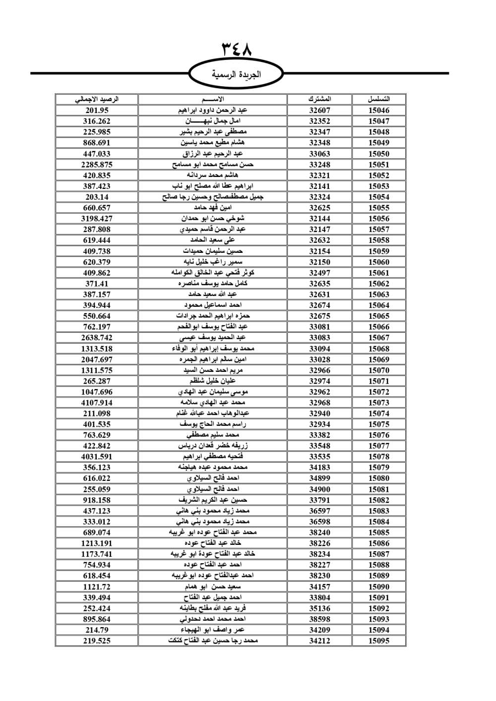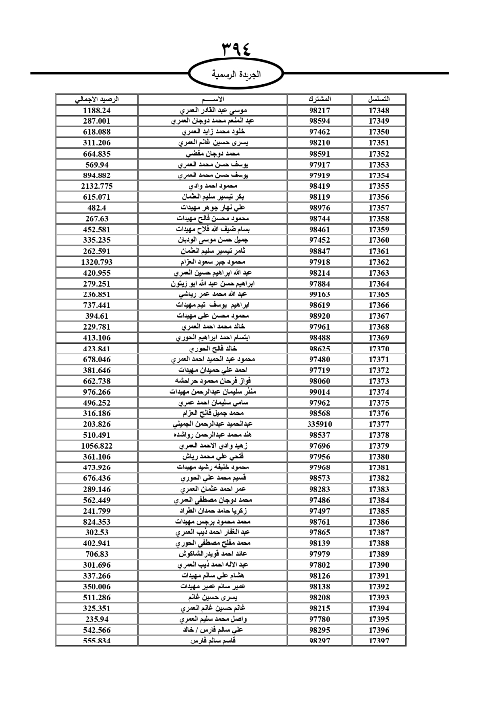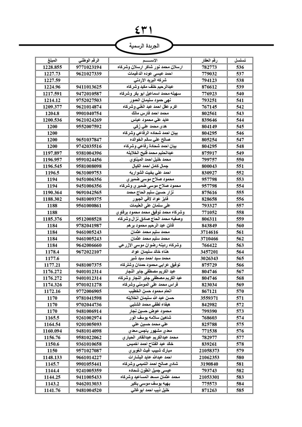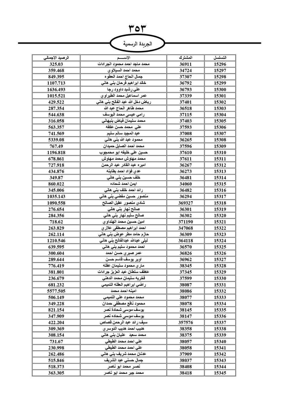 دعت سلطة المياه وبلدية الزرقاء، عشرات آلاف الأردنيين الواردة أسماؤهم بالكشوفات المرفقة، إلى ضرورة مراجعتها لتسوية أوضاعهم المالية كونه ترتب عليهم ذمم مالية، وذلك لتجنب الحجز على الأموال المنقولة وغير المنقولة بعد انقضاء 60 يوما من تاريخ النشر، علما أنه تم نشر هذه الأسماء في الجريدة الرسمية بتاريخ 16/2/2025.