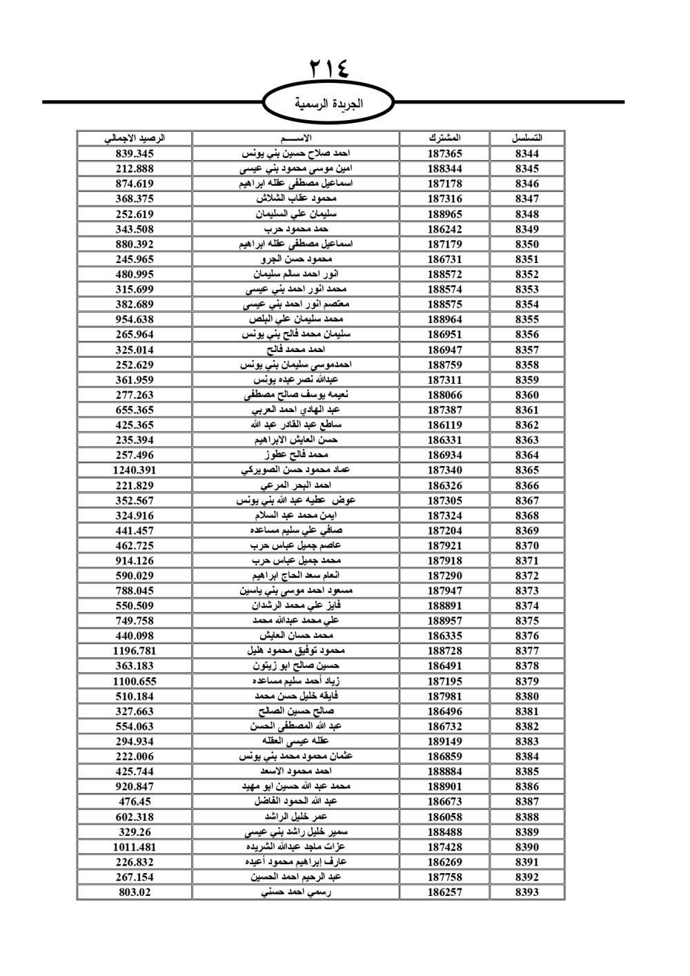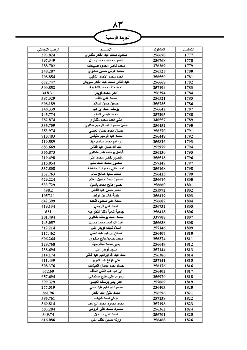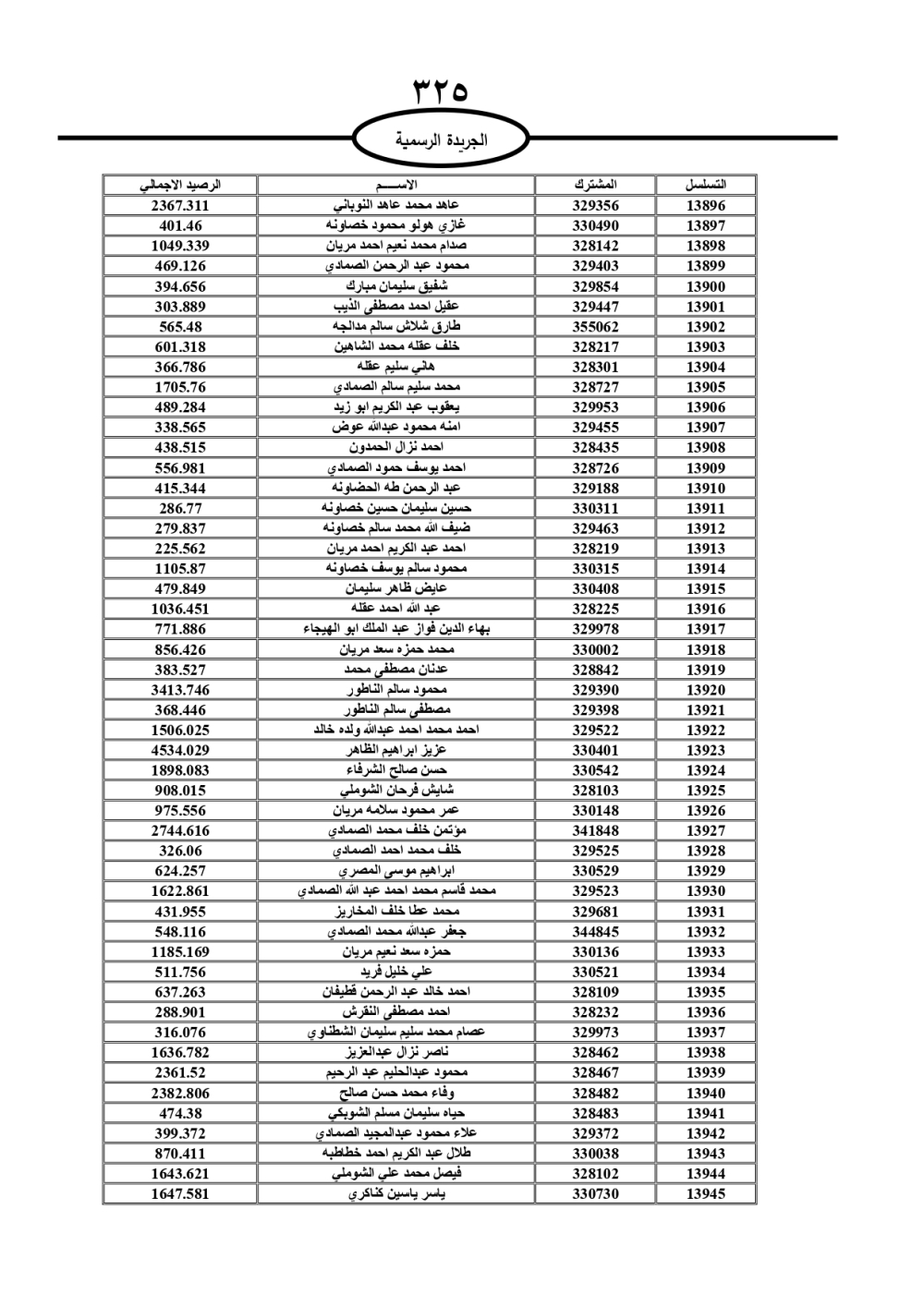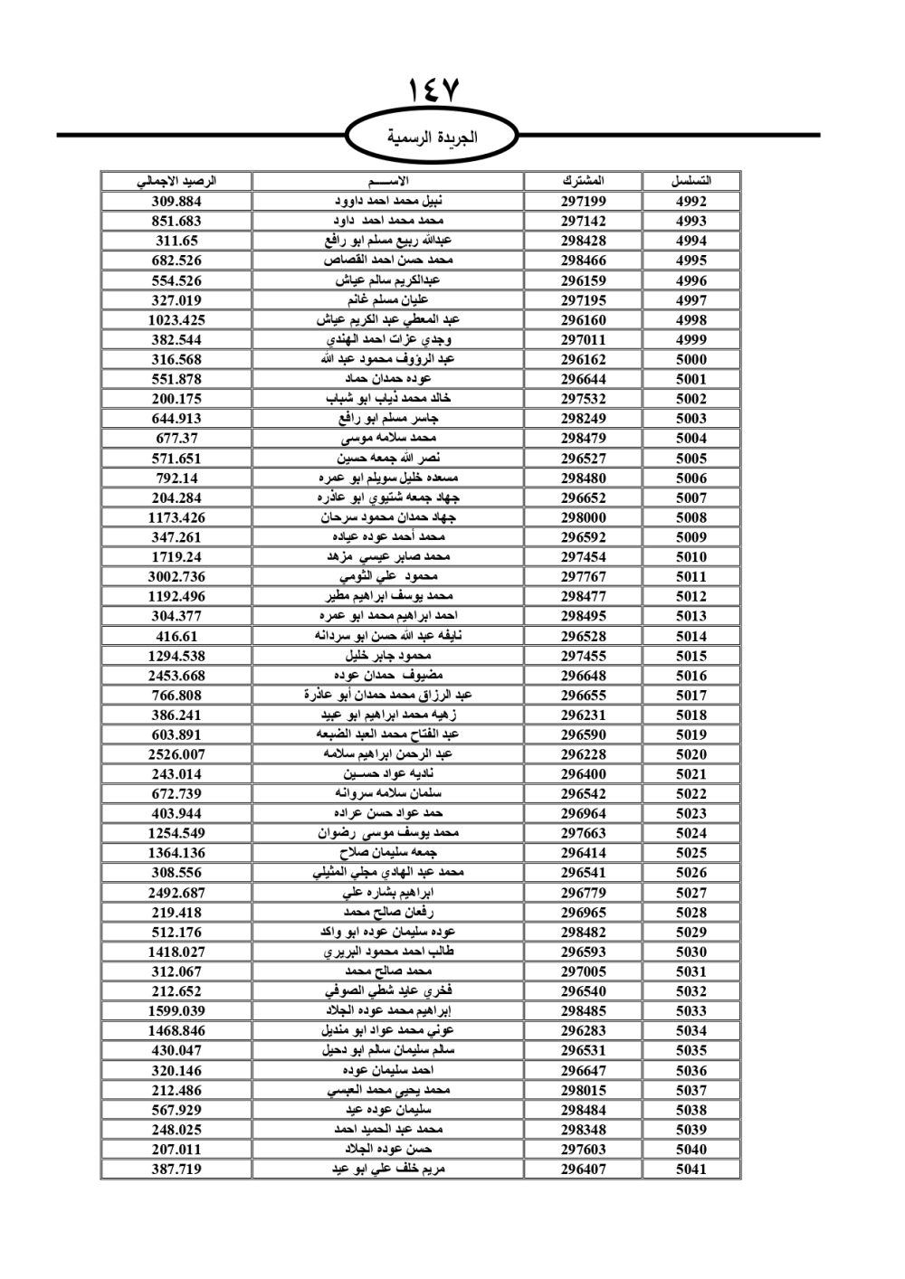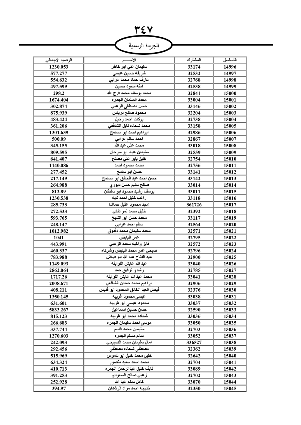 دعت سلطة المياه وبلدية الزرقاء، عشرات آلاف الأردنيين الواردة أسماؤهم بالكشوفات المرفقة، إلى ضرورة مراجعتها لتسوية أوضاعهم المالية كونه ترتب عليهم ذمم مالية، وذلك لتجنب الحجز على الأموال المنقولة وغير المنقولة بعد انقضاء 60 يوما من تاريخ النشر، علما أنه تم نشر هذه الأسماء في الجريدة الرسمية بتاريخ 16/2/2025.