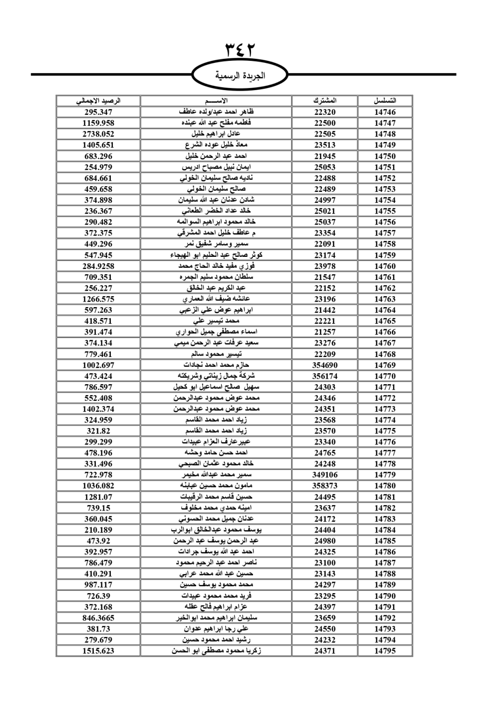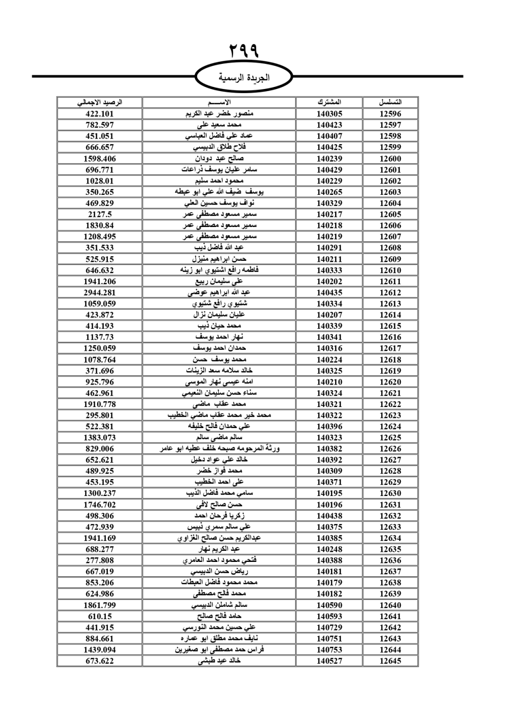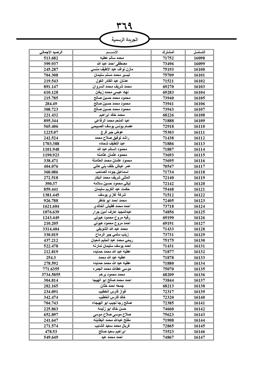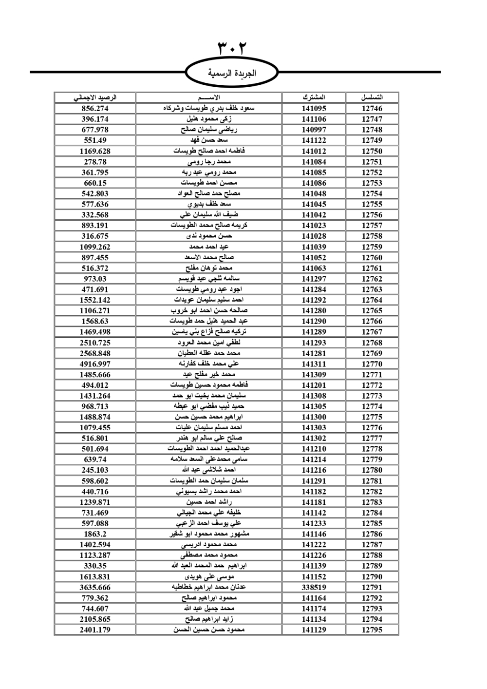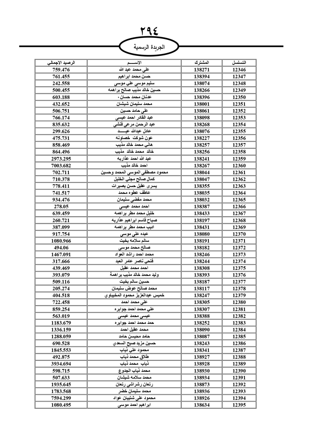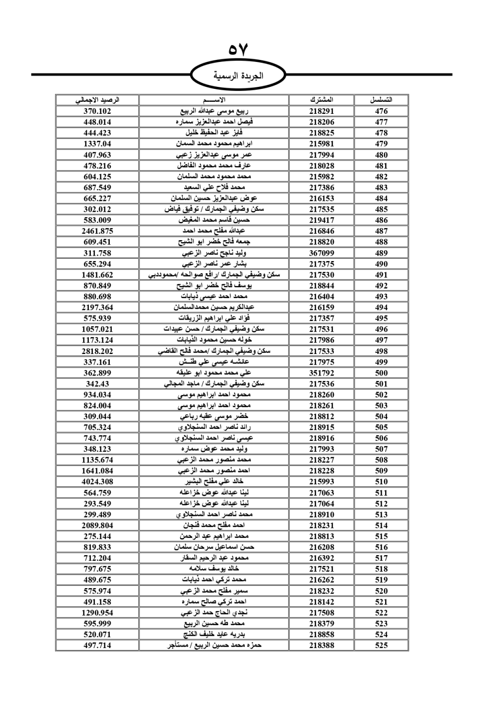 دعت سلطة المياه وبلدية الزرقاء، عشرات آلاف الأردنيين الواردة أسماؤهم بالكشوفات المرفقة، إلى ضرورة مراجعتها لتسوية أوضاعهم المالية كونه ترتب عليهم ذمم مالية، وذلك لتجنب الحجز على الأموال المنقولة وغير المنقولة بعد انقضاء 60 يوما من تاريخ النشر، علما أنه تم نشر هذه الأسماء في الجريدة الرسمية بتاريخ 16/2/2025.