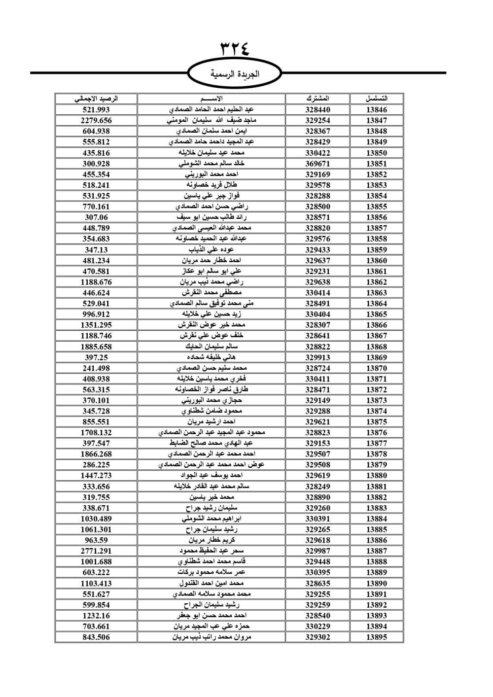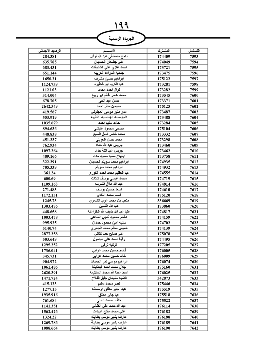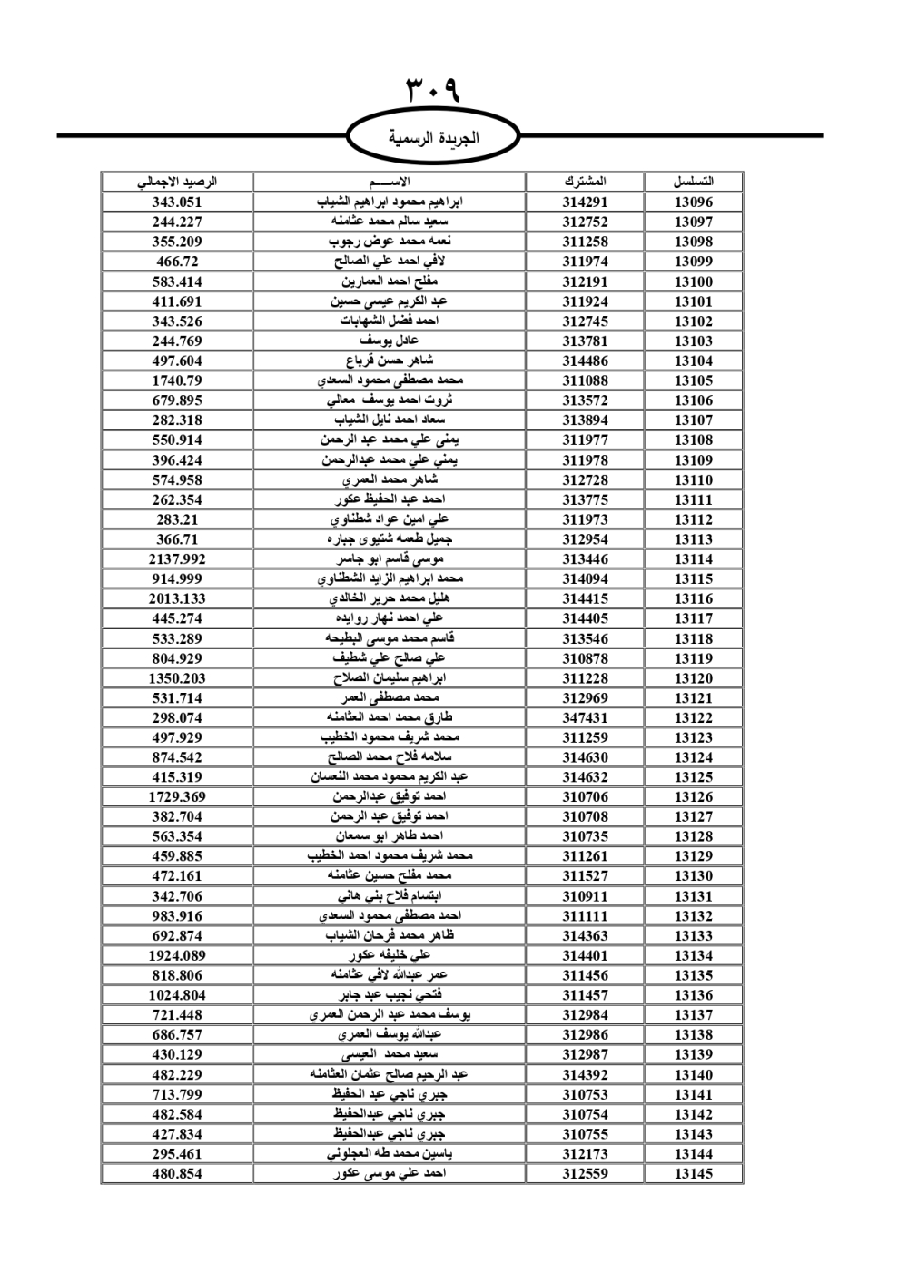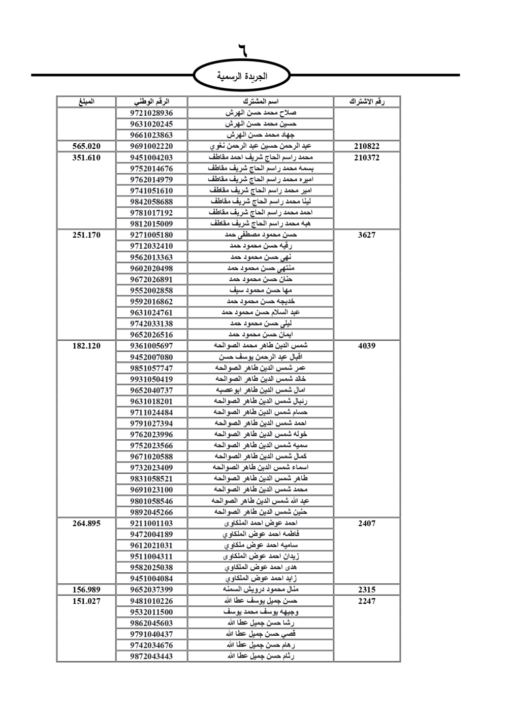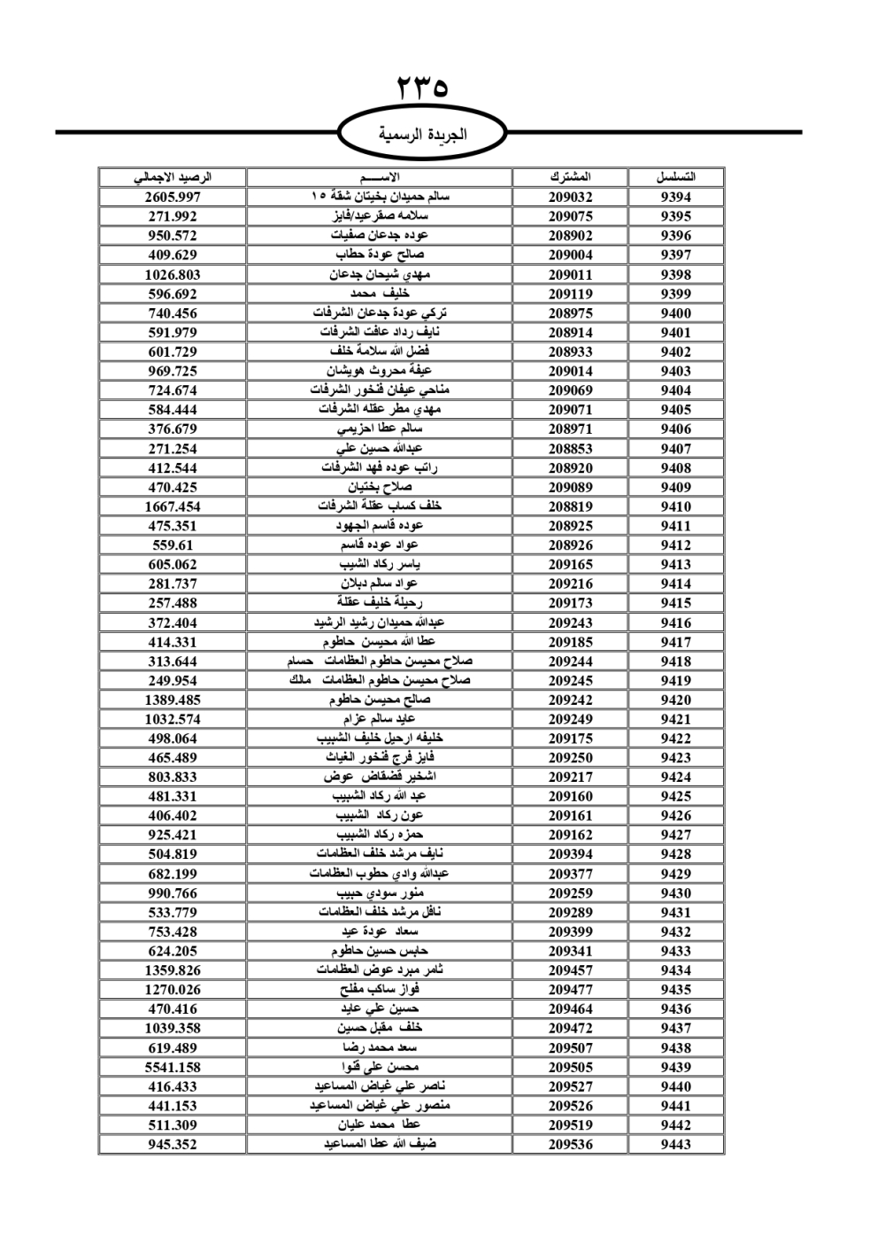 دعت سلطة المياه وبلدية الزرقاء، عشرات آلاف الأردنيين الواردة أسماؤهم بالكشوفات المرفقة، إلى ضرورة مراجعتها لتسوية أوضاعهم المالية كونه ترتب عليهم ذمم مالية، وذلك لتجنب الحجز على الأموال المنقولة وغير المنقولة بعد انقضاء 60 يوما من تاريخ النشر، علما أنه تم نشر هذه الأسماء في الجريدة الرسمية بتاريخ 16/2/2025.