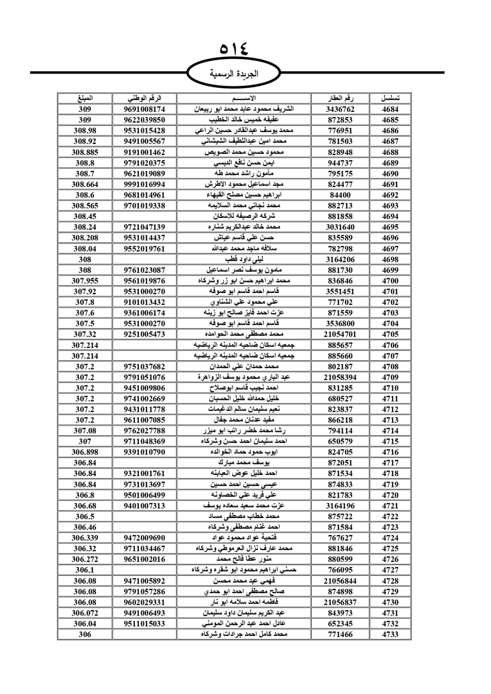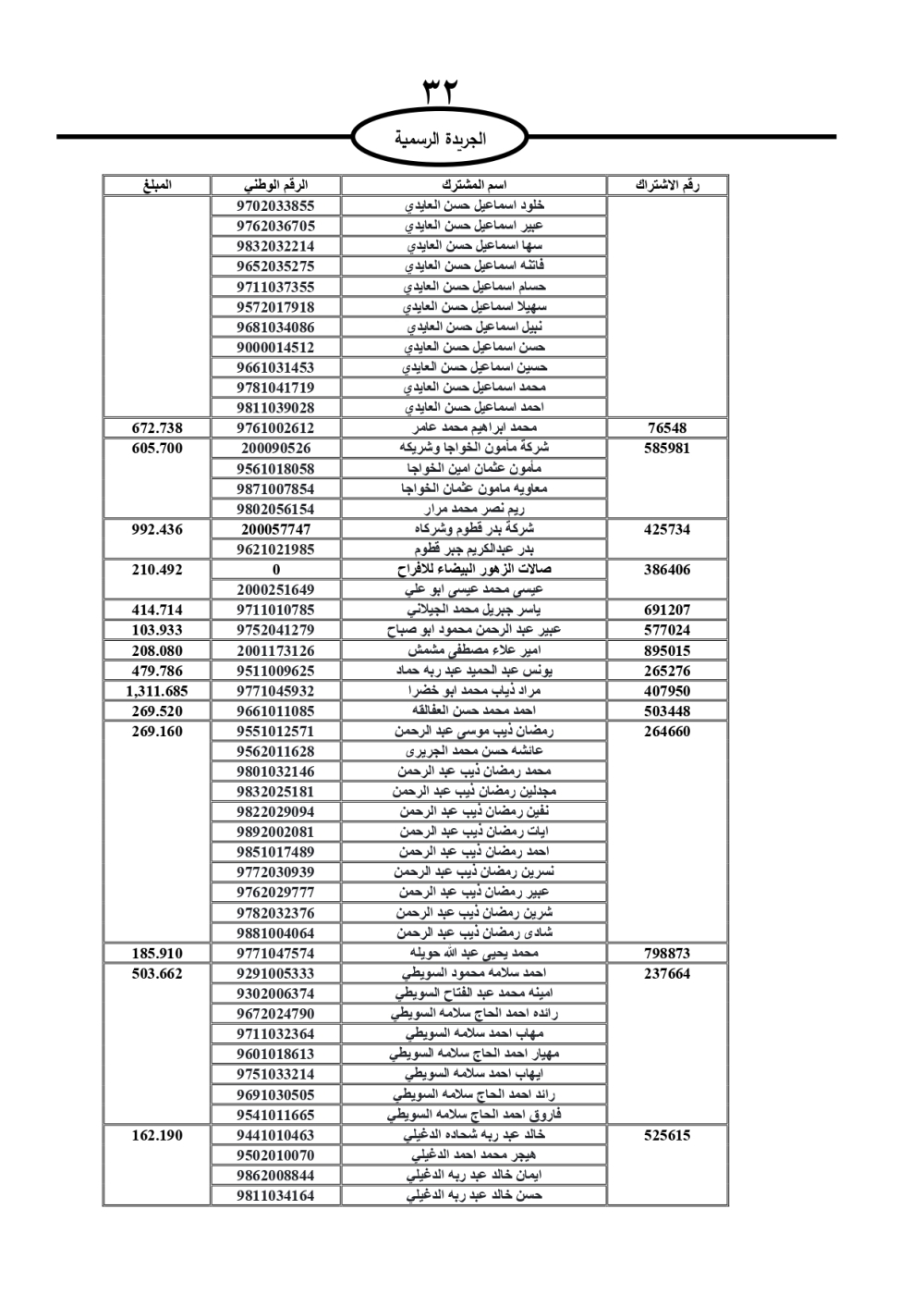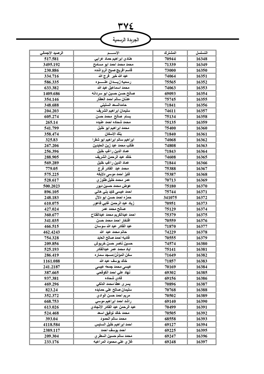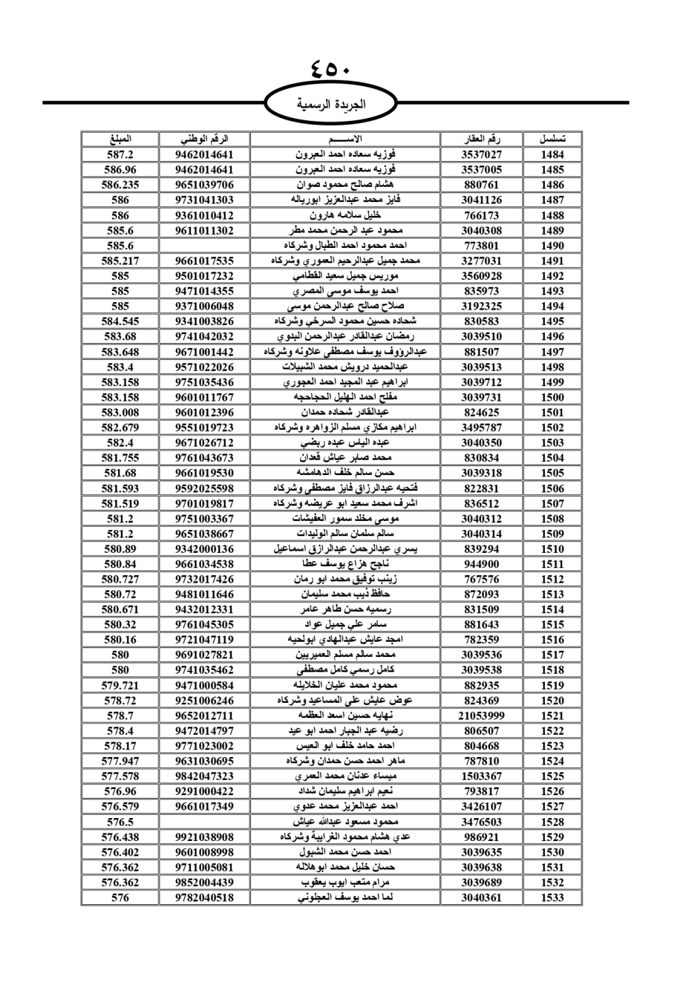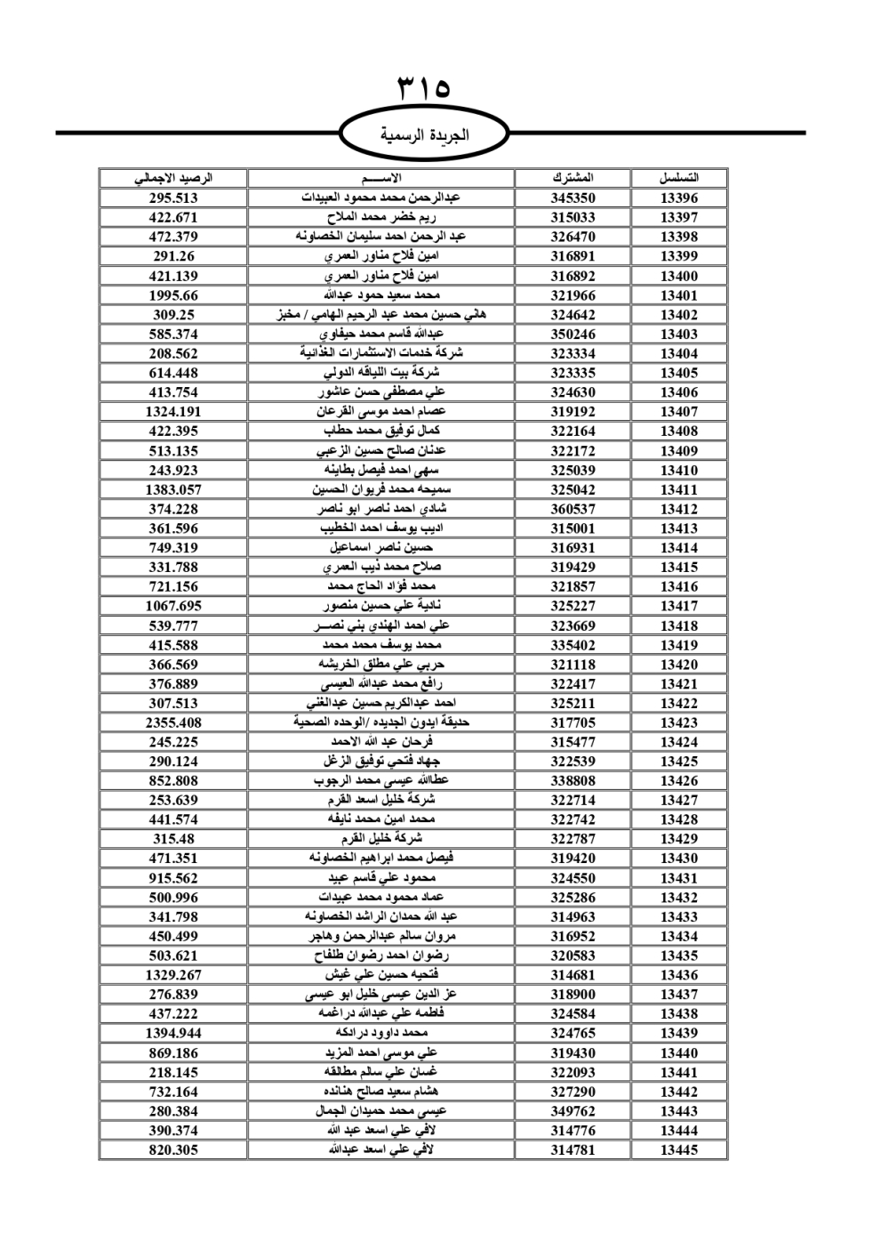 دعت سلطة المياه وبلدية الزرقاء، عشرات آلاف الأردنيين الواردة أسماؤهم بالكشوفات المرفقة، إلى ضرورة مراجعتها لتسوية أوضاعهم المالية كونه ترتب عليهم ذمم مالية، وذلك لتجنب الحجز على الأموال المنقولة وغير المنقولة بعد انقضاء 60 يوما من تاريخ النشر، علما أنه تم نشر هذه الأسماء في الجريدة الرسمية بتاريخ 16/2/2025.