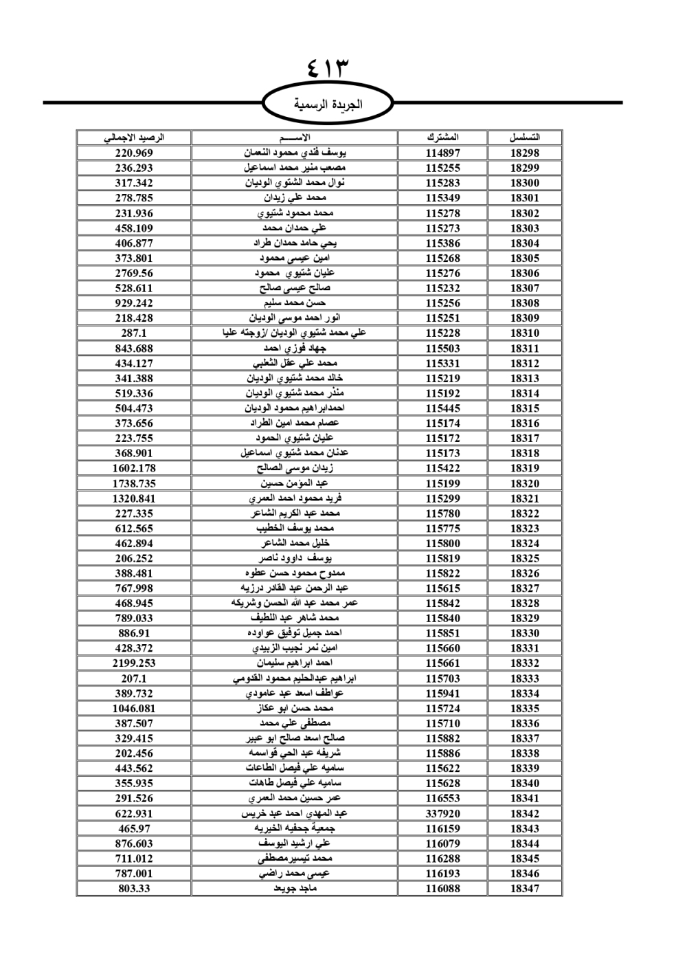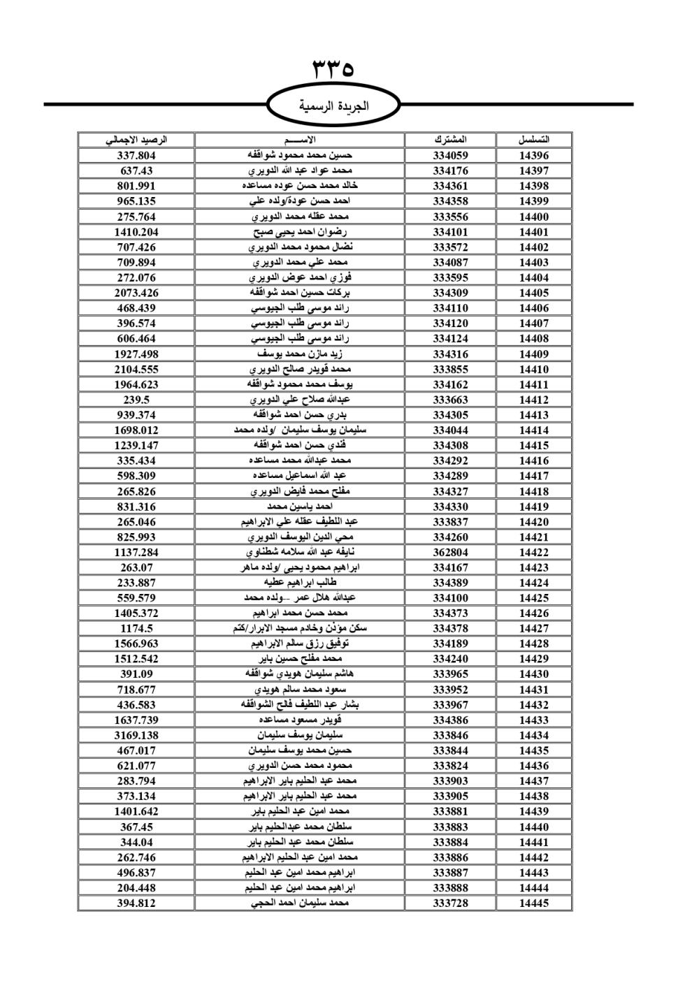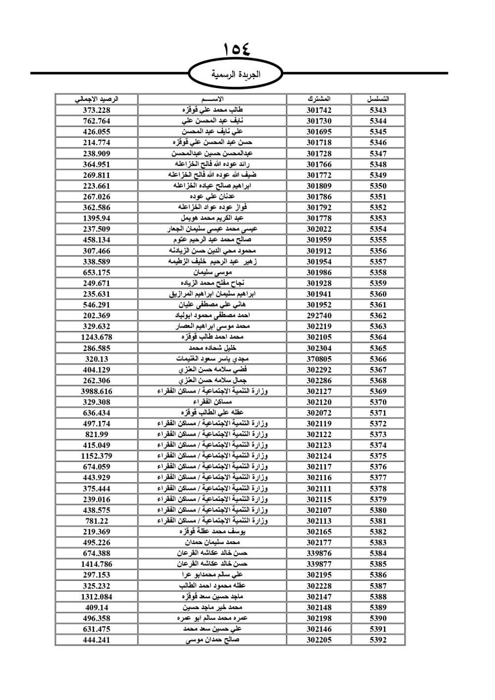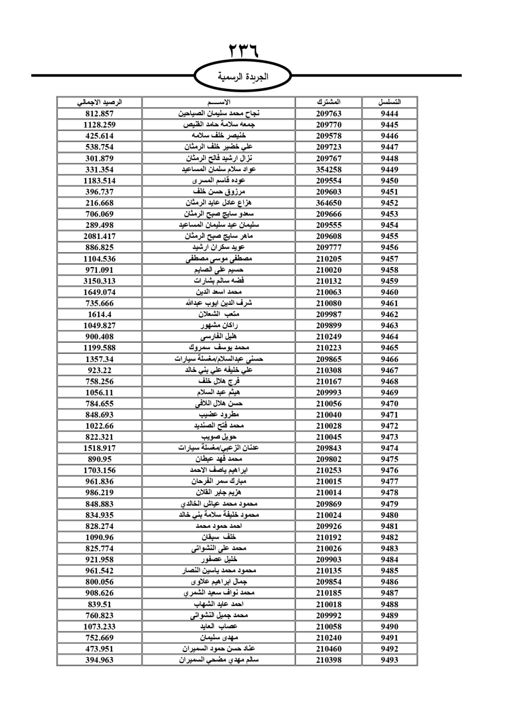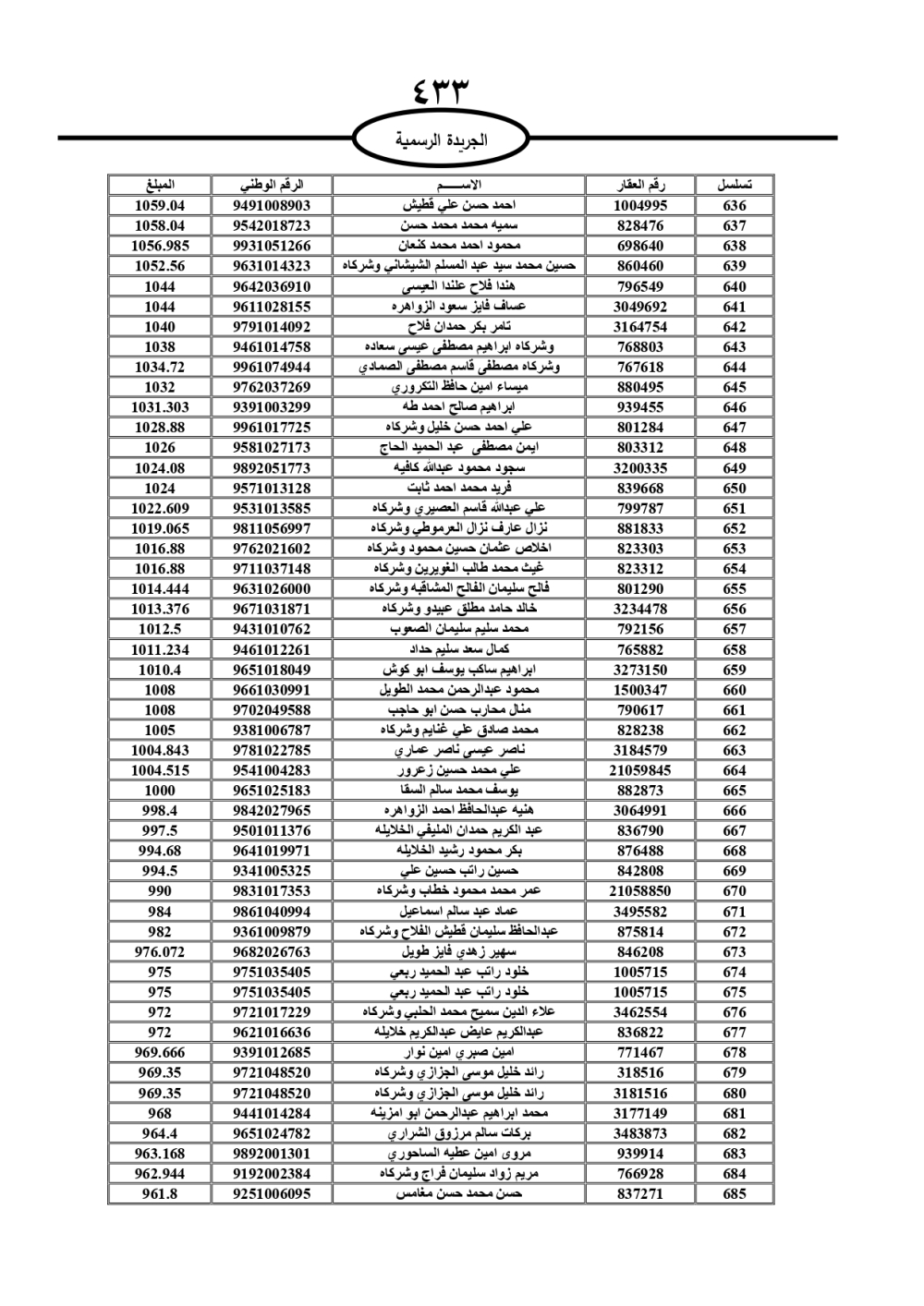 دعت سلطة المياه وبلدية الزرقاء، عشرات آلاف الأردنيين الواردة أسماؤهم بالكشوفات المرفقة، إلى ضرورة مراجعتها لتسوية أوضاعهم المالية كونه ترتب عليهم ذمم مالية، وذلك لتجنب الحجز على الأموال المنقولة وغير المنقولة بعد انقضاء 60 يوما من تاريخ النشر، علما أنه تم نشر هذه الأسماء في الجريدة الرسمية بتاريخ 16/2/2025.