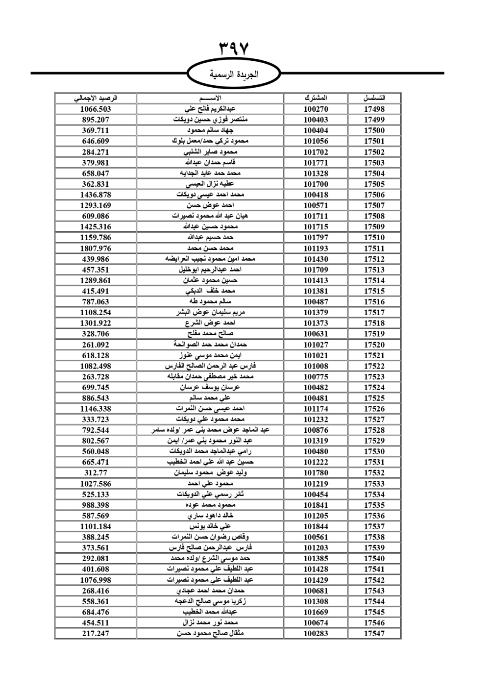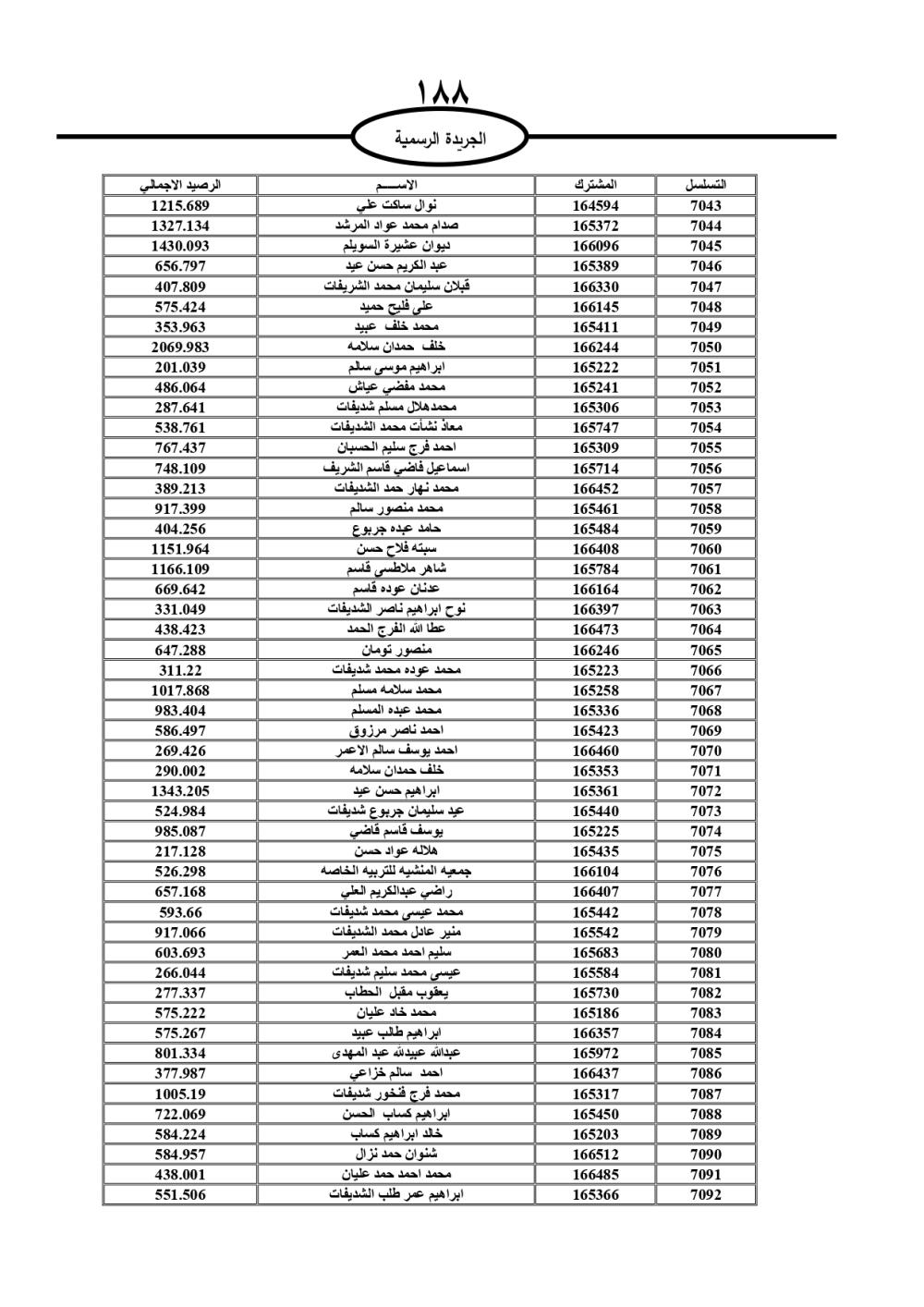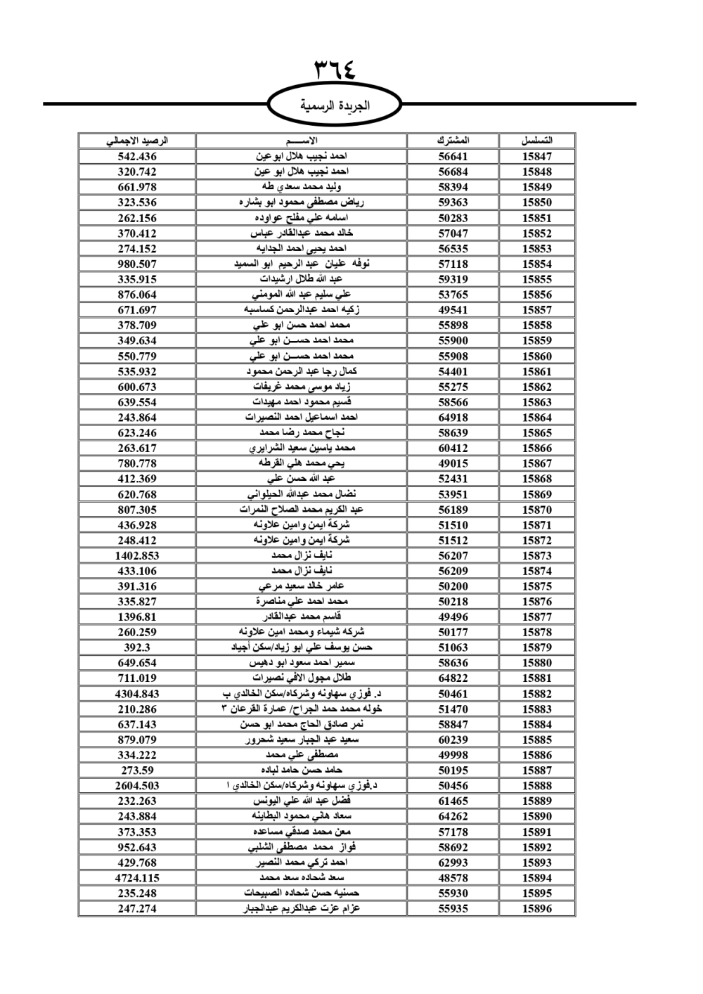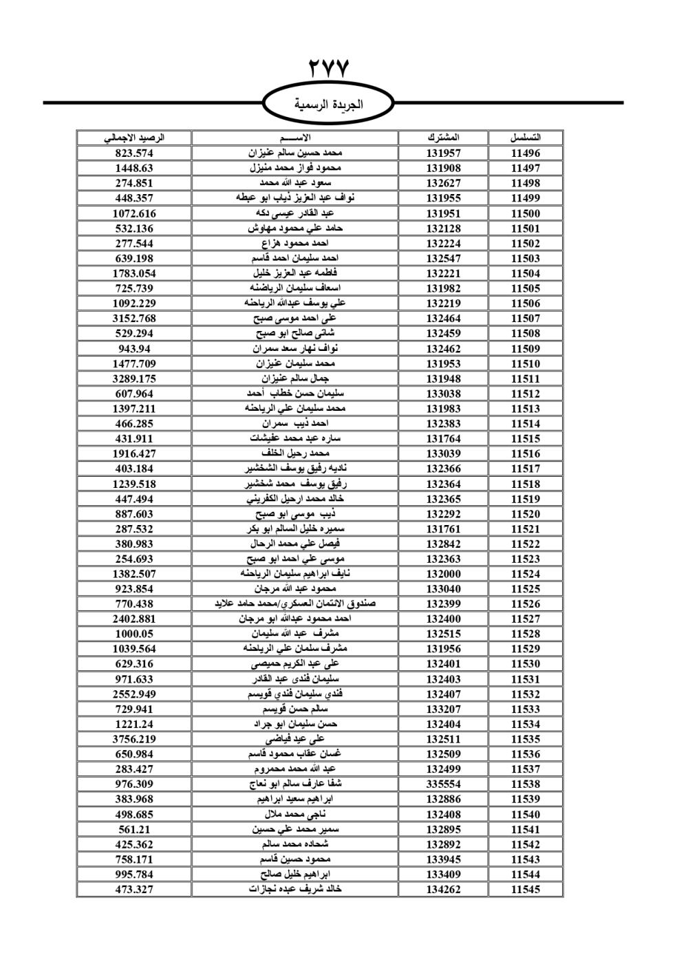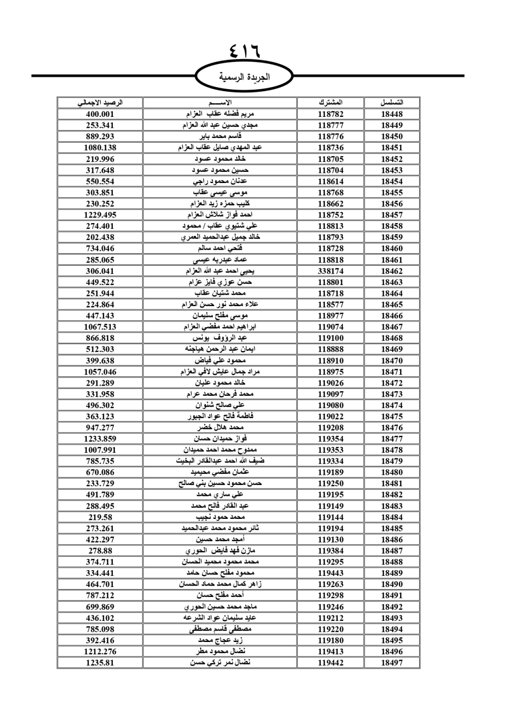 دعت سلطة المياه وبلدية الزرقاء، عشرات آلاف الأردنيين الواردة أسماؤهم بالكشوفات المرفقة، إلى ضرورة مراجعتها لتسوية أوضاعهم المالية كونه ترتب عليهم ذمم مالية، وذلك لتجنب الحجز على الأموال المنقولة وغير المنقولة بعد انقضاء 60 يوما من تاريخ النشر، علما أنه تم نشر هذه الأسماء في الجريدة الرسمية بتاريخ 16/2/2025.
