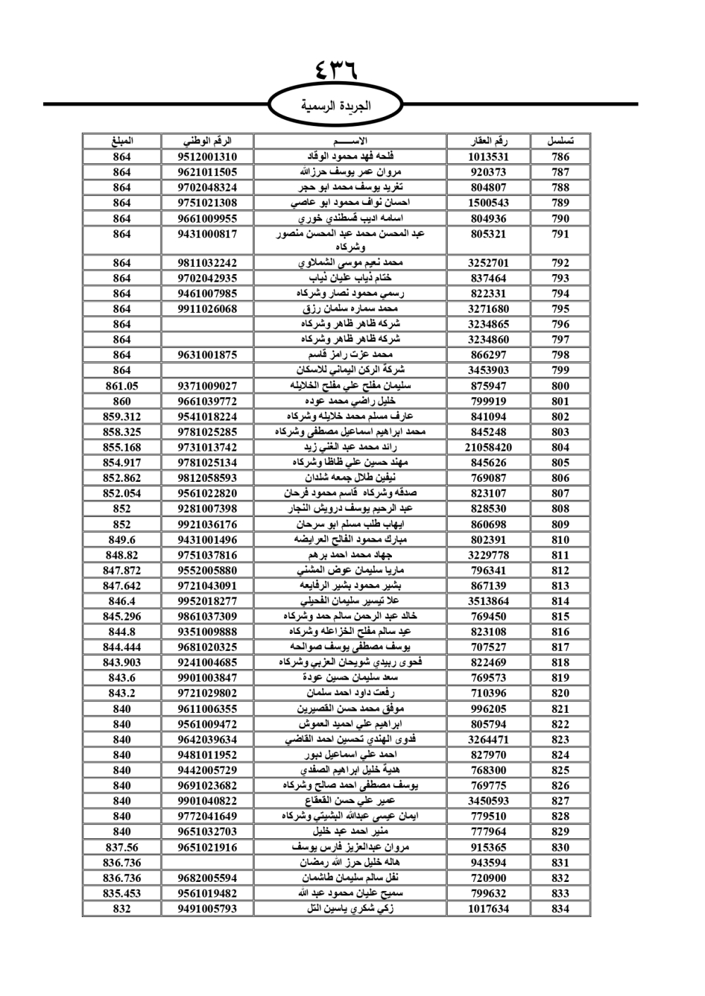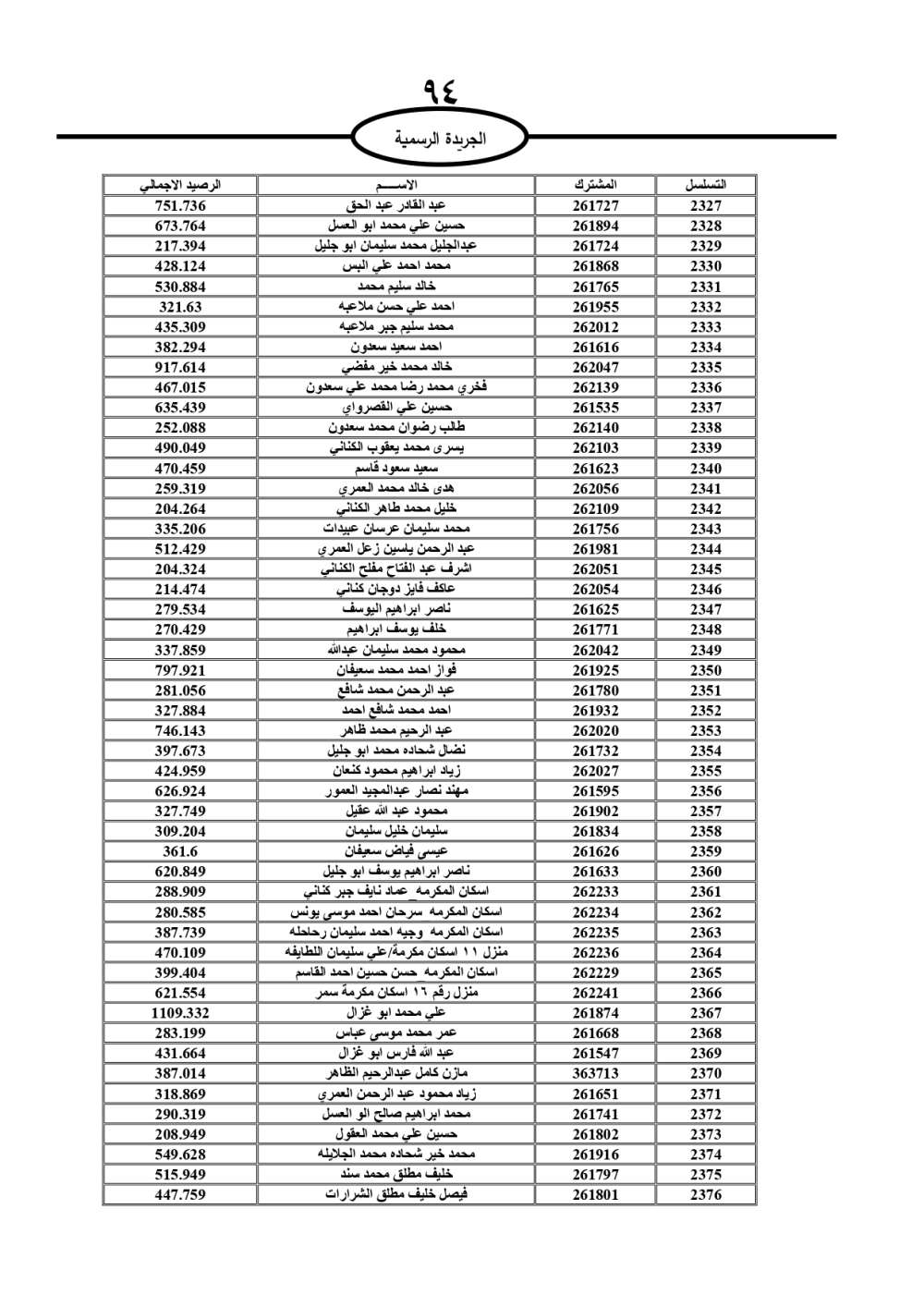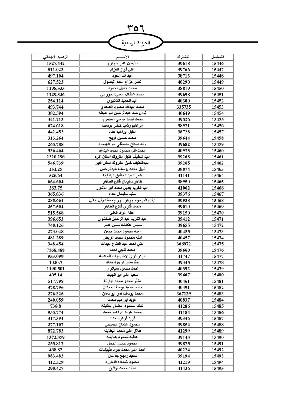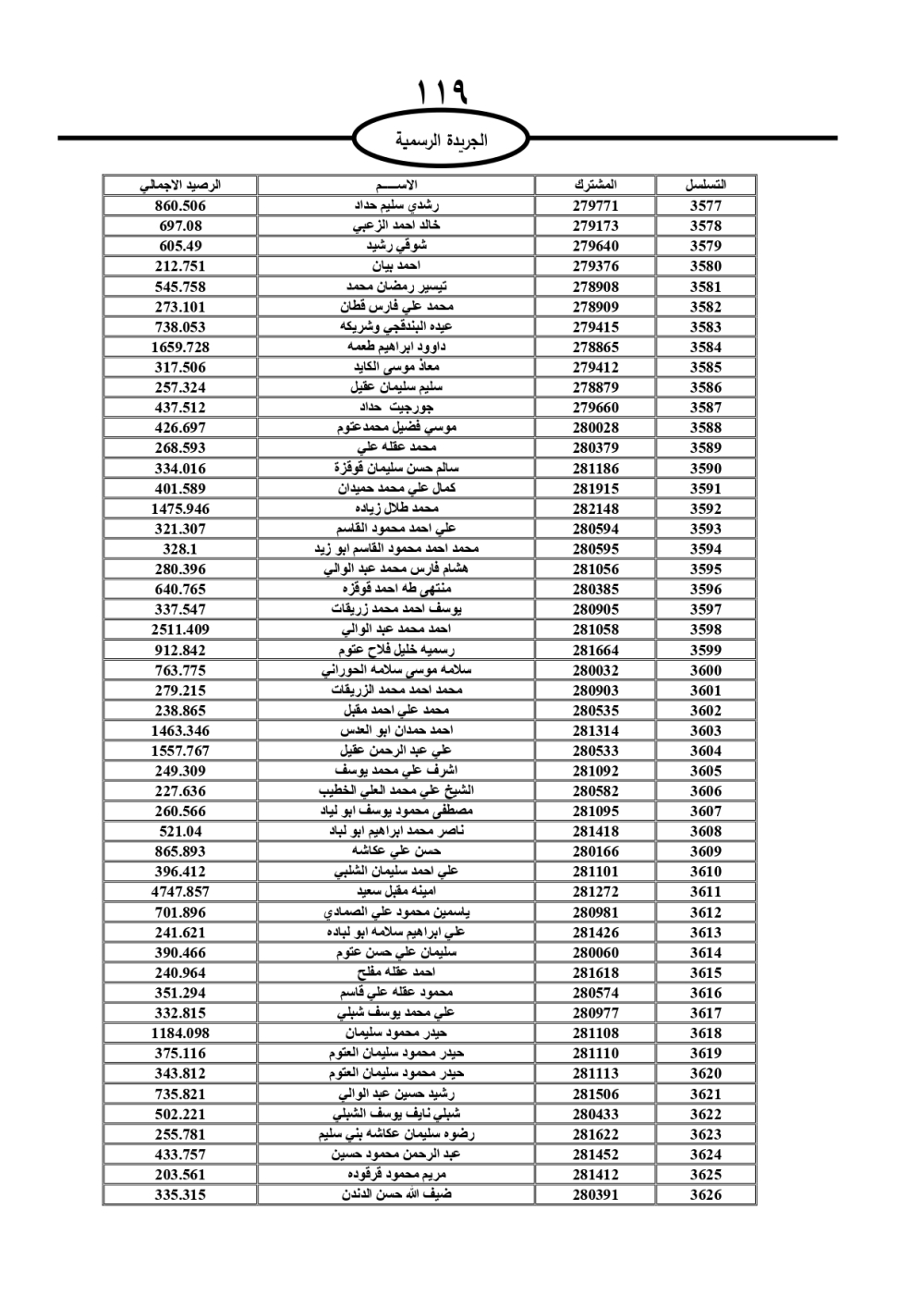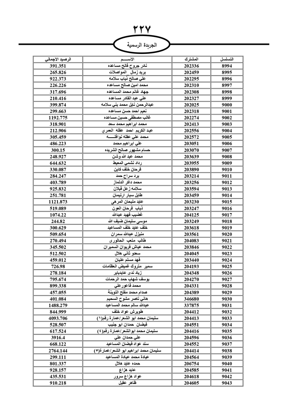 دعت سلطة المياه وبلدية الزرقاء، عشرات آلاف الأردنيين الواردة أسماؤهم بالكشوفات المرفقة، إلى ضرورة مراجعتها لتسوية أوضاعهم المالية كونه ترتب عليهم ذمم مالية، وذلك لتجنب الحجز على الأموال المنقولة وغير المنقولة بعد انقضاء 60 يوما من تاريخ النشر، علما أنه تم نشر هذه الأسماء في الجريدة الرسمية بتاريخ 16/2/2025.