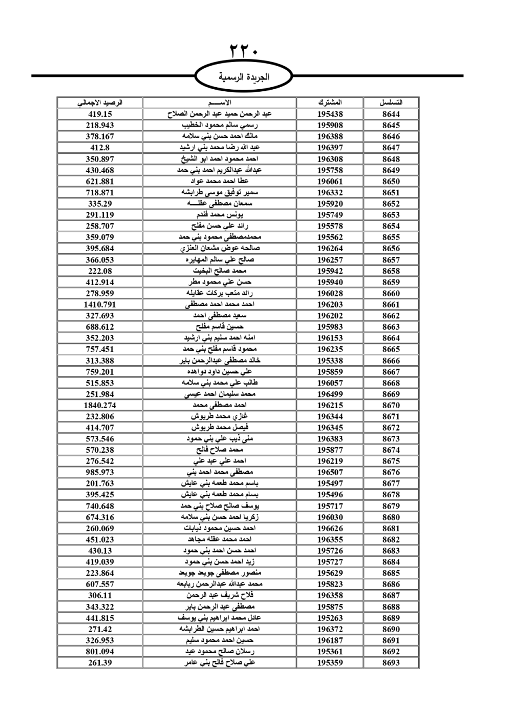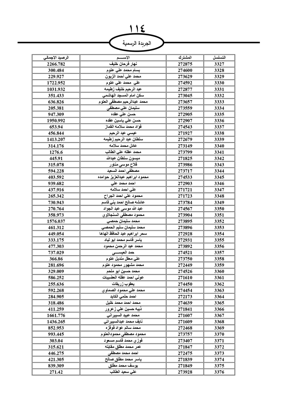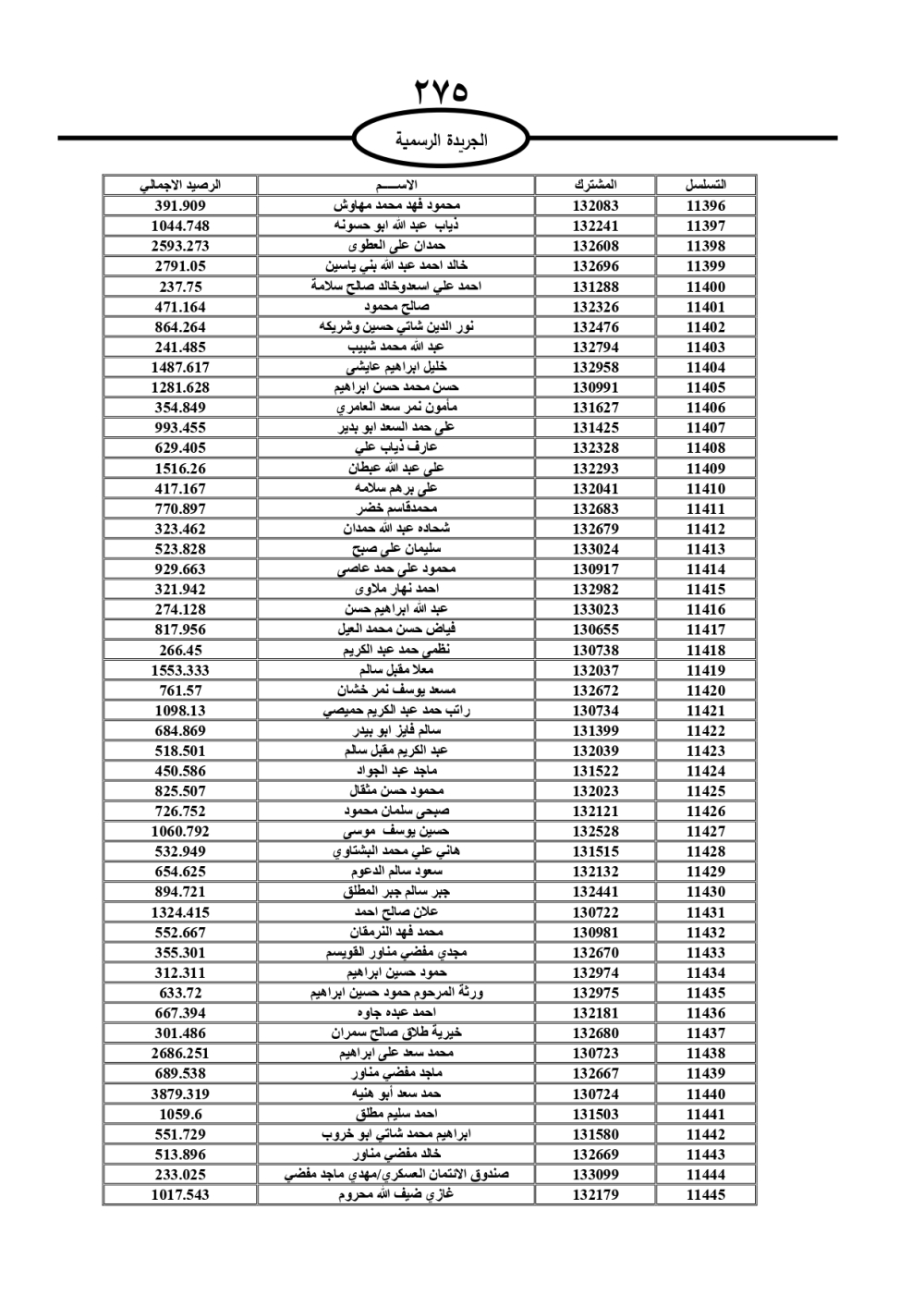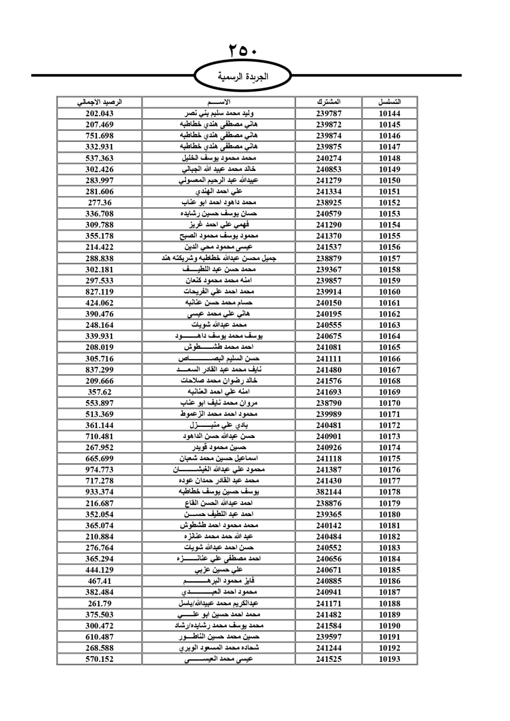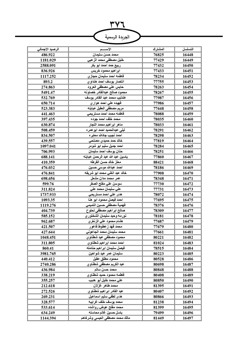 دعت سلطة المياه وبلدية الزرقاء، عشرات آلاف الأردنيين الواردة أسماؤهم بالكشوفات المرفقة، إلى ضرورة مراجعتها لتسوية أوضاعهم المالية كونه ترتب عليهم ذمم مالية، وذلك لتجنب الحجز على الأموال المنقولة وغير المنقولة بعد انقضاء 60 يوما من تاريخ النشر، علما أنه تم نشر هذه الأسماء في الجريدة الرسمية بتاريخ 16/2/2025.