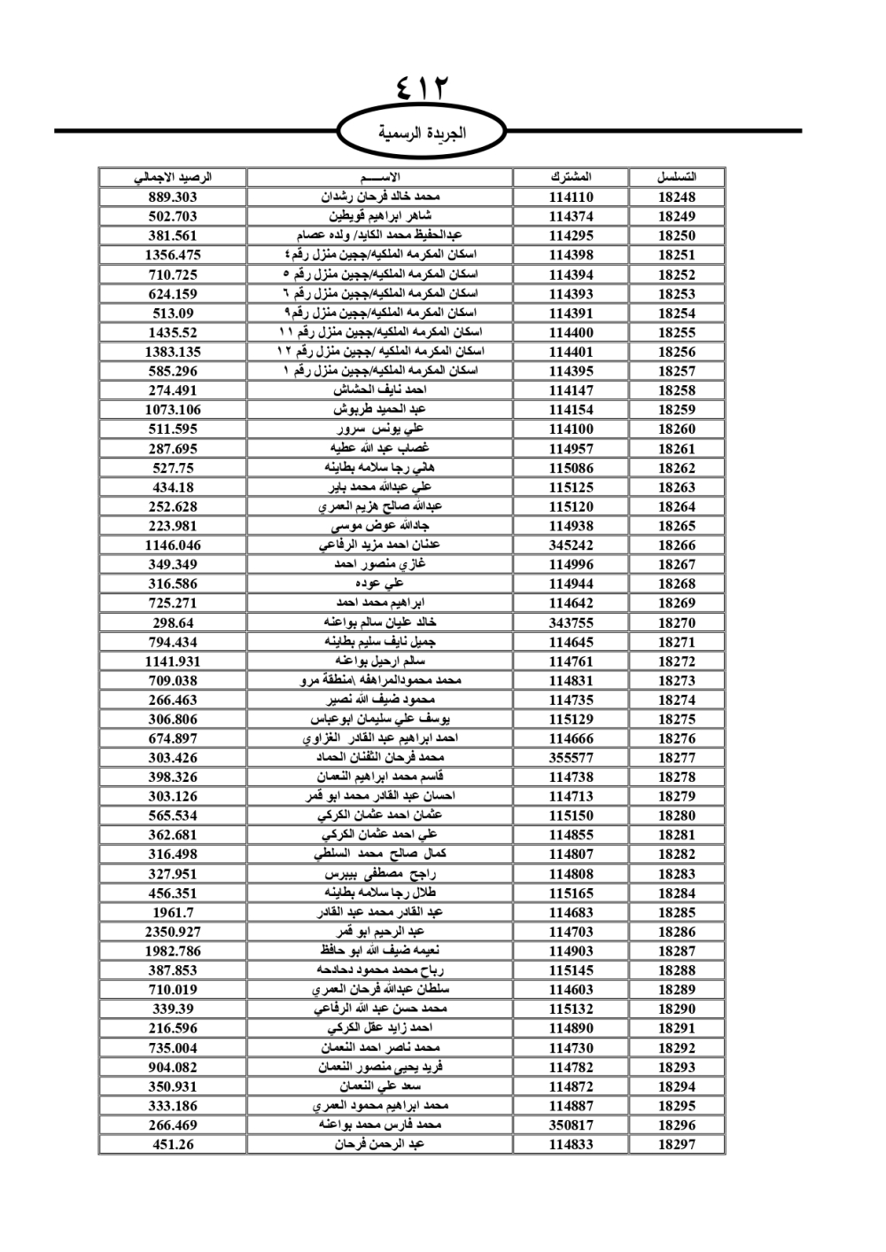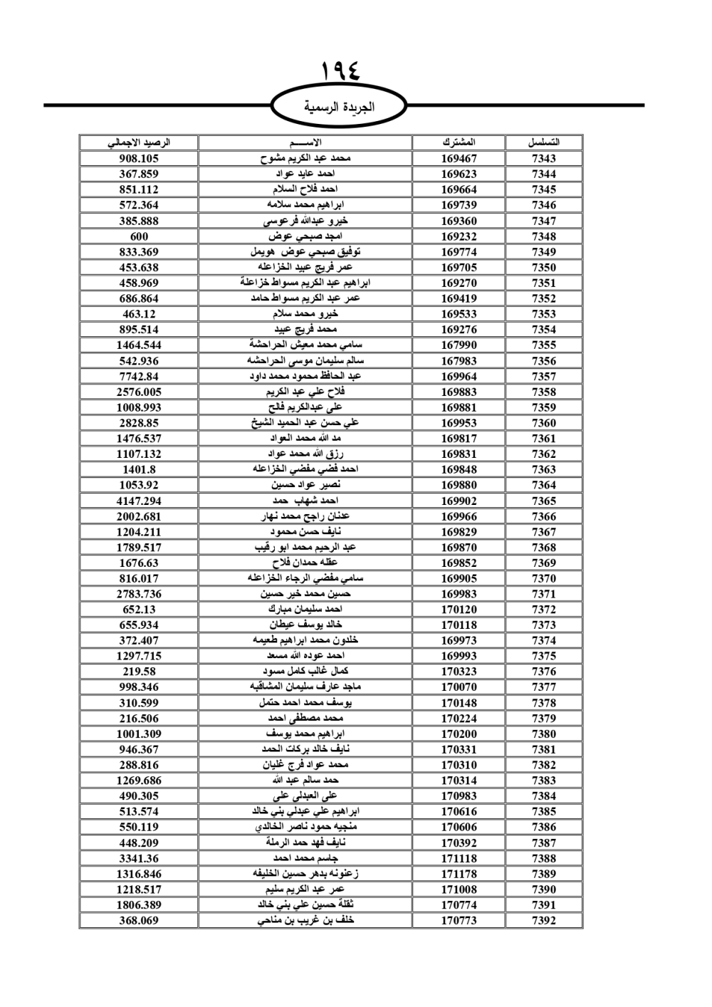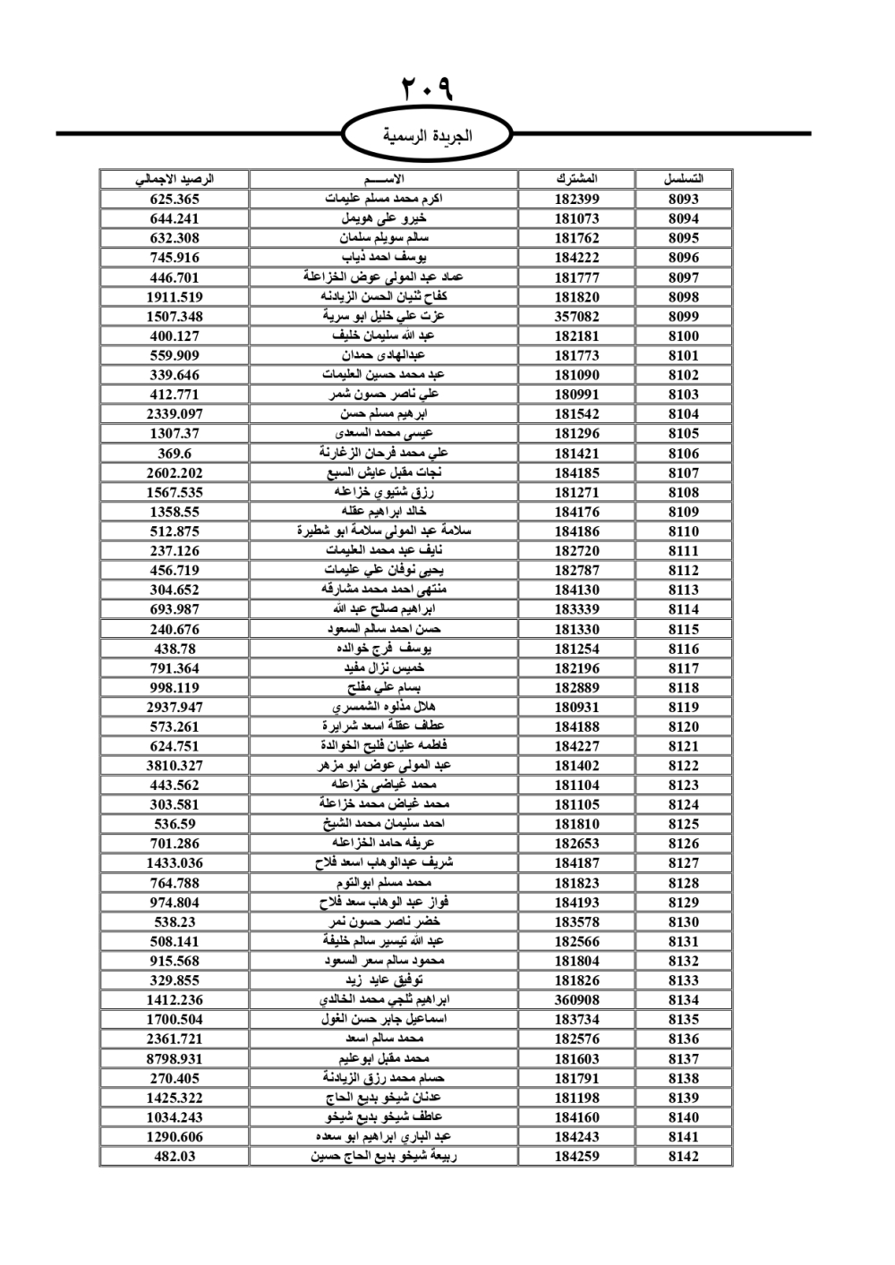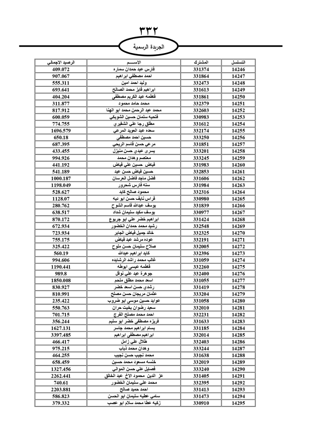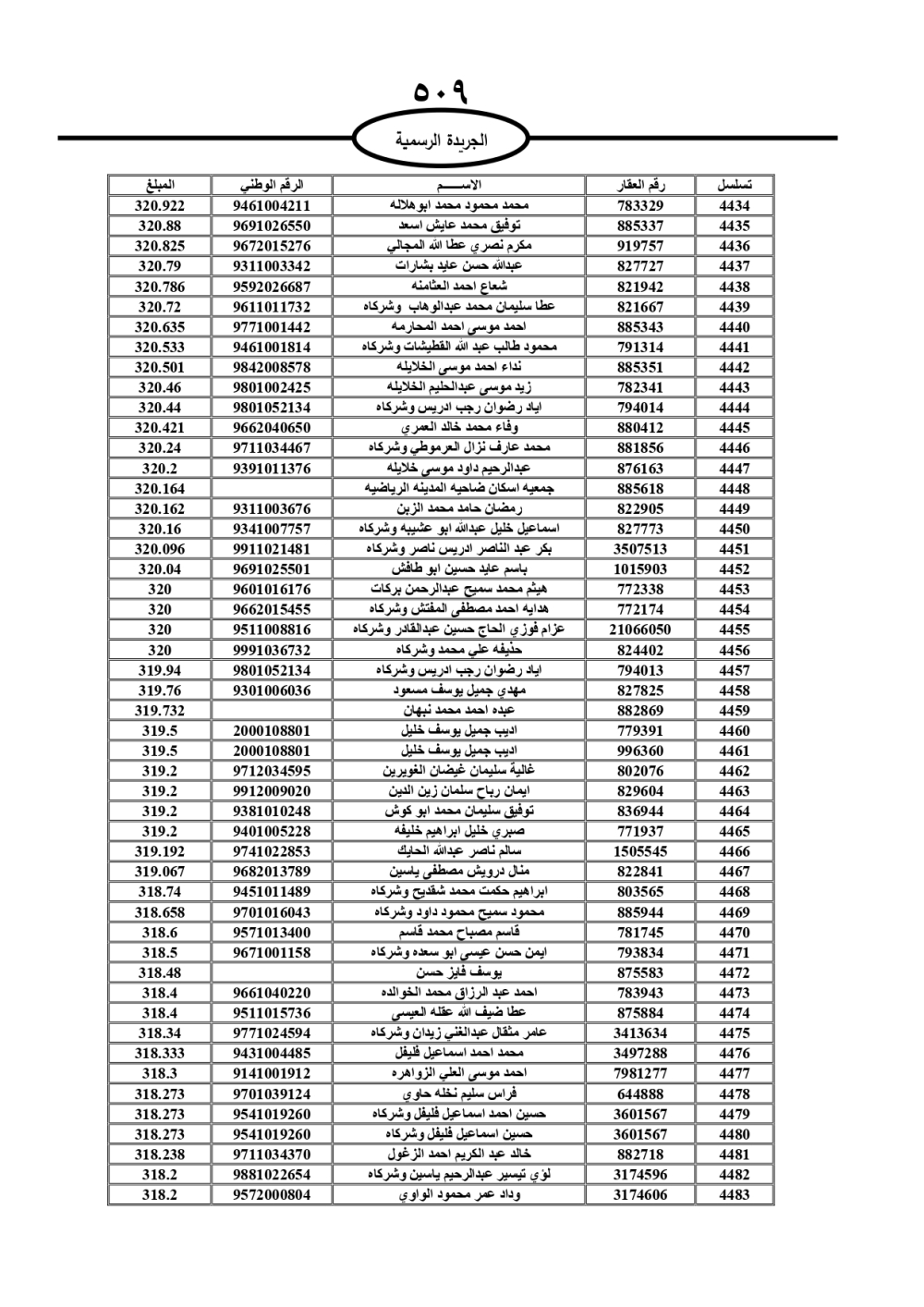 دعت سلطة المياه وبلدية الزرقاء، عشرات آلاف الأردنيين الواردة أسماؤهم بالكشوفات المرفقة، إلى ضرورة مراجعتها لتسوية أوضاعهم المالية كونه ترتب عليهم ذمم مالية، وذلك لتجنب الحجز على الأموال المنقولة وغير المنقولة بعد انقضاء 60 يوما من تاريخ النشر، علما أنه تم نشر هذه الأسماء في الجريدة الرسمية بتاريخ 16/2/2025.