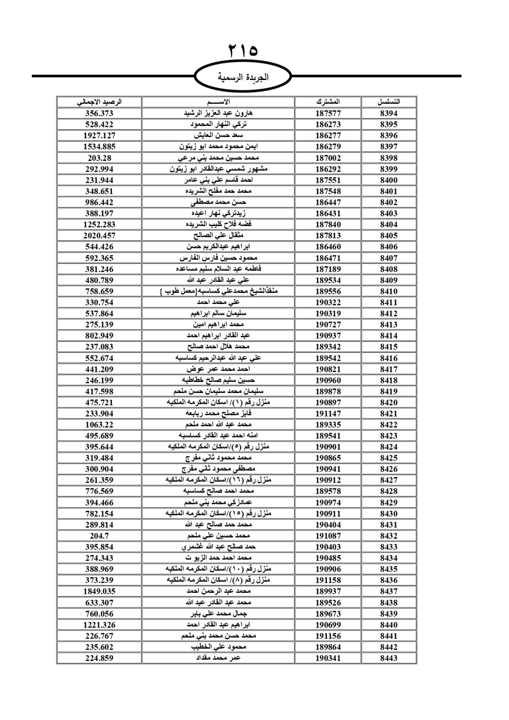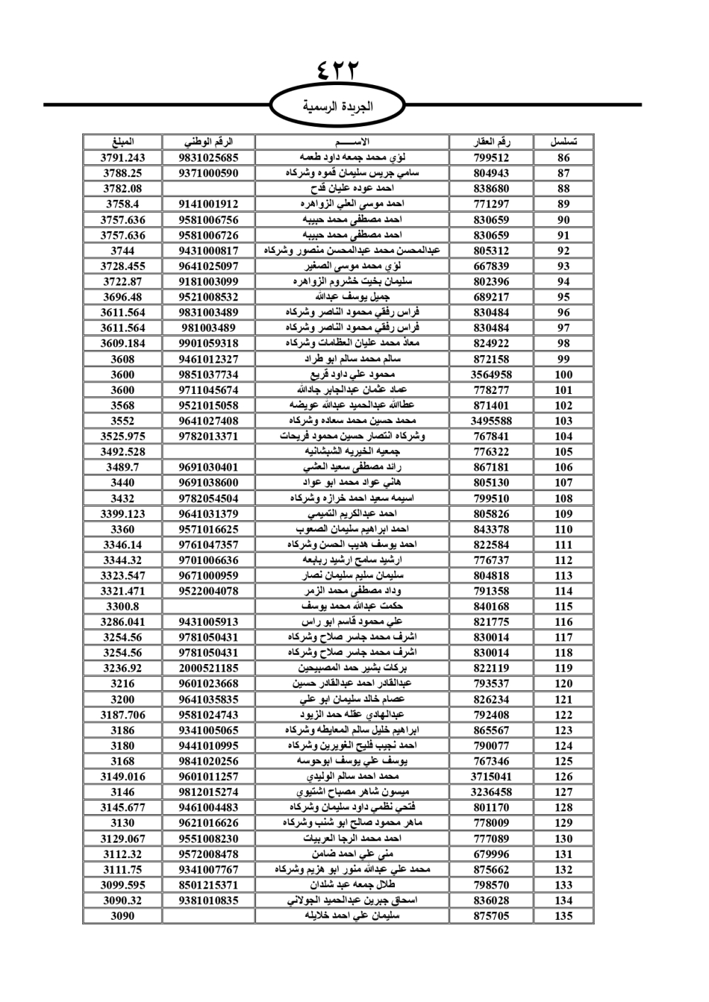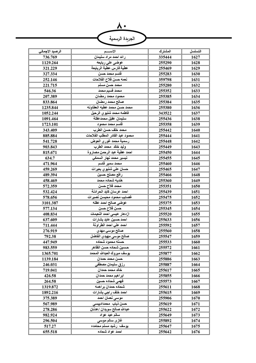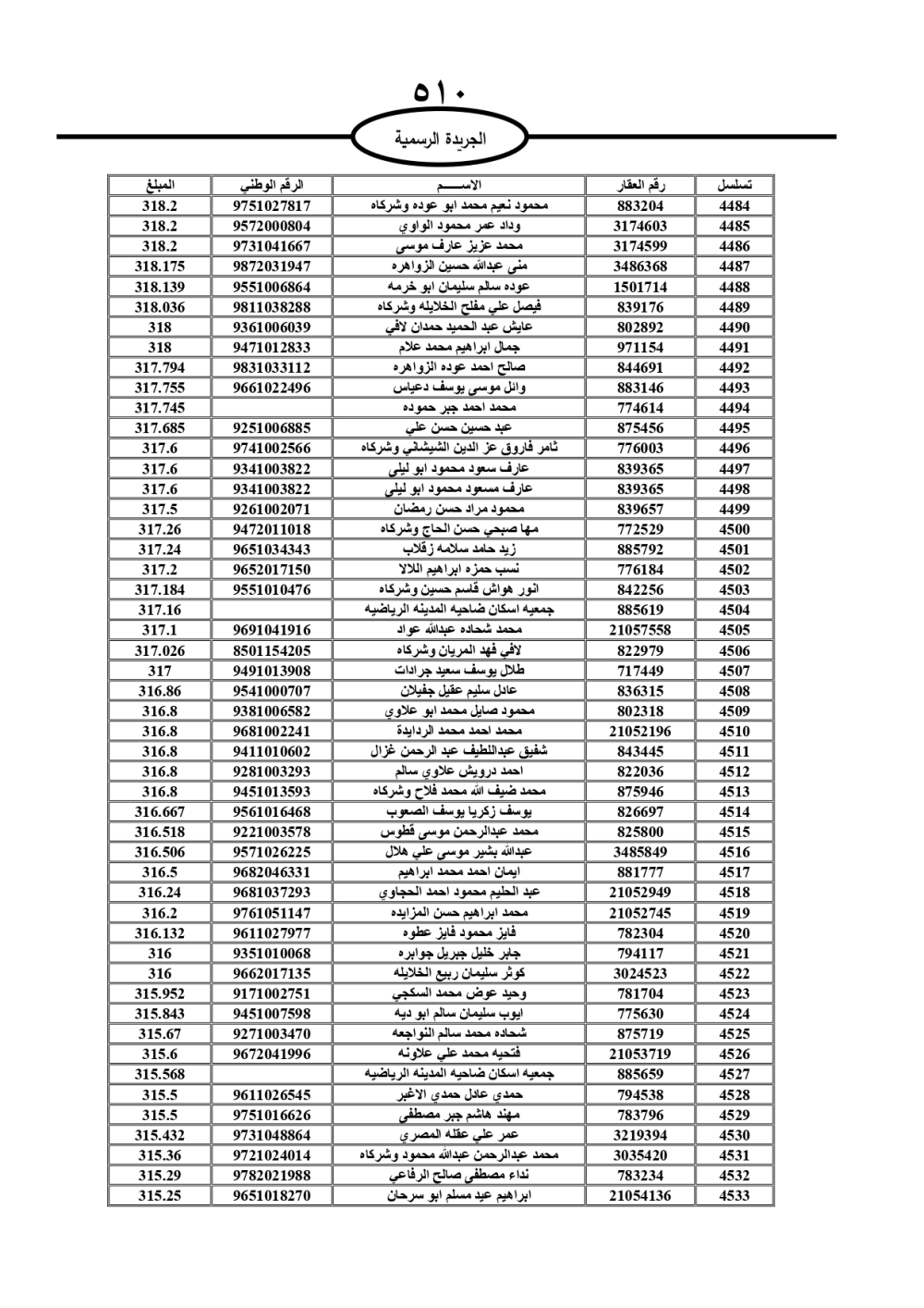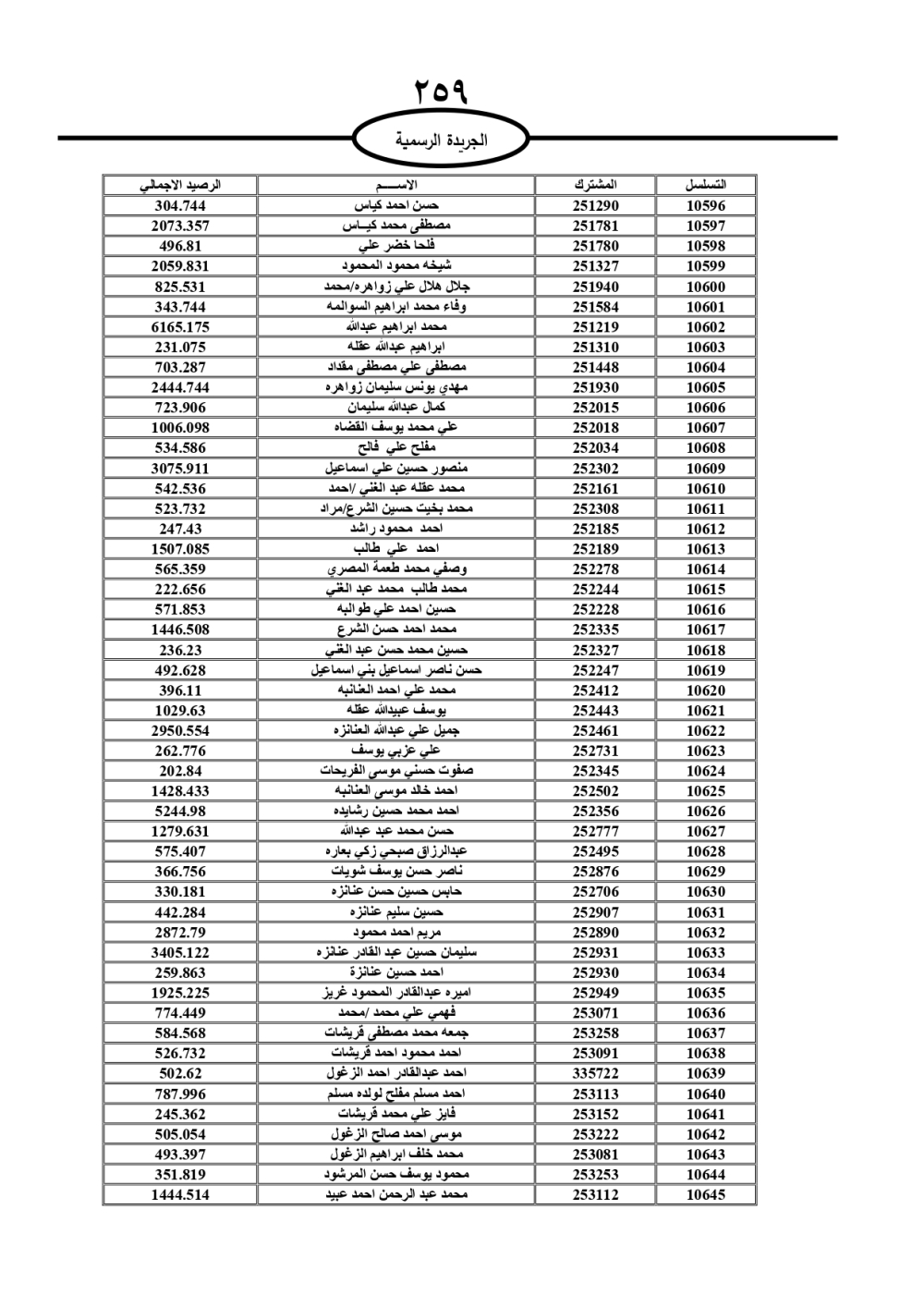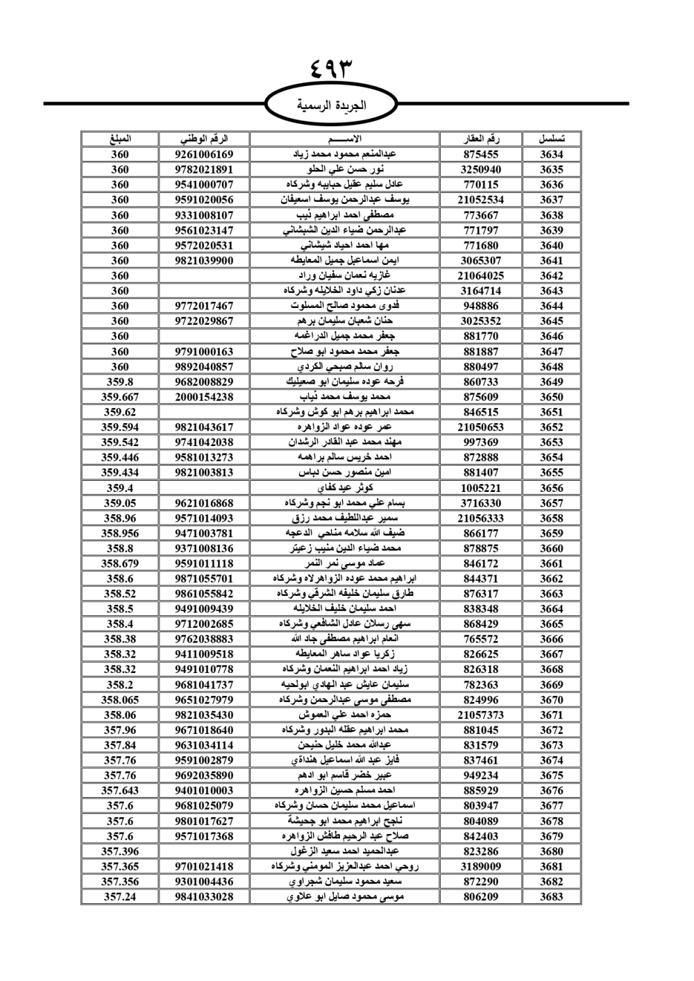 دعت سلطة المياه وبلدية الزرقاء، عشرات آلاف الأردنيين الواردة أسماؤهم بالكشوفات المرفقة، إلى ضرورة مراجعتها لتسوية أوضاعهم المالية كونه ترتب عليهم ذمم مالية، وذلك لتجنب الحجز على الأموال المنقولة وغير المنقولة بعد انقضاء 60 يوما من تاريخ النشر، علما أنه تم نشر هذه الأسماء في الجريدة الرسمية بتاريخ 16/2/2025.