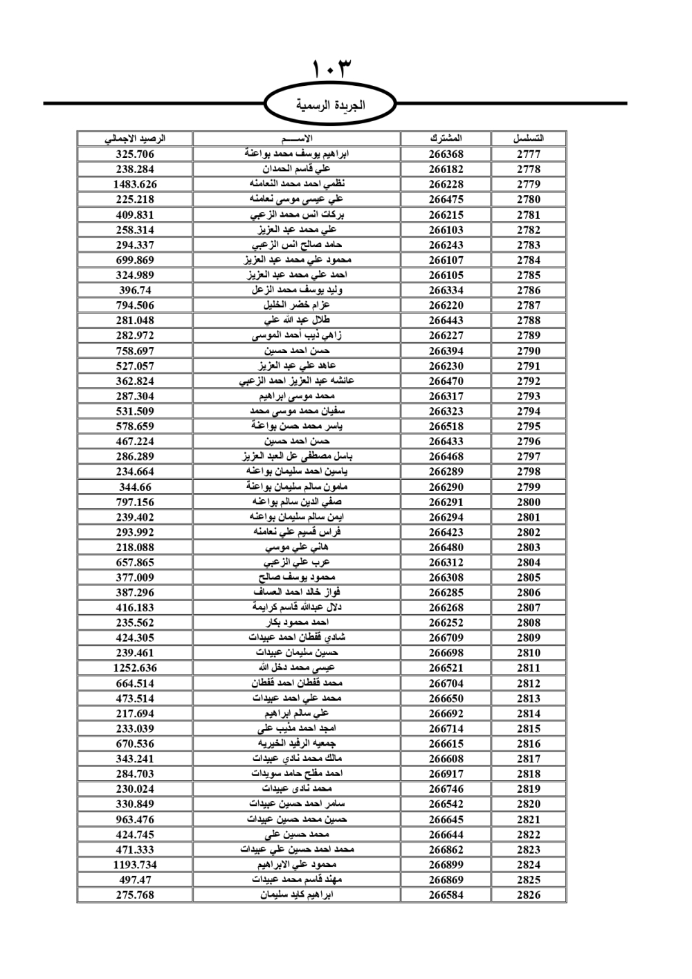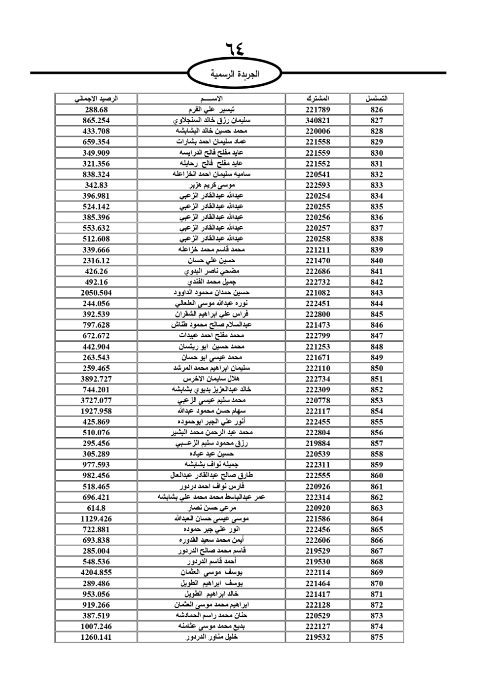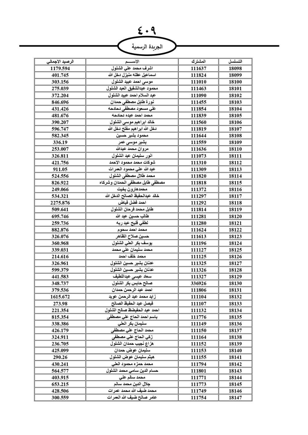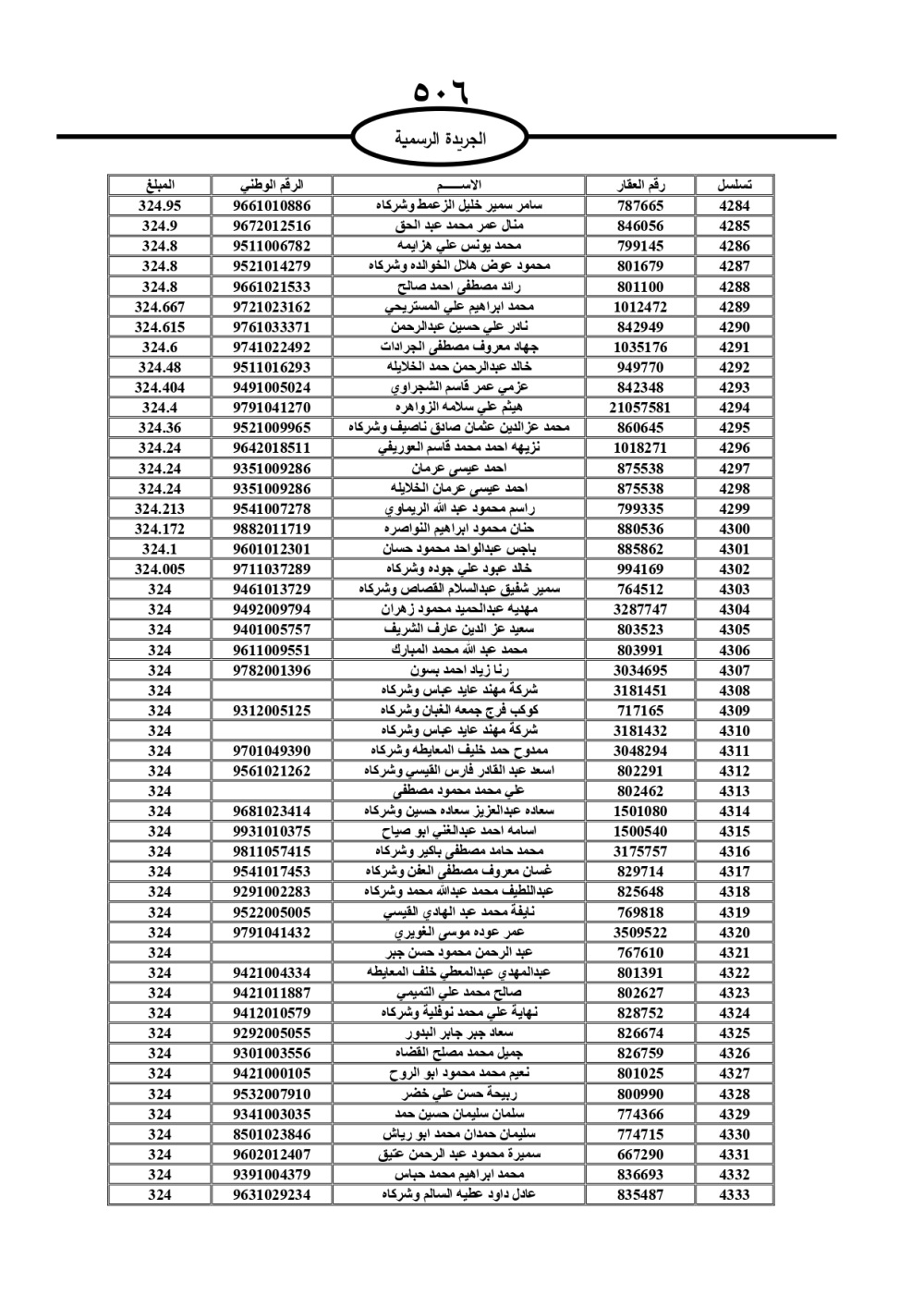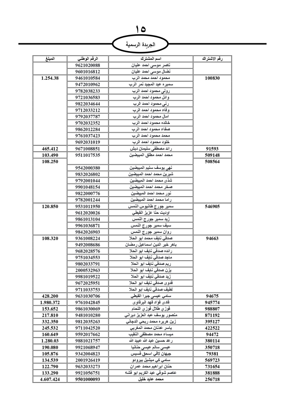 دعت سلطة المياه وبلدية الزرقاء، عشرات آلاف الأردنيين الواردة أسماؤهم بالكشوفات المرفقة، إلى ضرورة مراجعتها لتسوية أوضاعهم المالية كونه ترتب عليهم ذمم مالية، وذلك لتجنب الحجز على الأموال المنقولة وغير المنقولة بعد انقضاء 60 يوما من تاريخ النشر، علما أنه تم نشر هذه الأسماء في الجريدة الرسمية بتاريخ 16/2/2025.