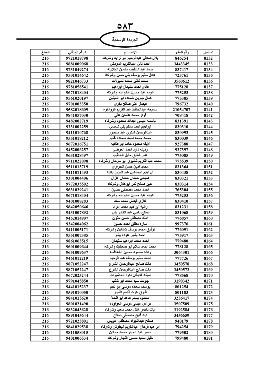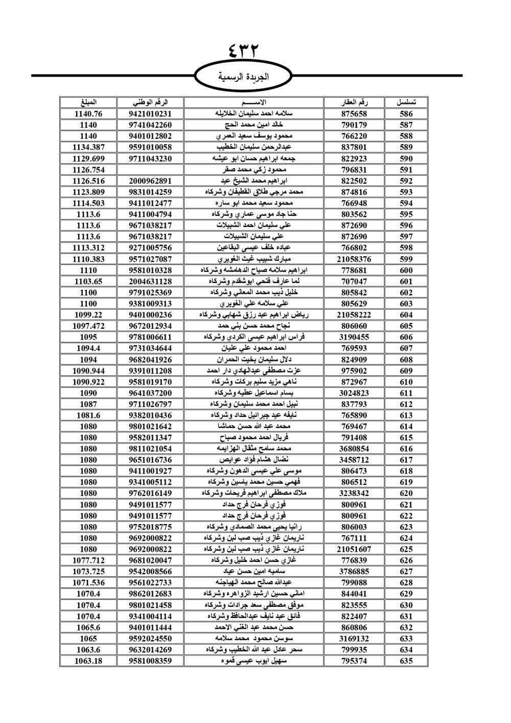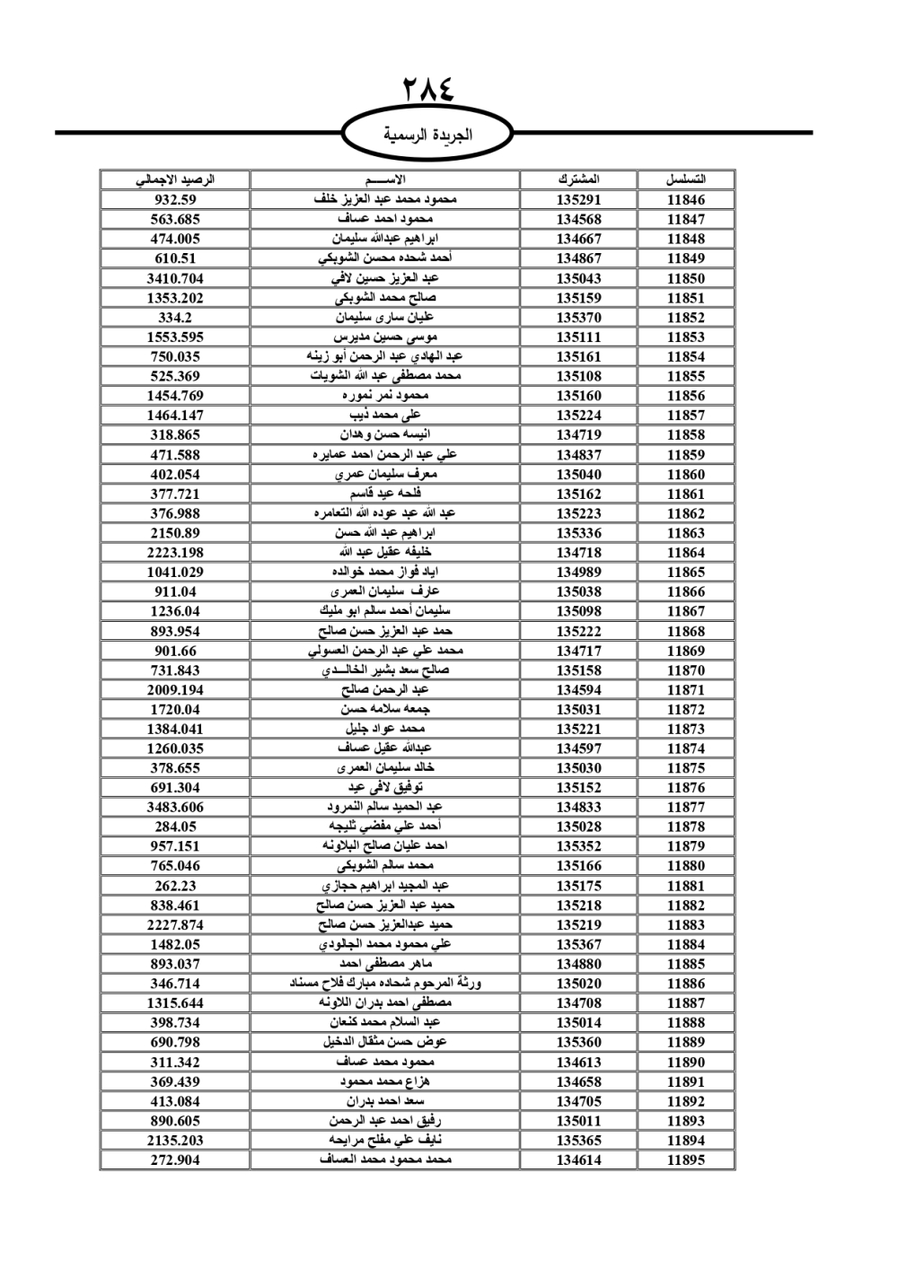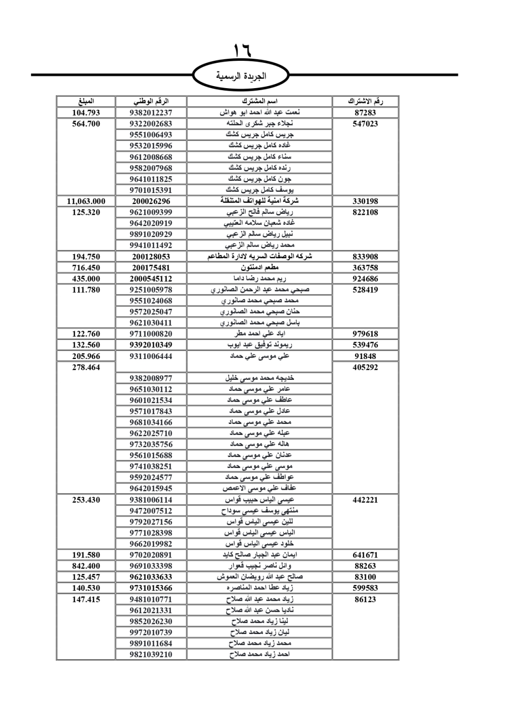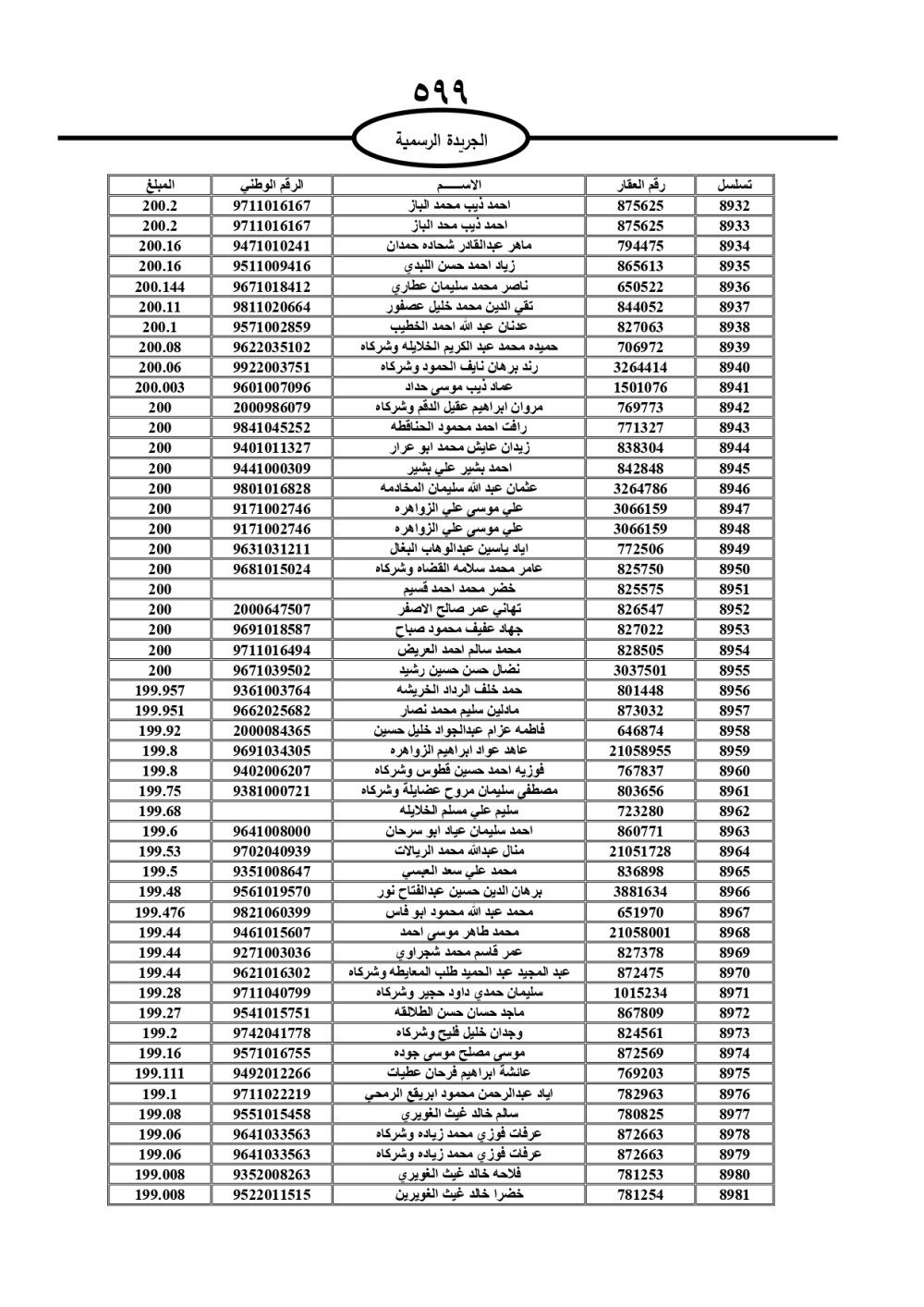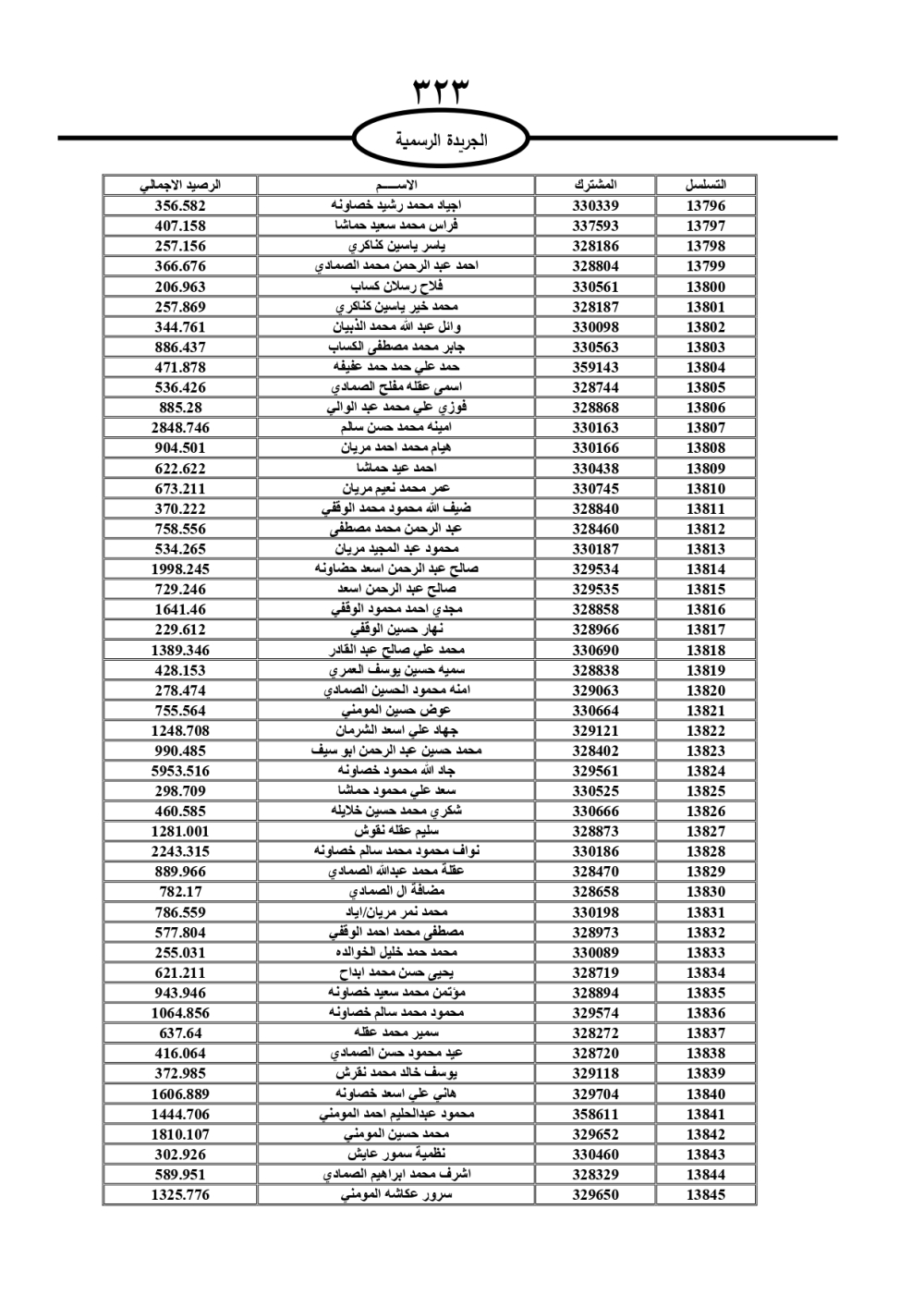 دعت سلطة المياه وبلدية الزرقاء، عشرات آلاف الأردنيين الواردة أسماؤهم بالكشوفات المرفقة، إلى ضرورة مراجعتها لتسوية أوضاعهم المالية كونه ترتب عليهم ذمم مالية، وذلك لتجنب الحجز على الأموال المنقولة وغير المنقولة بعد انقضاء 60 يوما من تاريخ النشر، علما أنه تم نشر هذه الأسماء في الجريدة الرسمية بتاريخ 16/2/2025.
