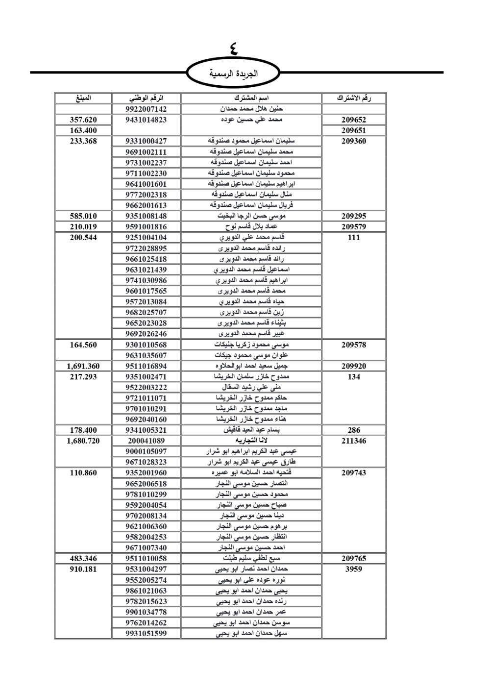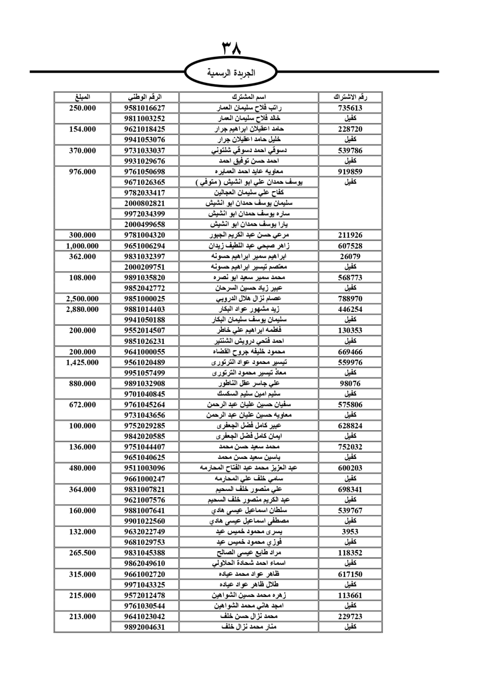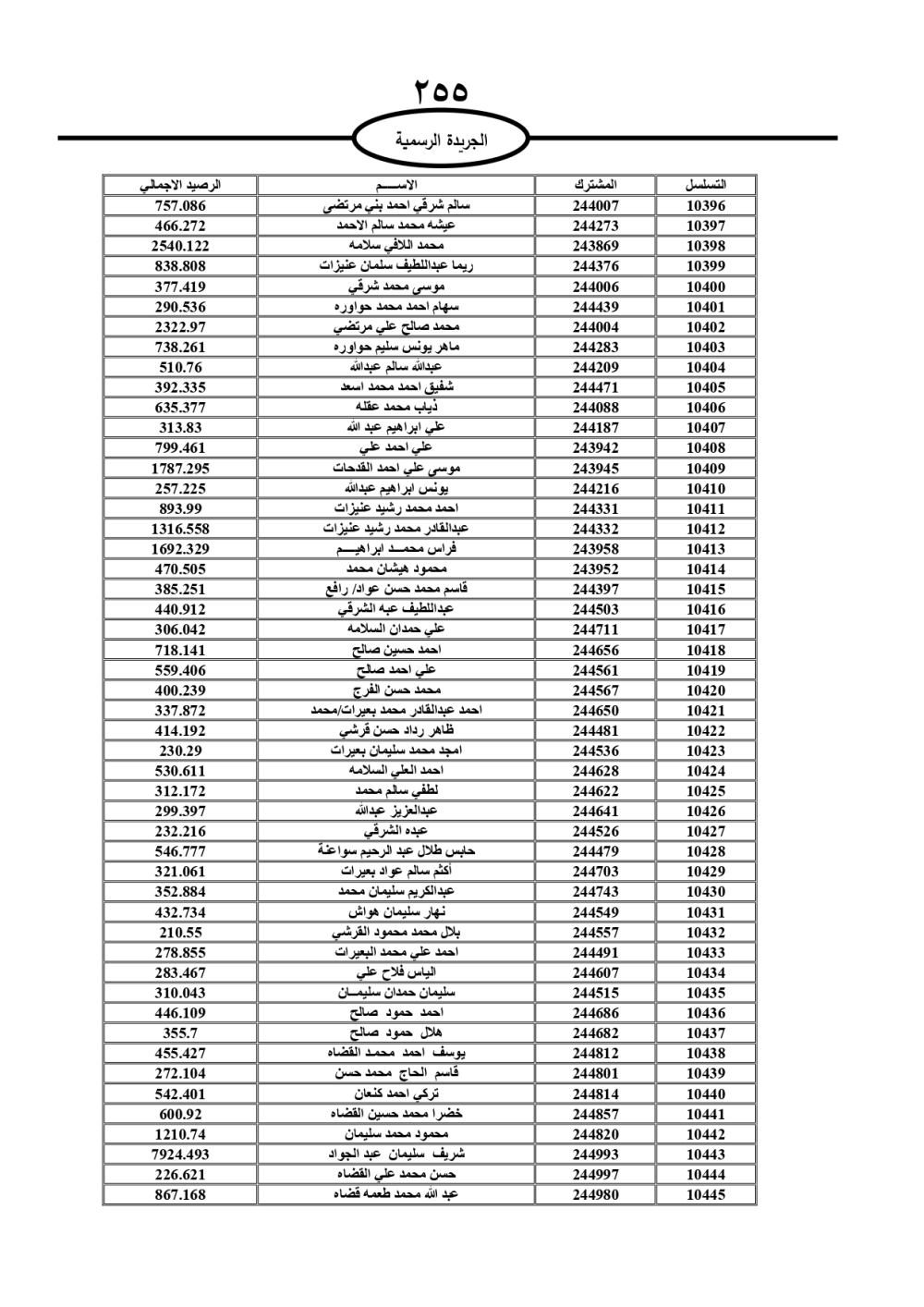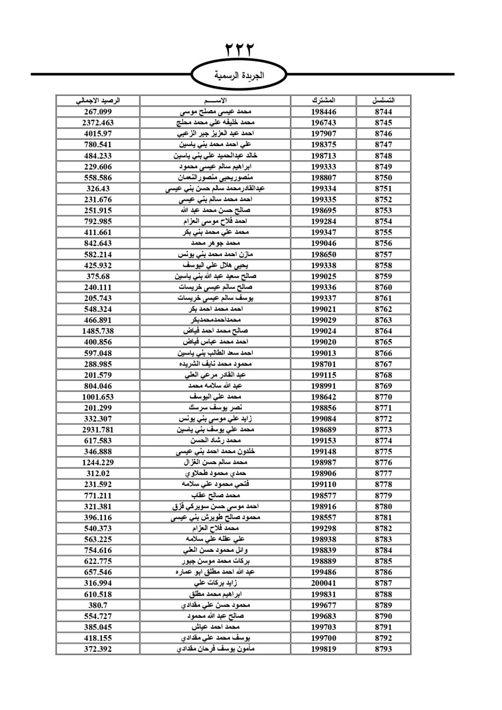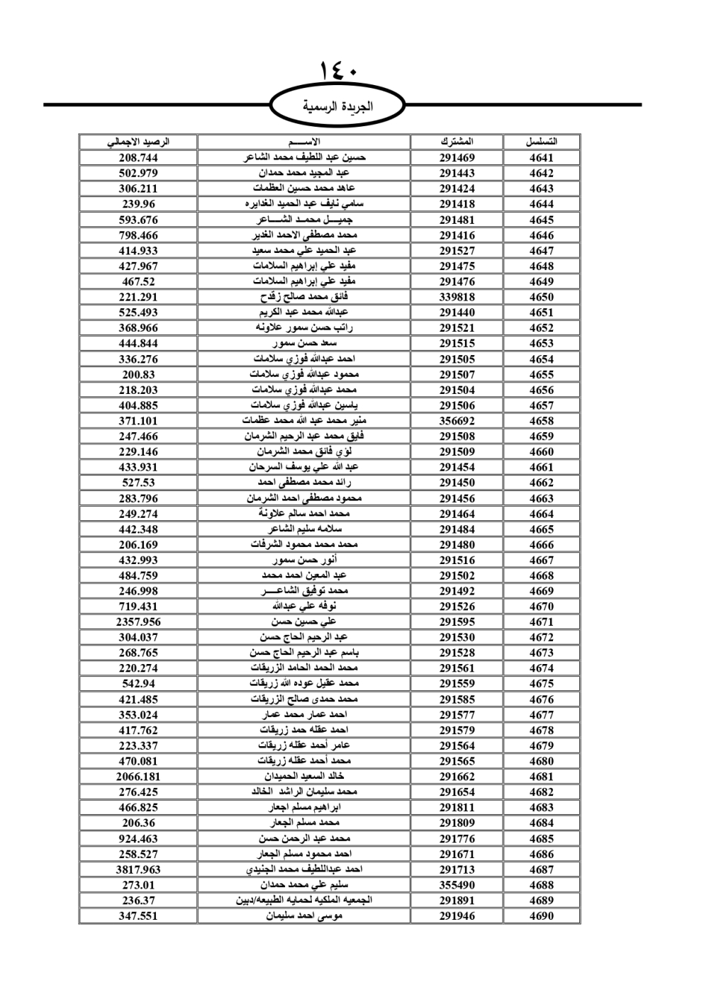 دعت سلطة المياه وبلدية الزرقاء، عشرات آلاف الأردنيين الواردة أسماؤهم بالكشوفات المرفقة، إلى ضرورة مراجعتها لتسوية أوضاعهم المالية كونه ترتب عليهم ذمم مالية، وذلك لتجنب الحجز على الأموال المنقولة وغير المنقولة بعد انقضاء 60 يوما من تاريخ النشر، علما أنه تم نشر هذه الأسماء في الجريدة الرسمية بتاريخ 16/2/2025.
