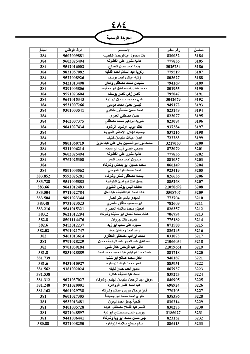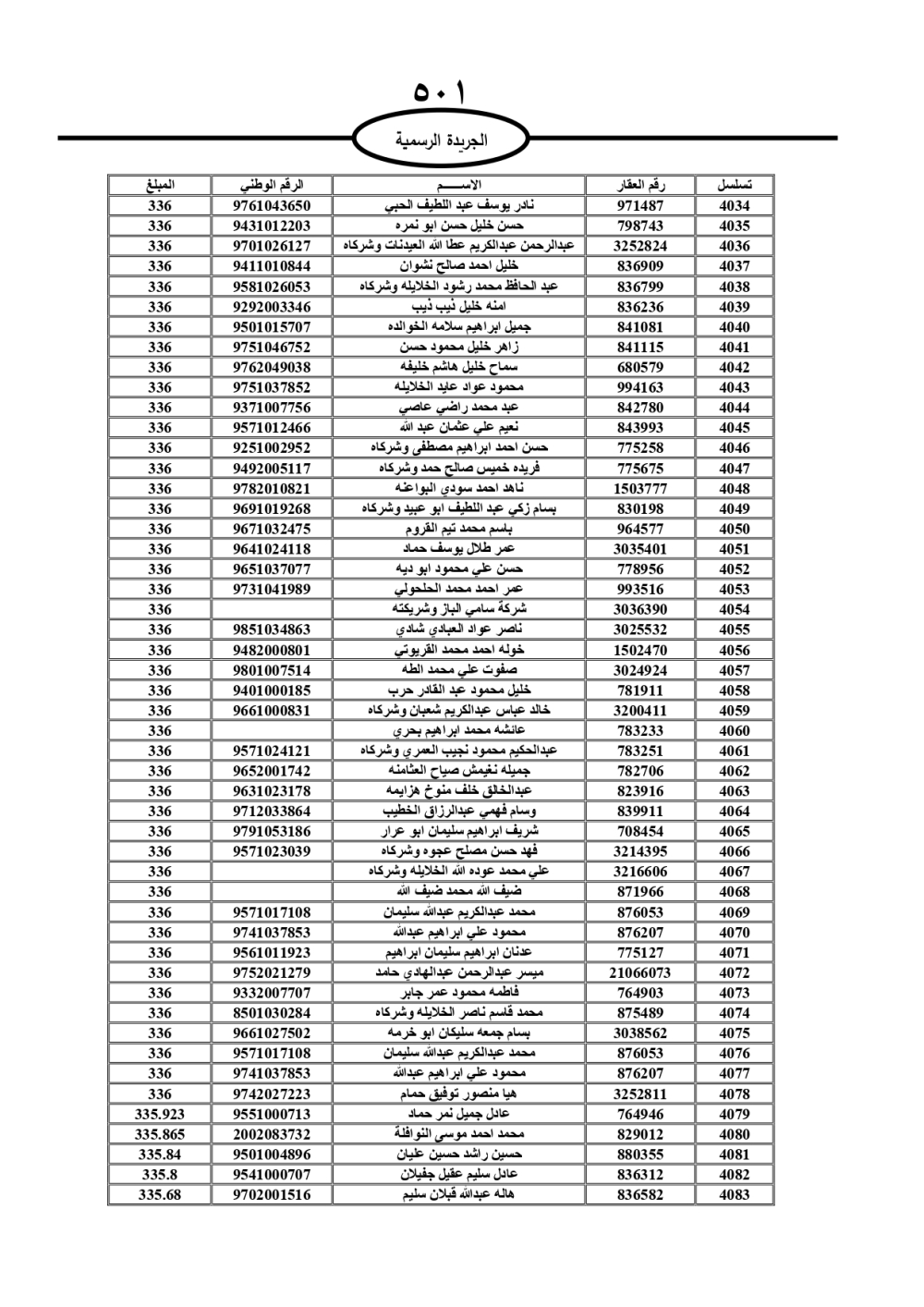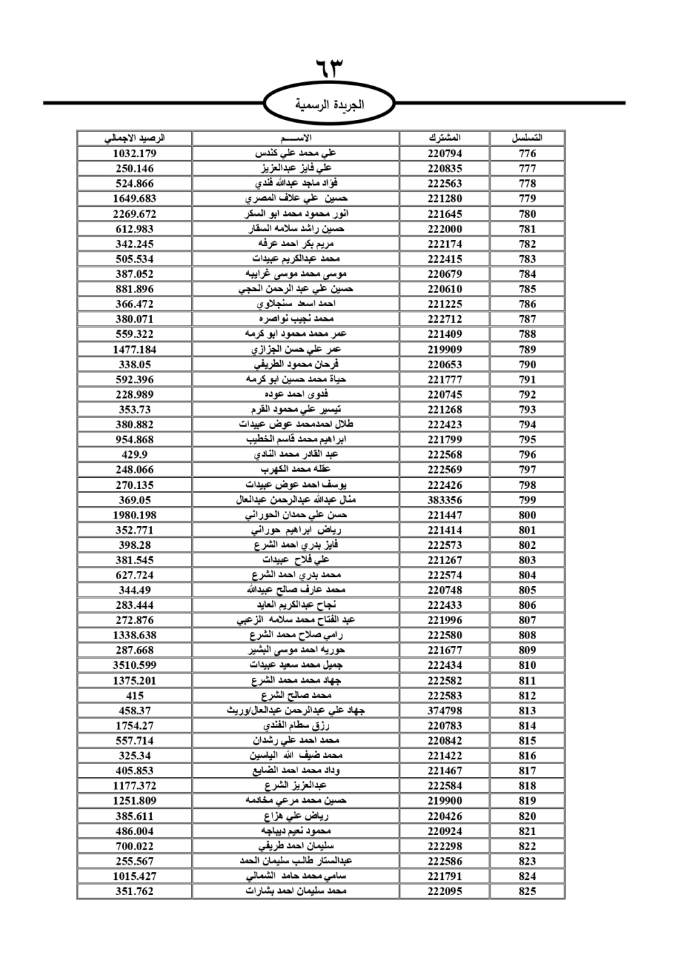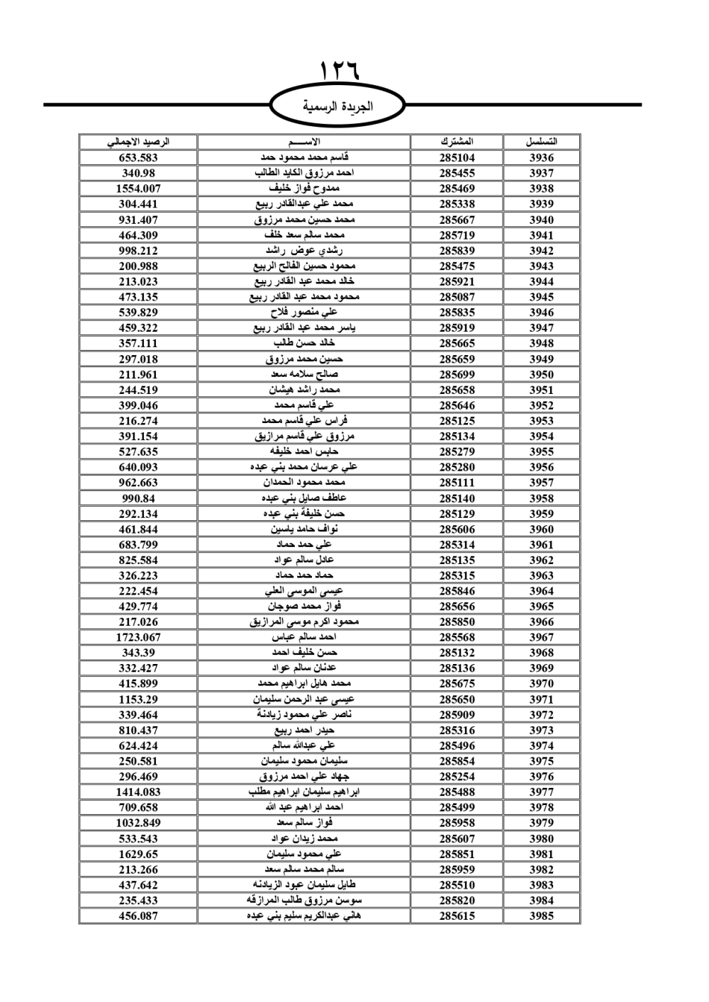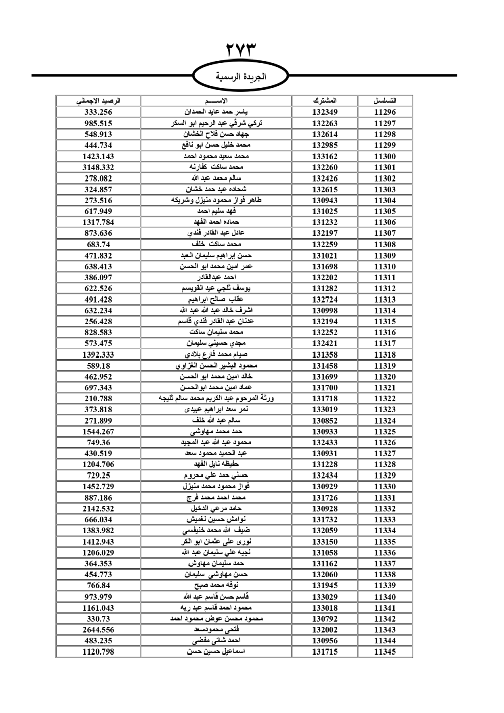 دعت سلطة المياه وبلدية الزرقاء، عشرات آلاف الأردنيين الواردة أسماؤهم بالكشوفات المرفقة، إلى ضرورة مراجعتها لتسوية أوضاعهم المالية كونه ترتب عليهم ذمم مالية، وذلك لتجنب الحجز على الأموال المنقولة وغير المنقولة بعد انقضاء 60 يوما من تاريخ النشر، علما أنه تم نشر هذه الأسماء في الجريدة الرسمية بتاريخ 16/2/2025.