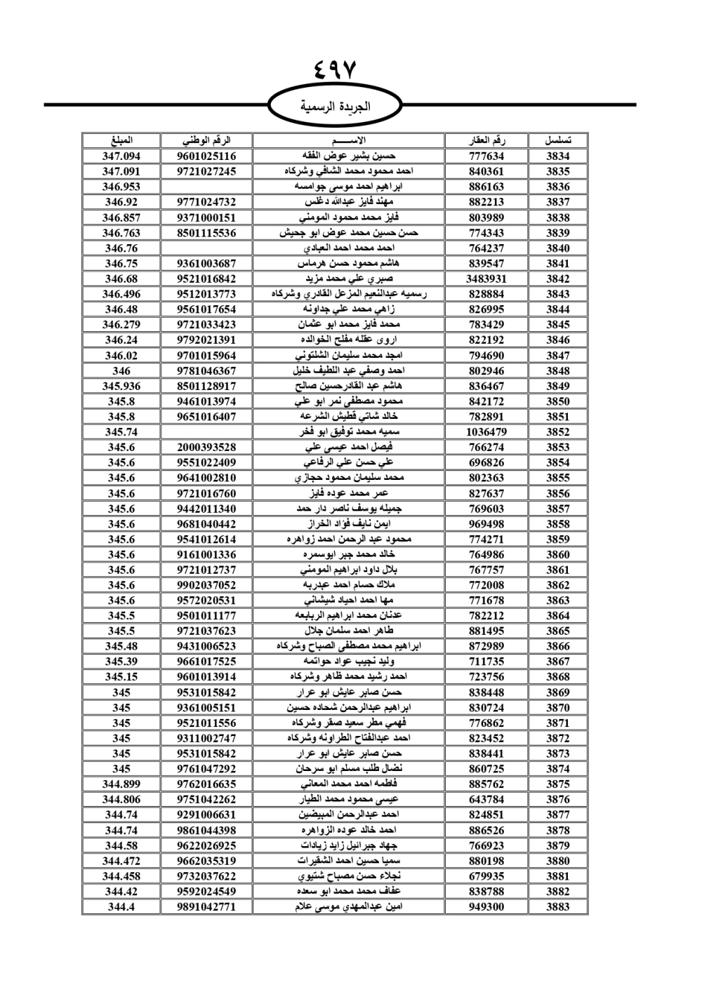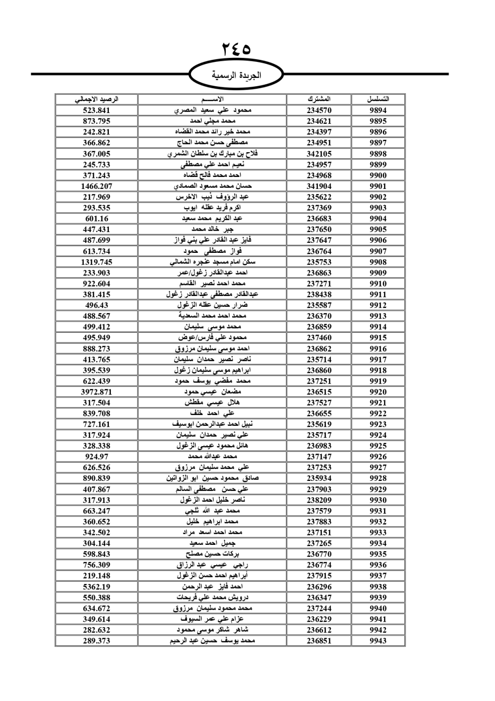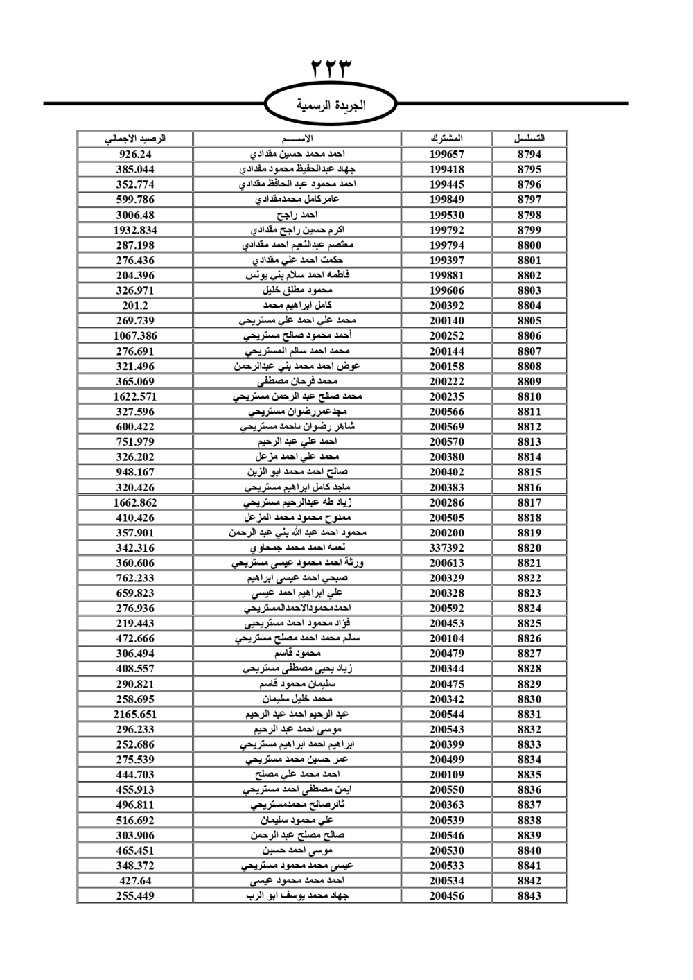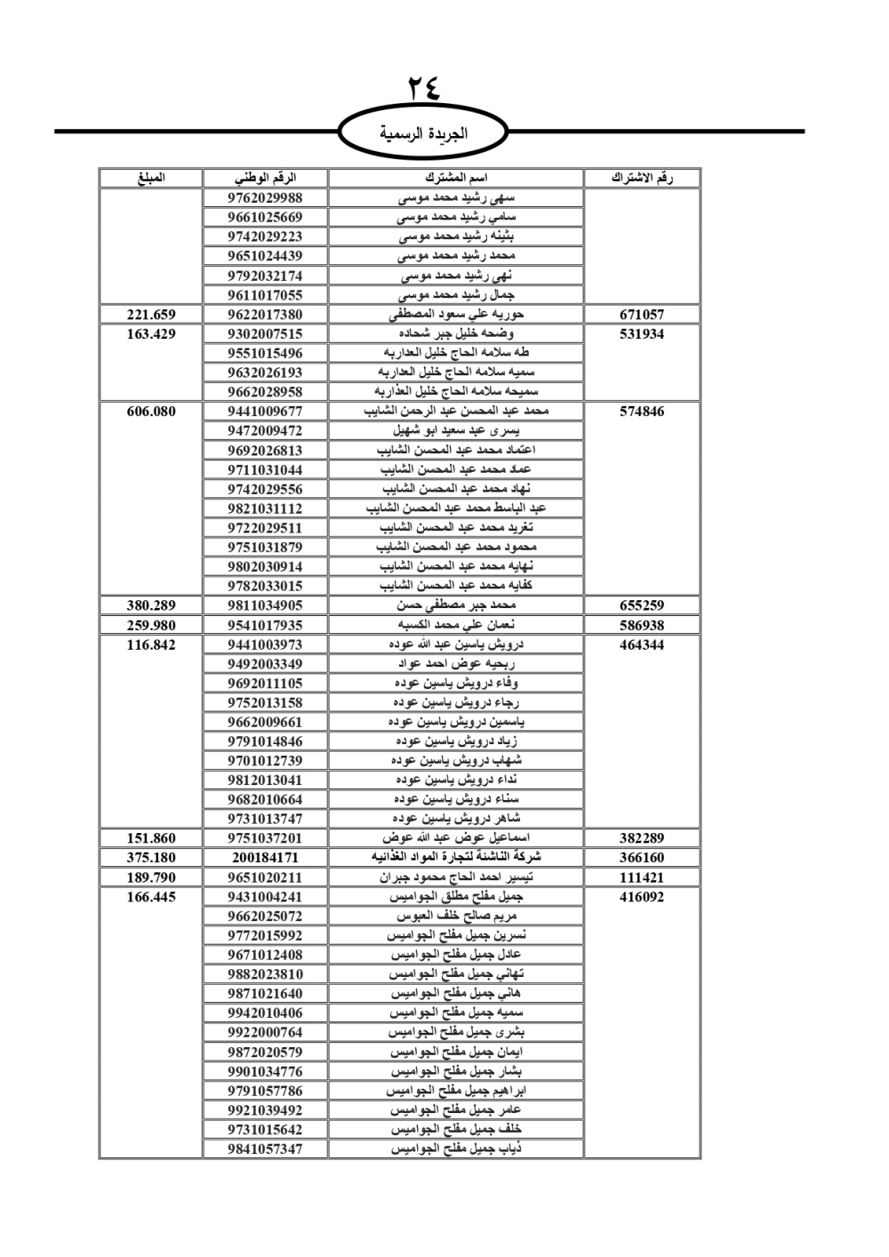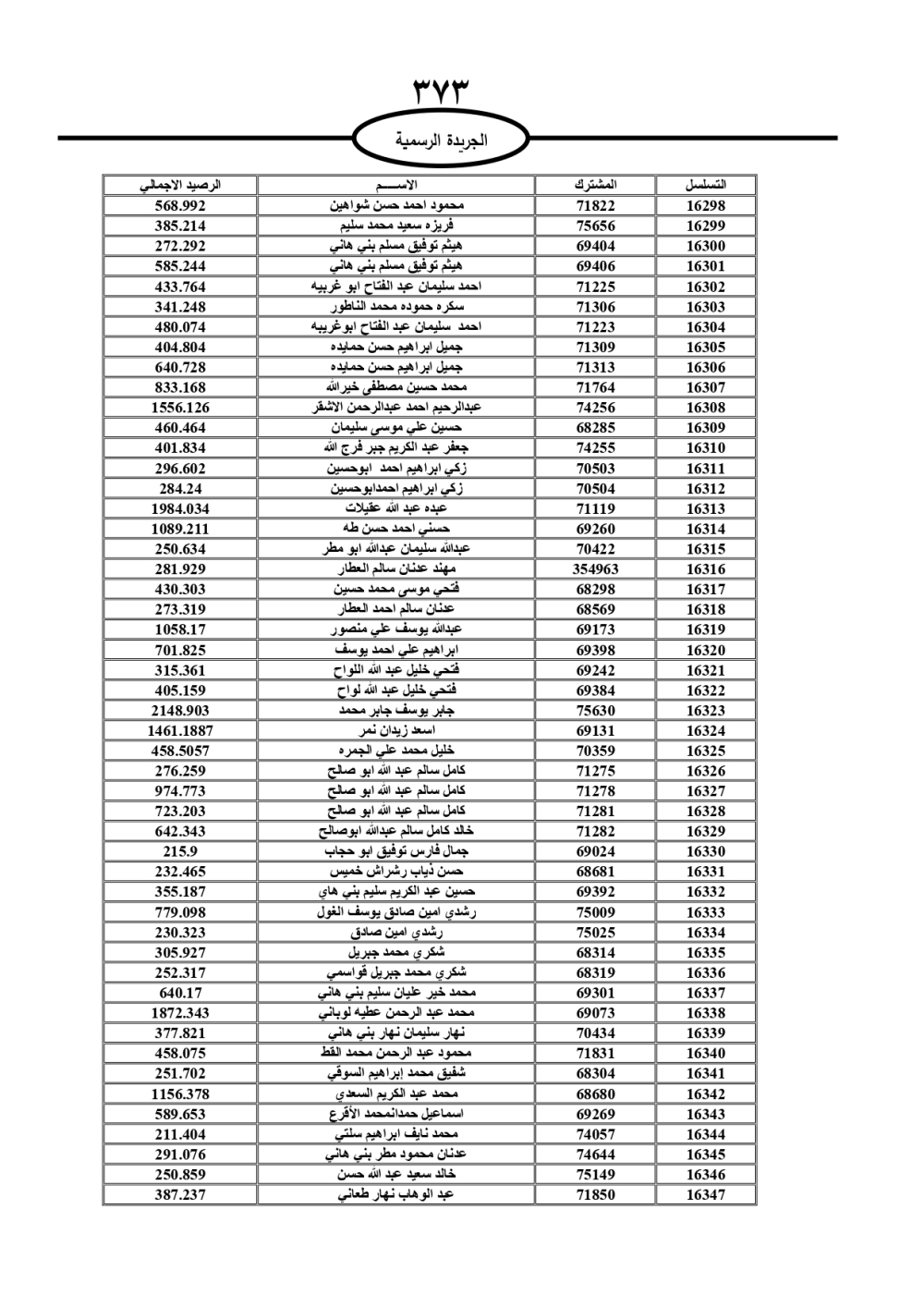 دعت سلطة المياه وبلدية الزرقاء، عشرات آلاف الأردنيين الواردة أسماؤهم بالكشوفات المرفقة، إلى ضرورة مراجعتها لتسوية أوضاعهم المالية كونه ترتب عليهم ذمم مالية، وذلك لتجنب الحجز على الأموال المنقولة وغير المنقولة بعد انقضاء 60 يوما من تاريخ النشر، علما أنه تم نشر هذه الأسماء في الجريدة الرسمية بتاريخ 16/2/2025.