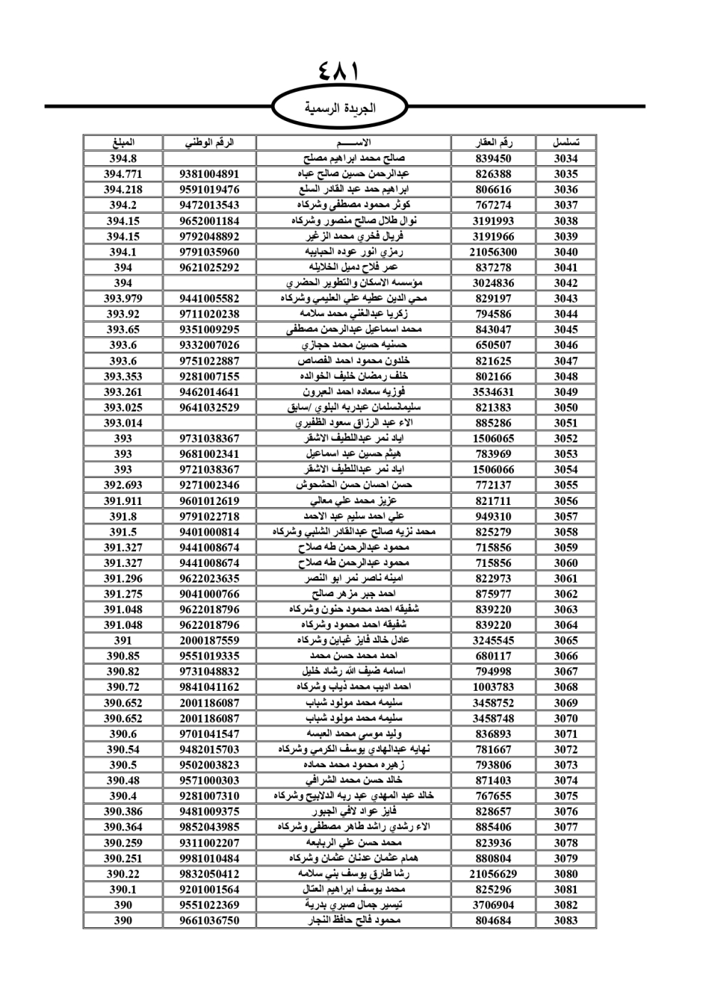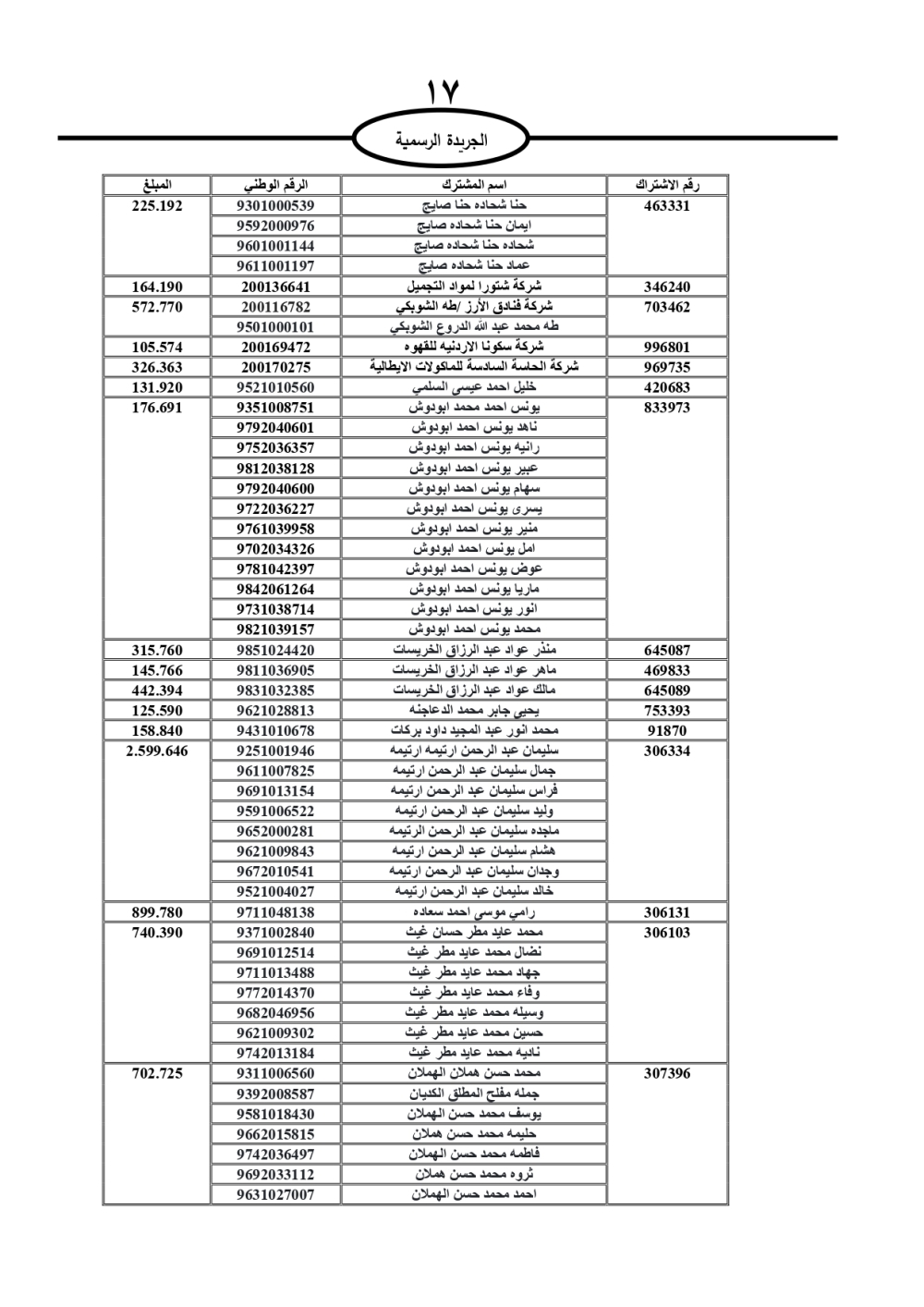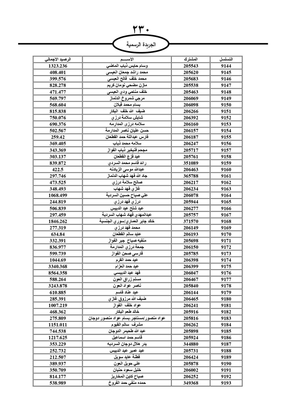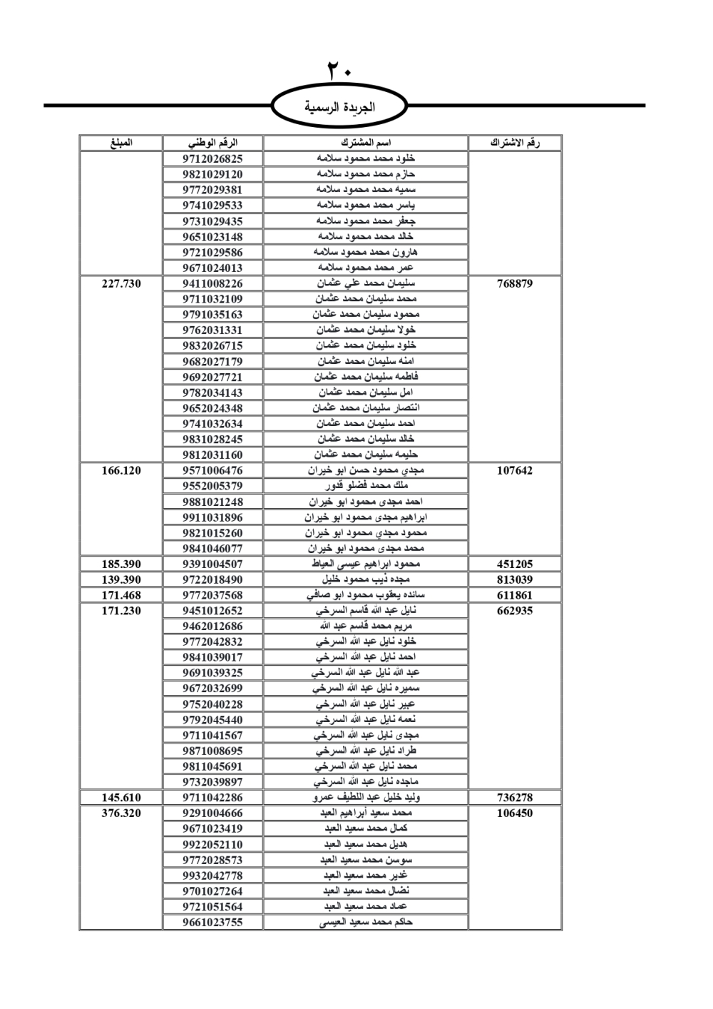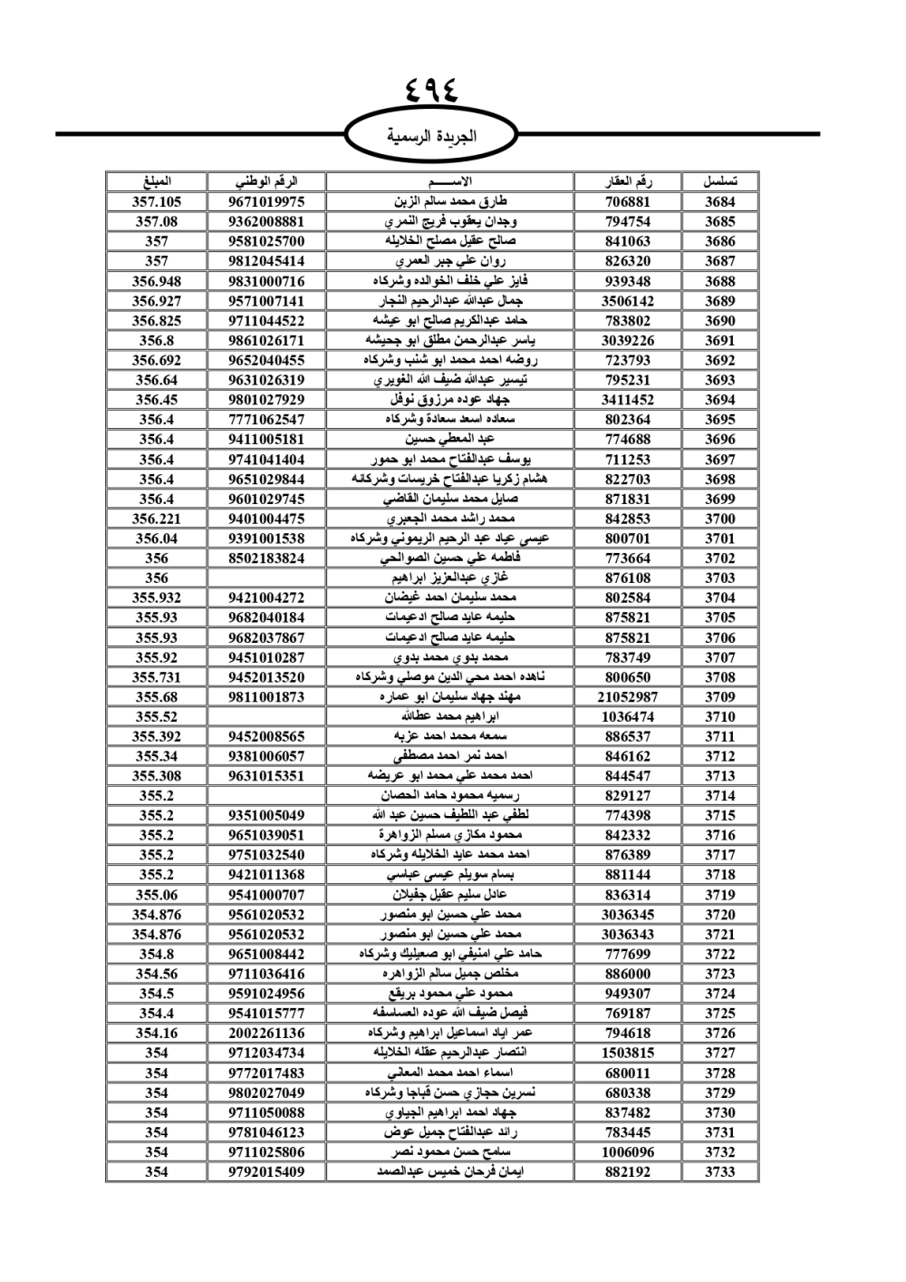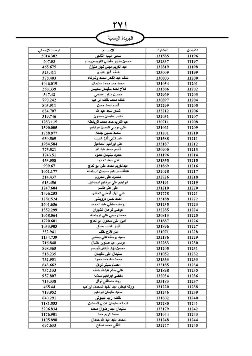 دعت سلطة المياه وبلدية الزرقاء، عشرات آلاف الأردنيين الواردة أسماؤهم بالكشوفات المرفقة، إلى ضرورة مراجعتها لتسوية أوضاعهم المالية كونه ترتب عليهم ذمم مالية، وذلك لتجنب الحجز على الأموال المنقولة وغير المنقولة بعد انقضاء 60 يوما من تاريخ النشر، علما أنه تم نشر هذه الأسماء في الجريدة الرسمية بتاريخ 16/2/2025.