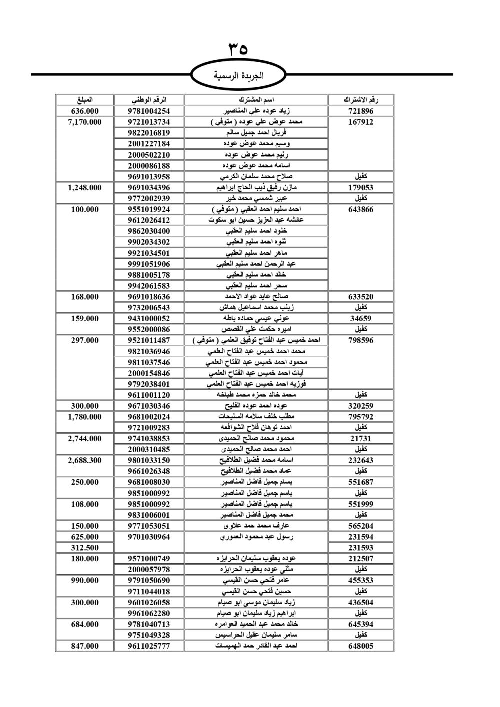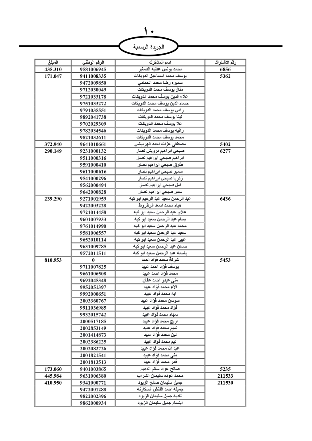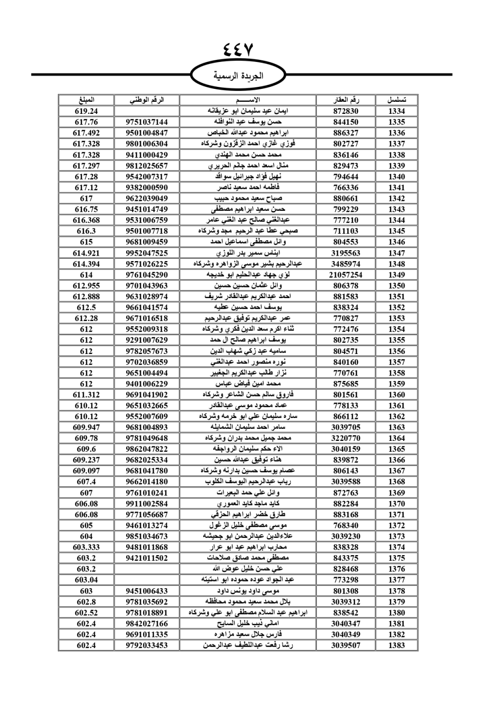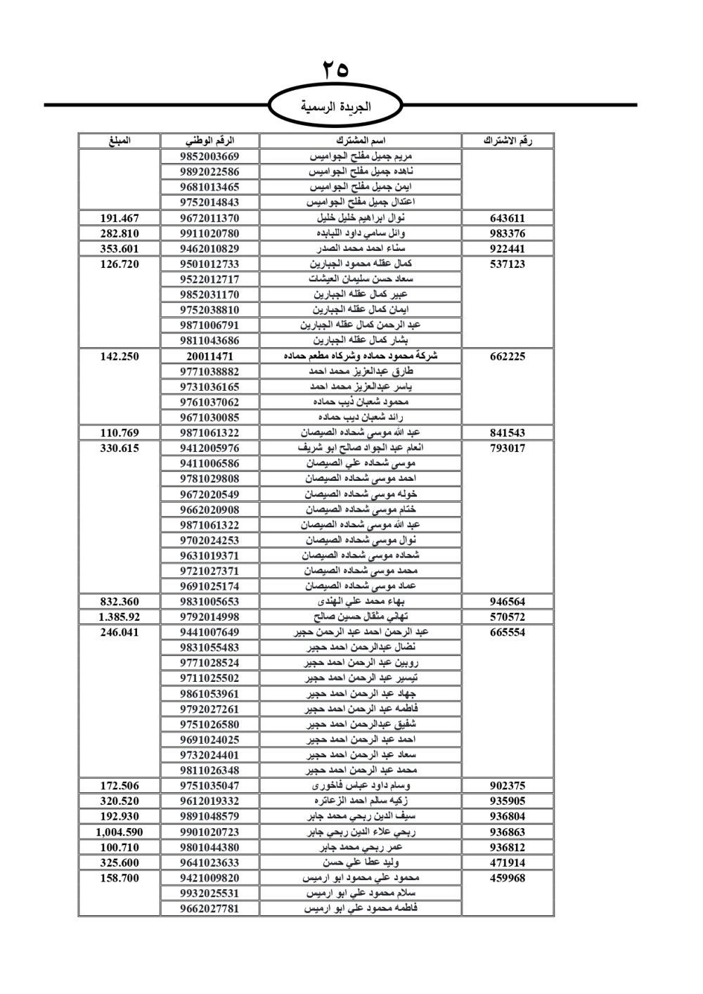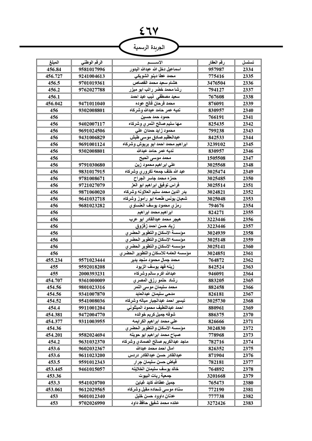 دعت سلطة المياه وبلدية الزرقاء، عشرات آلاف الأردنيين الواردة أسماؤهم بالكشوفات المرفقة، إلى ضرورة مراجعتها لتسوية أوضاعهم المالية كونه ترتب عليهم ذمم مالية، وذلك لتجنب الحجز على الأموال المنقولة وغير المنقولة بعد انقضاء 60 يوما من تاريخ النشر، علما أنه تم نشر هذه الأسماء في الجريدة الرسمية بتاريخ 16/2/2025.