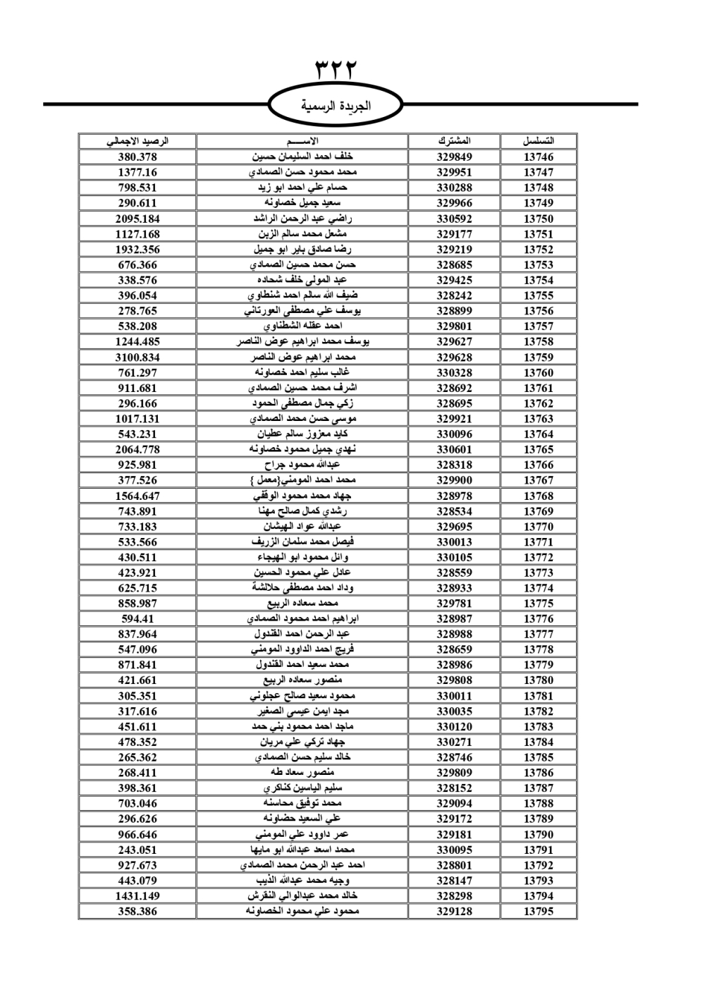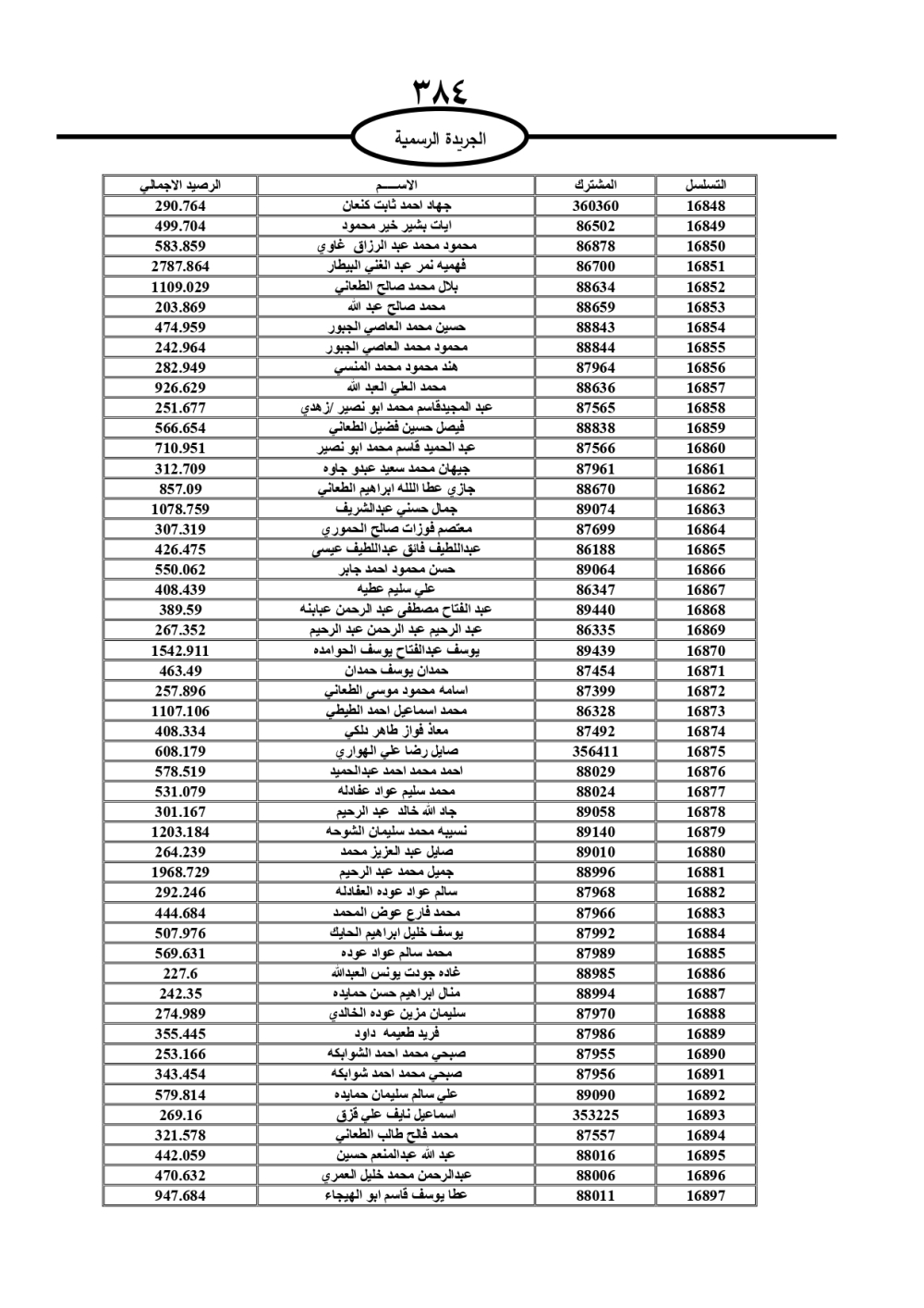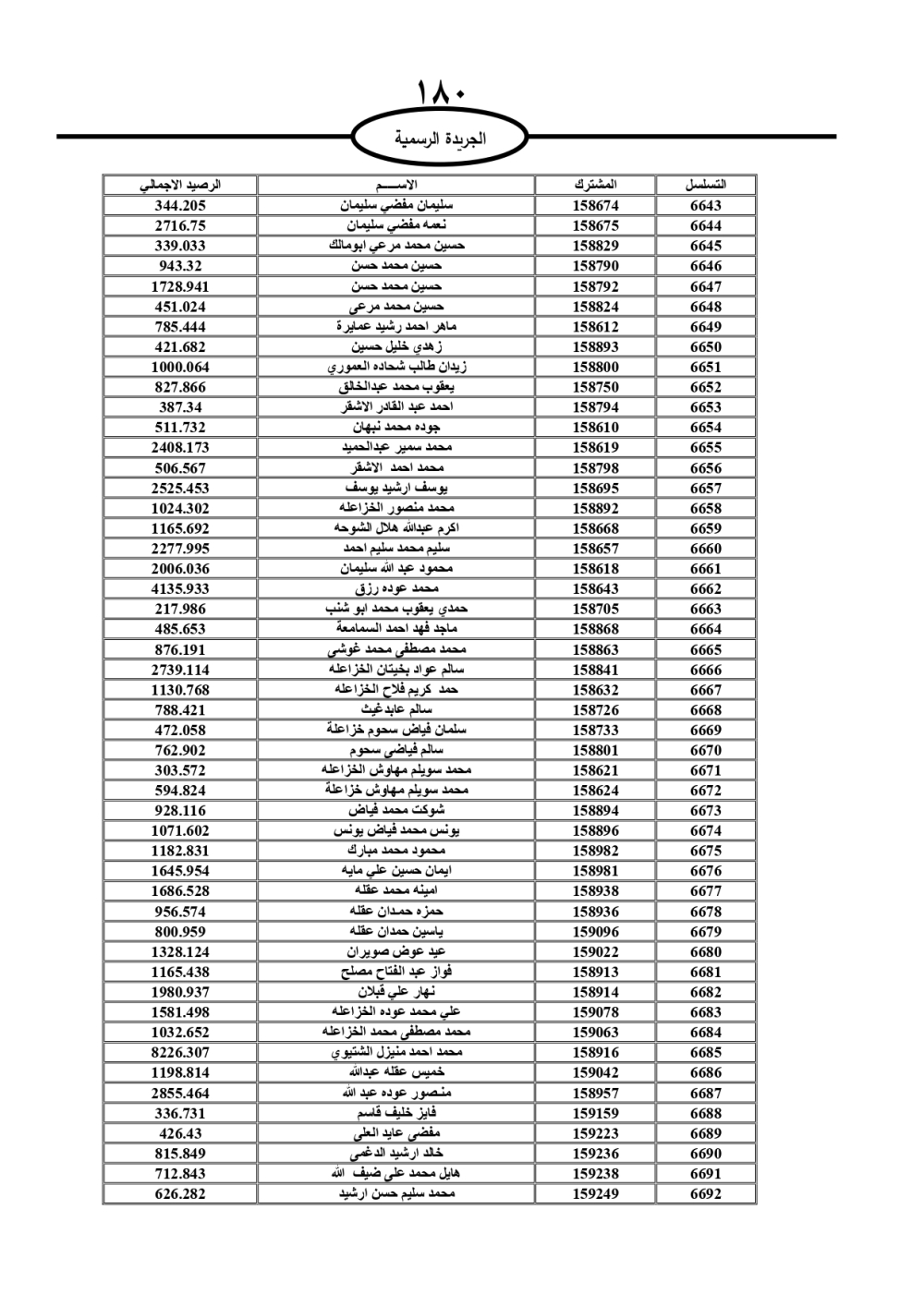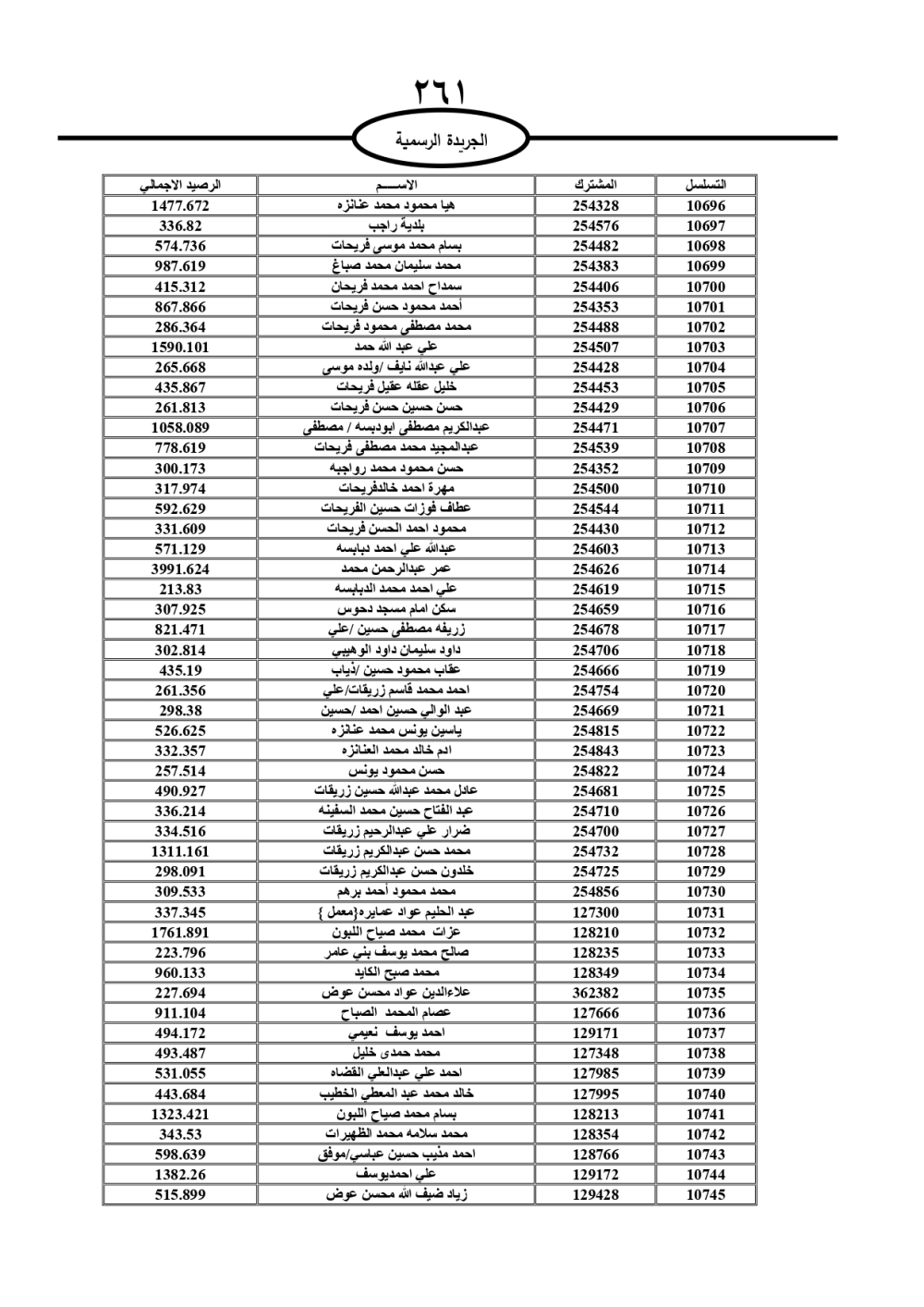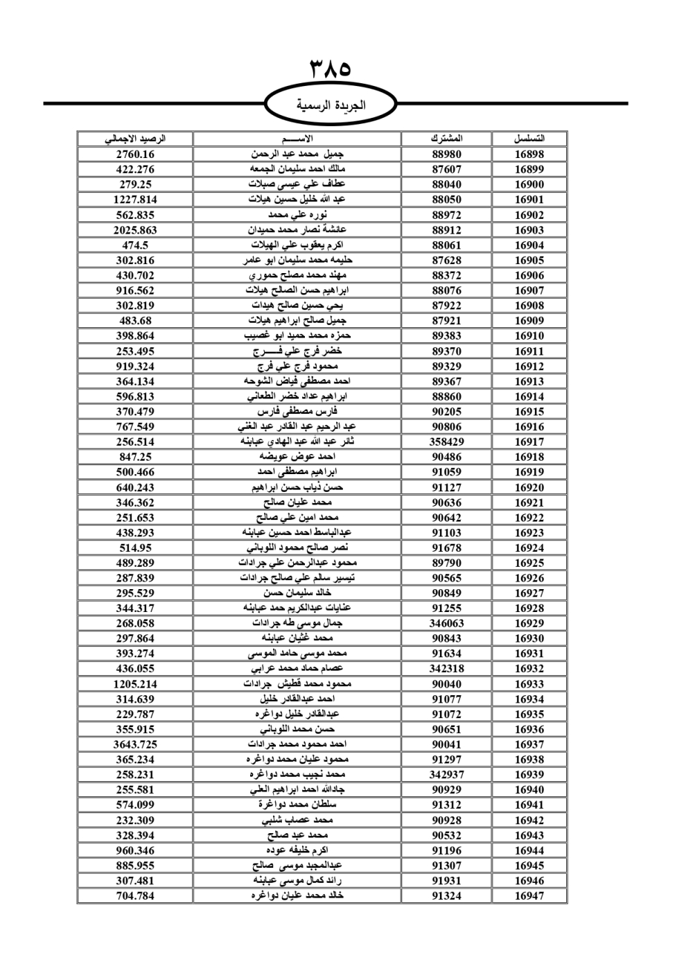 دعت سلطة المياه وبلدية الزرقاء، عشرات آلاف الأردنيين الواردة أسماؤهم بالكشوفات المرفقة، إلى ضرورة مراجعتها لتسوية أوضاعهم المالية كونه ترتب عليهم ذمم مالية، وذلك لتجنب الحجز على الأموال المنقولة وغير المنقولة بعد انقضاء 60 يوما من تاريخ النشر، علما أنه تم نشر هذه الأسماء في الجريدة الرسمية بتاريخ 16/2/2025.