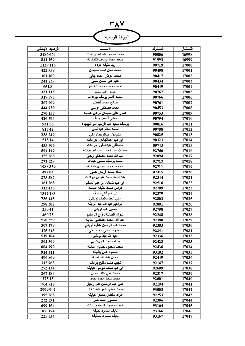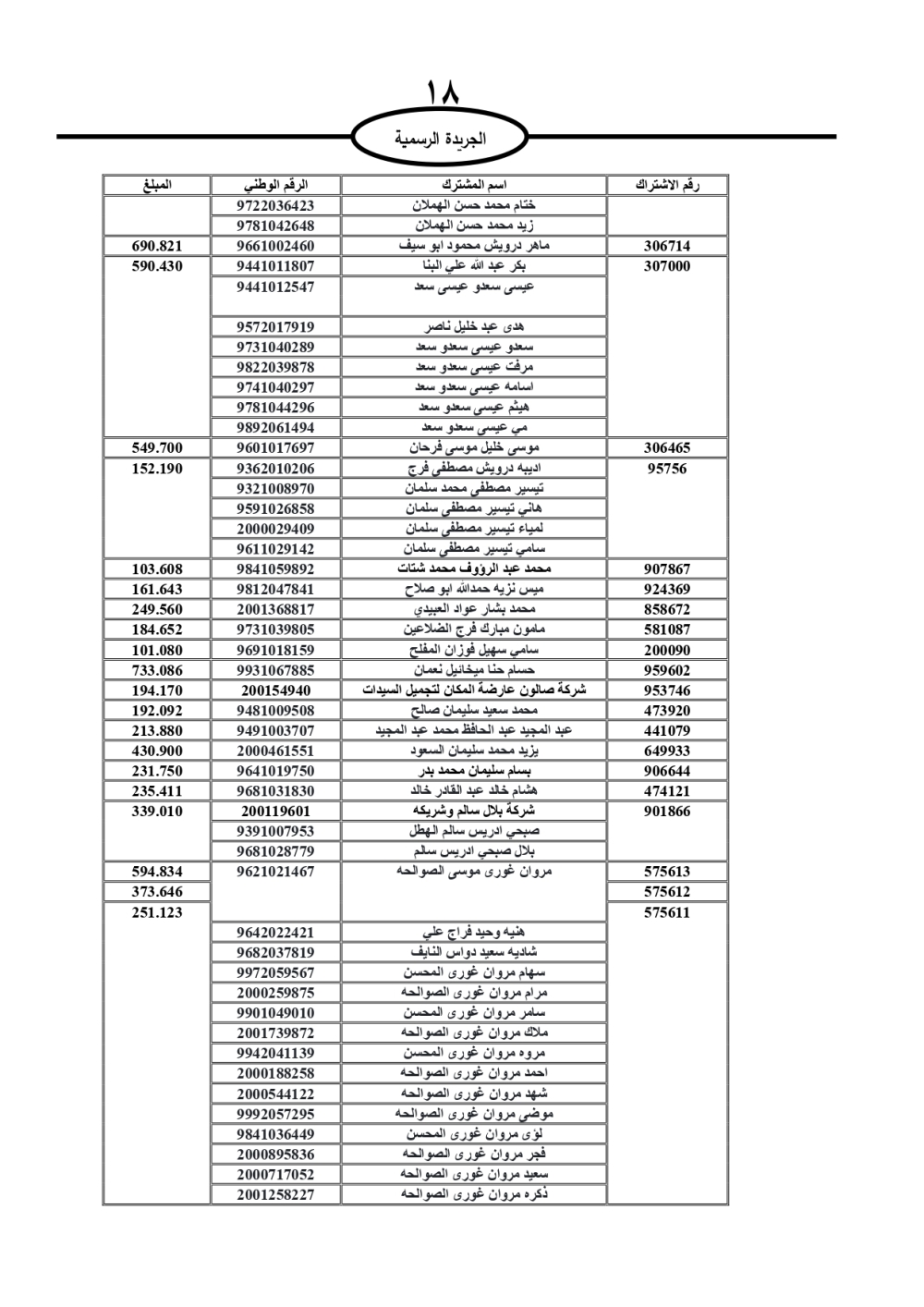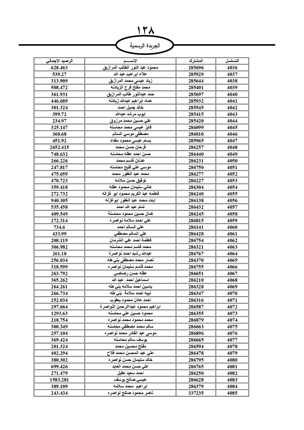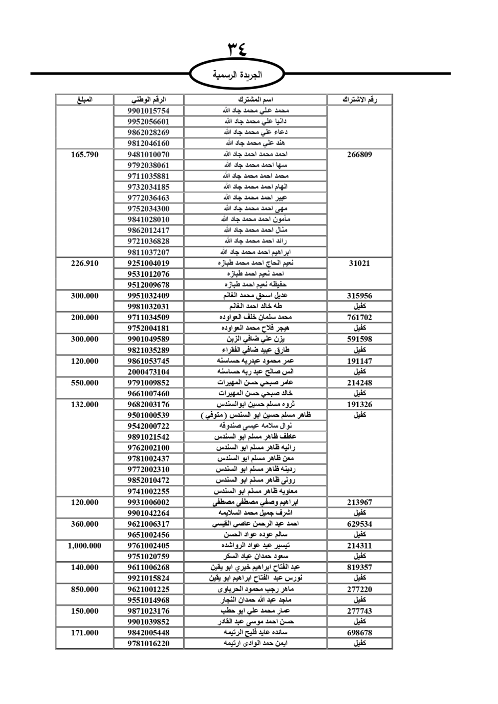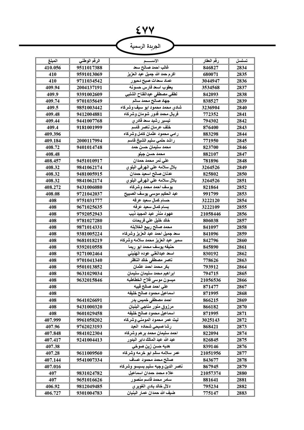 دعت سلطة المياه وبلدية الزرقاء، عشرات آلاف الأردنيين الواردة أسماؤهم بالكشوفات المرفقة، إلى ضرورة مراجعتها لتسوية أوضاعهم المالية كونه ترتب عليهم ذمم مالية، وذلك لتجنب الحجز على الأموال المنقولة وغير المنقولة بعد انقضاء 60 يوما من تاريخ النشر، علما أنه تم نشر هذه الأسماء في الجريدة الرسمية بتاريخ 16/2/2025.