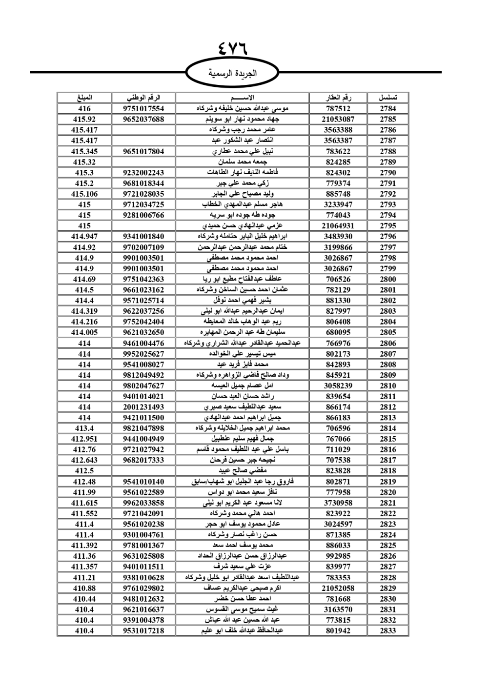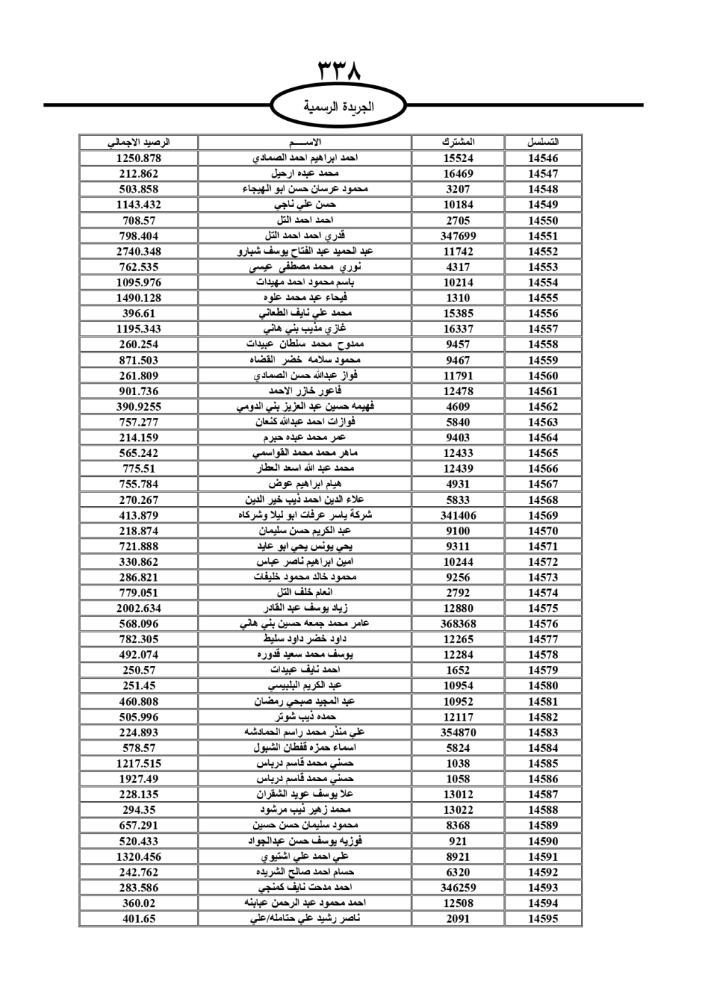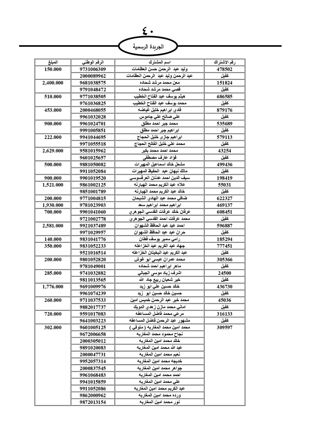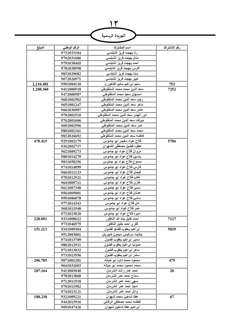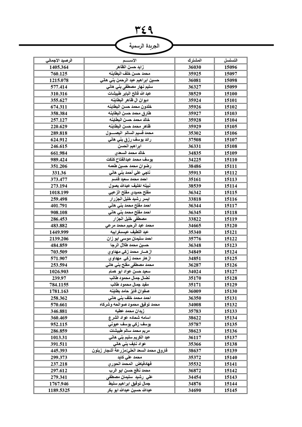 دعت سلطة المياه وبلدية الزرقاء، عشرات آلاف الأردنيين الواردة أسماؤهم بالكشوفات المرفقة، إلى ضرورة مراجعتها لتسوية أوضاعهم المالية كونه ترتب عليهم ذمم مالية، وذلك لتجنب الحجز على الأموال المنقولة وغير المنقولة بعد انقضاء 60 يوما من تاريخ النشر، علما أنه تم نشر هذه الأسماء في الجريدة الرسمية بتاريخ 16/2/2025.