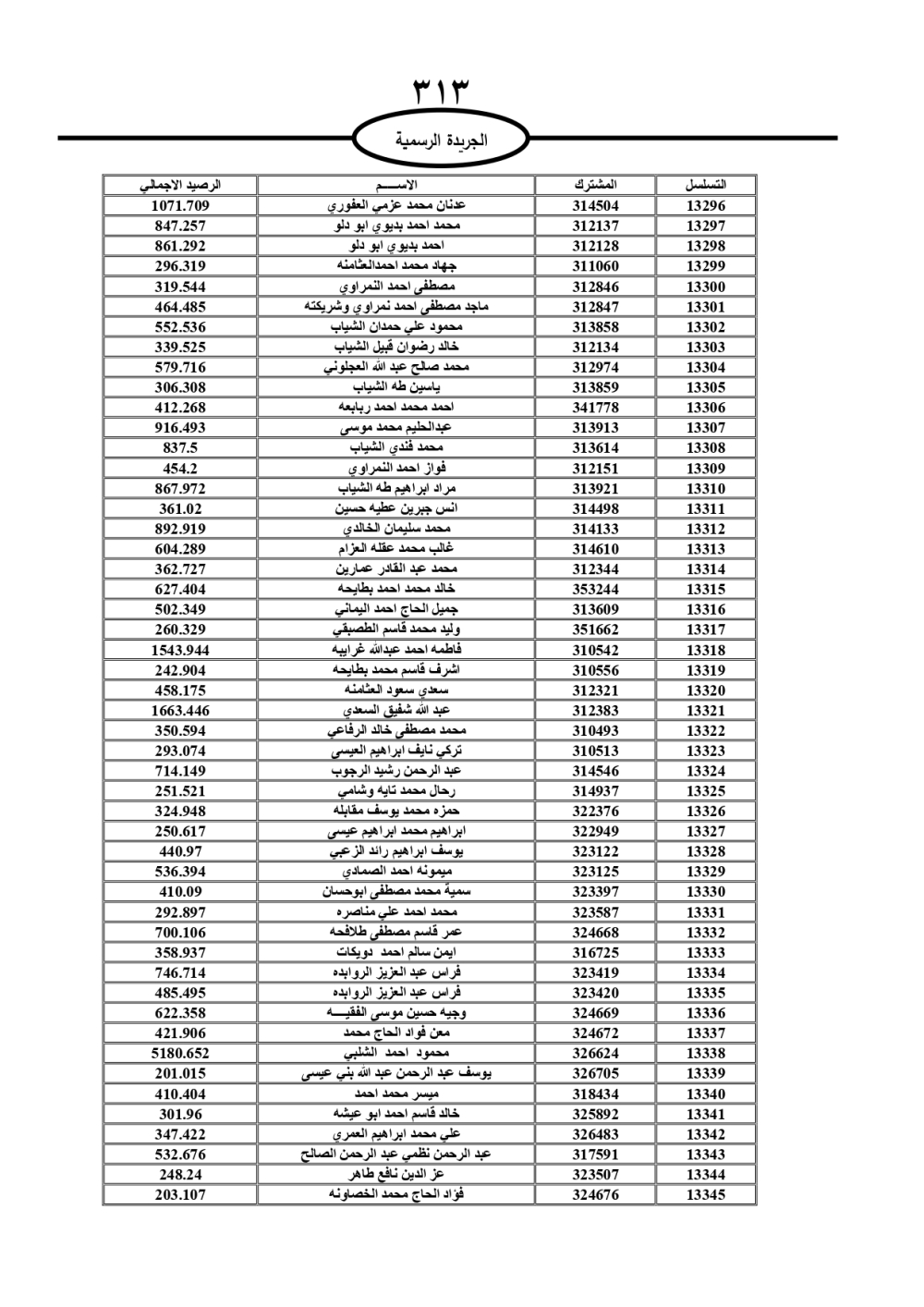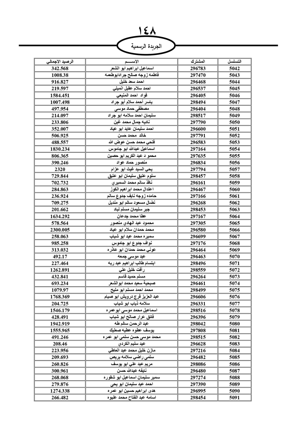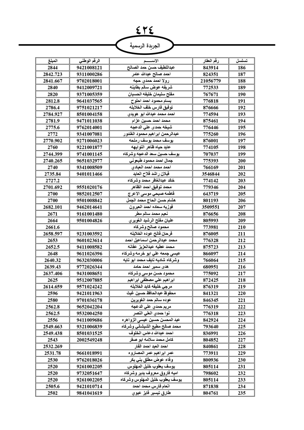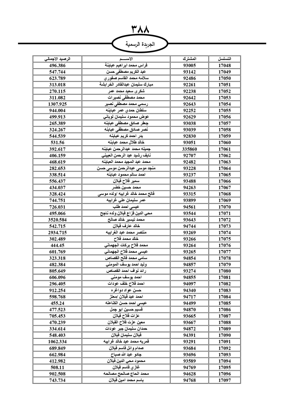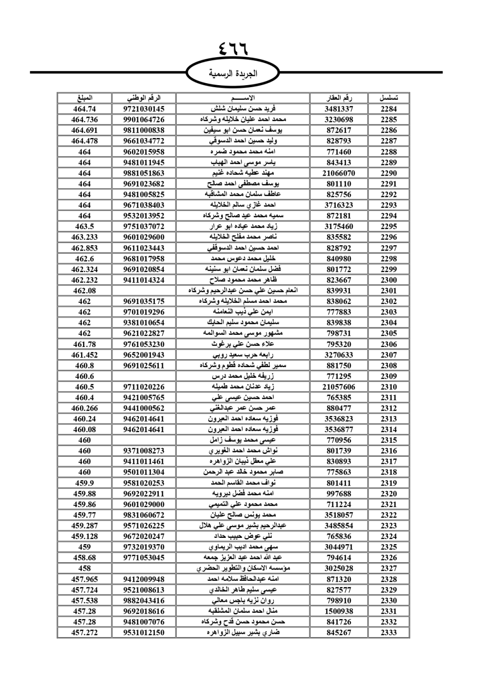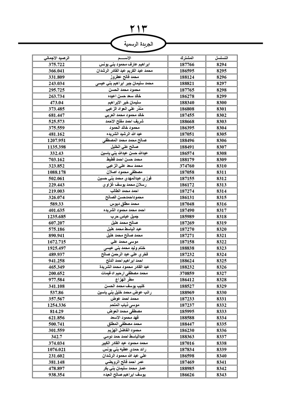 دعت سلطة المياه وبلدية الزرقاء، عشرات آلاف الأردنيين الواردة أسماؤهم بالكشوفات المرفقة، إلى ضرورة مراجعتها لتسوية أوضاعهم المالية كونه ترتب عليهم ذمم مالية، وذلك لتجنب الحجز على الأموال المنقولة وغير المنقولة بعد انقضاء 60 يوما من تاريخ النشر، علما أنه تم نشر هذه الأسماء في الجريدة الرسمية بتاريخ 16/2/2025.