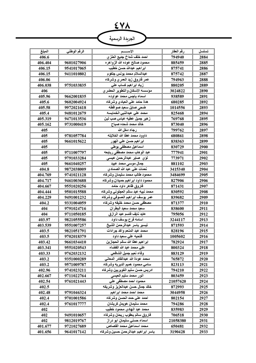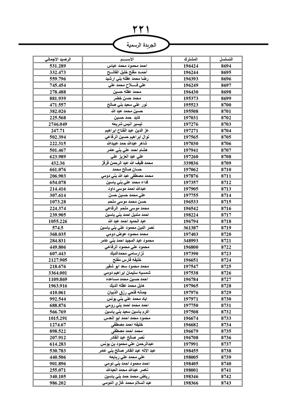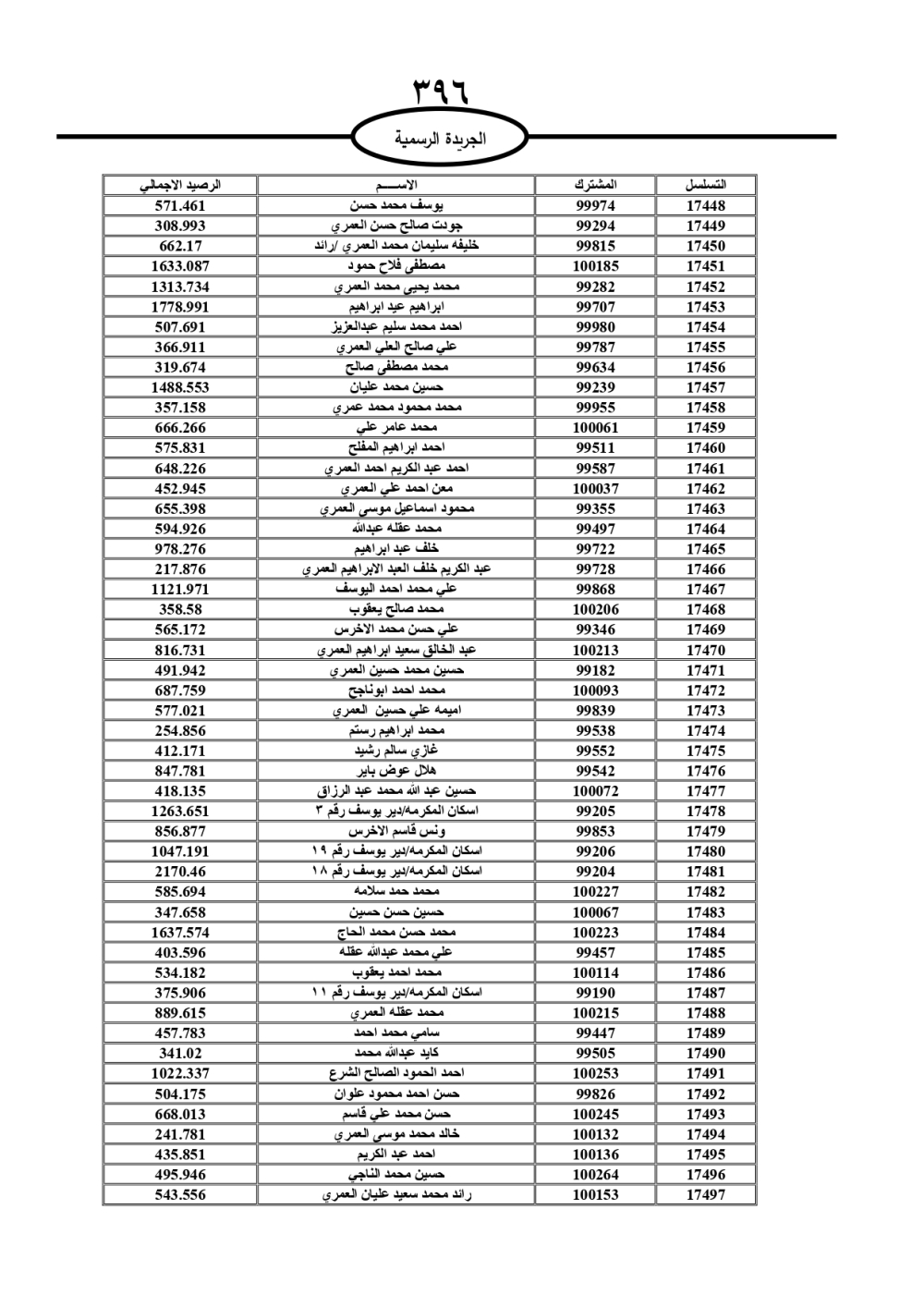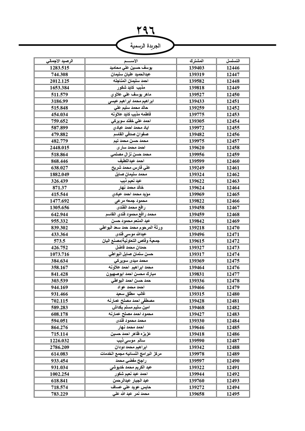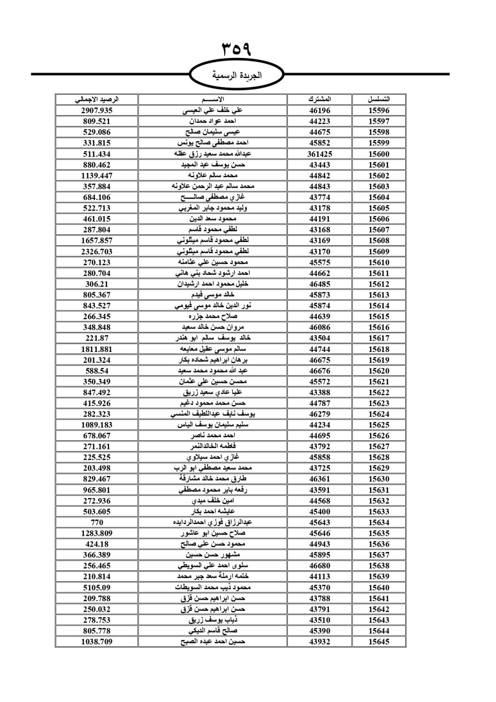 دعت سلطة المياه وبلدية الزرقاء، عشرات آلاف الأردنيين الواردة أسماؤهم بالكشوفات المرفقة، إلى ضرورة مراجعتها لتسوية أوضاعهم المالية كونه ترتب عليهم ذمم مالية، وذلك لتجنب الحجز على الأموال المنقولة وغير المنقولة بعد انقضاء 60 يوما من تاريخ النشر، علما أنه تم نشر هذه الأسماء في الجريدة الرسمية بتاريخ 16/2/2025.