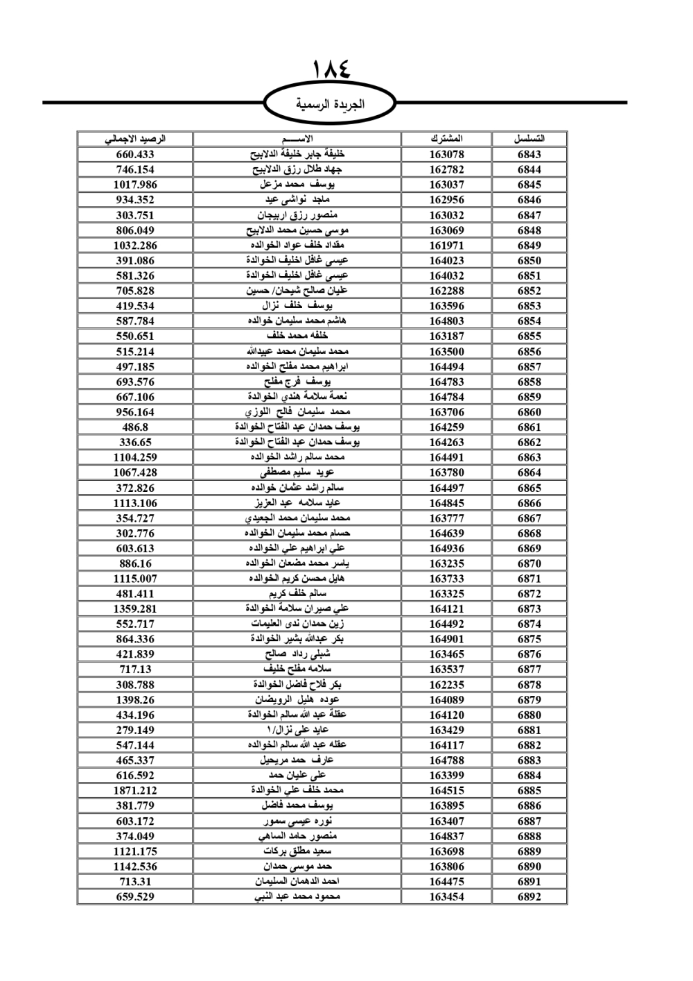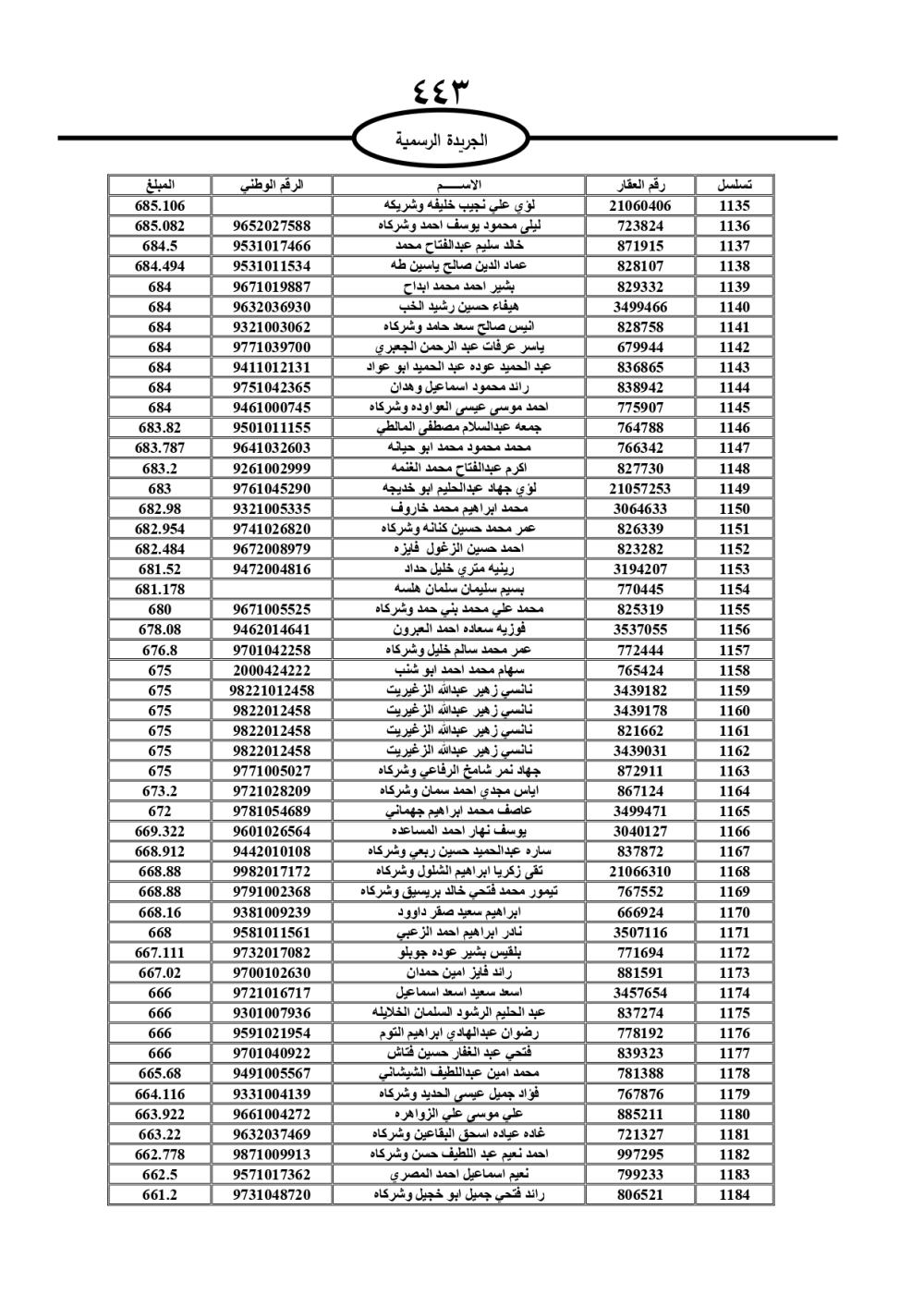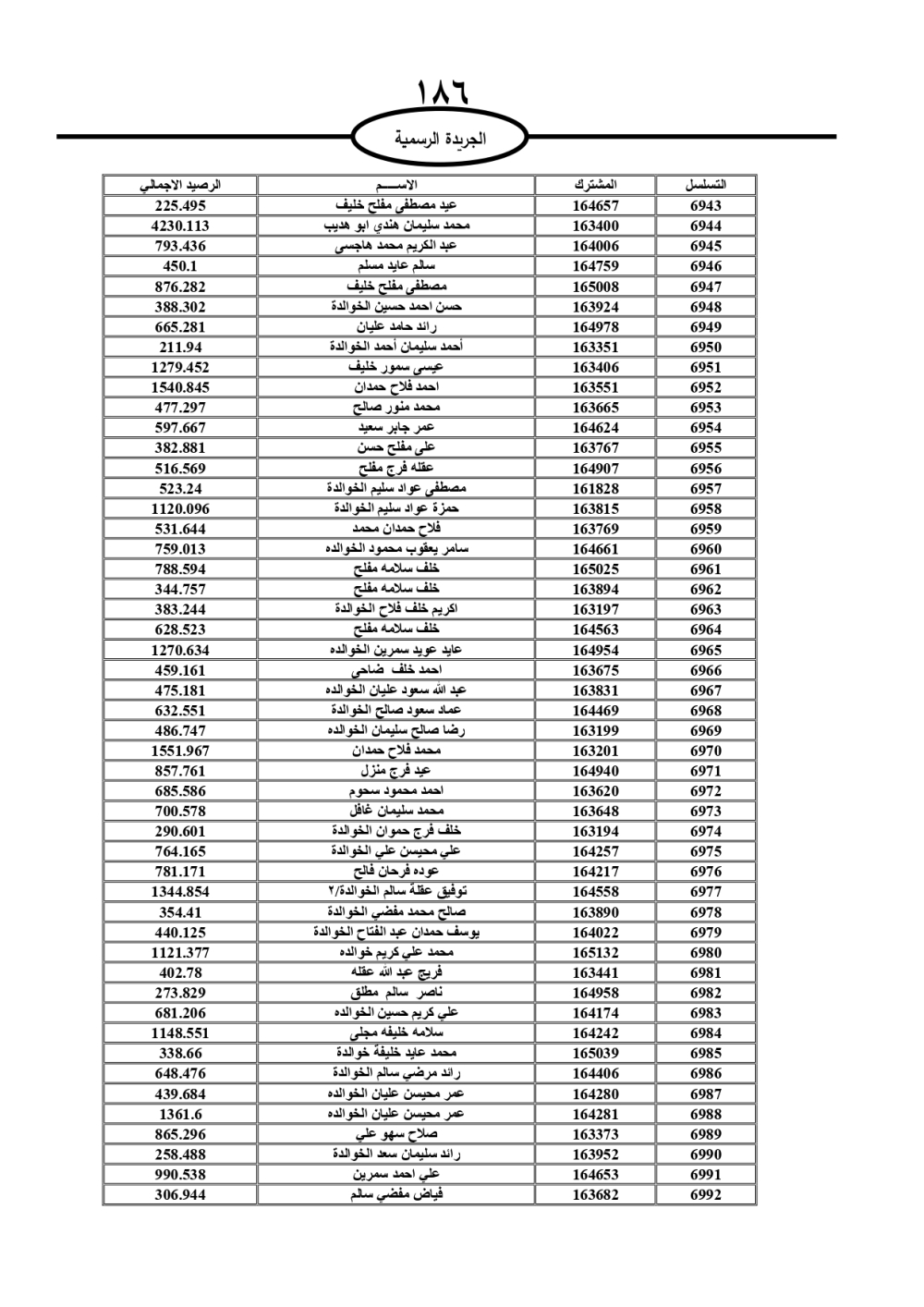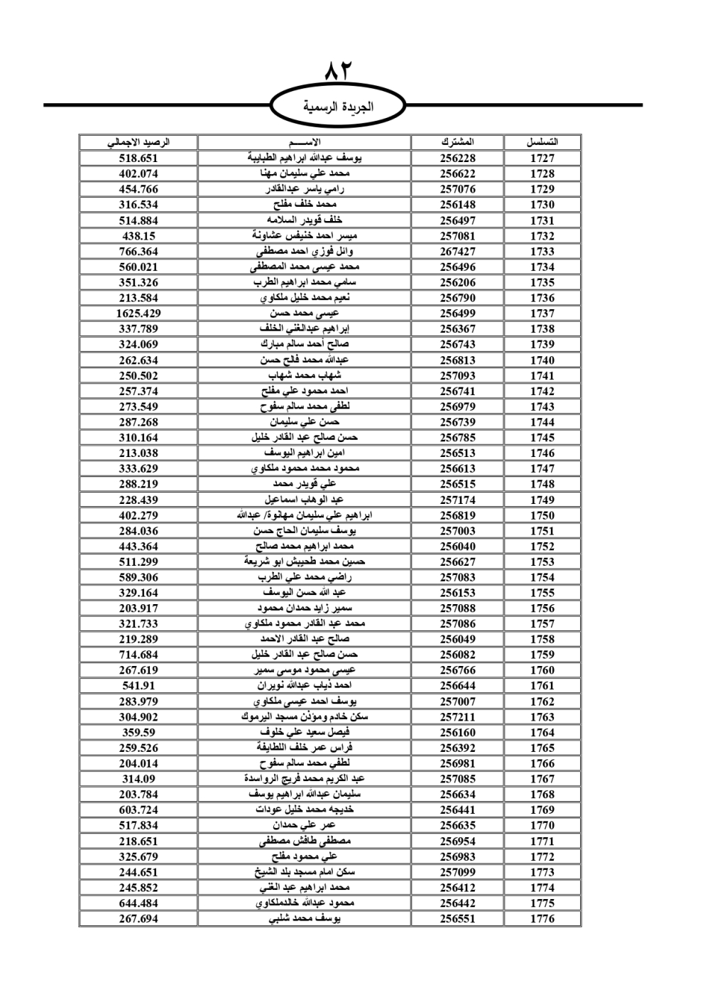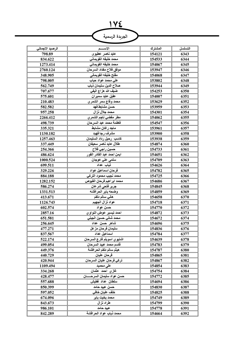 دعت سلطة المياه وبلدية الزرقاء، عشرات آلاف الأردنيين الواردة أسماؤهم بالكشوفات المرفقة، إلى ضرورة مراجعتها لتسوية أوضاعهم المالية كونه ترتب عليهم ذمم مالية، وذلك لتجنب الحجز على الأموال المنقولة وغير المنقولة بعد انقضاء 60 يوما من تاريخ النشر، علما أنه تم نشر هذه الأسماء في الجريدة الرسمية بتاريخ 16/2/2025.