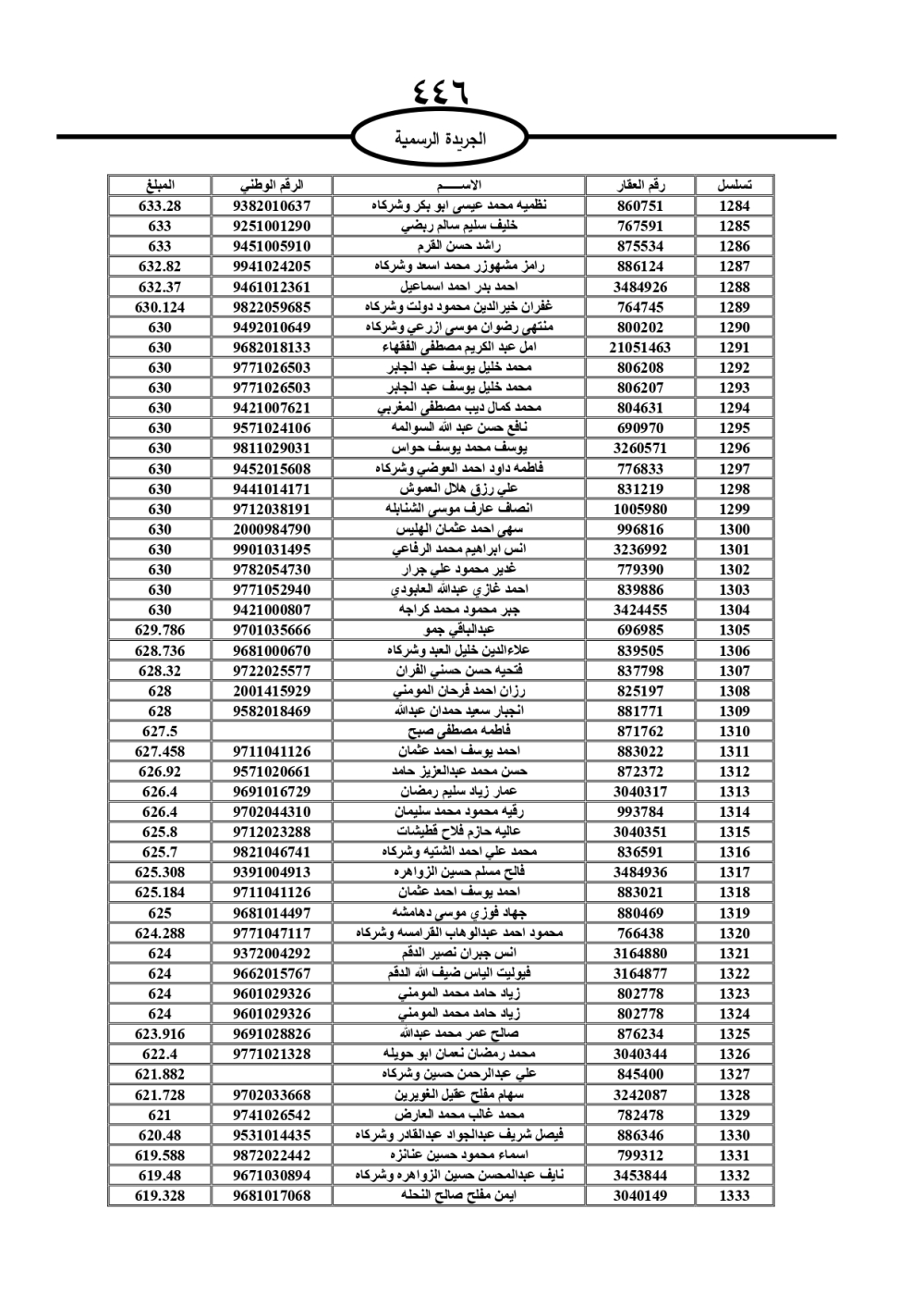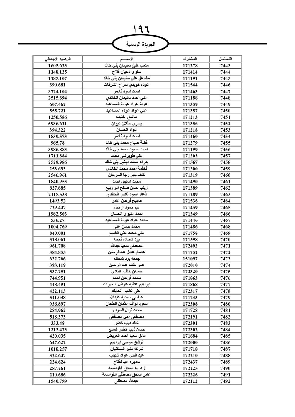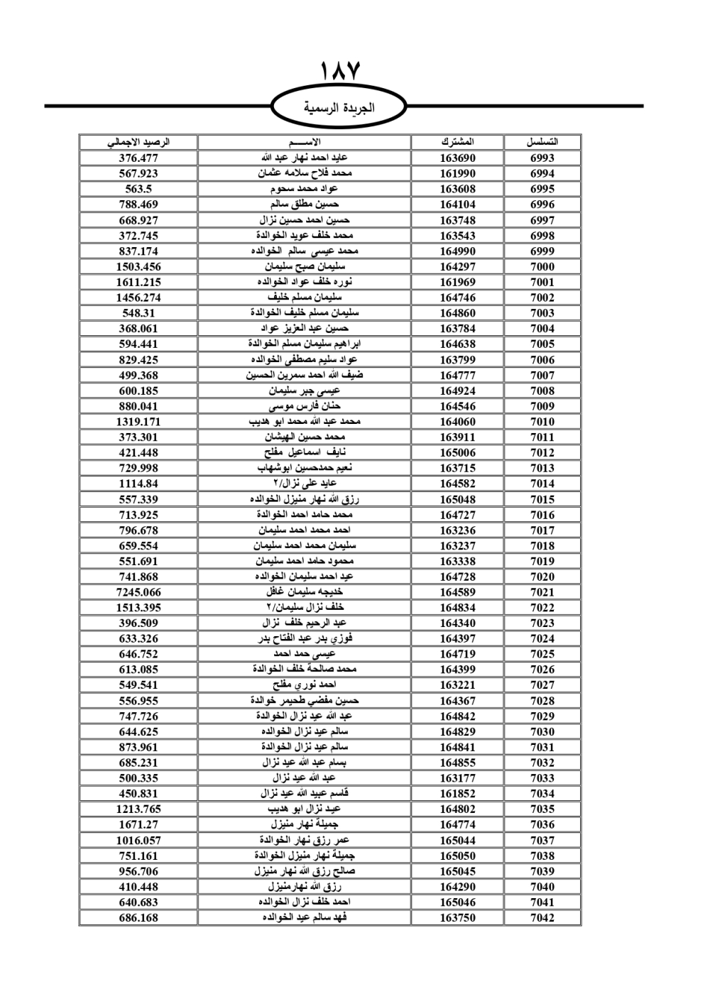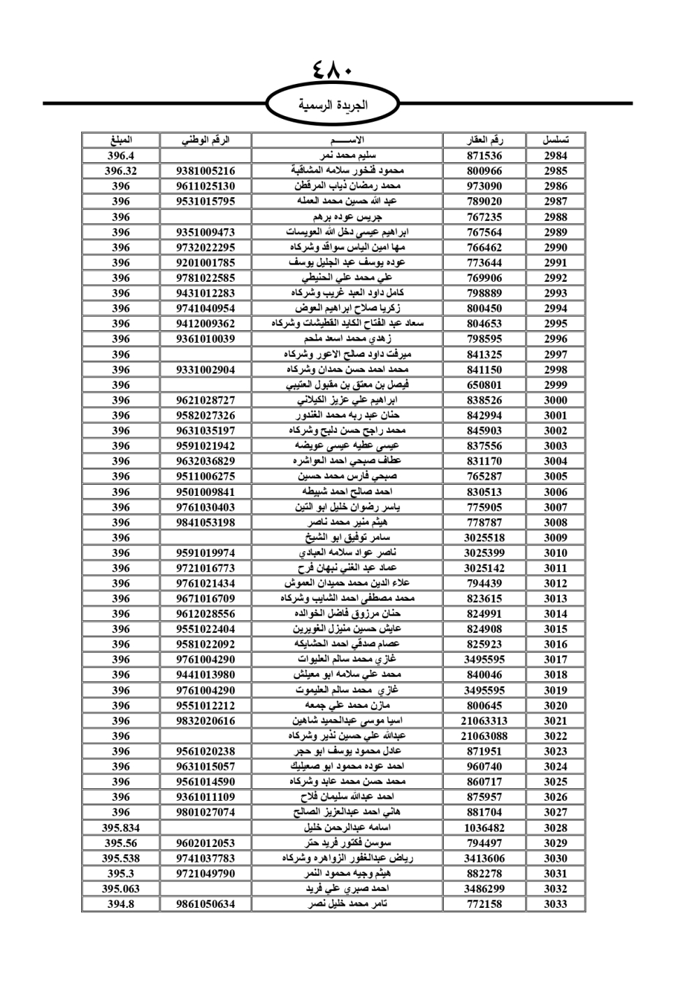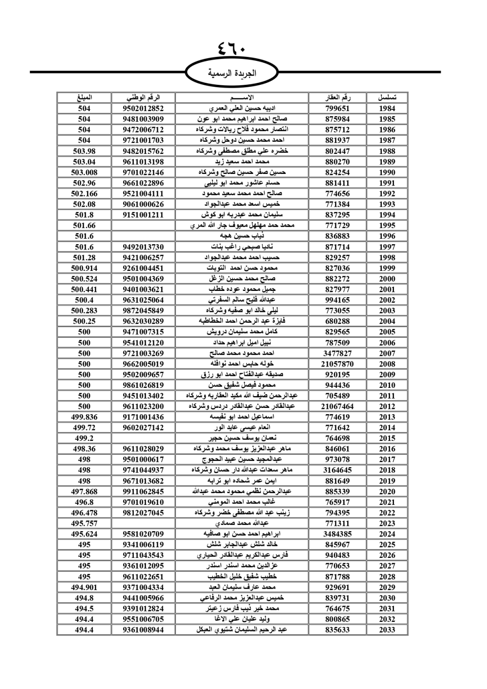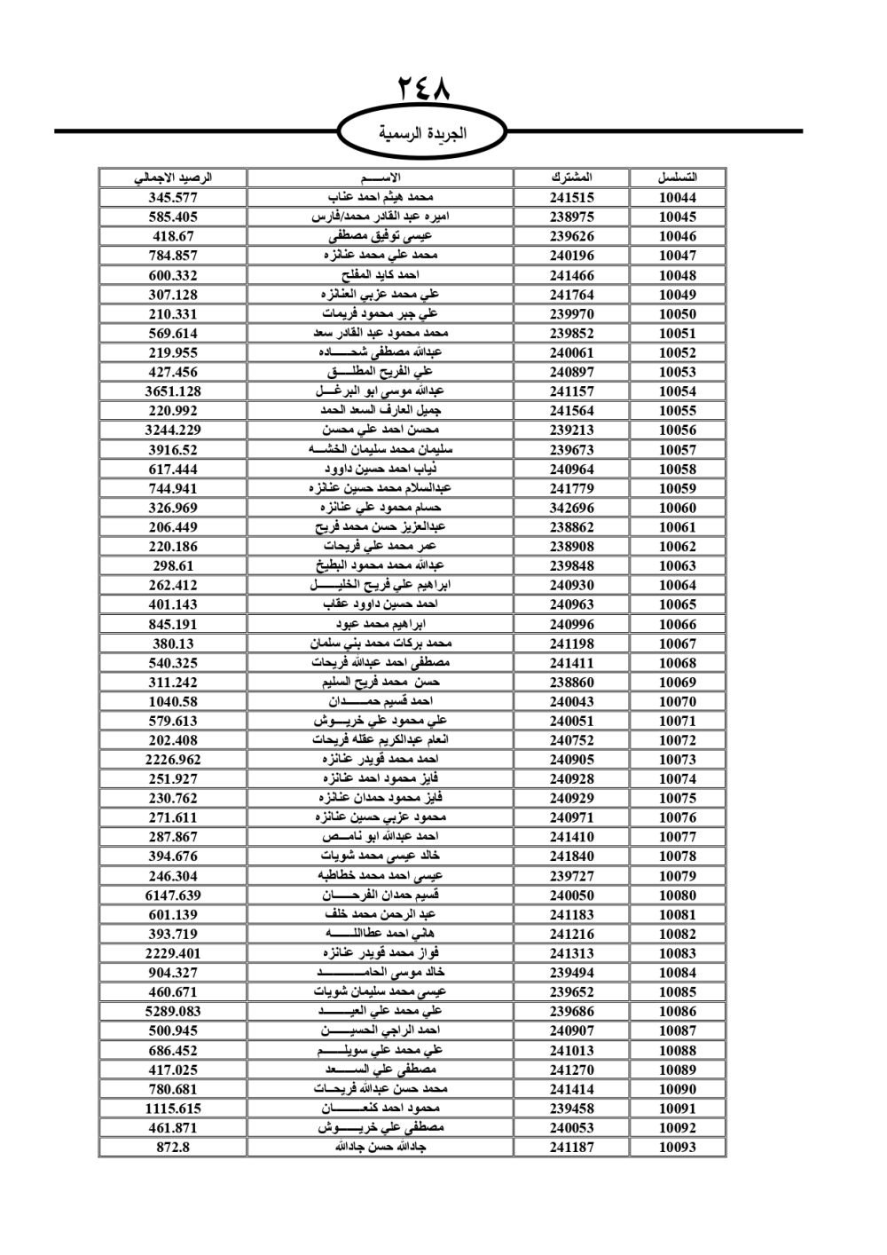 دعت سلطة المياه وبلدية الزرقاء، عشرات آلاف الأردنيين الواردة أسماؤهم بالكشوفات المرفقة، إلى ضرورة مراجعتها لتسوية أوضاعهم المالية كونه ترتب عليهم ذمم مالية، وذلك لتجنب الحجز على الأموال المنقولة وغير المنقولة بعد انقضاء 60 يوما من تاريخ النشر، علما أنه تم نشر هذه الأسماء في الجريدة الرسمية بتاريخ 16/2/2025.