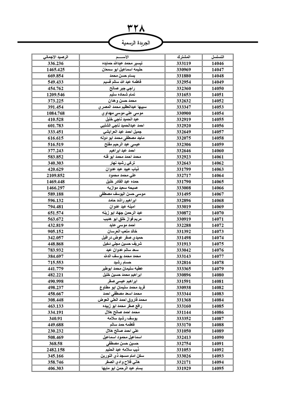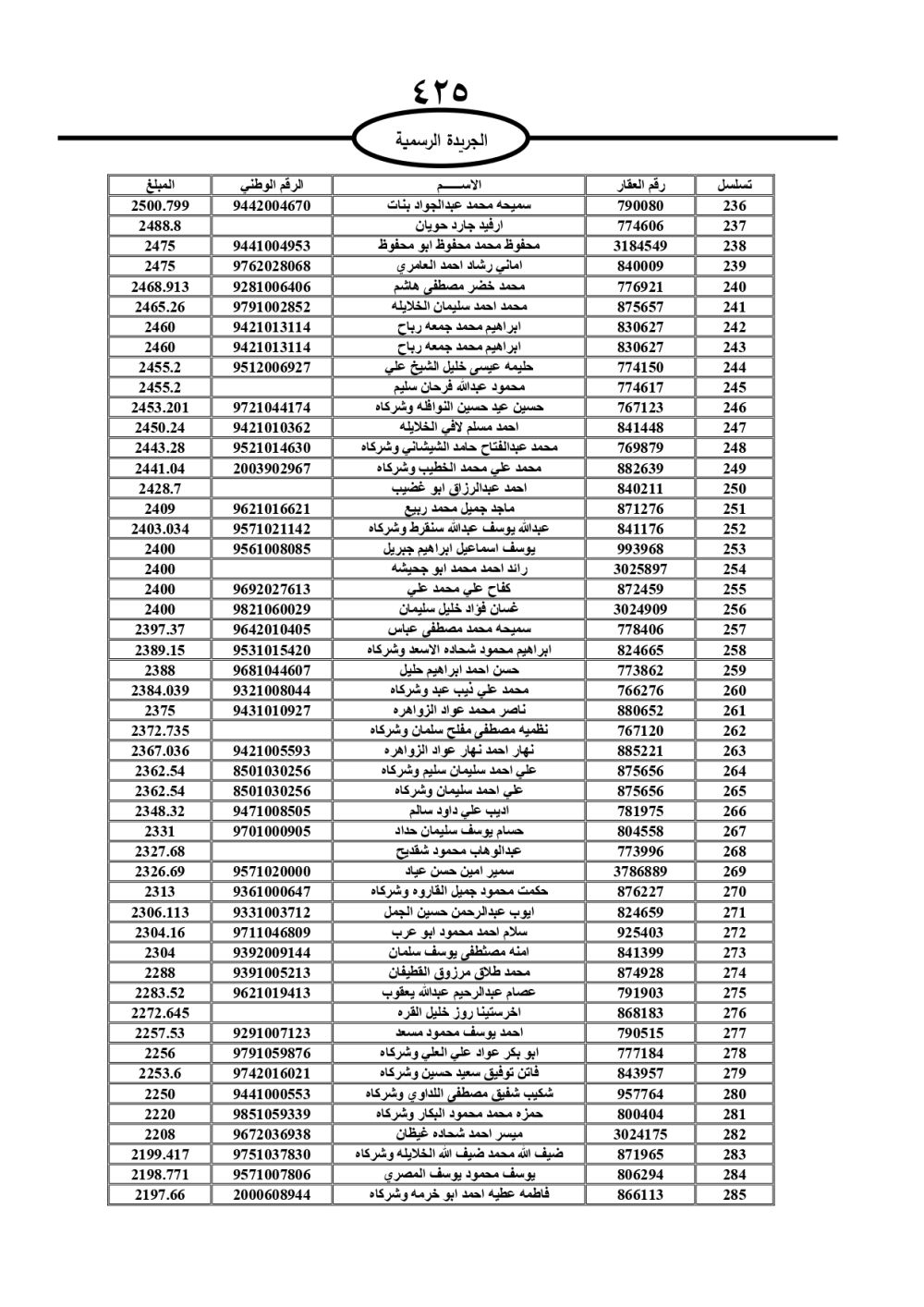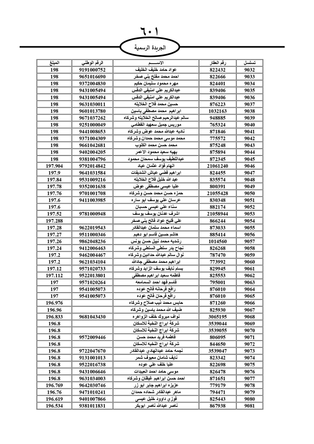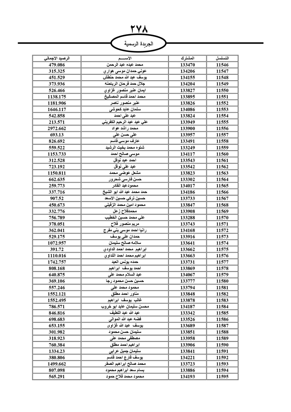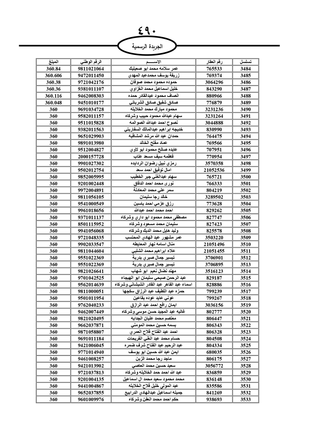دعت سلطة المياه وبلدية الزرقاء، عشرات آلاف الأردنيين الواردة أسماؤهم بالكشوفات المرفقة، إلى ضرورة مراجعتها لتسوية أوضاعهم المالية كونه ترتب عليهم ذمم مالية، وذلك لتجنب الحجز على الأموال المنقولة وغير المنقولة بعد انقضاء 60 يوما من تاريخ النشر، علما أنه تم نشر هذه الأسماء في الجريدة الرسمية بتاريخ 16/2/2025.