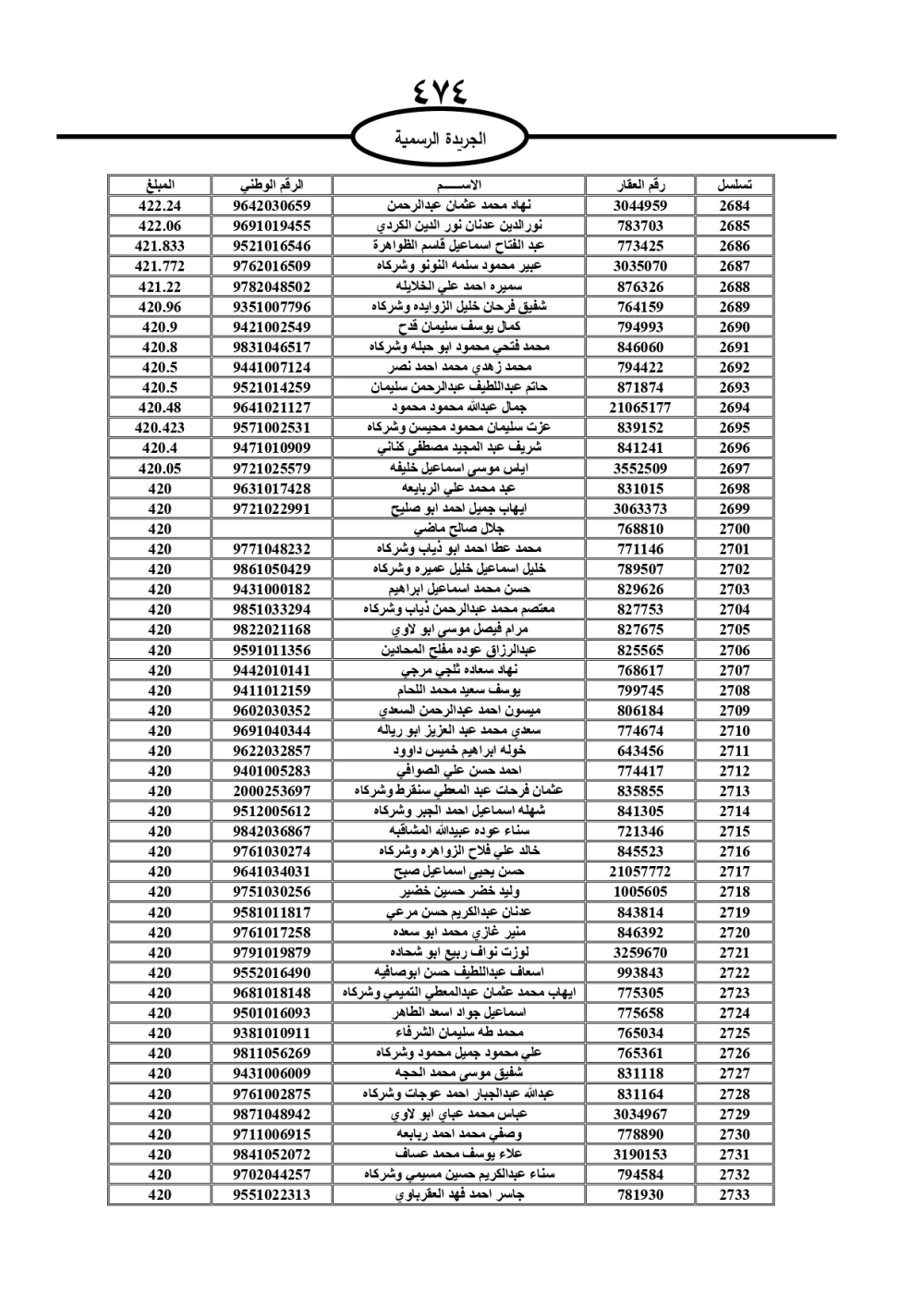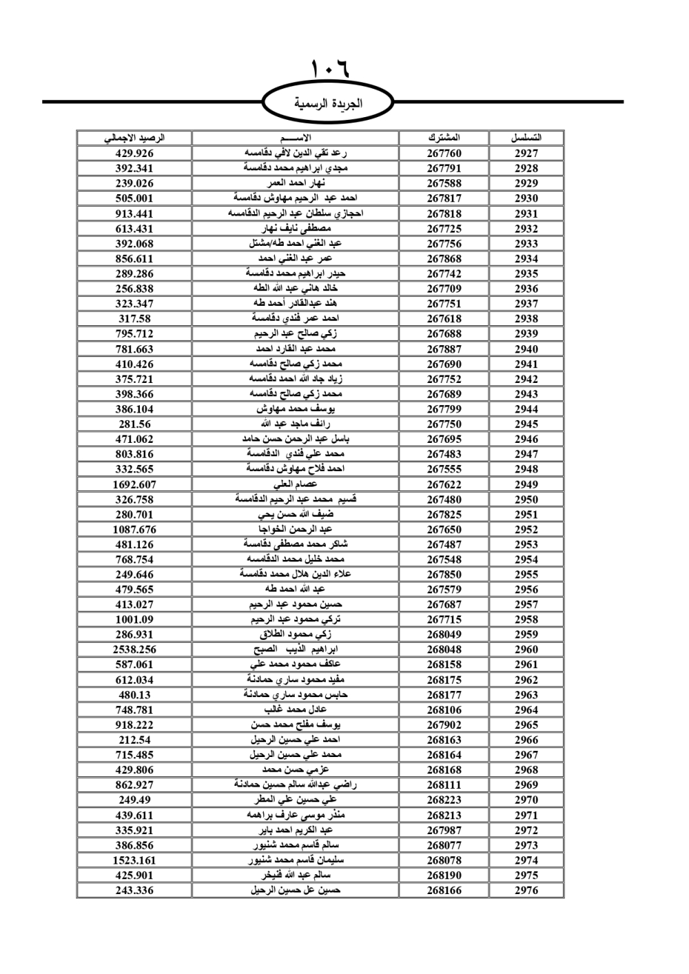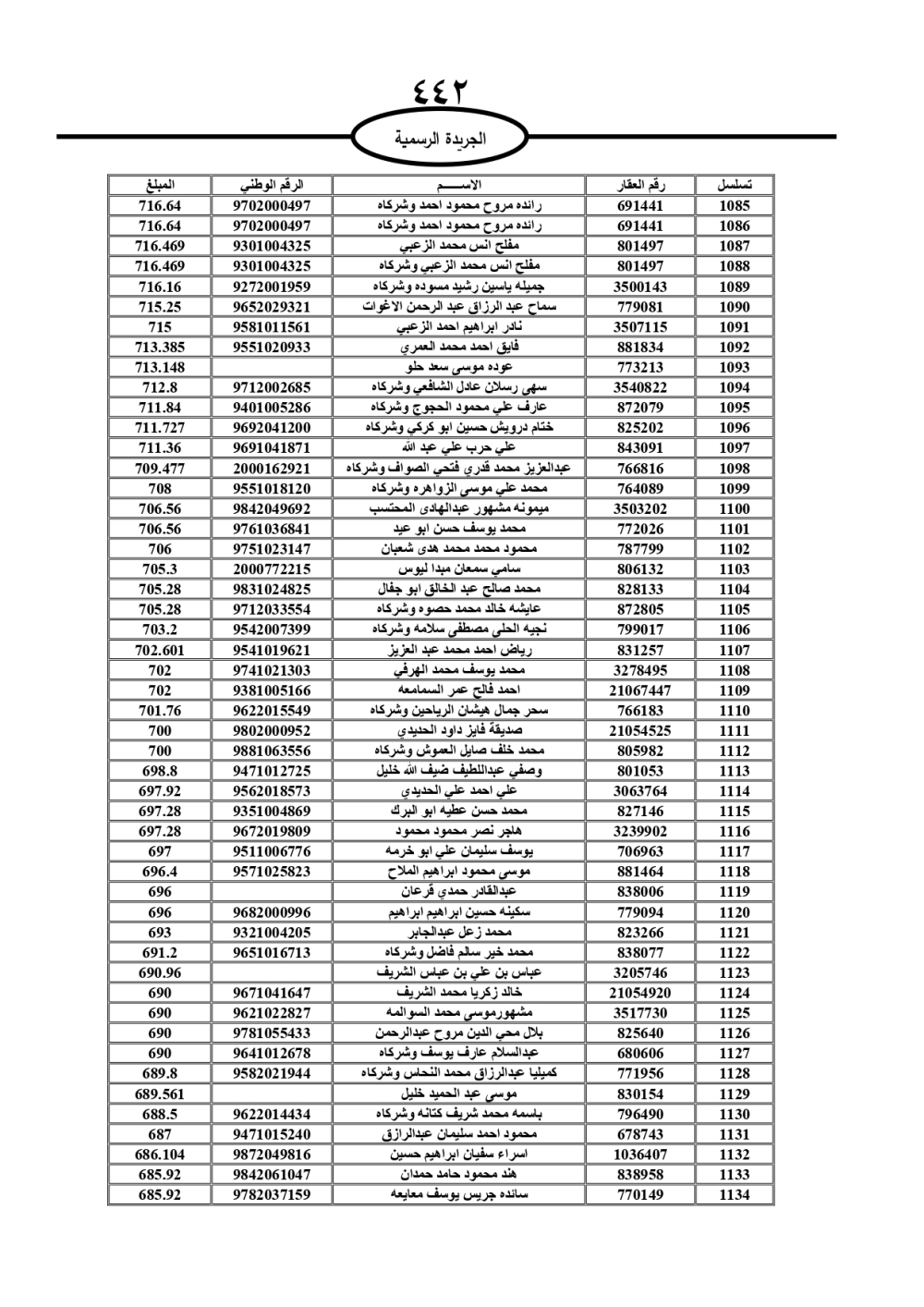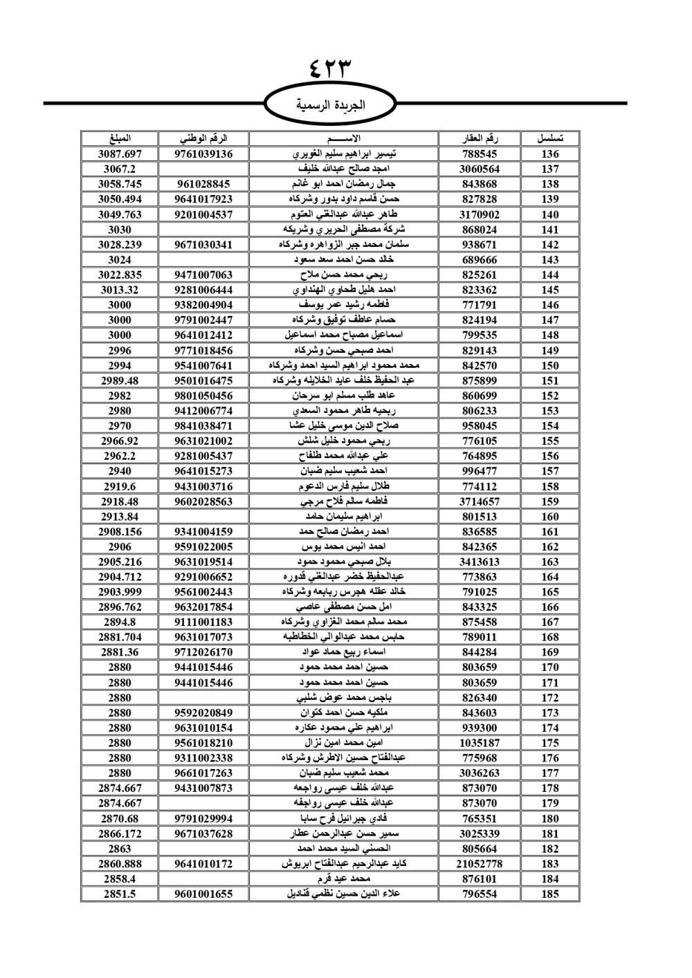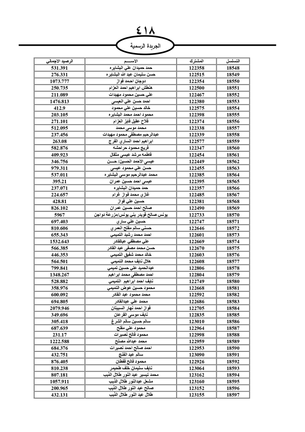 دعت سلطة المياه وبلدية الزرقاء، عشرات آلاف الأردنيين الواردة أسماؤهم بالكشوفات المرفقة، إلى ضرورة مراجعتها لتسوية أوضاعهم المالية كونه ترتب عليهم ذمم مالية، وذلك لتجنب الحجز على الأموال المنقولة وغير المنقولة بعد انقضاء 60 يوما من تاريخ النشر، علما أنه تم نشر هذه الأسماء في الجريدة الرسمية بتاريخ 16/2/2025.